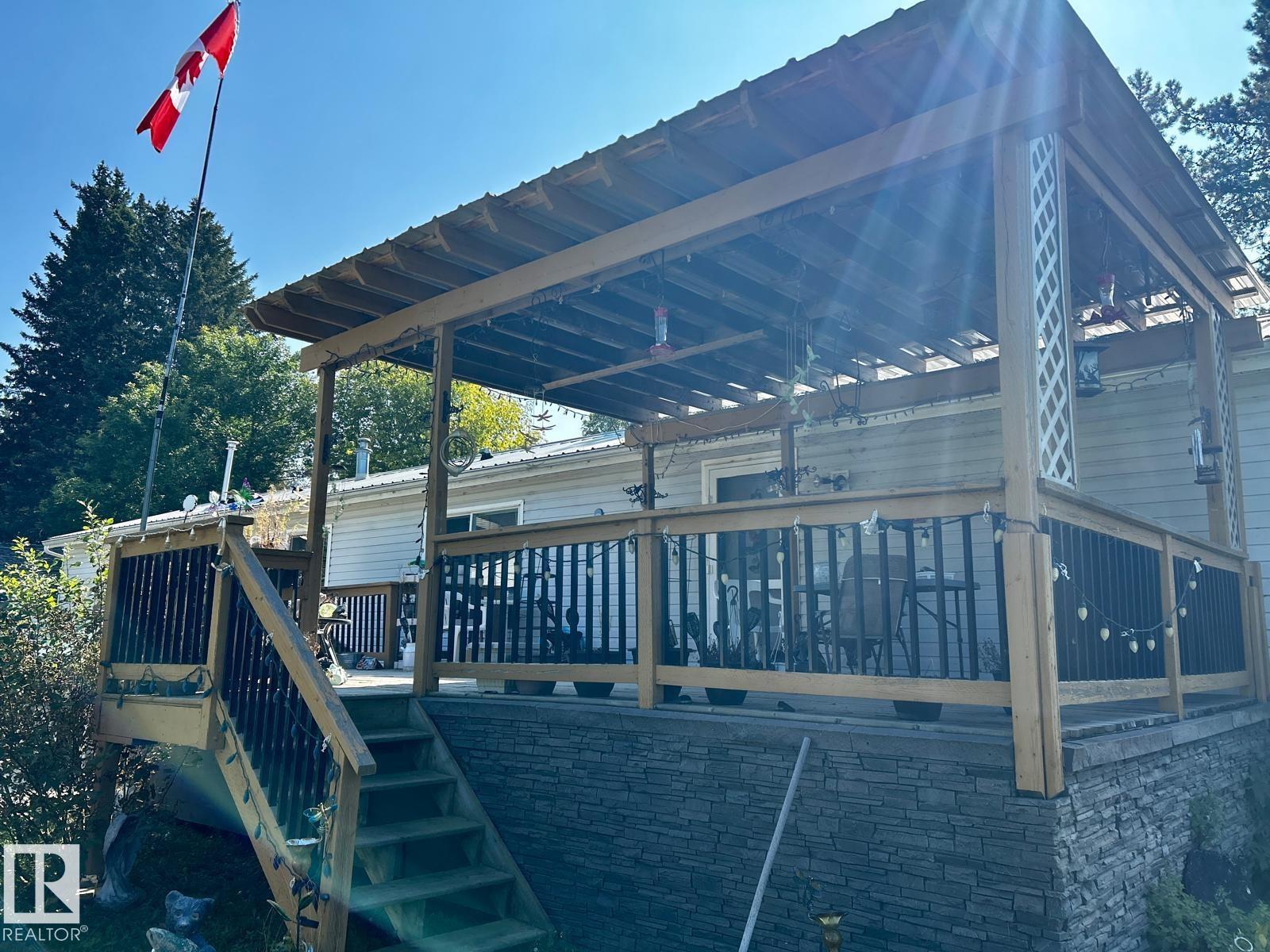 Walking distance to the lake! Move in ready and with so much to offer! This 2000 built modular home is situated on a large completely fenced lot and has a great double detached garage, two tiered deck and beautiful trees throughout! Starting at one end, you have a large primary bedroom, with a walk in closet and 4 pc ensuite featuring a window for natural light. Heading the other way you have a pantry, utility/laundry room and your kitchen/dining room with ample cupboard space and a skylight enhancing that open feel! Large windows in both the dining room and living room are a great touch. Further down you have a wide entrance, another 4 pc main bathroom and two more bedrooms. Everything you need is here it would be hard to run out of space. This home is definitely worth a look, there's nothing to do but unpack!
