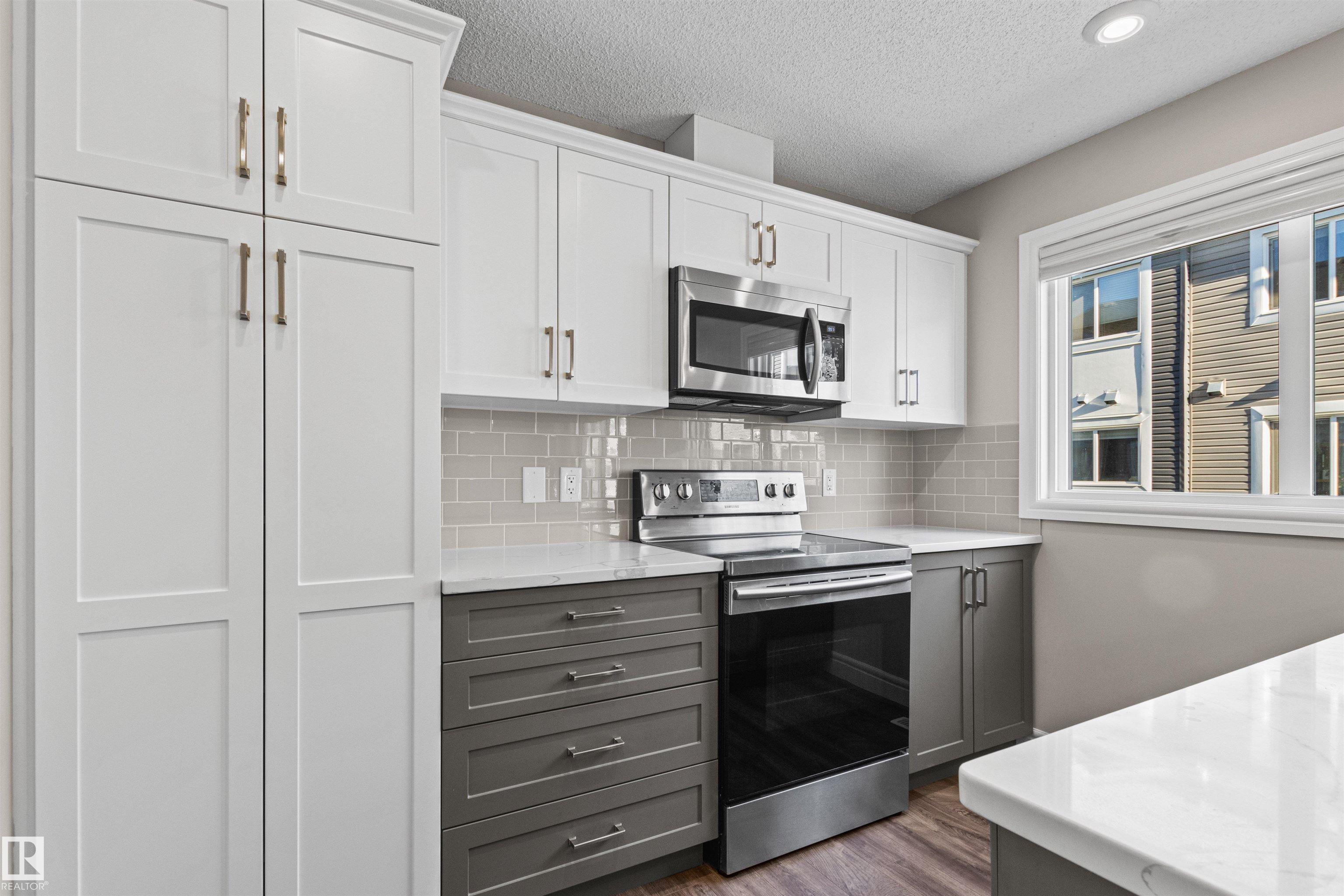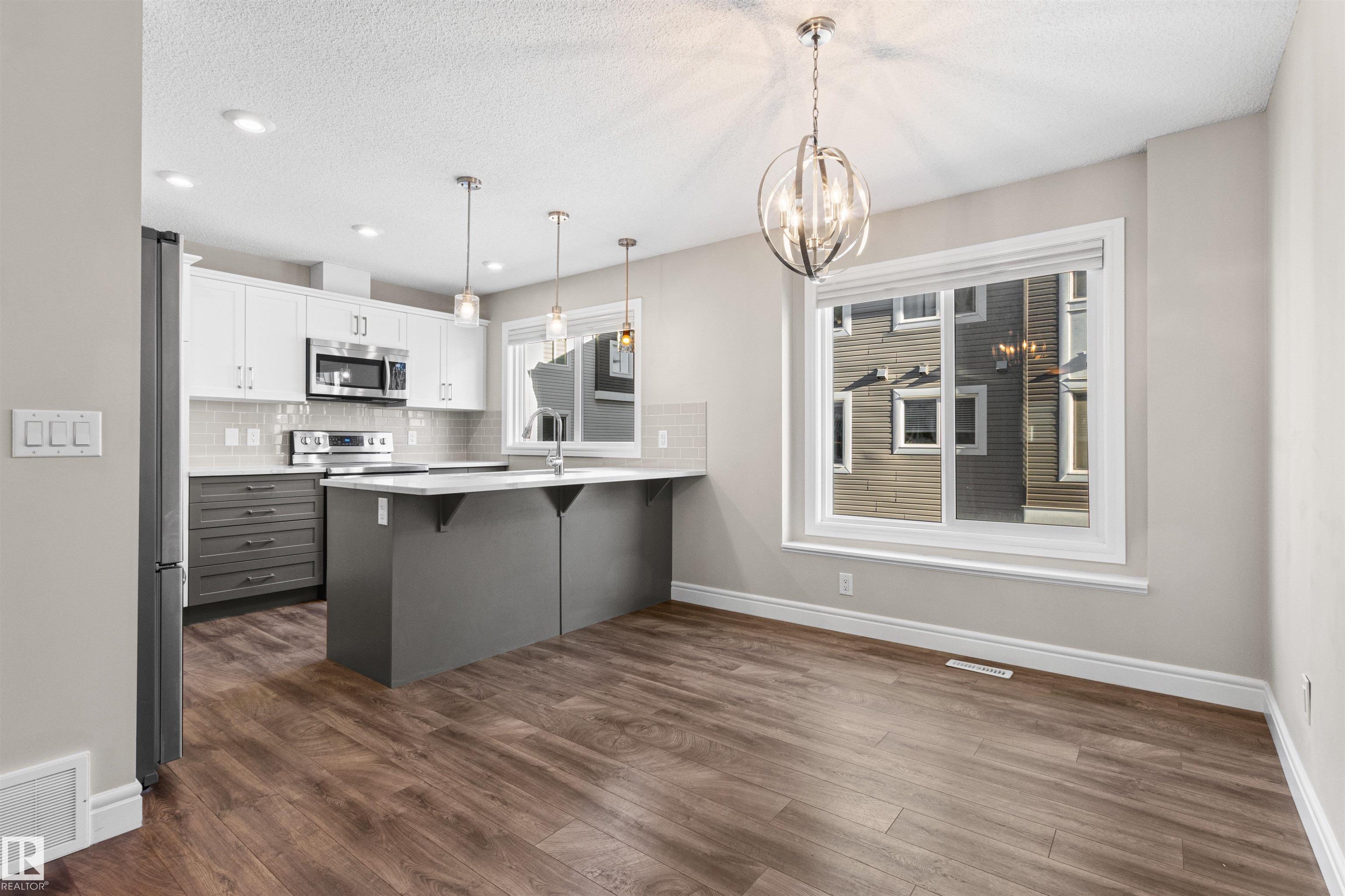 Nestled in the serene Bulyea Heights community, this impeccably maintained 1470 sqft end-unit townhouse offers a tranquil retreat with a sunny disposition. This home features a double attached garage and is steps away from the school and the community center. The second floor dazzles with an open-concept living and dining area, bathed in natural light from numerous windows. The modern kitchen, equipped with stainless steel appliances, is ideal for entertaining. Upstairs, two generous bedrooms, a 4-pc bath, and convenient upper-floor laundry await, alongside a primary suite with a walk-in closet and 3-pc ensuite. Enjoy the quiet location, ease of access to Whitemud Dr & Anthony Henday, also shopping and playground around, making it an ideal family home.