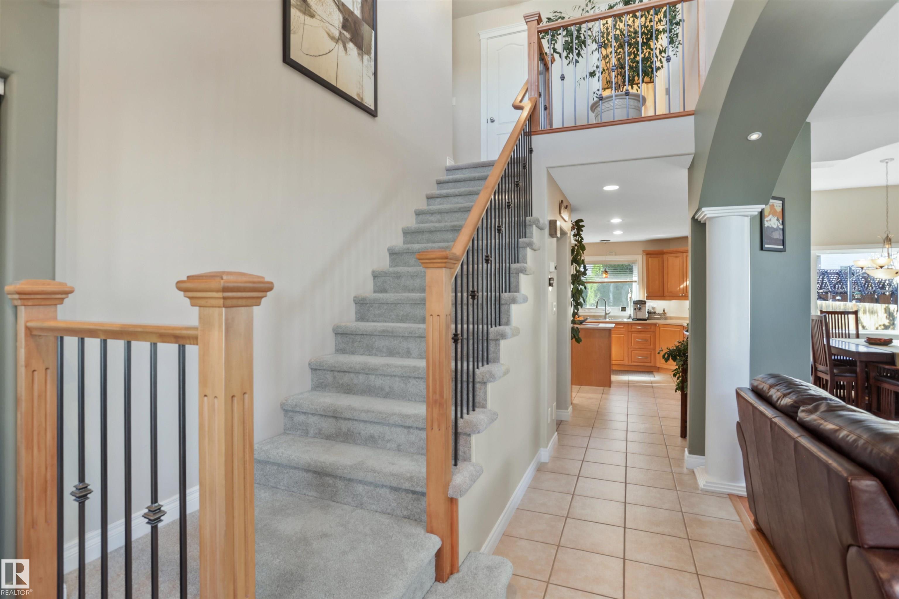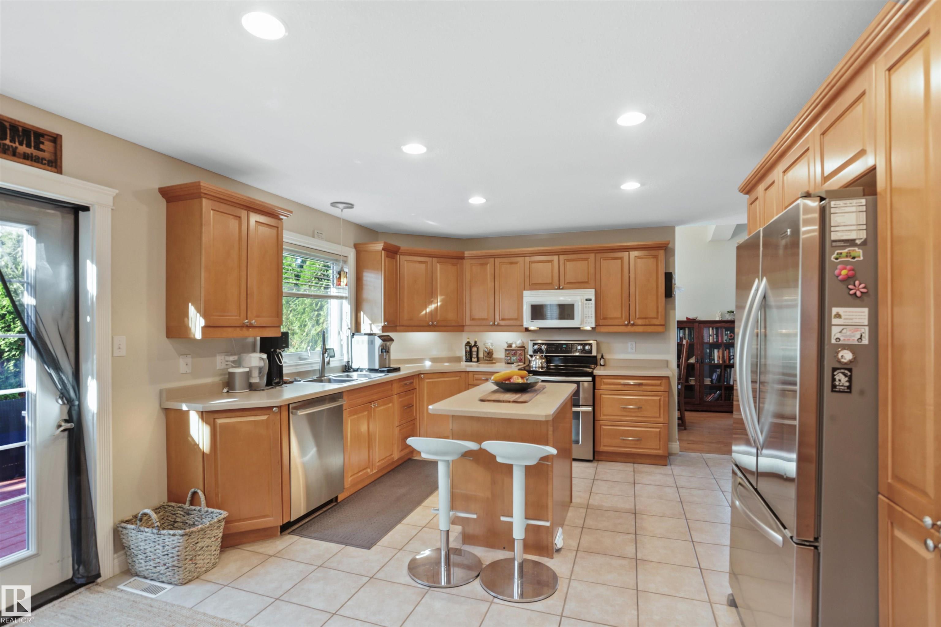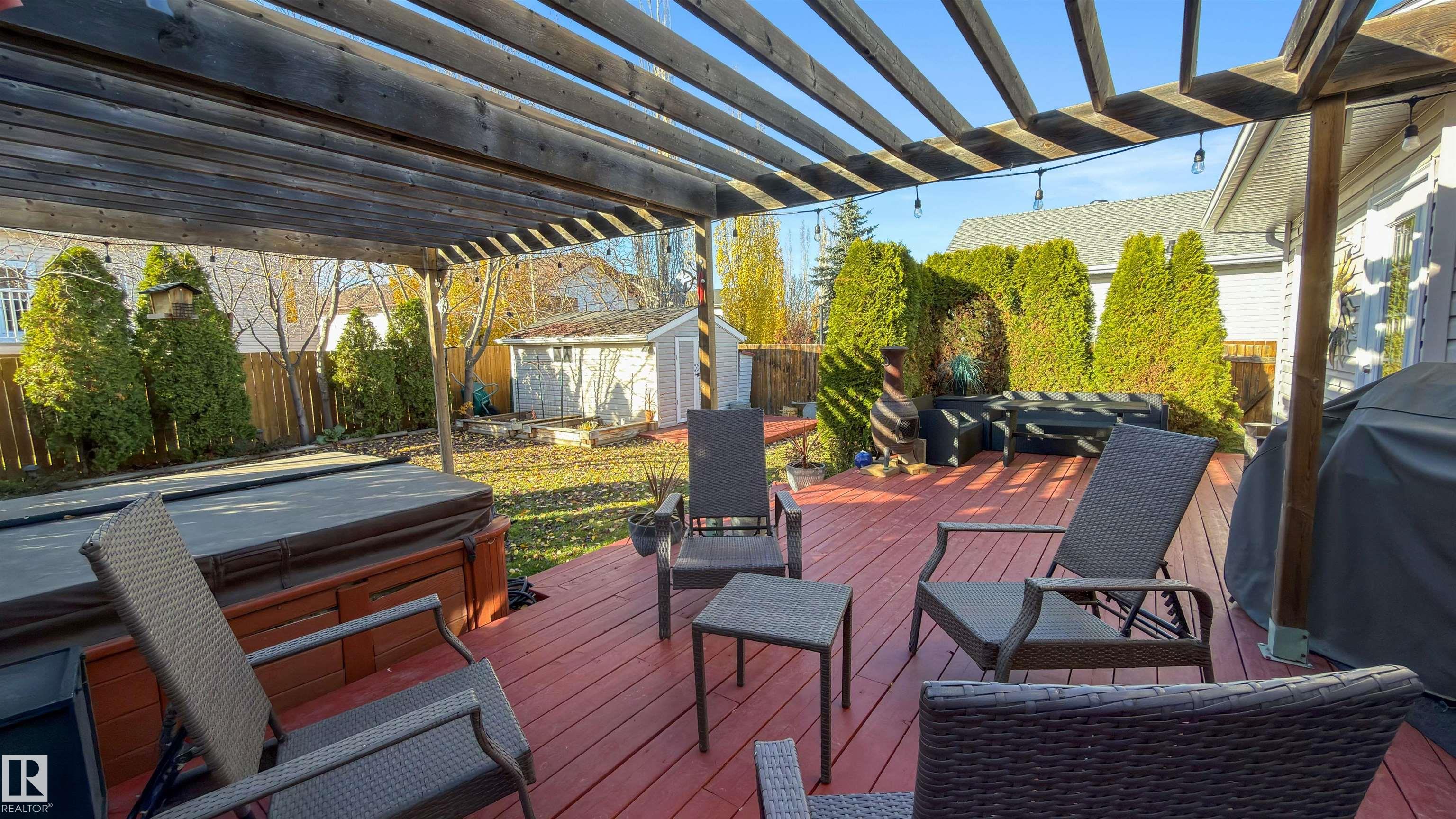 Impressive home featuring beautiful maple and tile flooring on the main level, with maple cabinets and a built-in entertainment centre. The living room offers a stunning floor-to-ceiling stone, wood-burning Heatilator fireplace. Formal dining room plus back entry from the kitchen leading to a 30' x 14' cedar deck with a hot tub and gas outlet. The spacious primary suite includes a walk-in closet and a luxurious ensuite with in-floor tile heating, ?waterfall? soaker tub, and large tiled shower. The basement is finished (bathroom roughed in). Large windows throughout provide an abundance of natural light. Yard is fenced and nicely landscaped with mature trees. Garage is insulated and drywalled. A bright, warm, and inviting home inside and out!