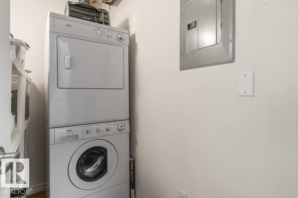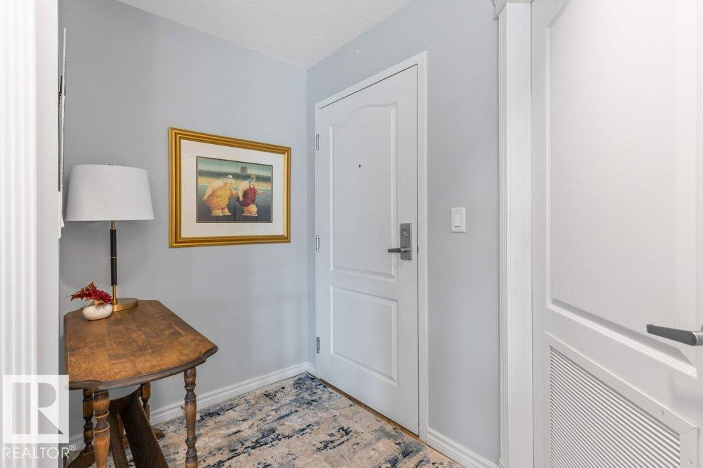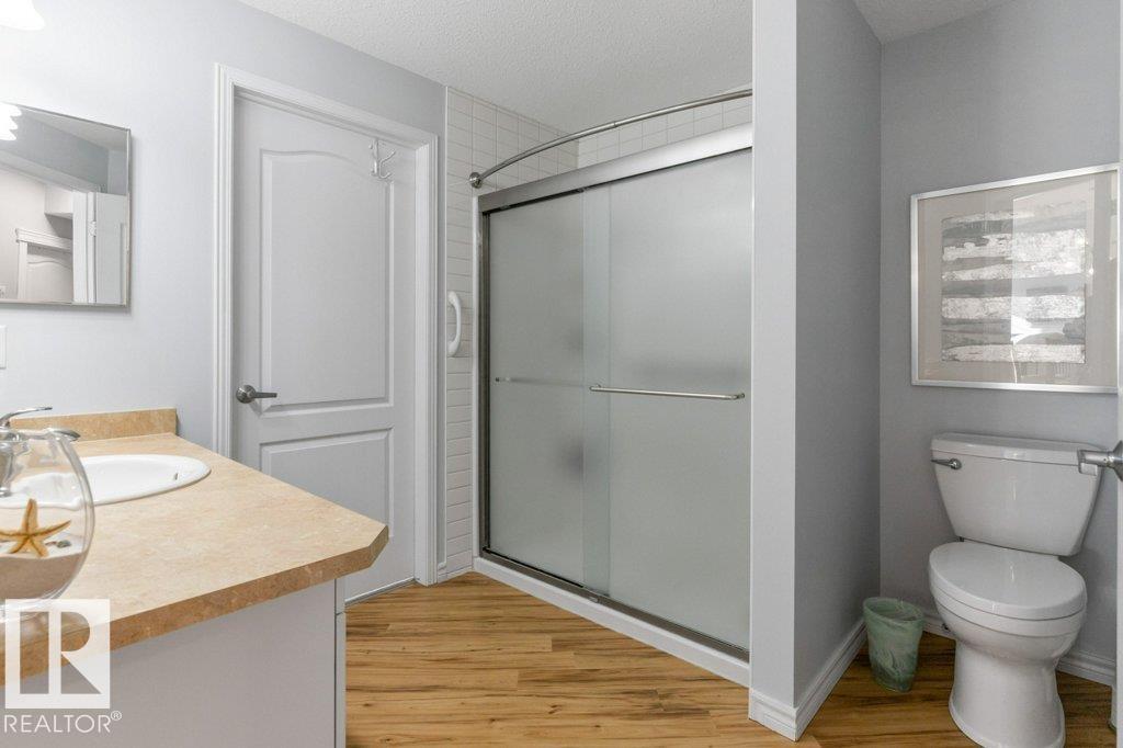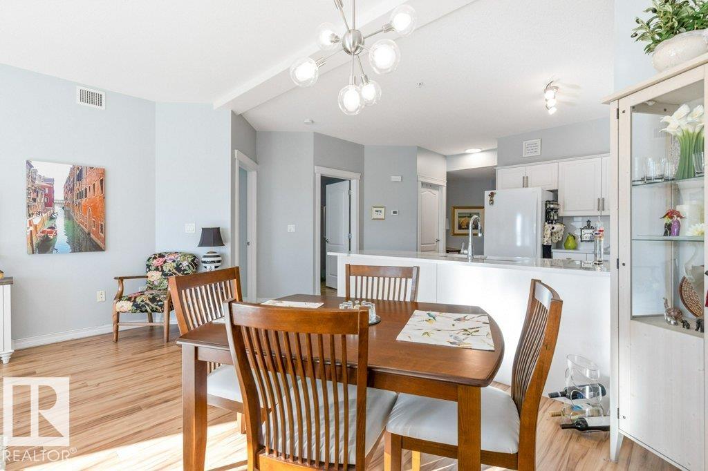 MOVE IN & ENJOY!! Modern, bright & open describes this spacious one bedroom home in the Estates at Lakeside. This home has a wide open floor plan with over 903 Sq Ft of living space. The kitchen overlooks the great room & has gleaming white cabinets complimented with new quartz counter tops, undermount sink, modern appliances & ample work & storage space. The wide open great room with sunny south west windows provides ample natural light & direct access to a great covered balcony. The inviting primary bedroom has a walk in closet & direct access to the fully updated wheel chair accessible bath with a full sized walk in shower. The laundry room holds a full sized washer & dryer & the large closet off the entrance door provides additional storage. The home comes with A/C & a Titled Underground parking stall with a Storage cage. Building has a gym, car wash, social, billiards, crafts, library, theatre & internet cafe rooms. Please note this is age restricted 55+, no pets, no smoking in building or grounds.