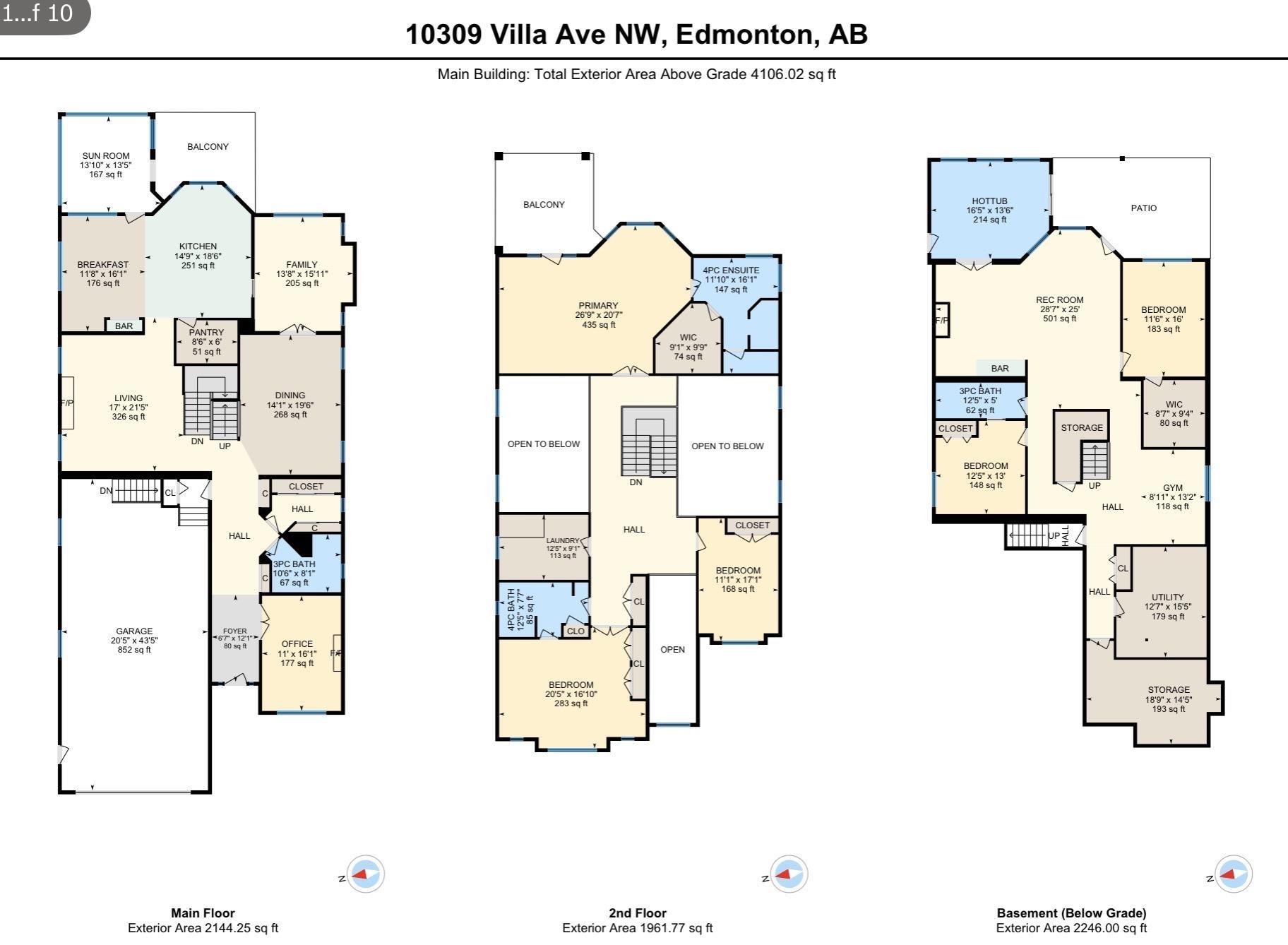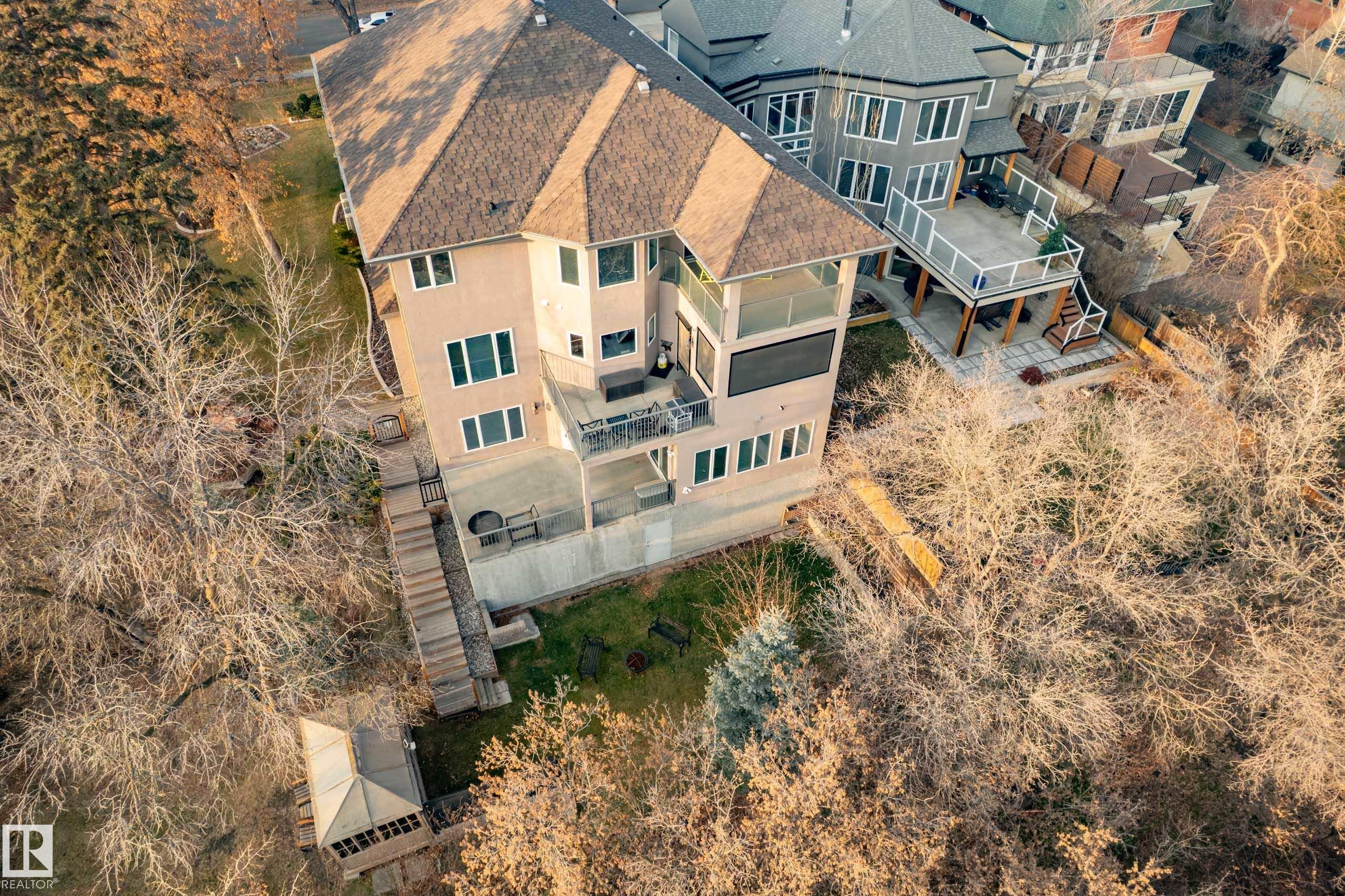 Ravine Property located in Groat Estates offers park like living doorsteps to Downtown. Custom built 5 bedroom, 4 bathroom WALKOUT BASEMENT home features a QUADRUPLE floor-heated ATTACHED tandem GARAGE. SOUTH facing BACKYARD. Formal office with built in shelving, raw brick facing gas fireplace. Huge dining room, living room with a gas fireplace. Both spaces offer 24 foot cathedral ceilings. Chef?s kitchen with professional appliances package, granite countertops, two sinks, 3 ovens, wet bar, and more. Three season power screened covered patio that continues to exposed deck. Upper level presents three bedrooms, laundry room and breathtaking views from the covered balcony. FULLY FINISHED walk-out basement with family room, gas fireplace, gym area, two bedrooms, bathroom, wet bar, humidity and temperature controlled HOT TUB ROOM with sliding patio doors to lower deck and large storage space. OVERSIZED DRIVEWAY. Sub-basement storage and shed. Minutes to Rogers Arena & restaurants.