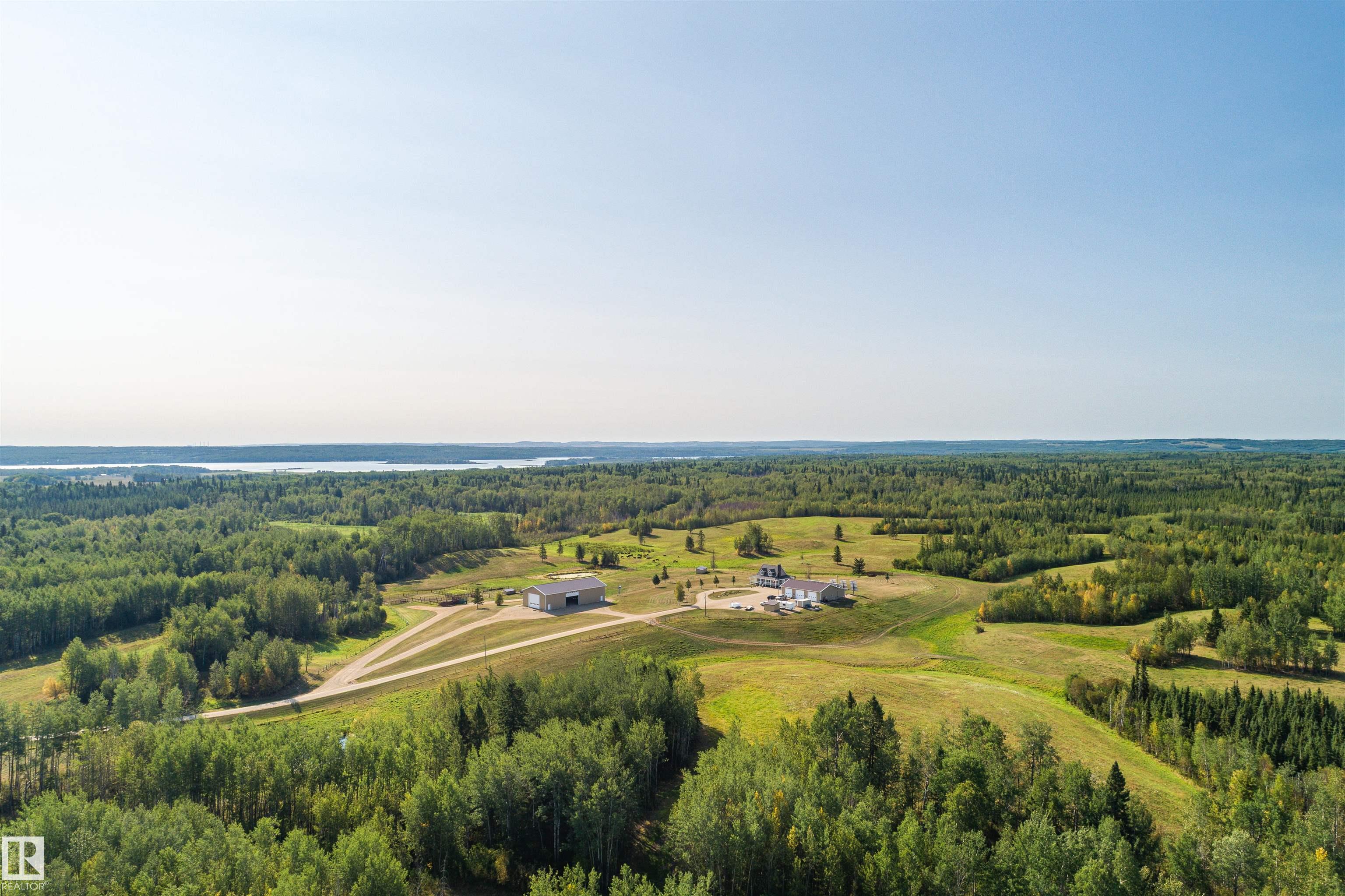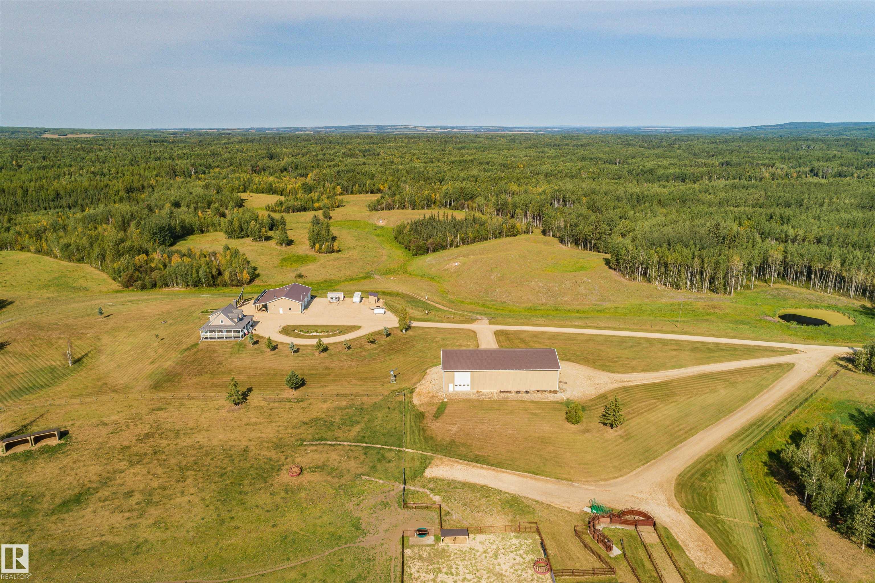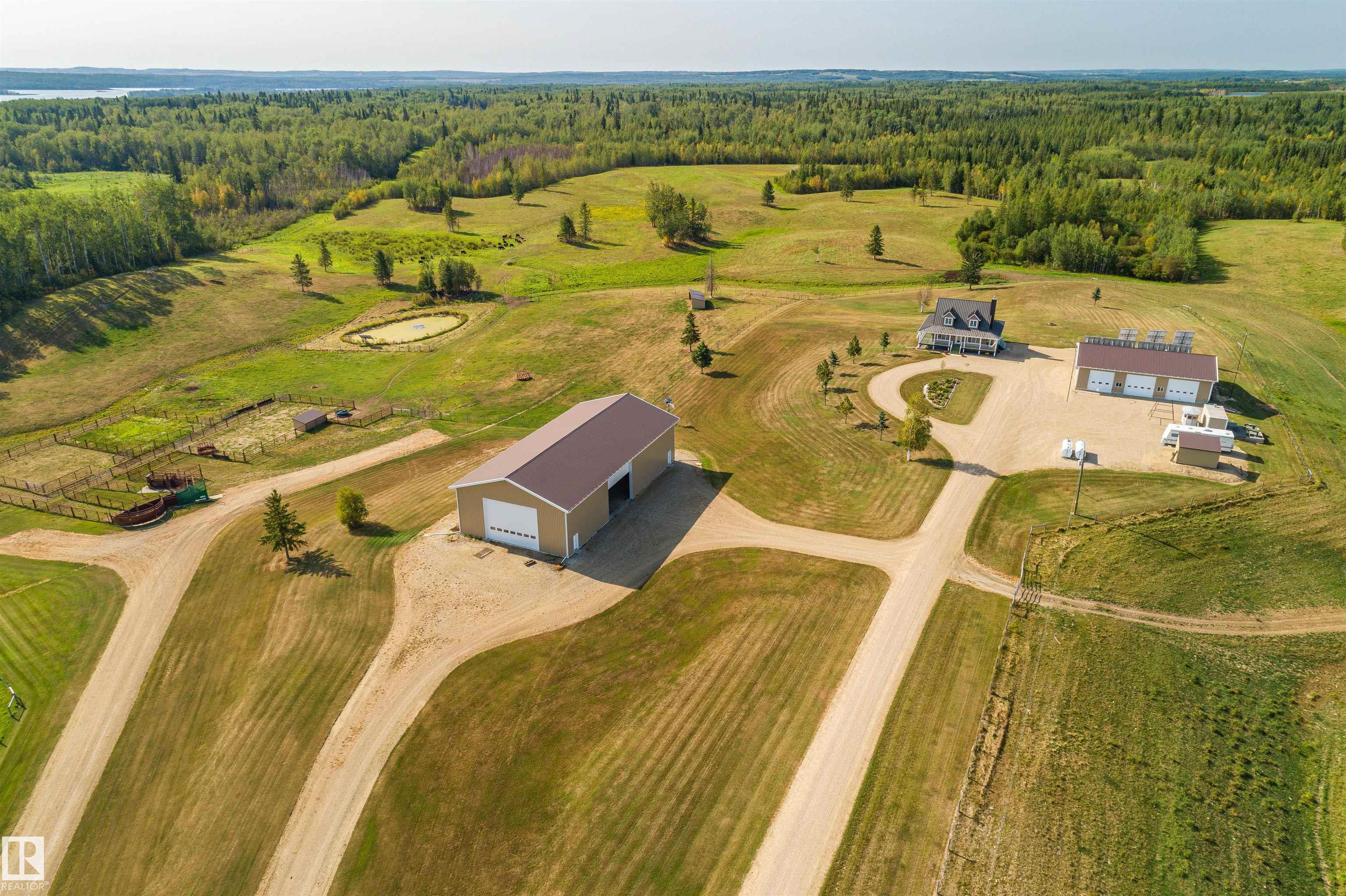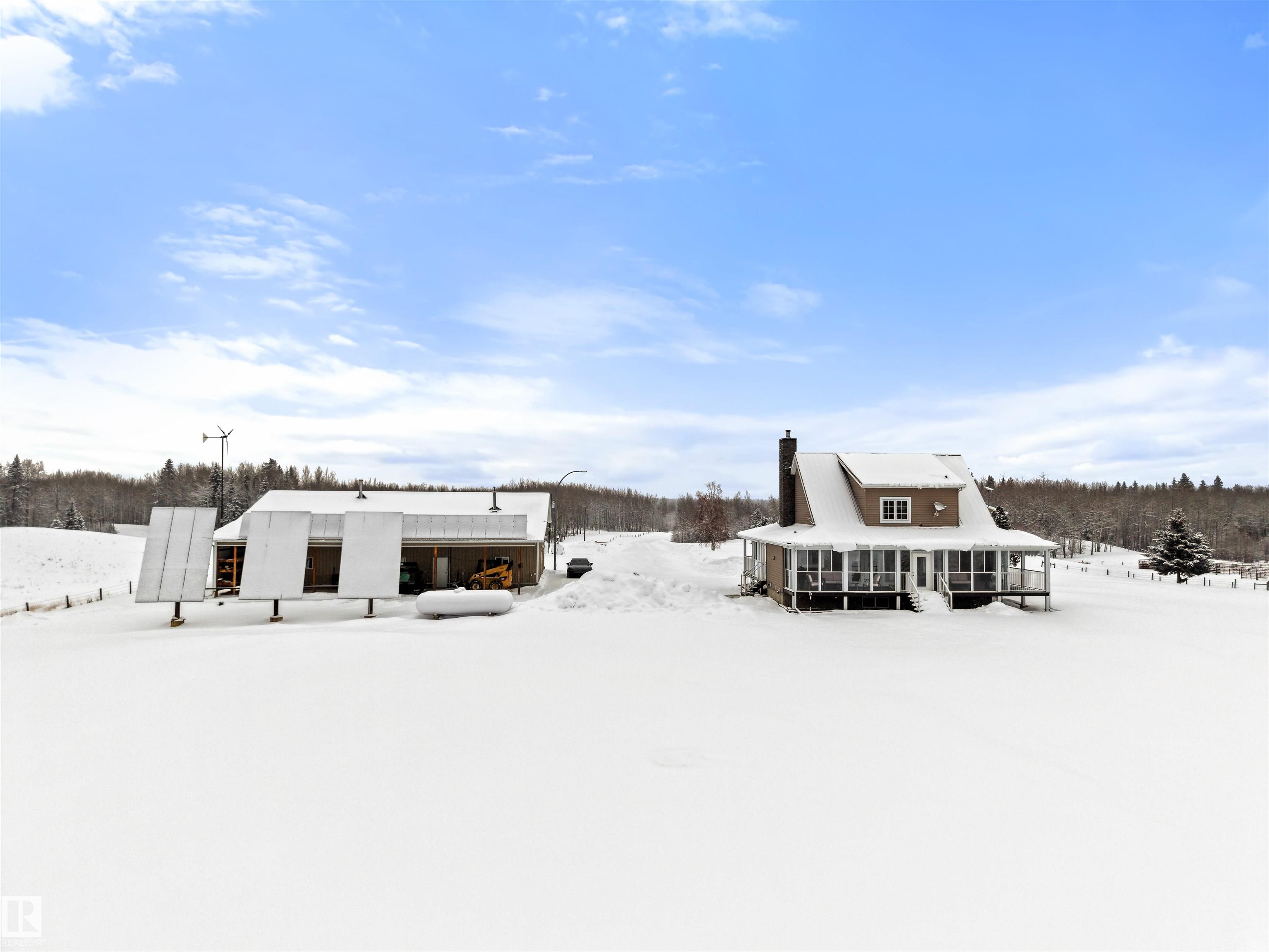 A true trophy property on a quarter section, built for independence, resilience, and land that truly works. Home and buildings are engineered all conditions, relying primarily on on-site power generation?off-grid capable without sacrificing comfort. Cape Cod?inspired home features real hardwood floors, in-floor heat, vaulted ceiling living room with wood-burning fireplace, and a full wraparound balcony to enjoy every view and follow the sun from sunrise to sunsetas the landscape shifts around you. EnerGuide 88/100 with a 9kW solar system. Heated workshop with new epoxy floors and in-floor heat for year-round projects. Insulated equipment shop doubles as a riding arena, calving barn, or ag workspace, supported by integrated solar and wind systems. Each acre is carefully manicured?pasture and woods in balance?a clear testament to stewardship. Ideal for cattle or horses, with hunting and wilderness recreation within your own property. A truly rare offering that must be seen to be fully appreciated.