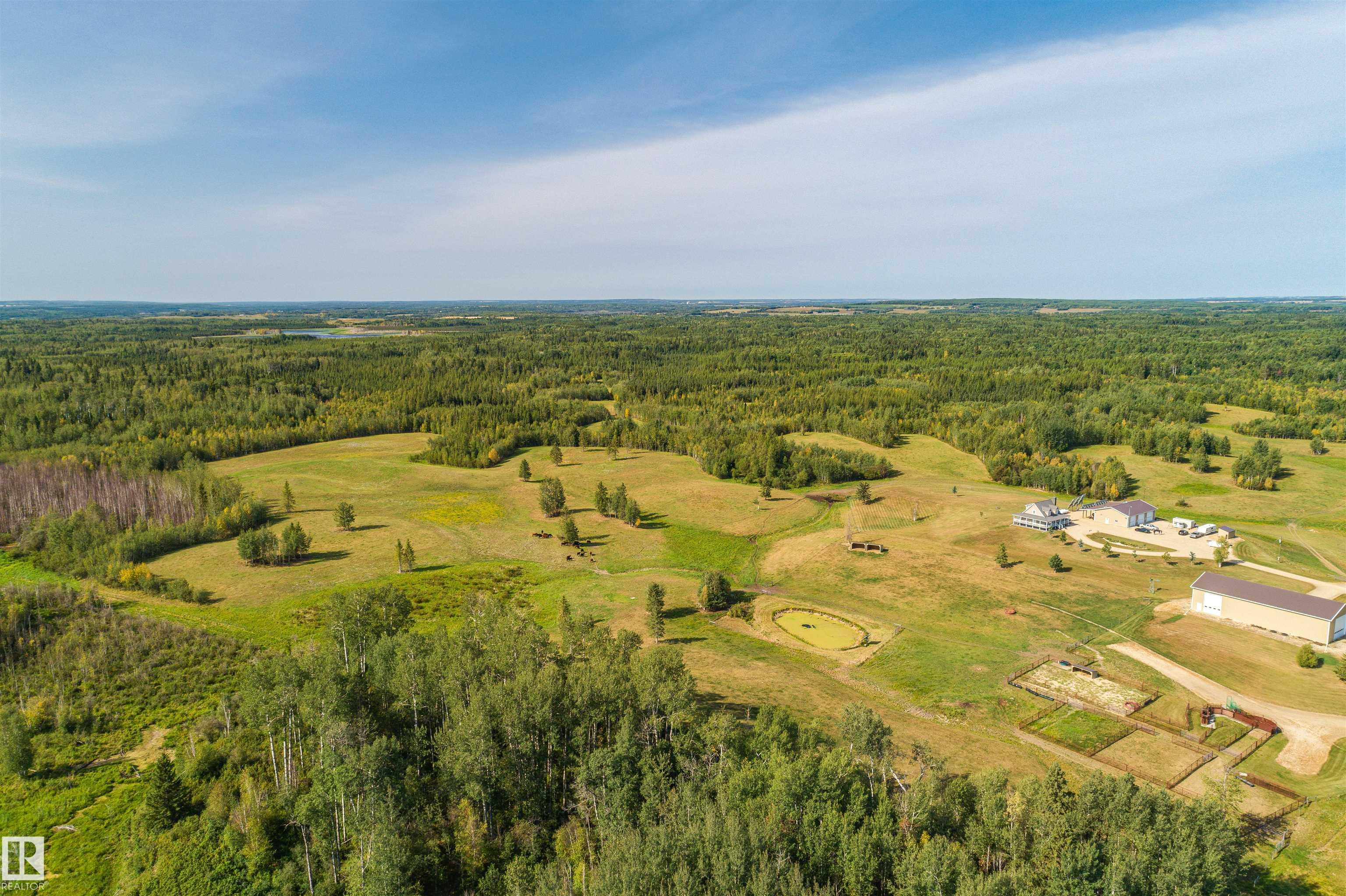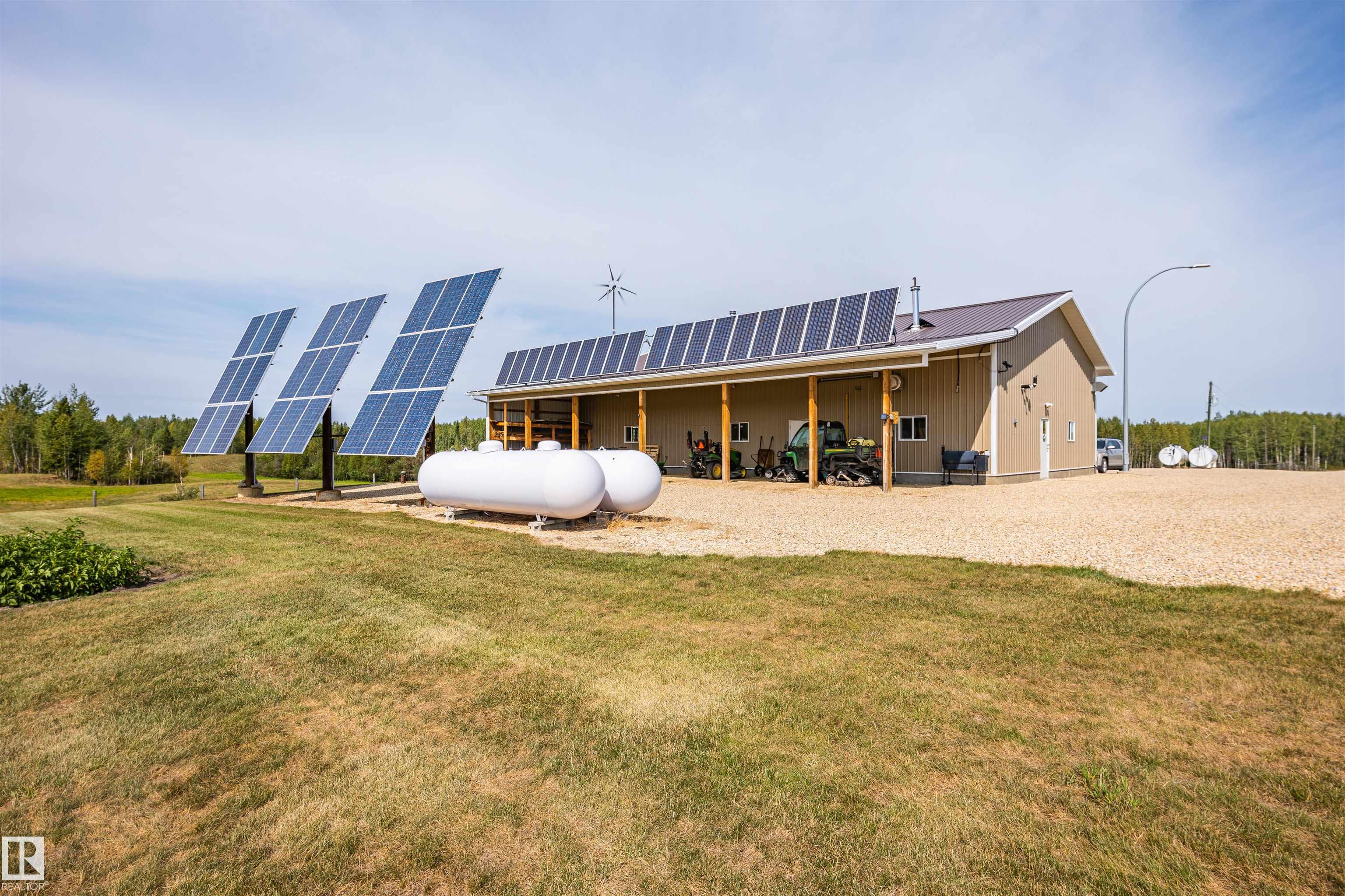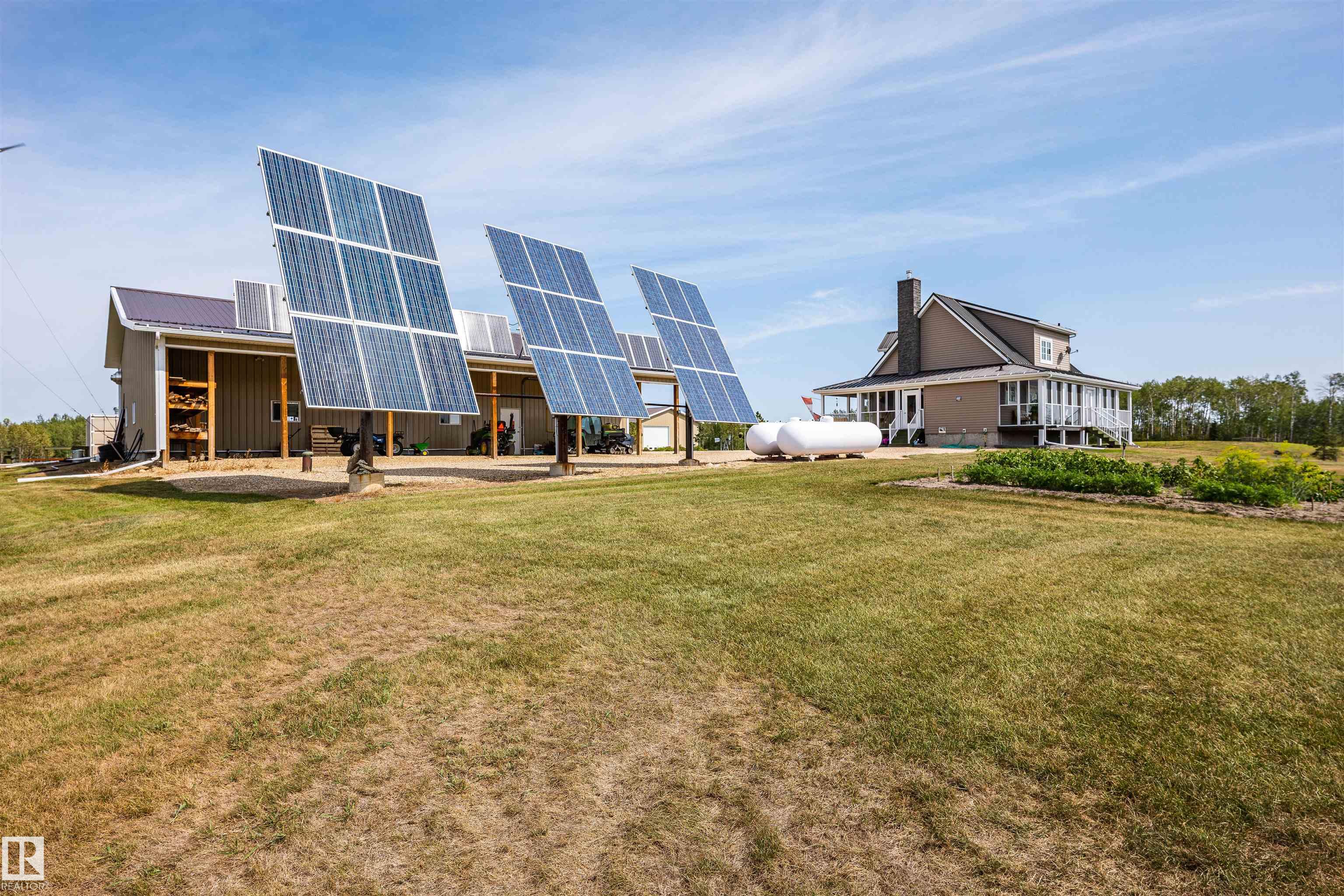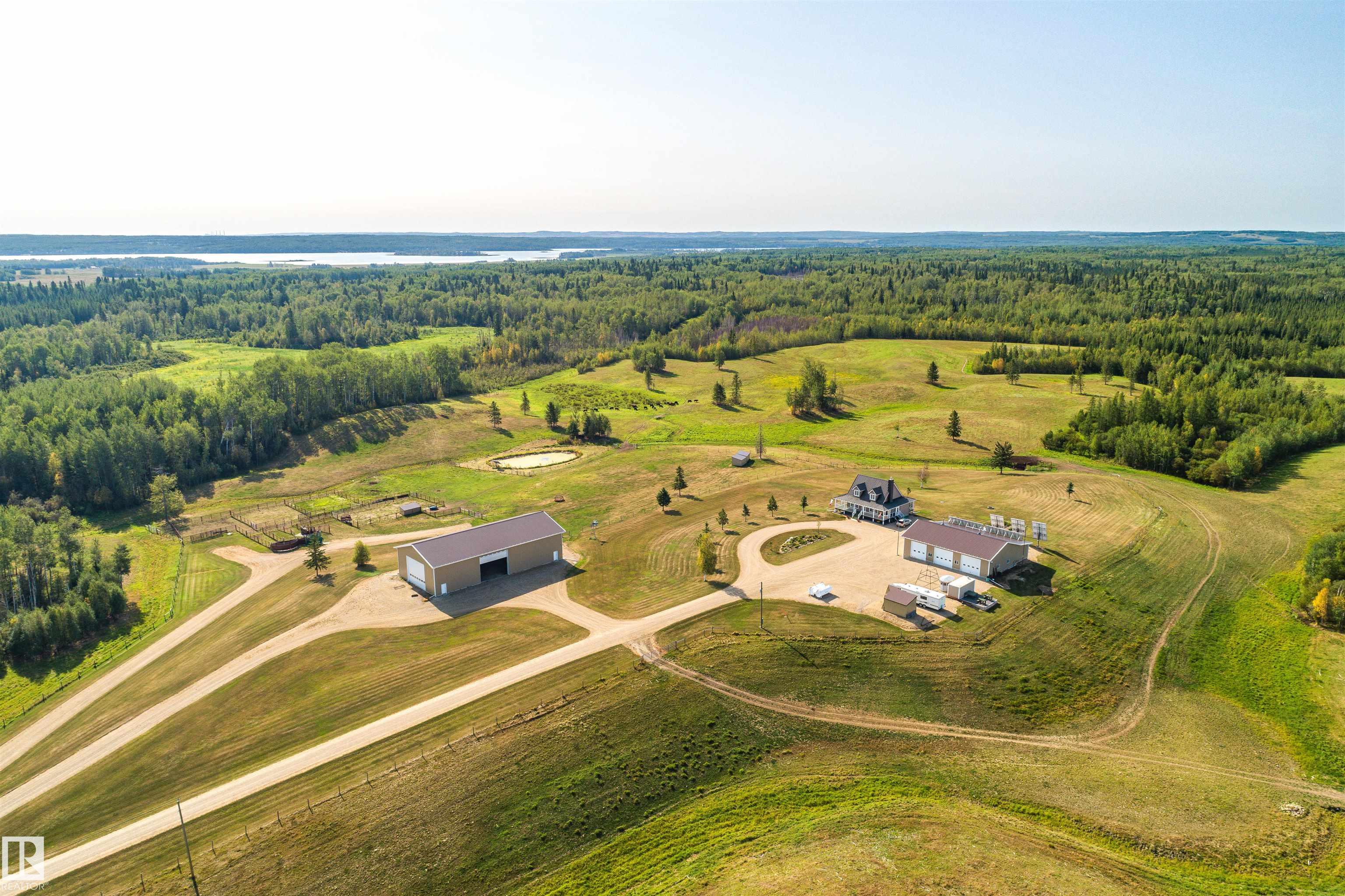 A true trophy property on a quarter section, built for independence, resilience, and land that truly works. Home and buildings are engineered all conditions, relying primarily on on-site power generation?off-grid capable without sacrificing comfort. Cape Cod?inspired home features real hardwood floors, in-floor heat, vaulted ceiling living room with wood-burning fireplace, and a full wraparound balcony to enjoy every view and follow the sun from sunrise to sunsetas the landscape shifts around you. EnerGuide 88/100 with a 9kW solar system. Heated workshop with new epoxy floors and in-floor heat for year-round projects. Insulated equipment shop doubles as a riding arena, calving barn, or ag workspace, supported by integrated solar and wind systems. Each acre is carefully manicured?pasture and woods in balance?a clear testament to stewardship. Ideal for cattle or horses, with hunting and wilderness recreation within your own property. A truly rare offering that must be seen to be fully appreciated.