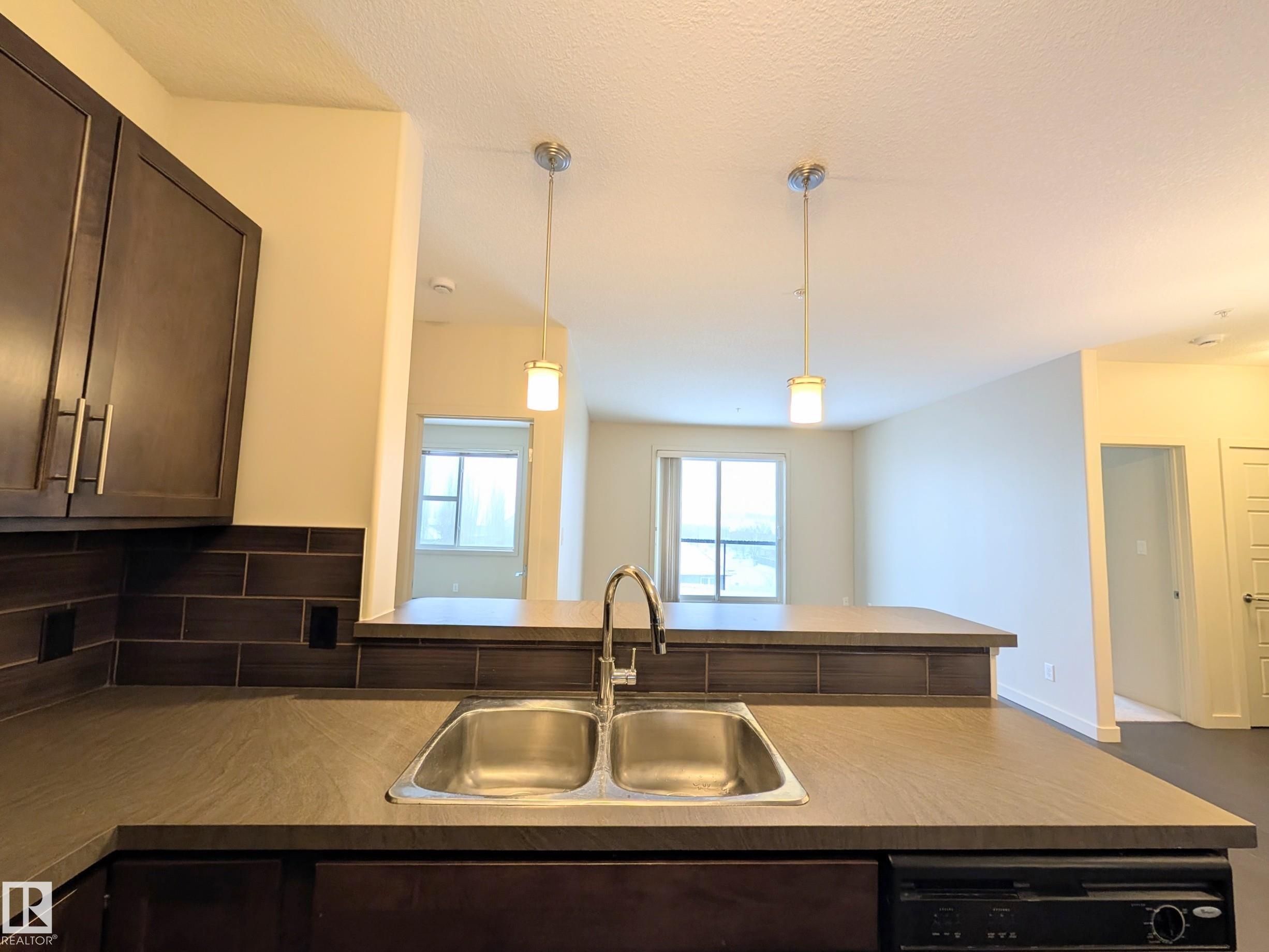 New Paint New Carpet, this 2 Bedrooms 2 Full Baths + Den Top Floor Condo in Ambleside is conveniently located across from the Currents of Windermere Shopping Centre. Enjoy over 950 sq.ft. of living space w/ 9' Ceilings & South Facing Balcony, perfect for Sunsets. The Kitchen has lots of Cabinets, Dual Sinks, 4 pc. Appliances and Breakfast Bar. The Den is great for a Reading Room or in-suite Storage. Primary Bedroom comes w/ Rough in for Portable AC, Walkthrough Closets leads to the 4 pc Ensuite w/ Double Sinks and Linen Shelvings. Great size 2nd Bedroom next to another 4 pc. Full Bath & Laundry. Titled Underground Heated Parking w/ Storage Cage in Front. $529/mthly condo fee includes Heat, Water, Snow Removal, Landscaping, Gym Access.