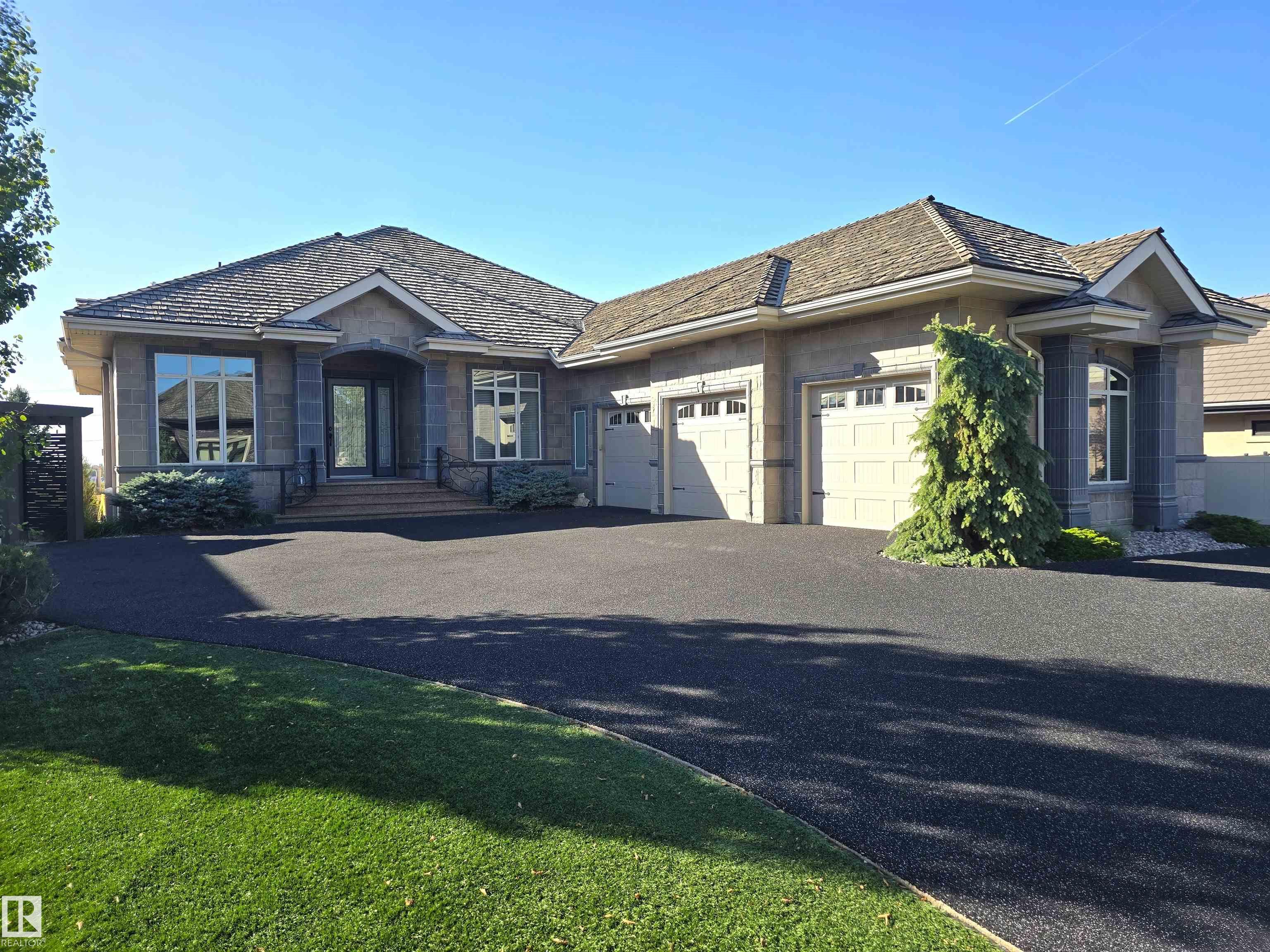Exquisite Custom Executive Walkout Bungalow in a Prestigious Setting! This remarkable residence showcases a spacious living room with a cozy gas fireplace and a chef?s kitchen adorned with rich walnut cabinetry, granite, island & pantry, flowing into the dining area with access to your covered patio. Designed for year-round enjoyment, the patio features slate floors, fireplace, retractable screens, dedicated BBQ area & stairs to your private backyard retreat. The primary suite offers a custom WIC & spa-inspired 5-pc ensuite. Also on the main: a second bedroom, den, 3-pc bath & mud/laundry. The walkout level boasts a grand entertaining space with wet bar, games area, gym with steam shower, hobby room, 2 additional bedrooms, 4-pc bath, second laundry & access to the covered patio surrounded by immaculate, low-maintenance landscaping. Premium finishes include walnut cabinetry, granite counters, American cherry hardwood, A/C, triple garage, RV parking & shed. Timeless elegance meets exceptional craftsmanship!