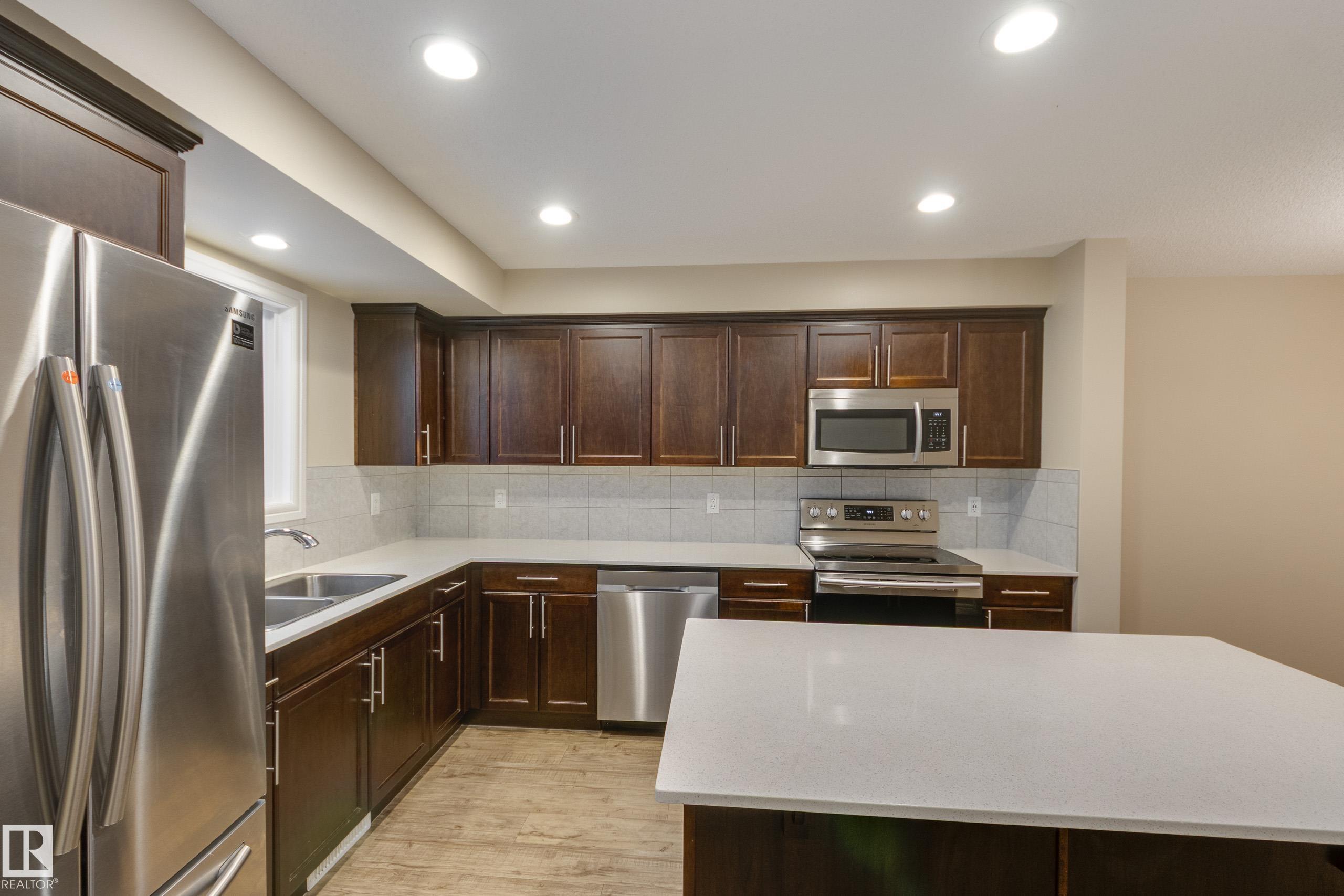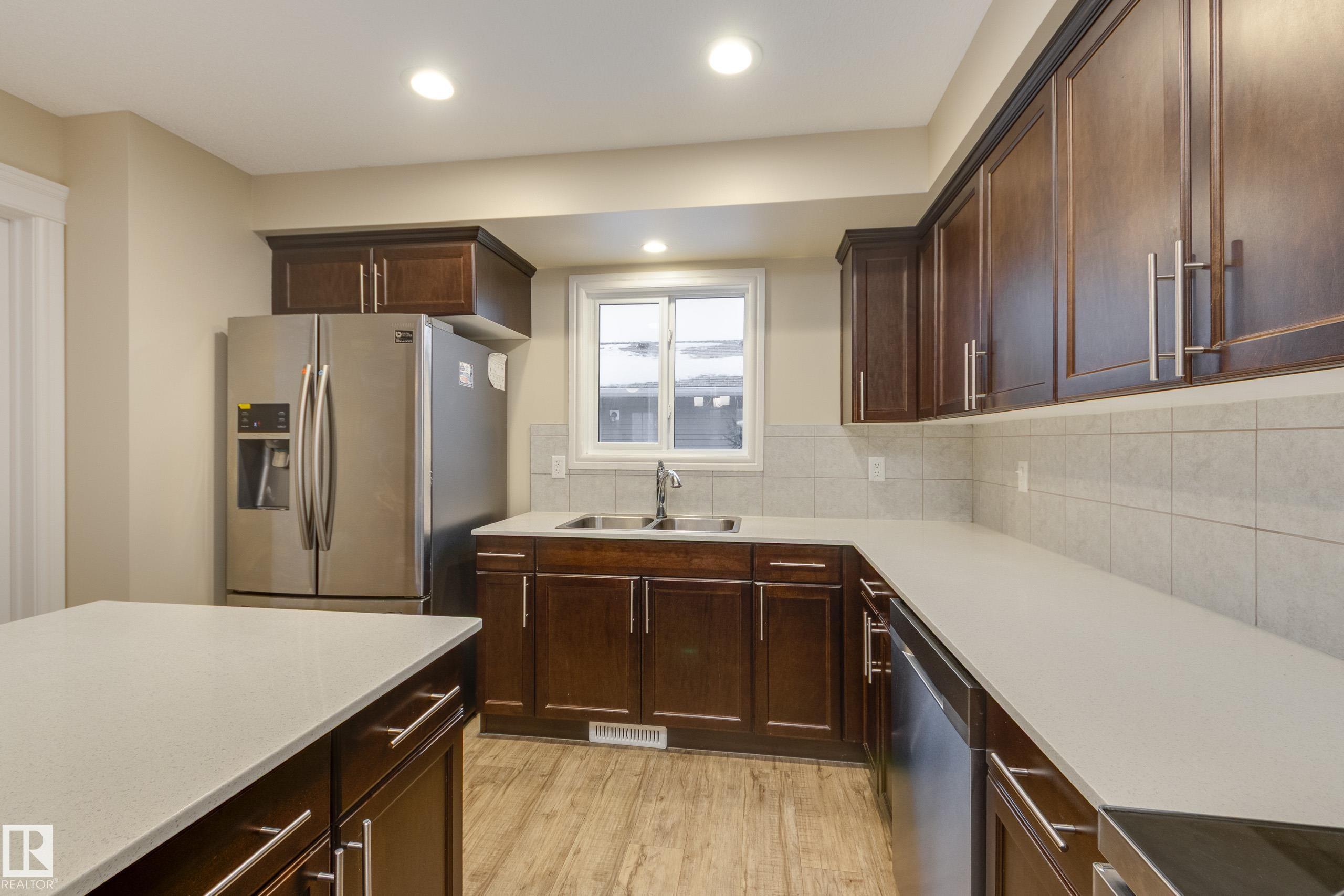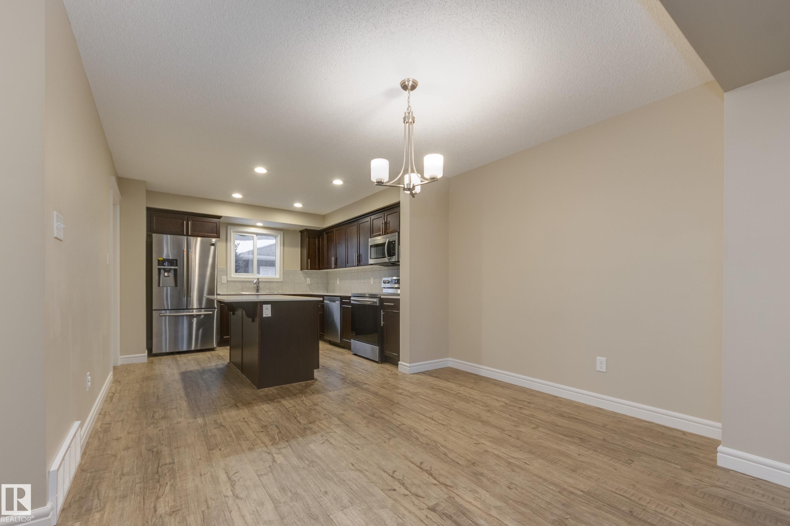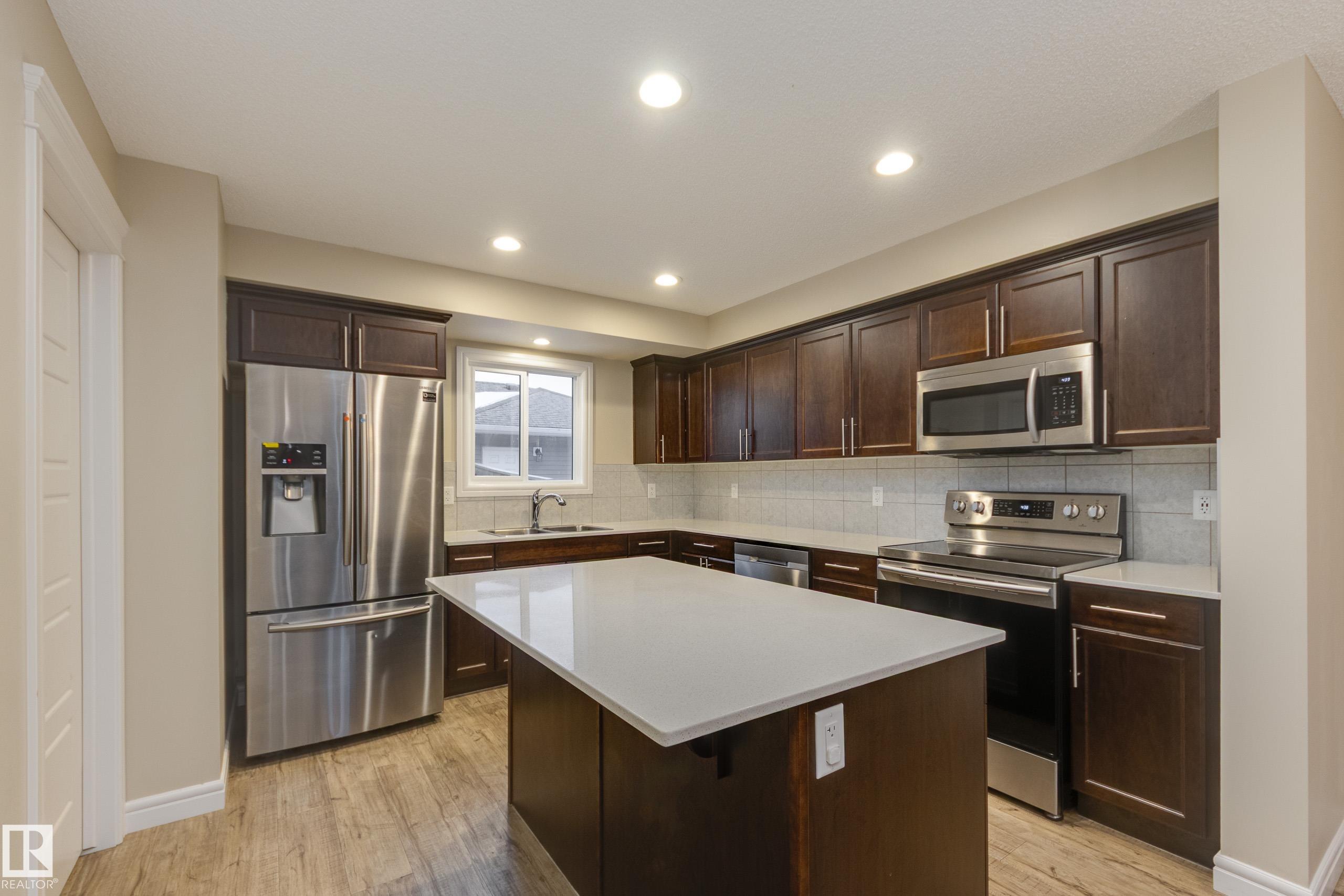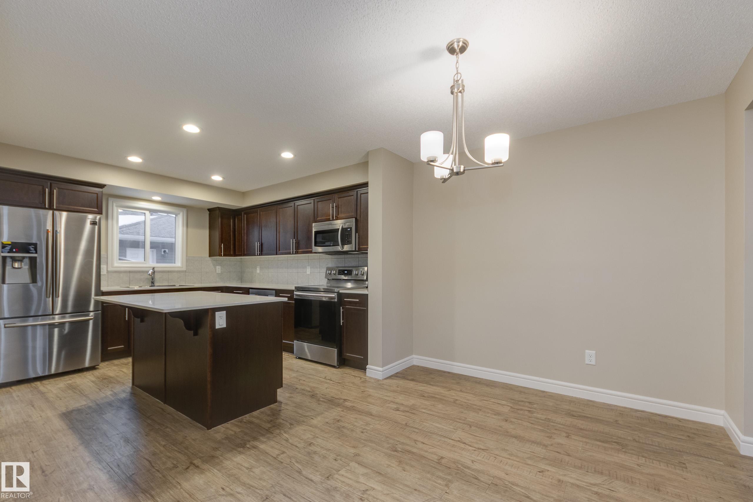 Delightful Desrochers townhome has NO CONDO FEES! Everything you could ask for PLUS a double detached garage. Great location across from the school and park. Spacious front foyer and a very open main floor with living room flowing through to dining and the kitchen at the back has a large island, quartz counter tops and lots of cabinets. Stainless steel appliances are included. Main floor laundry room at the back entrance and the half bath is strategically located at the basement entry. Basement is not developed but potential is there for adding more living space in future! The staircase to the second floor has spindle rails and an open area at the top of the stairs plus two good sized bedrooms share a full bathroom. The primary suite is large with a full ensuite bath and a large walk-in closet. This is a perfect affordable home in an exceptional location.
