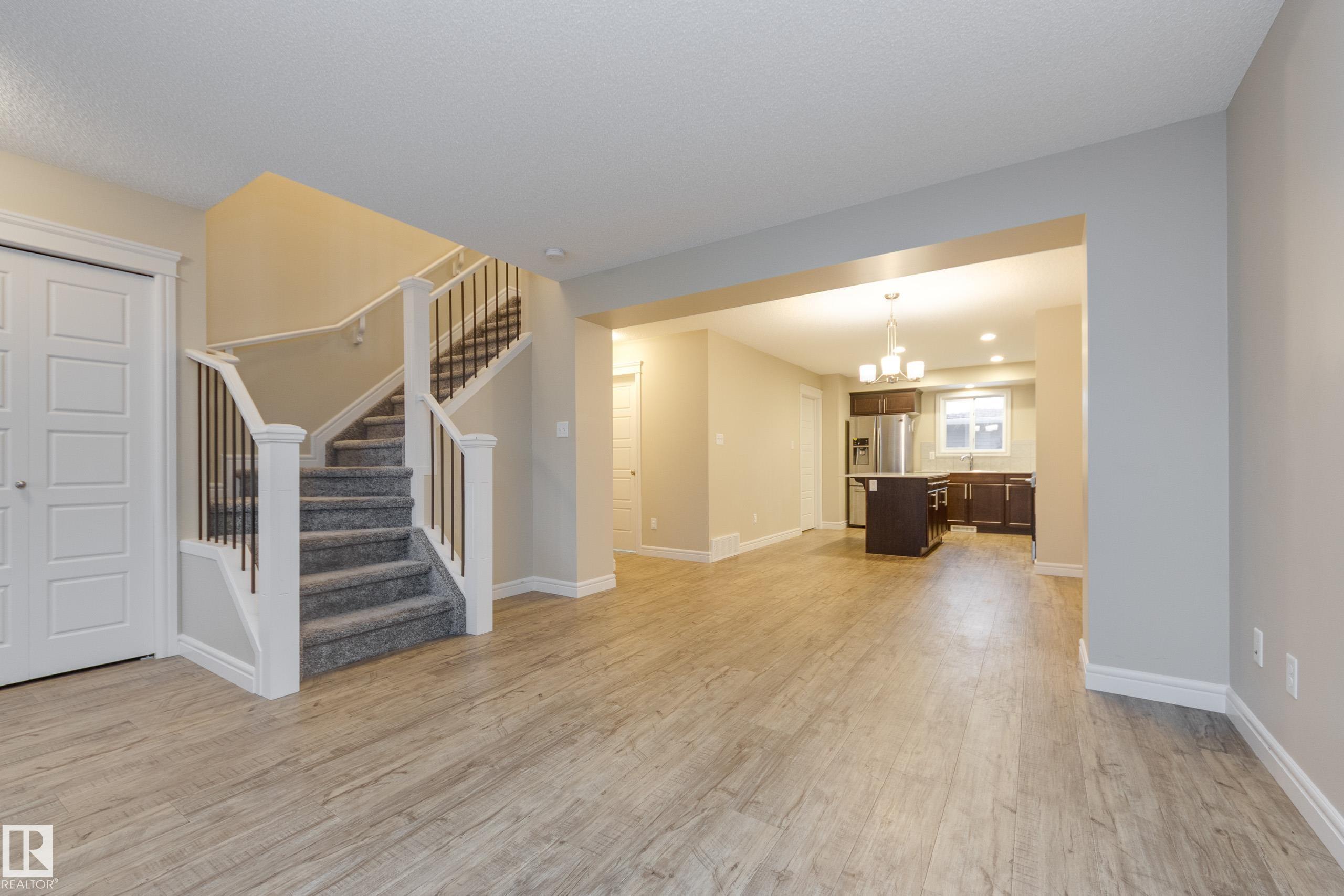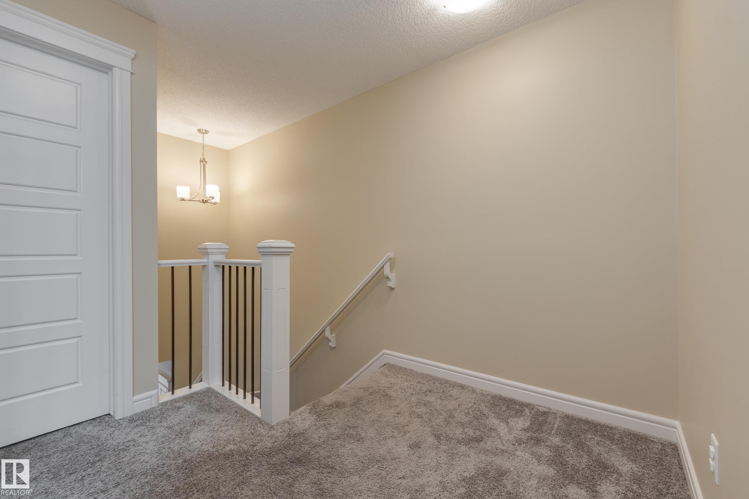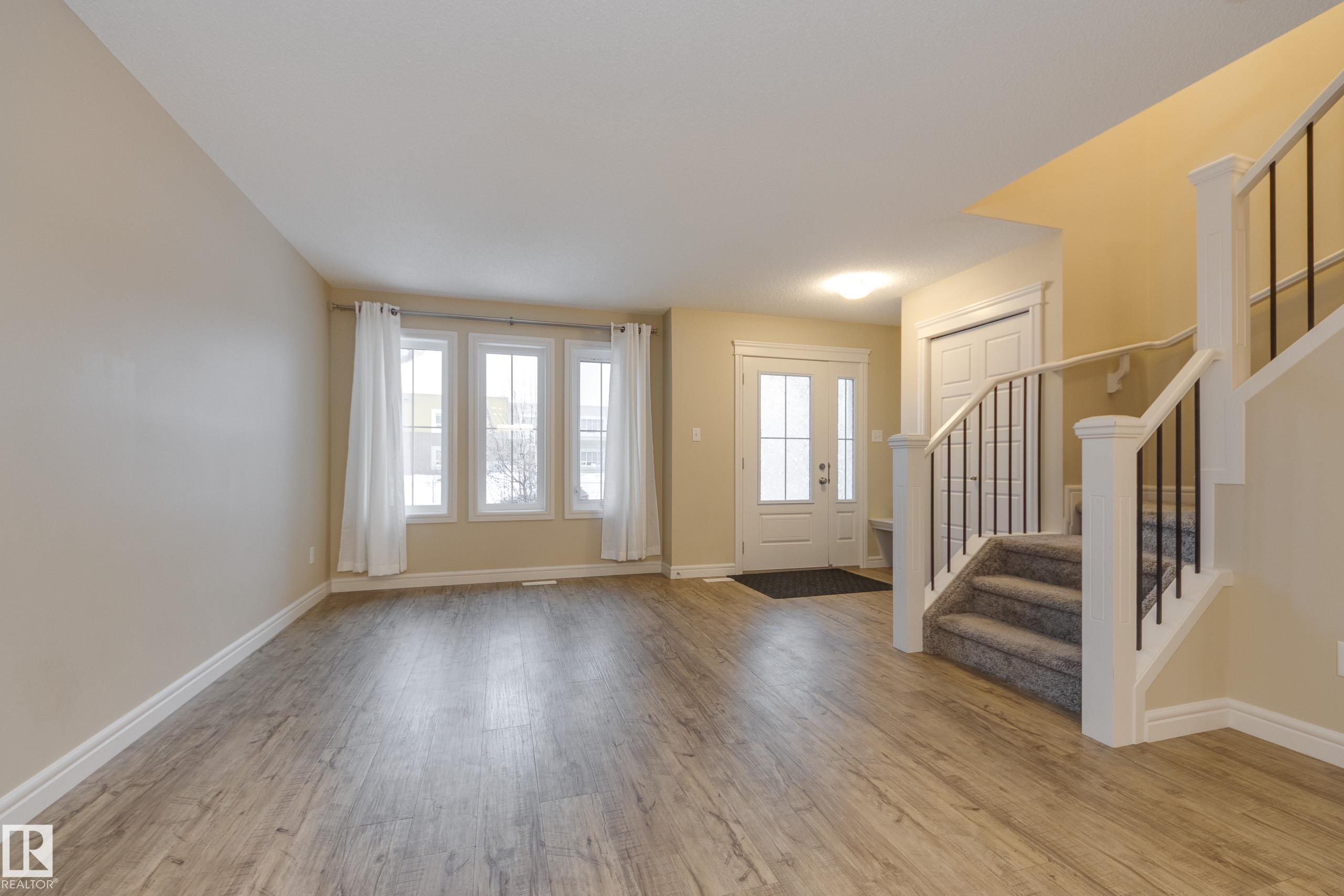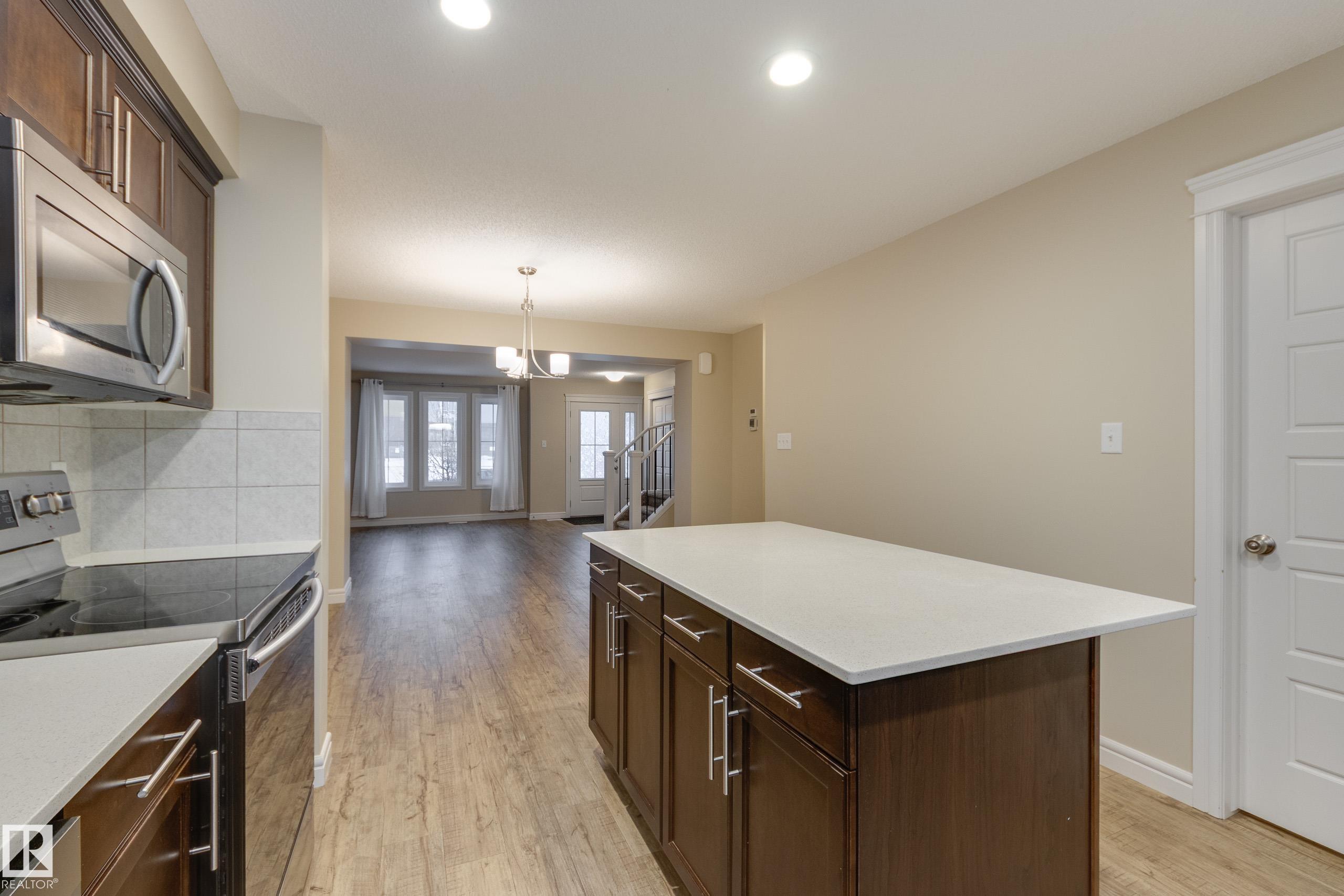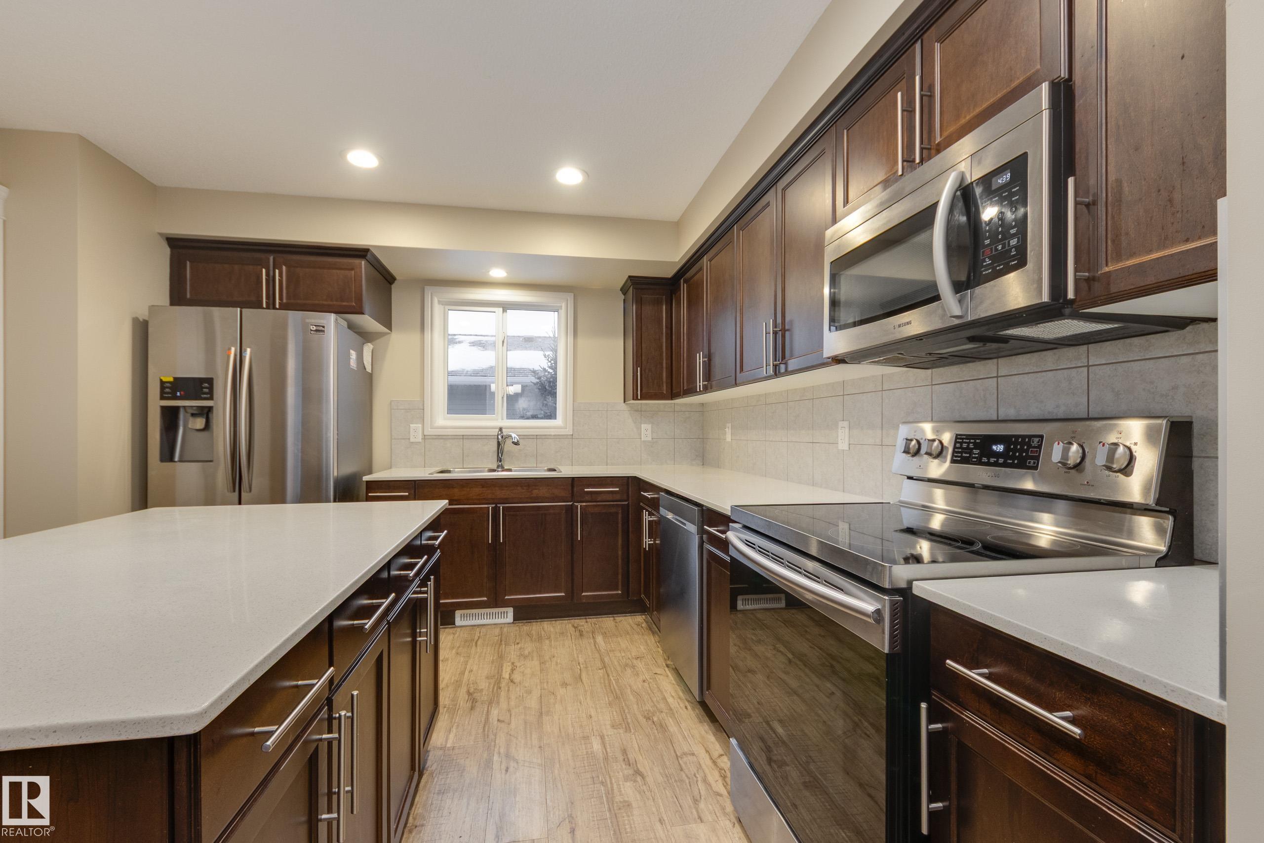 Delightful Desrochers townhome has NO CONDO FEES! Everything you could ask for PLUS a double detached garage. Great location across from the school and park. Spacious front foyer and a very open main floor with living room flowing through to dining and the kitchen at the back has a large island, quartz counter tops and lots of cabinets. Stainless steel appliances are included. Main floor laundry room at the back entrance and the half bath is strategically located at the basement entry. Basement is not developed but potential is there for adding more living space in future! The staircase to the second floor has spindle rails and an open area at the top of the stairs plus two good sized bedrooms share a full bathroom. The primary suite is large with a full ensuite bath and a large walk-in closet. This is a perfect affordable home in an exceptional location.