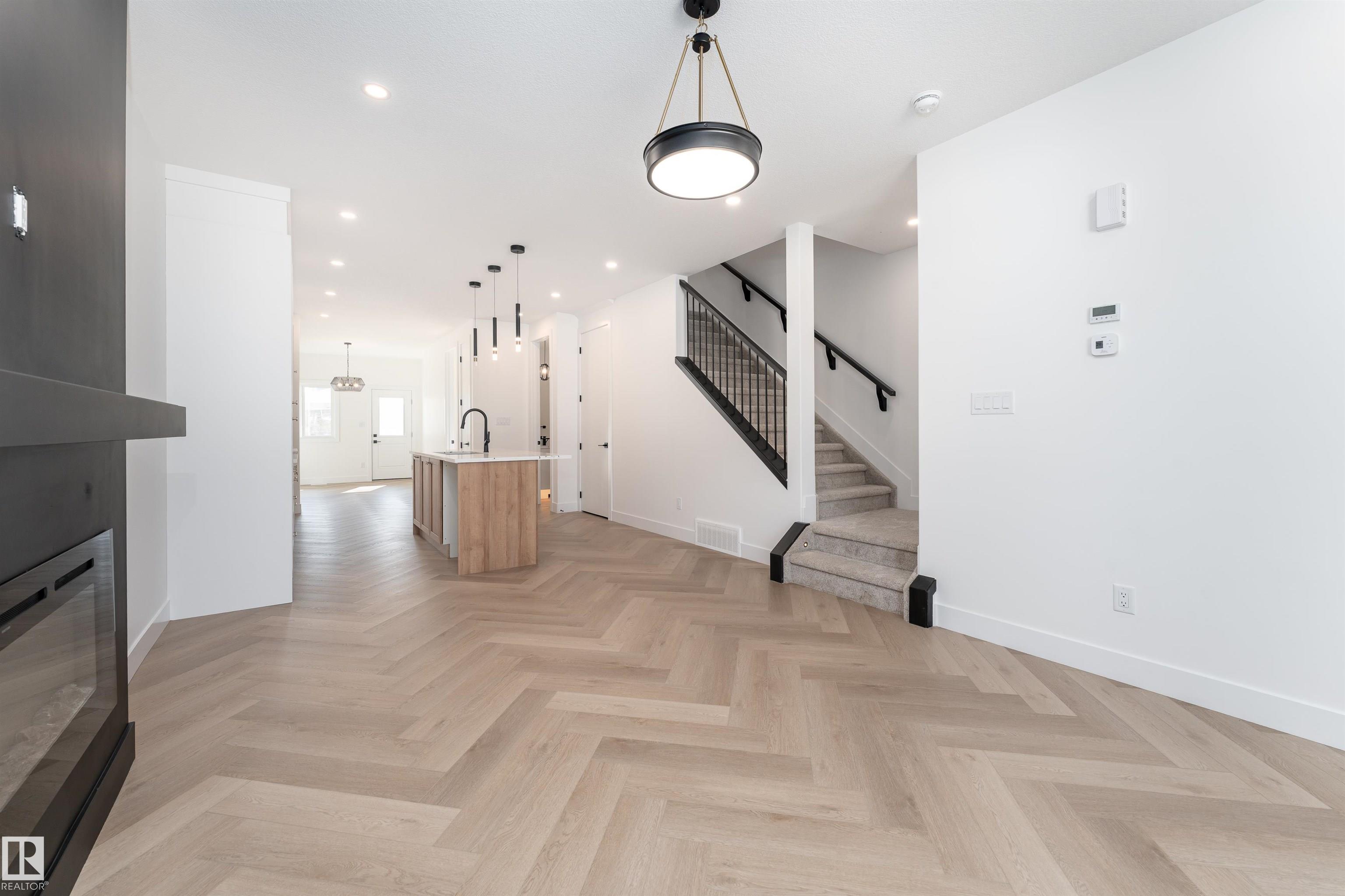Thoughtfully designed and move in ready, this 1,750 sq ft 2025 built half duplex is located in the growing community of Starling. The main floor offers an airy open layout with 9 ft ceilings, durable vinyl flooring, and large windows that fill the space with natural light. A beautifully finished floor to ceiling tiled electric fireplace creates a warm focal point in the living area. The kitchen features modern white cabinetry, warm wood tone accents, and a generous island, making it both functional and inviting. Upstairs you will find three well sized bedrooms, including a comfortable primary suite with walk in closet and private ensuite, along with upper floor laundry. The unfinished basement with a separate side entrance allows for excellent future development potential. Complete with a double detached garage and conveniently located near parks, walking trails, ponds, schools, shopping, and quick access to Anthony Henday and Yellowhead.