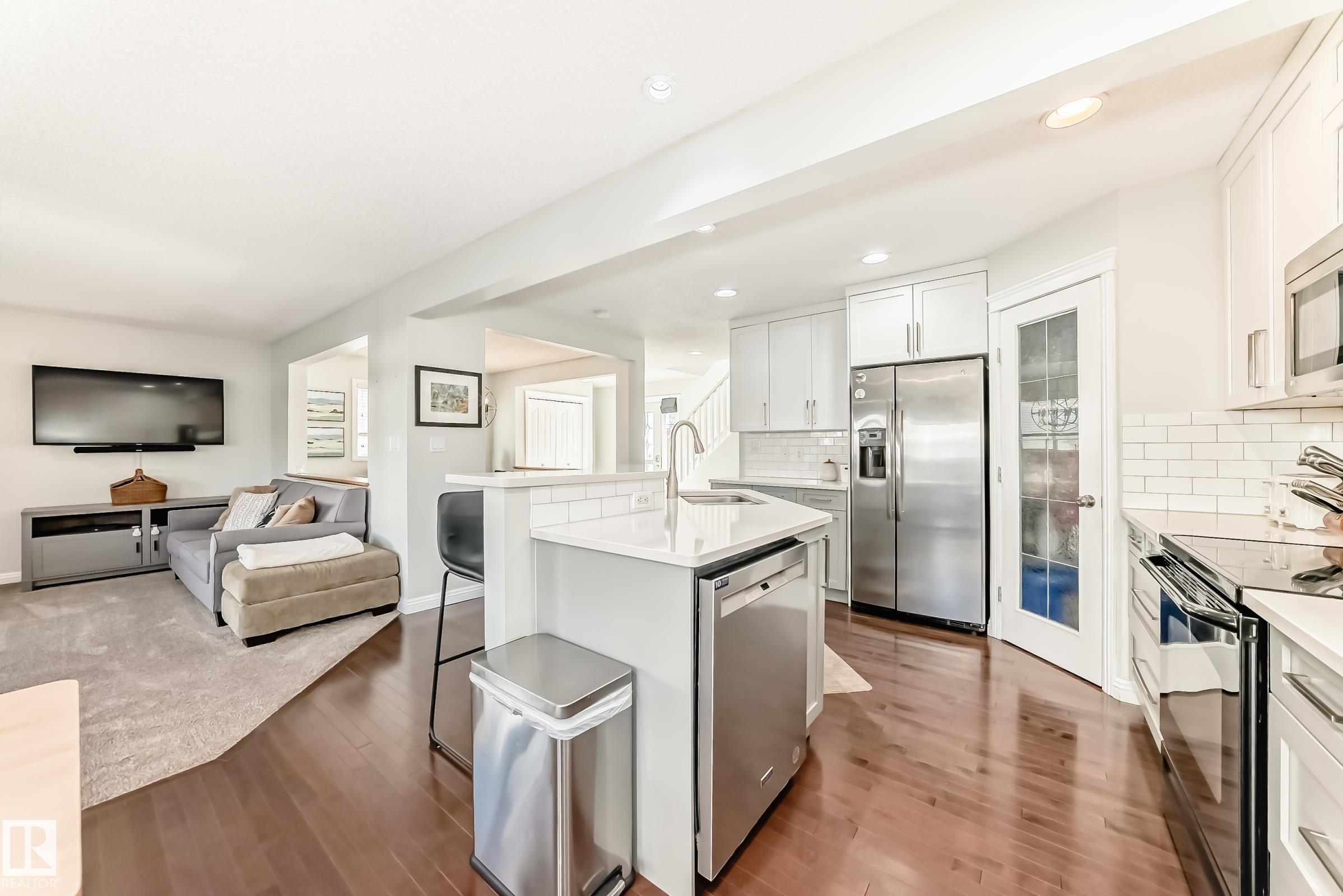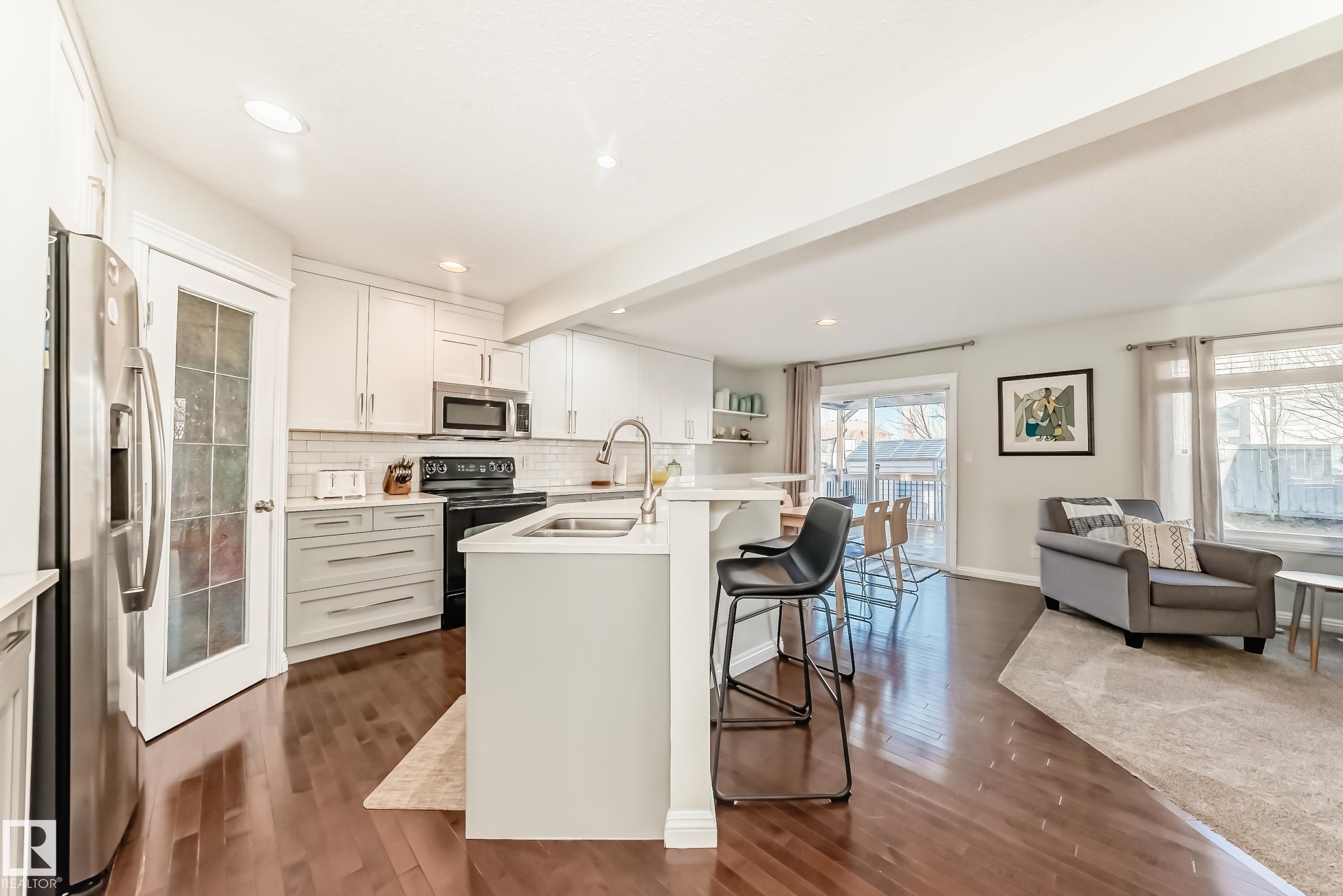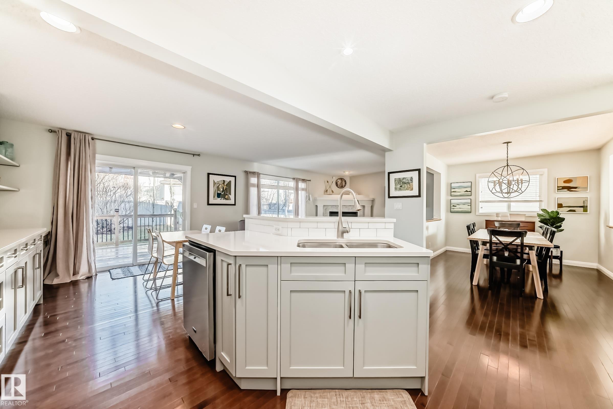 Welcome to the desirable Hamptons community! This home is steps from parks, ponds, and walking trails, and sits across from the pond on a wide street with a comfortable sense of space between homes. This fully finished 5 bedroom home is located in an established neighborhood with schools and amenities in place, including Bessie Nichols Public K-9 and Sister Annata Brockman Catholic K-9, both a short walk away. The main floor features updated custom cabinetry, while the fully finished basement offers 2 bedrooms, a spacious living area, and a full bathroom with heated floors. Upstairs offers an expansive bonus room, a laundry room, and three bedrooms, including a lovely primary retreat with a walk-in closet and a spa-like 5-pc ensuite with double sinks, a soaker tub and a separate shower. Clean, well cared for, and tastefully updated throughout, this move-in ready home also provides quick access to Anthony Henday Drive, the Whitemud, shopping, dining, and everyday amenities. Simply unpack and enjoy.