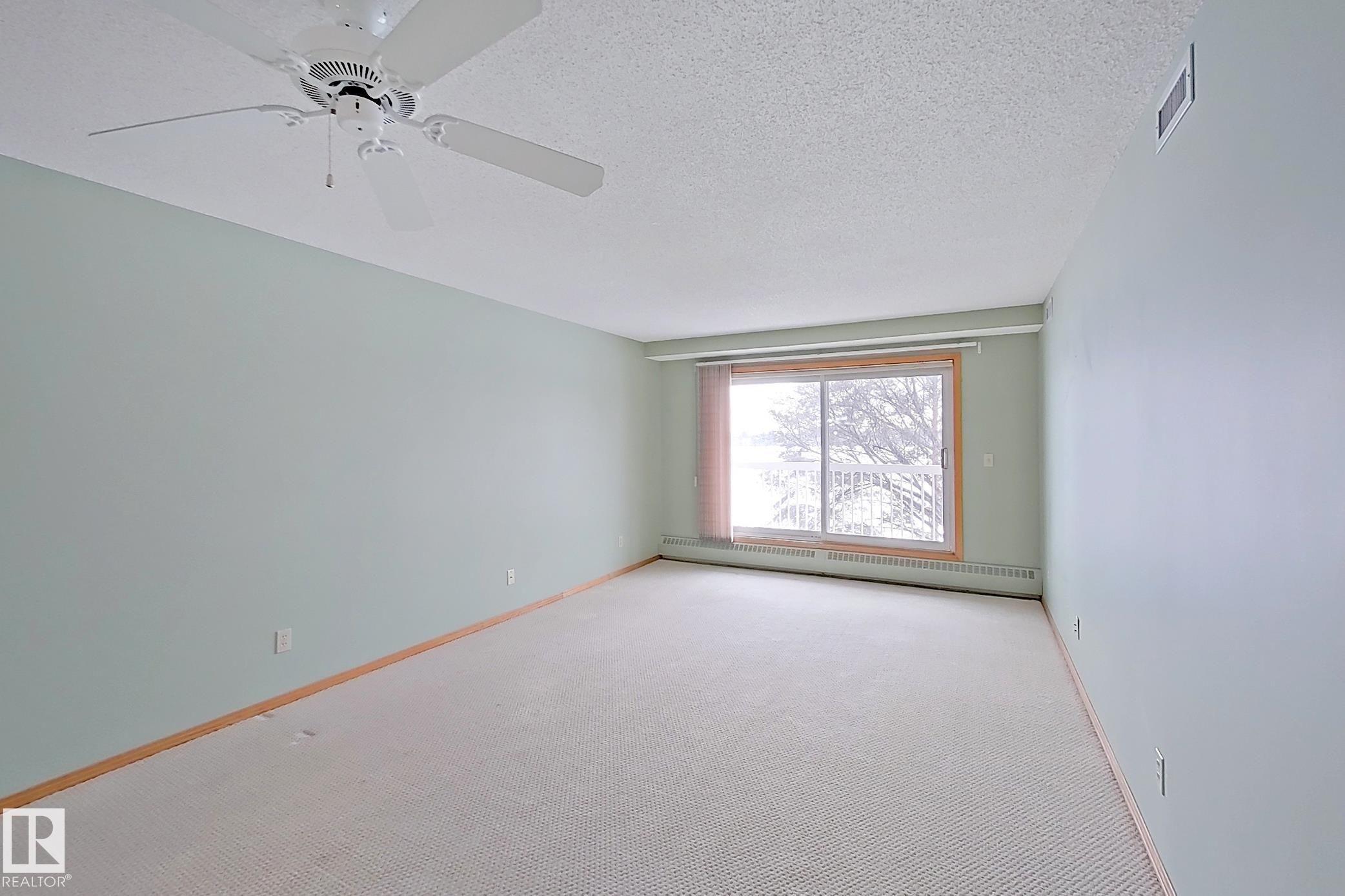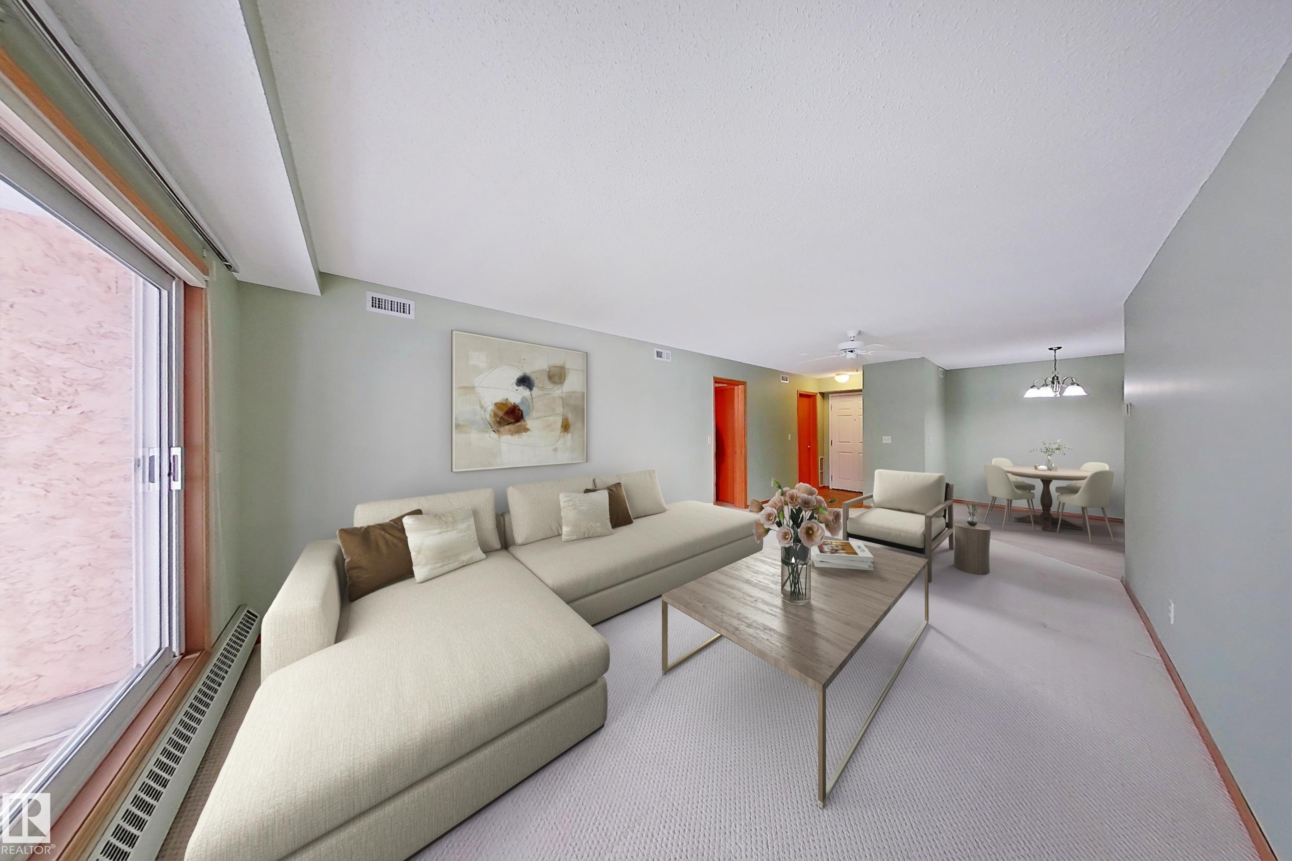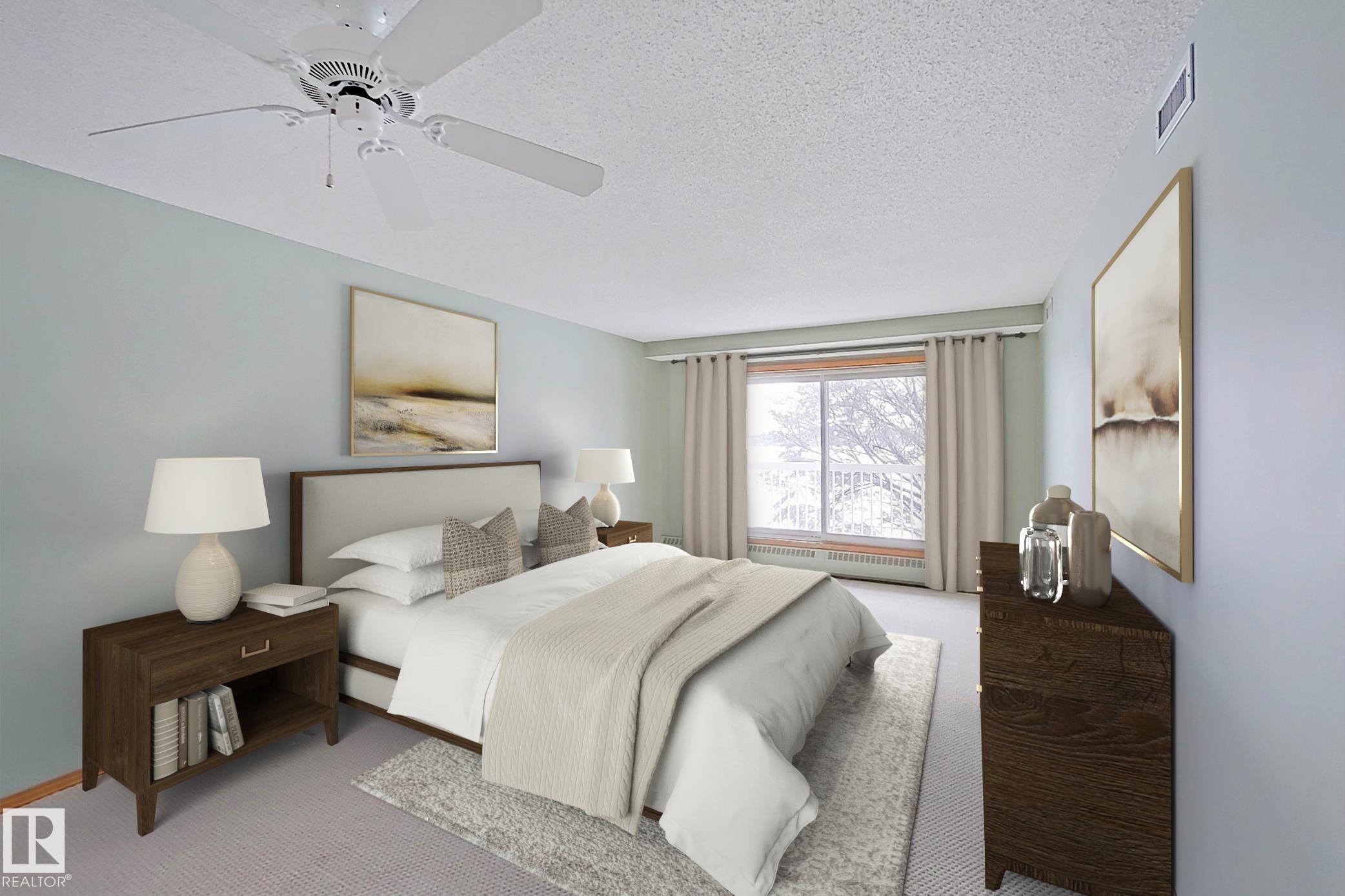 Welcome to Heritage Mansion East - adult 55+ building. Fantastic & bright, third floor condo with south exposure & a view of Kaskitayo Park. This unit offers very functional floor plan with bedrooms on opposite sides, open design & generous room sizes. You will love cooking in fantastic kitchen, that has plenty of cabinet space , stainless steel appliances (including brand new stove) & updated flooring. Living room is connected to a balcony, that overlooks tree crown and a park. Secondary bedroom offers built-in Murphy bed. Unit has central A/C. Primary suite c/w 3 pc ensuite bath & a huge ( 11.3' by 4.98' )walk-in closet. In-suite laundry is spacious & has extra storage space and comes with a freezer. Park your car in underground, heated stall & store your stuff in secure storage cage. Building offers Library, Exercise Room, Craft Room, Social Room, and a Workshop. Great location within walking distance to all Medical, Groceries, & ETS right out front w/a 10 min walk to Century Park LRT. It is your move!