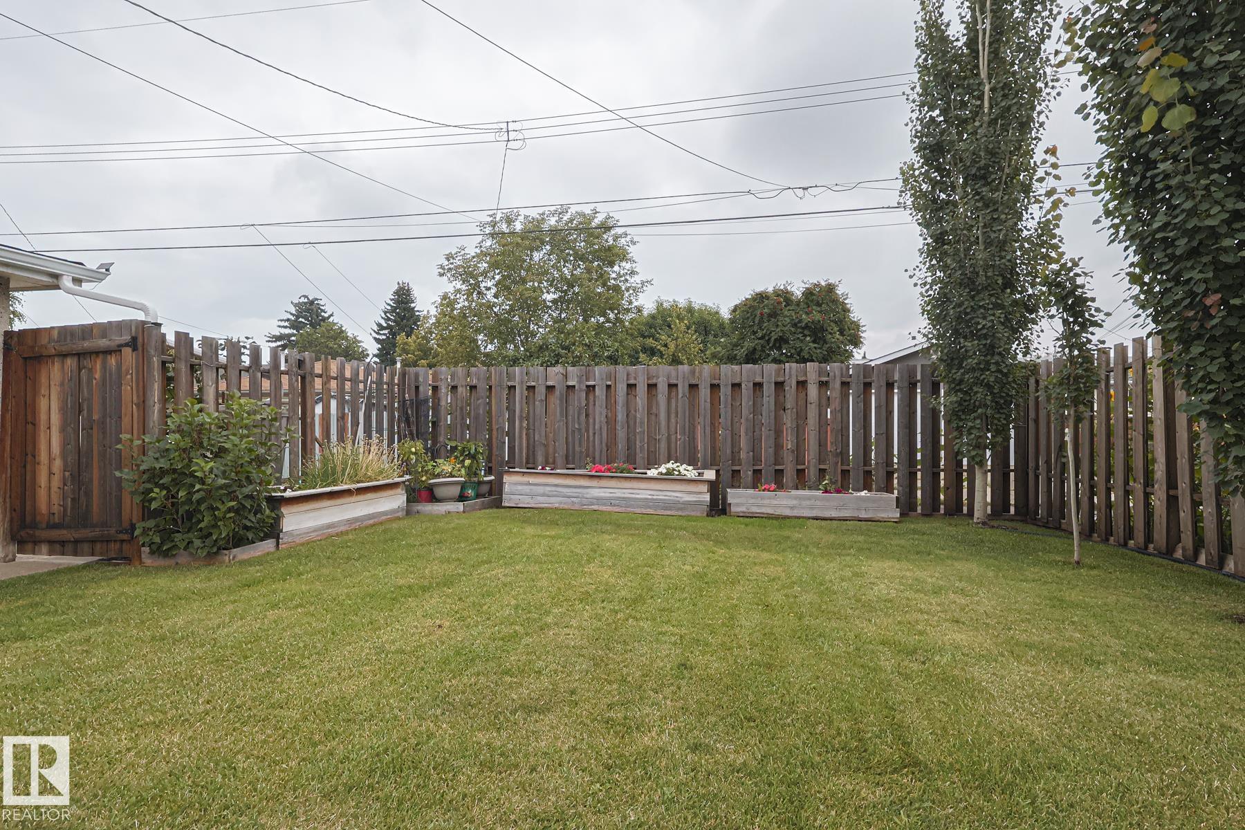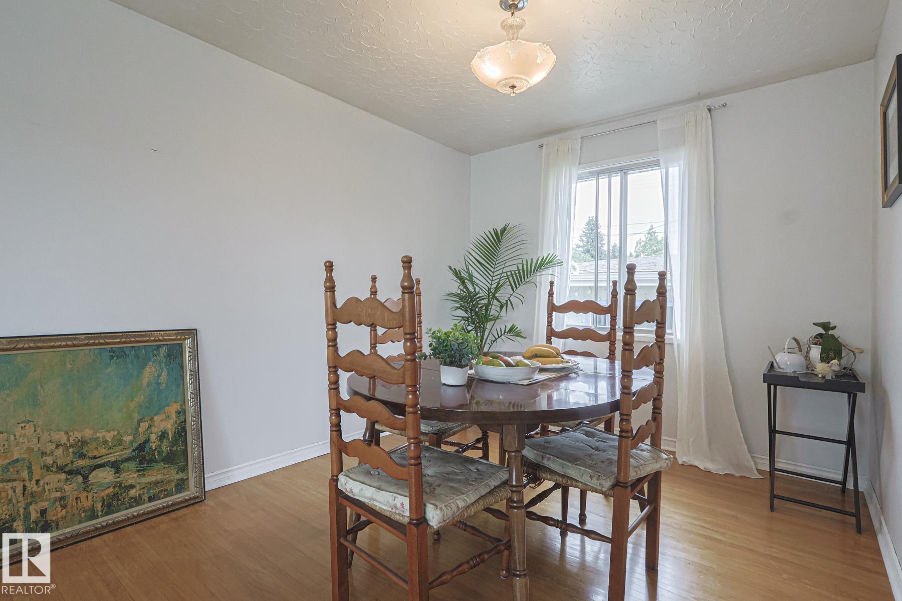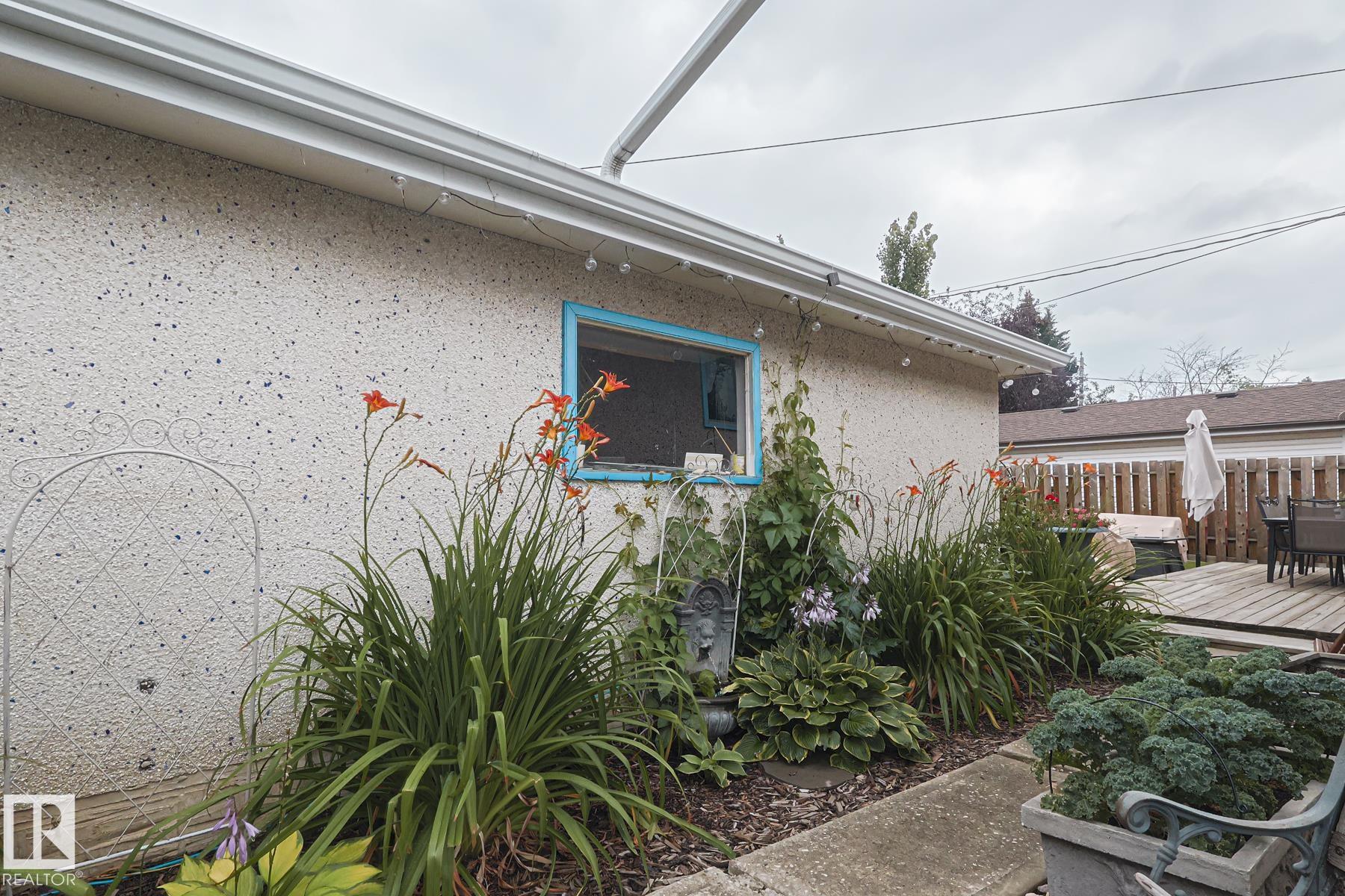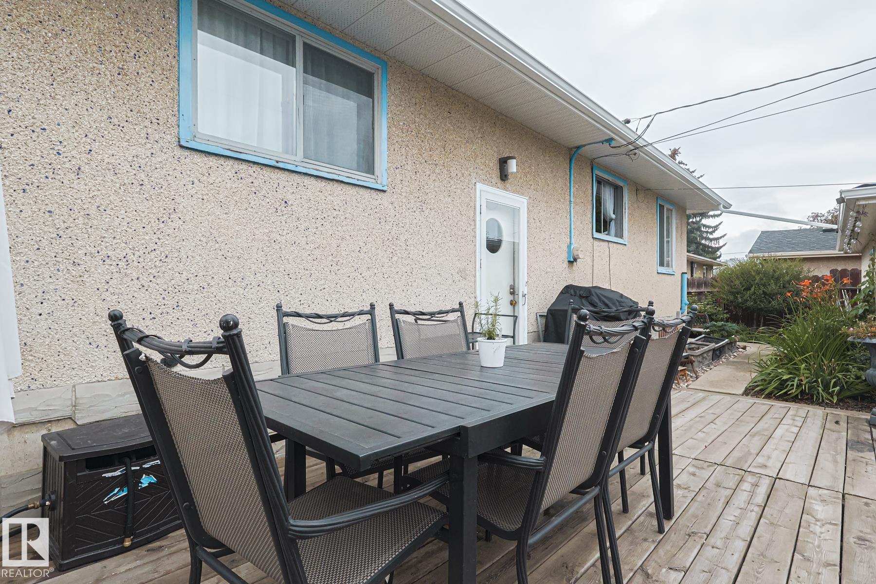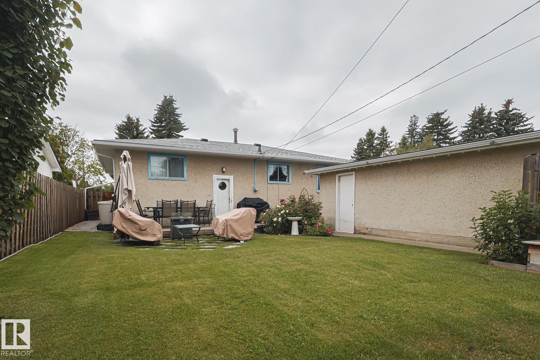 This gem has so much to offer; new SEWER LINE, SHINGLES, EAVES, SOFFITS (house & garage), HWT, CENTRAL AIR CONDITIONING and a FULLY RENOVATED MAIN FLOOR BATHROOM. Inside you will find the ORIGINAL HARDWOOD FLOORING throughout most of the MAIN FLOOR. ORIGINAL STUCCO CEILINGS in the LIVING and DINING ROOMS as well. The KITCHEN has been RENOVATED with SS Appliances. The main floor is complete with a PRIMARY BEDROOM and SECOND BEDROOM. The LOWER LEVEL has a spacious FAMILY/FLEX ROOM. A FULL BATHROOM, THIRD BEDROOM and a KITCHENETTE AREA, plus STORAGE, and LAUNDRY. OUTSIDE you will enjoy a fully LANDSCAPED BACKYARD with perennial garden, fruit trees/bushes and roses. PLENTY of green space for your needs. A LARGE DECK AREA for DINING plus a LOUNGING AREA. There is an ADDITIONAL PARKING SPACE beside DOUBLE GARAGE. Easy access to PUBLIC TRANSIT, SHOPPING, RIVERVALLEY TRAILS, HENDAY, SCHOOLS and HARDISTY REC CENTRE.