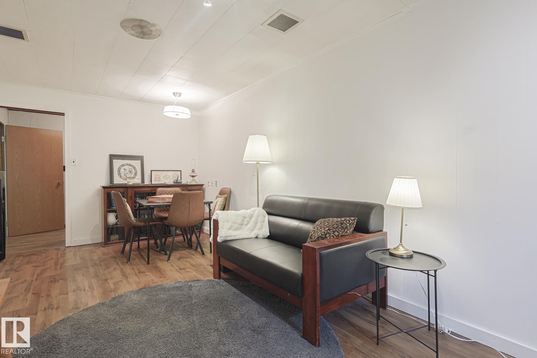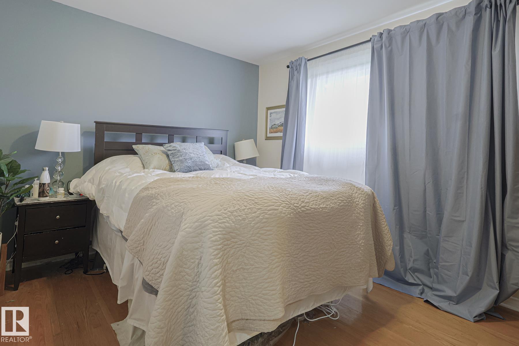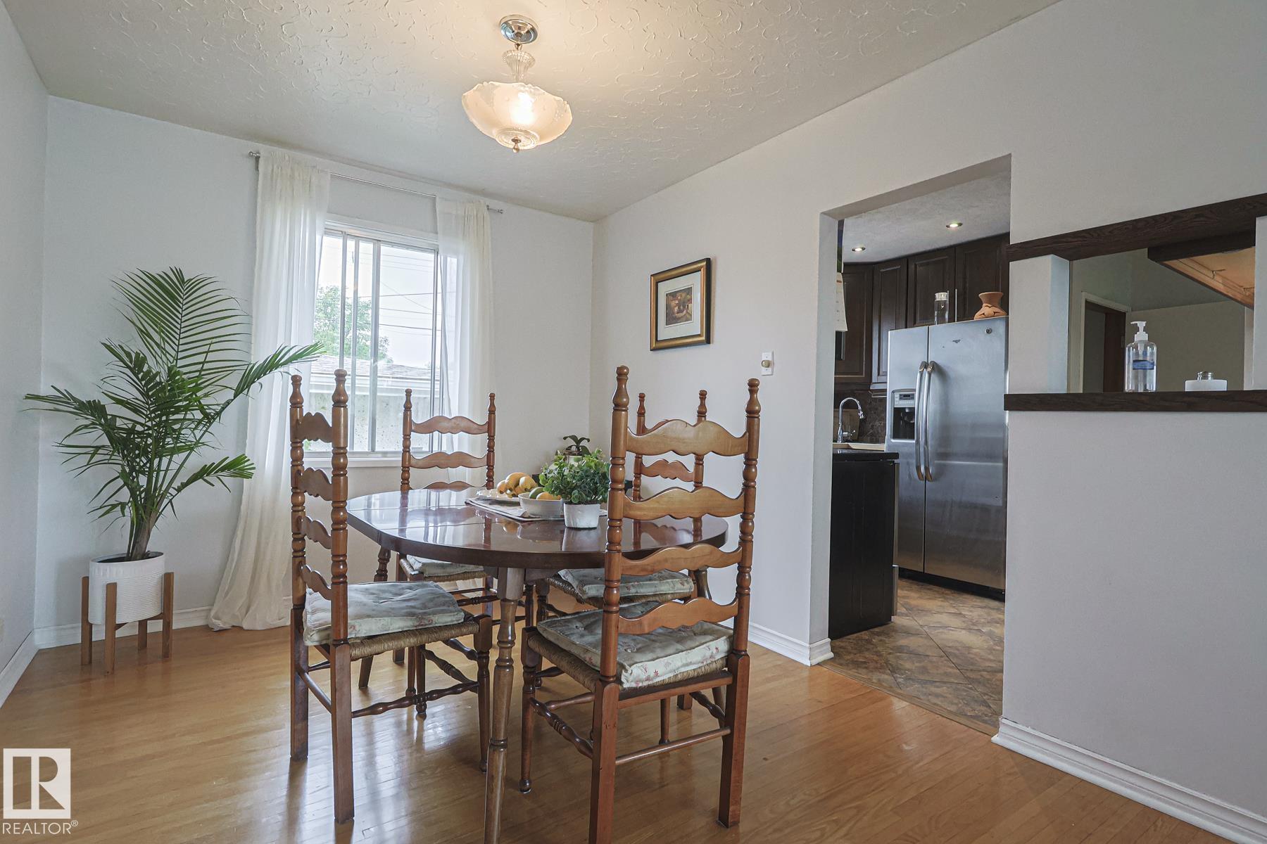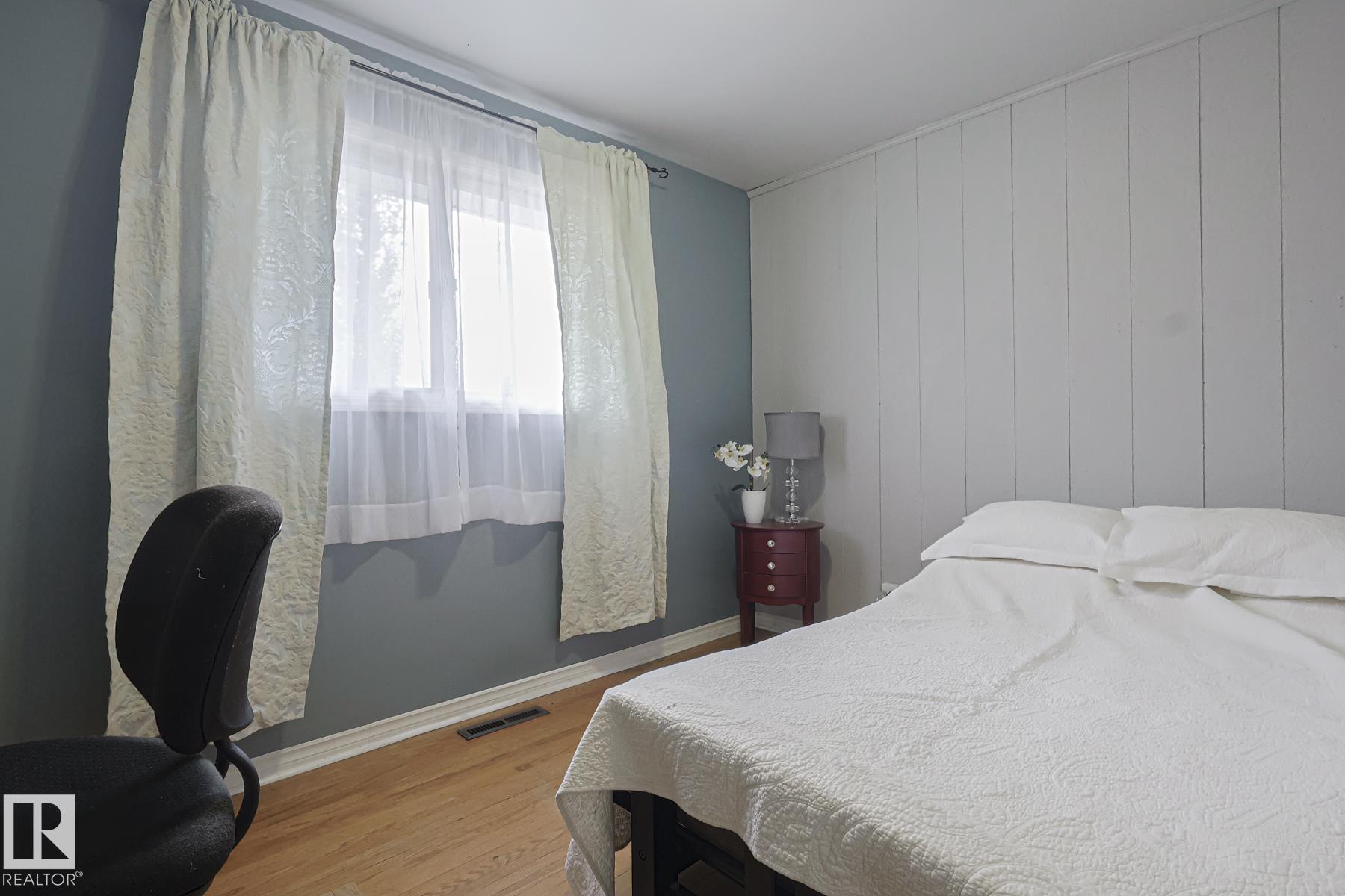 This gem has so much to offer; new SEWER LINE, SHINGLES, EAVES, SOFFITS (house & garage), HWT, CENTRAL AIR CONDITIONING and a FULLY RENOVATED MAIN FLOOR BATHROOM. Inside you will find the ORIGINAL HARDWOOD FLOORING throughout most of the MAIN FLOOR. ORIGINAL STUCCO CEILINGS in the LIVING and DINING ROOMS as well. The KITCHEN has been RENOVATED with SS Appliances. The main floor is complete with a PRIMARY BEDROOM and SECOND BEDROOM. The LOWER LEVEL has a spacious FAMILY/FLEX ROOM. A FULL BATHROOM, THIRD BEDROOM and a KITCHENETTE AREA, plus STORAGE, and LAUNDRY. OUTSIDE you will enjoy a fully LANDSCAPED BACKYARD with perennial garden, fruit trees/bushes and roses. PLENTY of green space for your needs. A LARGE DECK AREA for DINING plus a LOUNGING AREA. There is an ADDITIONAL PARKING SPACE beside DOUBLE GARAGE. Easy access to PUBLIC TRANSIT, SHOPPING, RIVERVALLEY TRAILS, HENDAY, SCHOOLS and HARDISTY REC CENTRE.