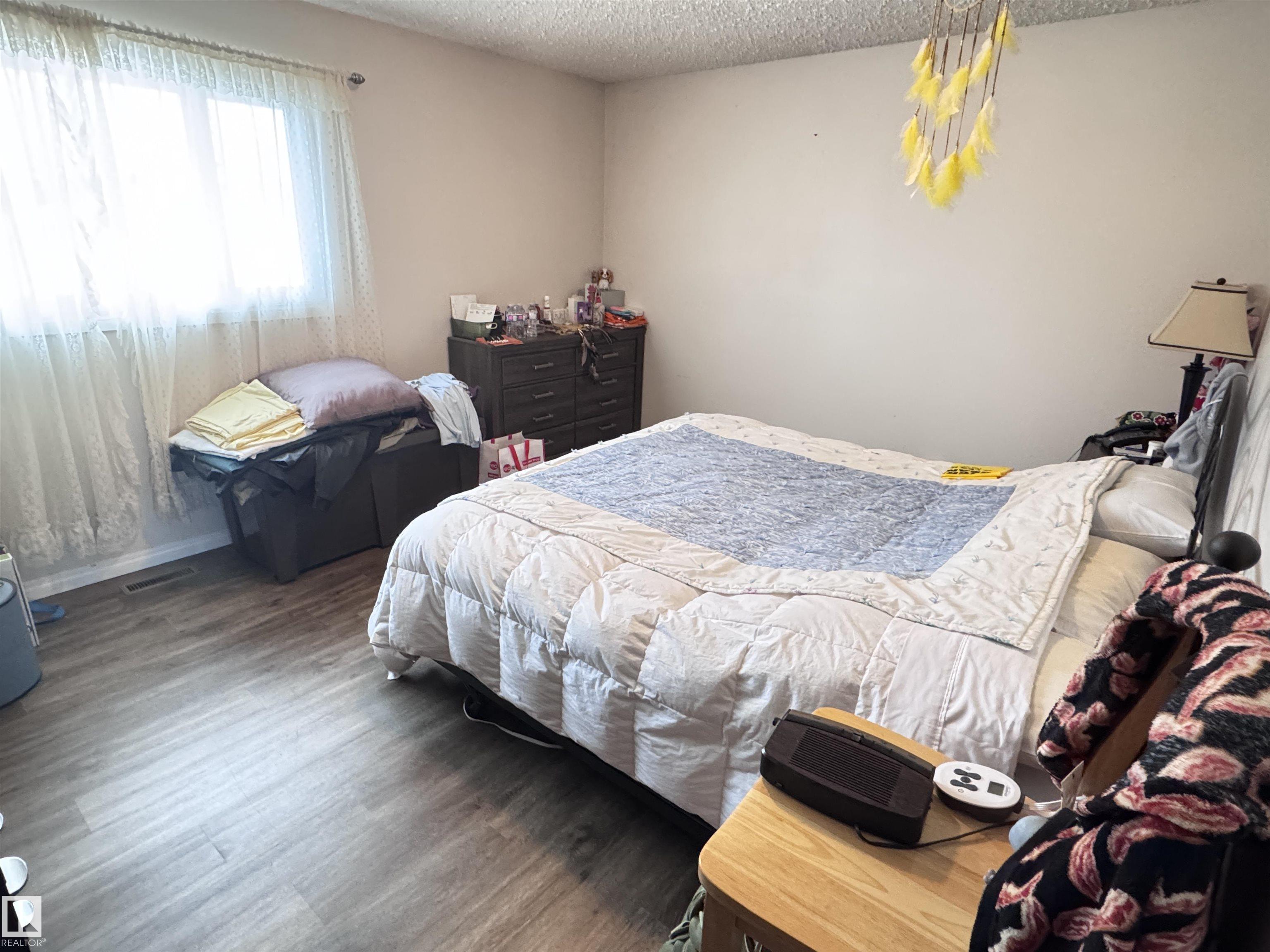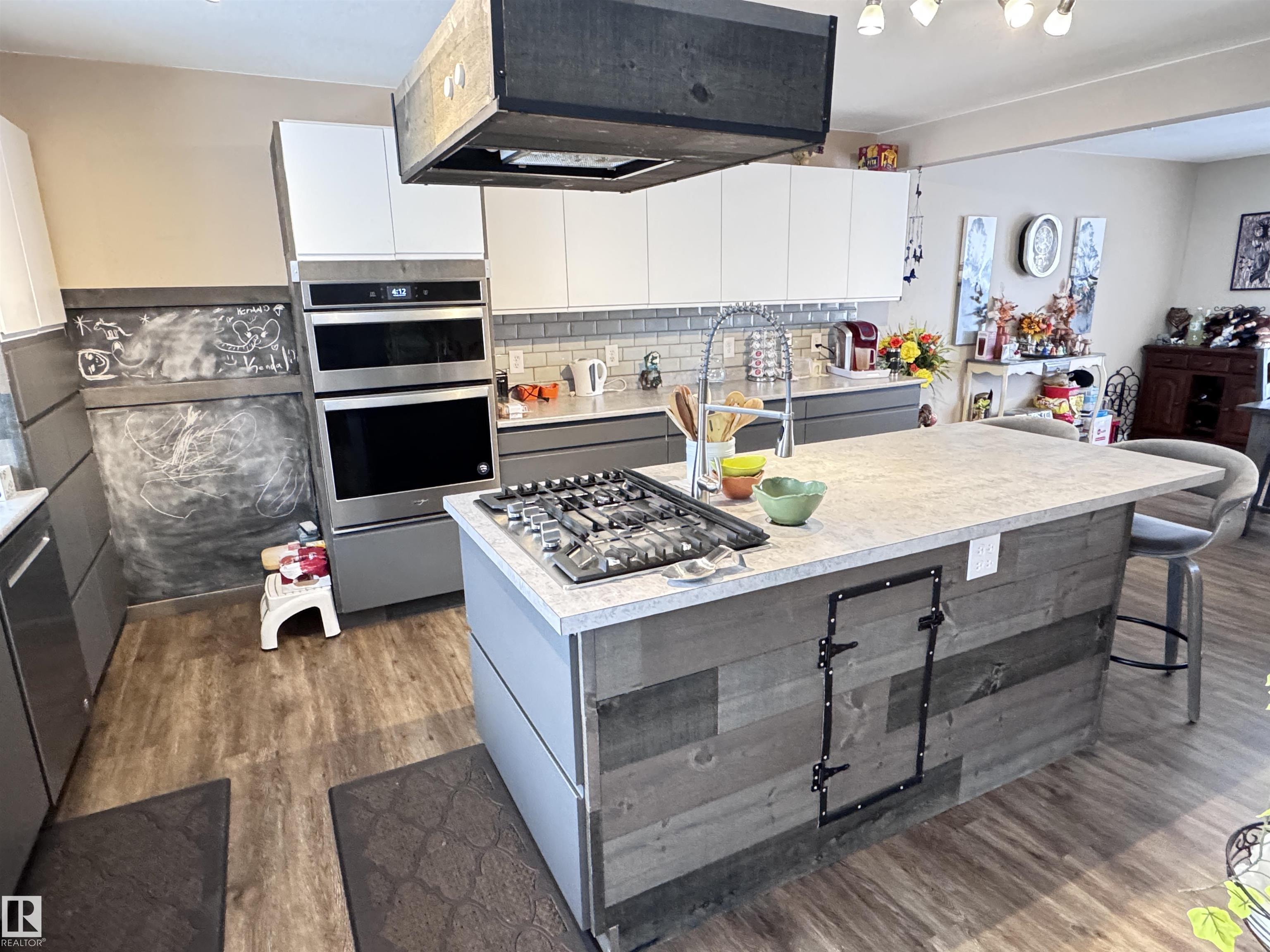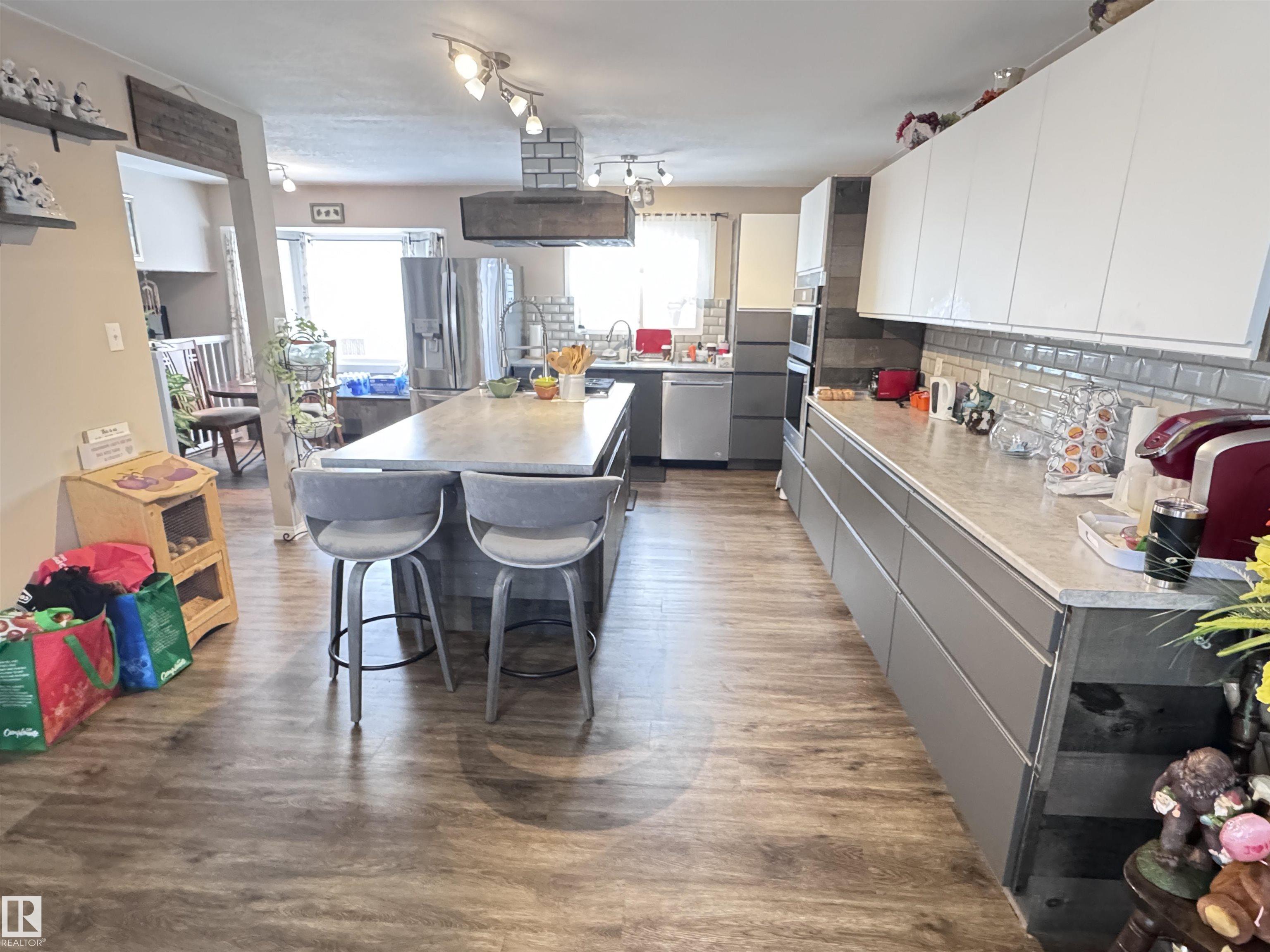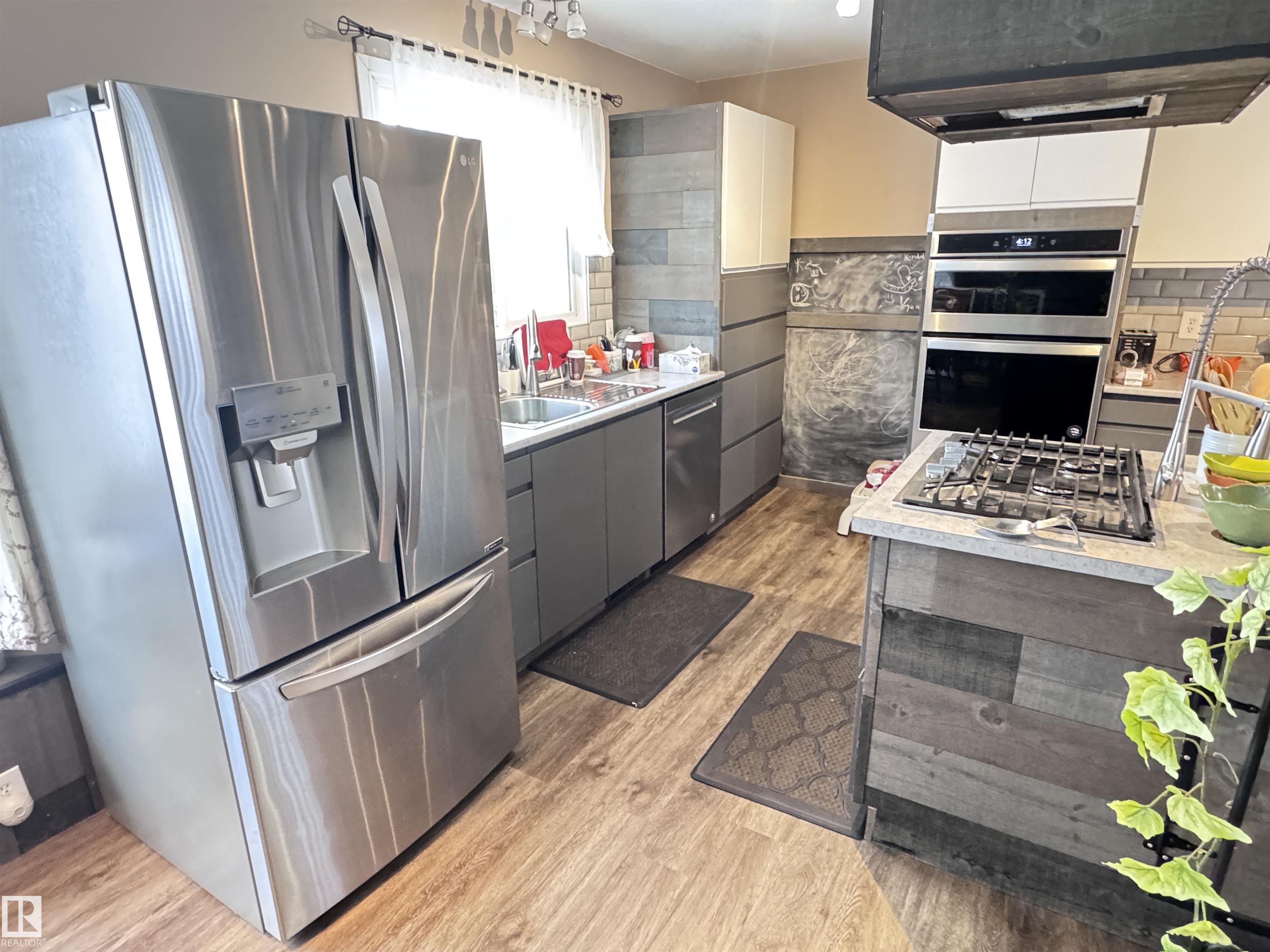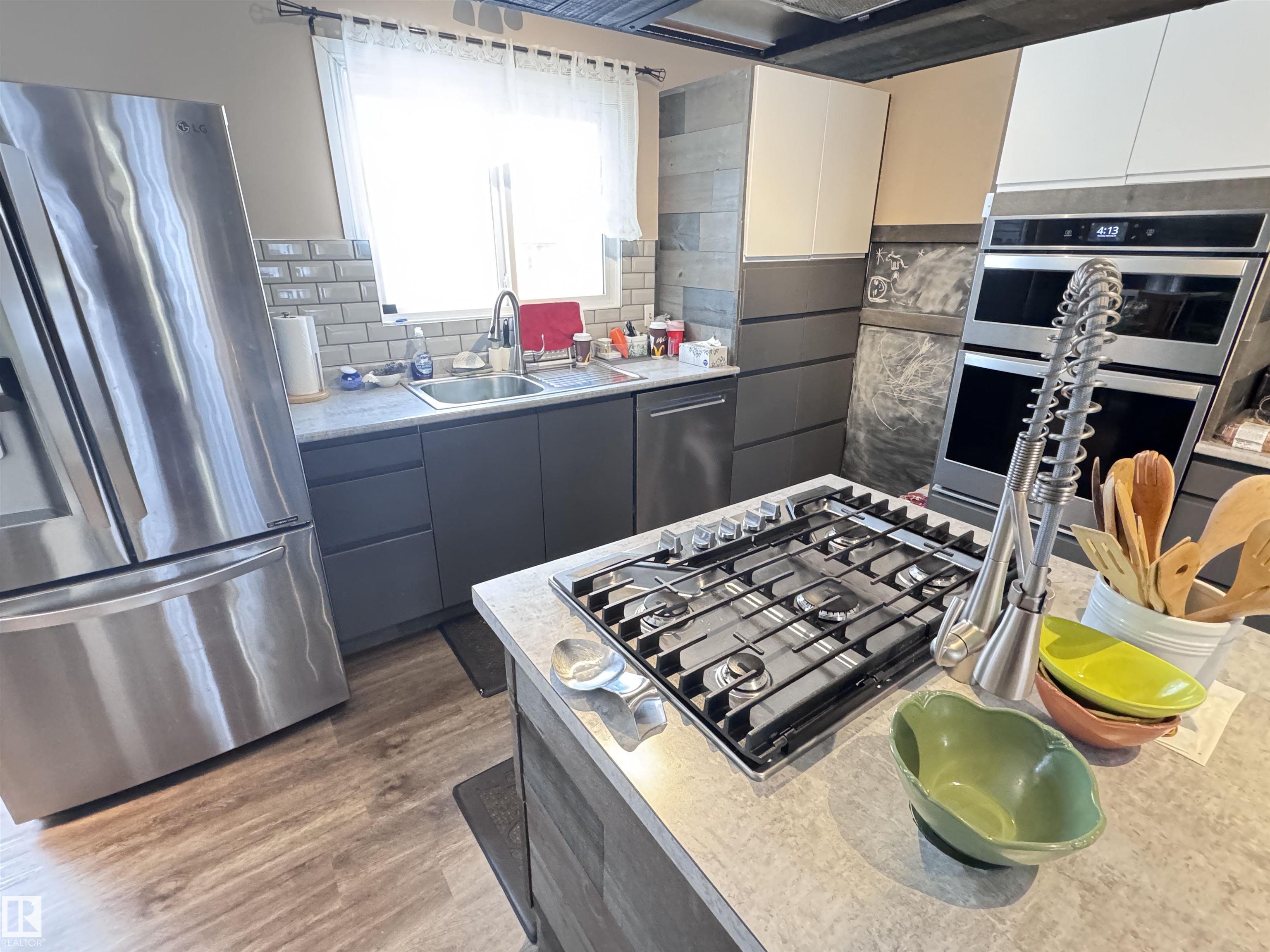 Attractive split-level home featuring a stunning modern kitchen with gas cooktop, convenient pot filler, wall oven with matching microwave, and full stainless steel appliance package. Designed for entertaining, the kitchen offers a massive island with breakfast bar, soft-close cabinetry, subway tile backsplash, and a spacious dining area. The upper level hosts three bedrooms and a recently renovated 3-piece bathroom. The lower level includes a fourth bedroom, 3-piece bathroom, and durable commercial-grade carpeting, with newer laminate flooring throughout the rest of the home. Low maintenance exterior features mostly stucco with aluminum, vertical siding and brick accents. Situated on a corner lot with chain-link fencing and privacy slats. Numerous upgrades include newer shingles on both house and garage, a high-efficiency furnace with central air conditioning, and a newer hot water tank.
