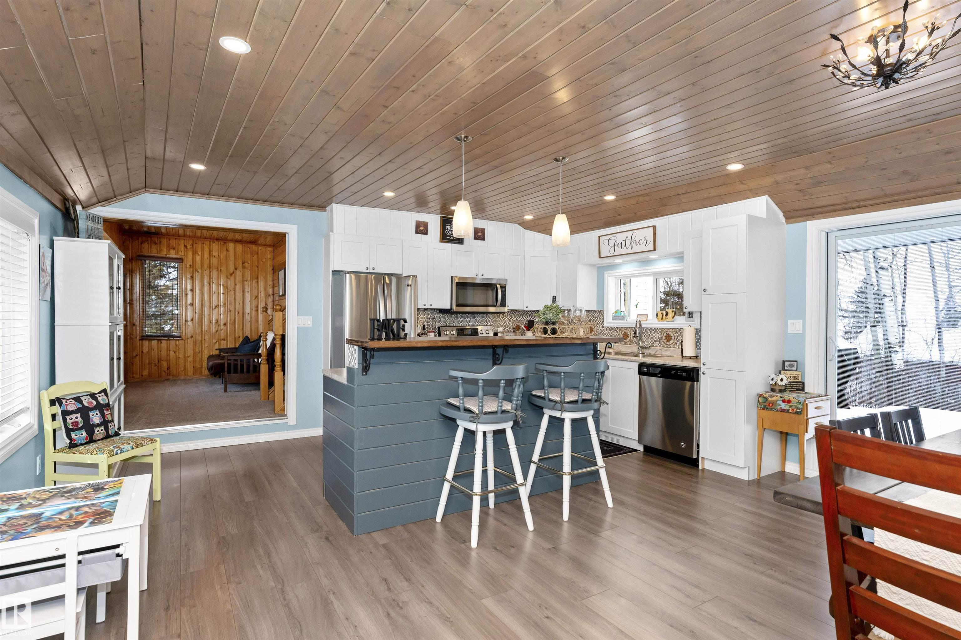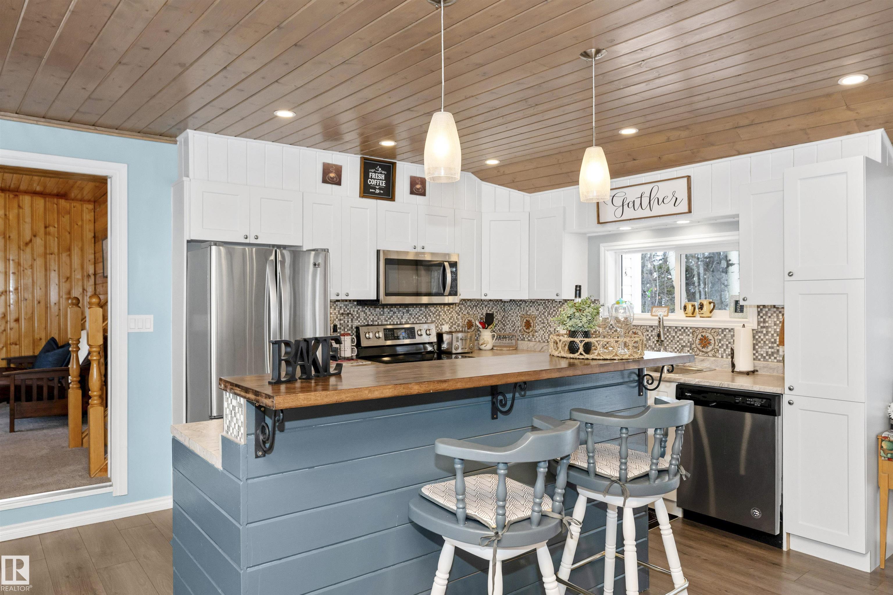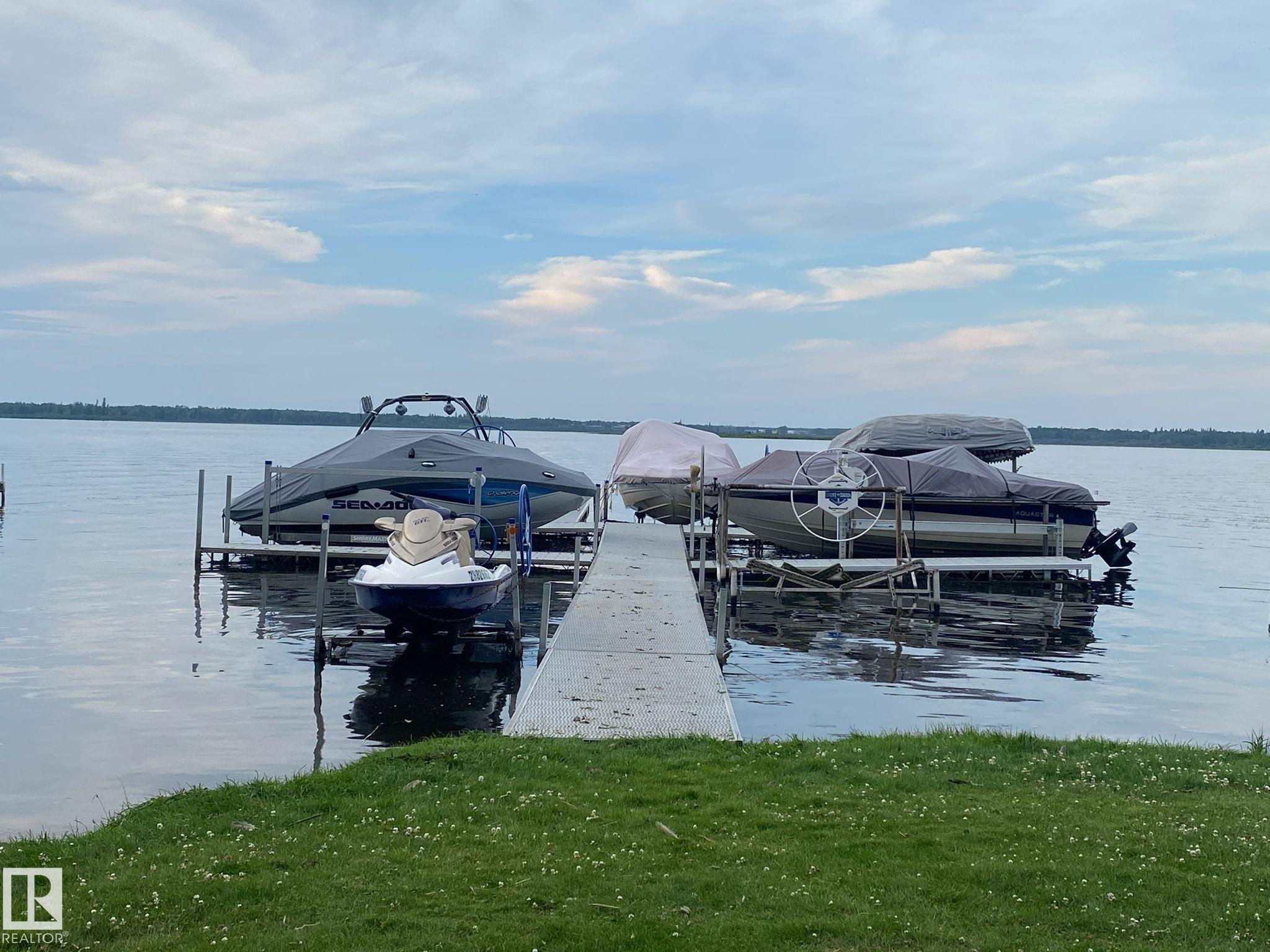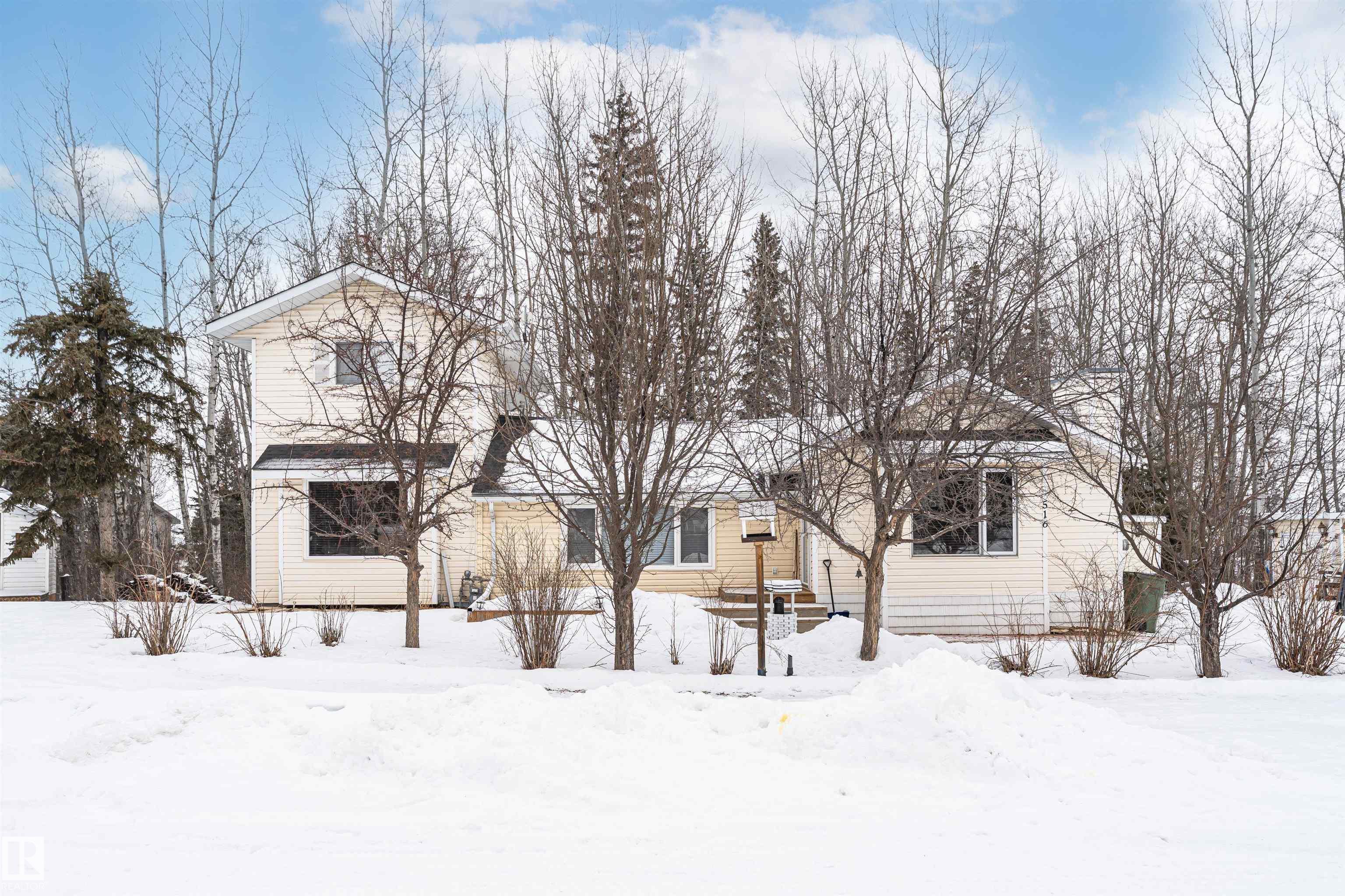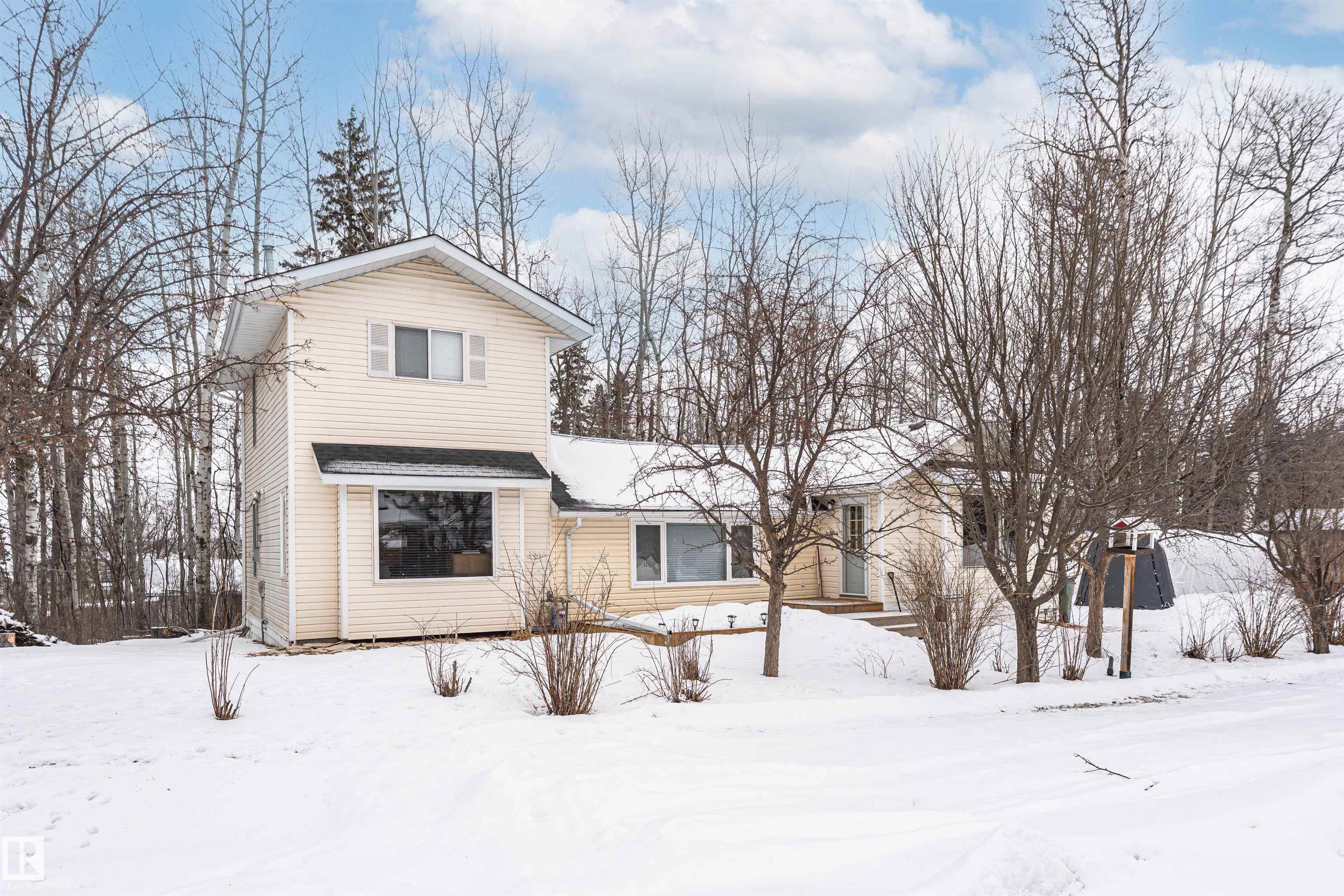 Find your year round home or relaxing get-away in your fully furnished lakeside abode. Warm inviting wood and plenty of sunshine through the numerous windows welcomes as you enter. The Living room is anchored by a stone gas fireplace that blends in with the woodsy feel. The kitchen has been redone with lots of counter space, white cupboards, S/S appliances & generous breakfast bar. Large dining area with plenty of room to entertain. One bedroom on the main level with sliding doors to the large deck. The primary bedroom has its own level with a large ensuite complete with deep tub. There is a separate den area with futon for further guests who come to visit. The home is fully emcompassed by greenery on all four sides. Tons of exterior storage & parking. This home is approx 100 meters to the lake with a dock, and boat launch! The property includes furniture, boat lift & docks. Located in the quiet community of West Cove, just 8 minutes to Darwell or 15 mins to Alberta Beach.