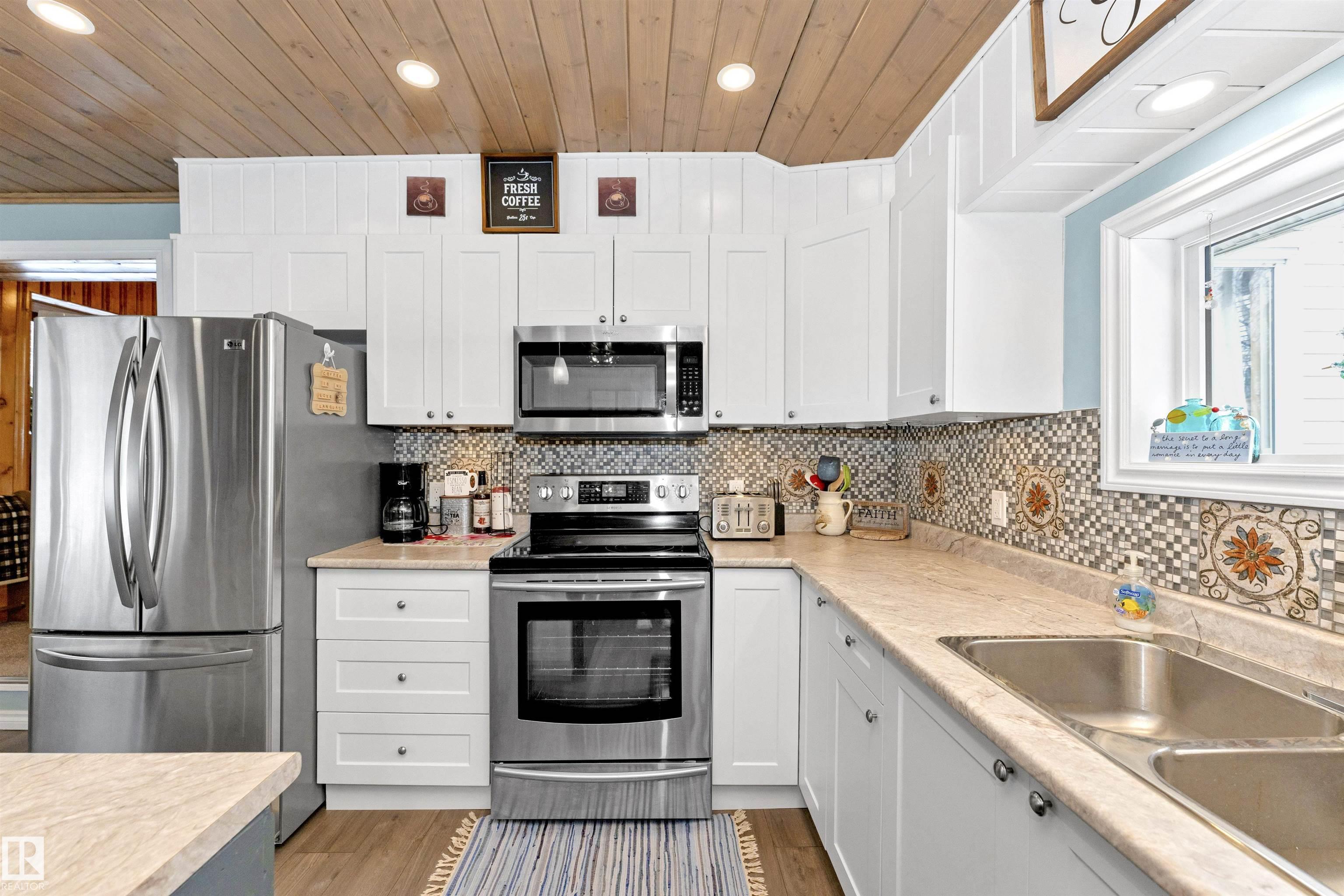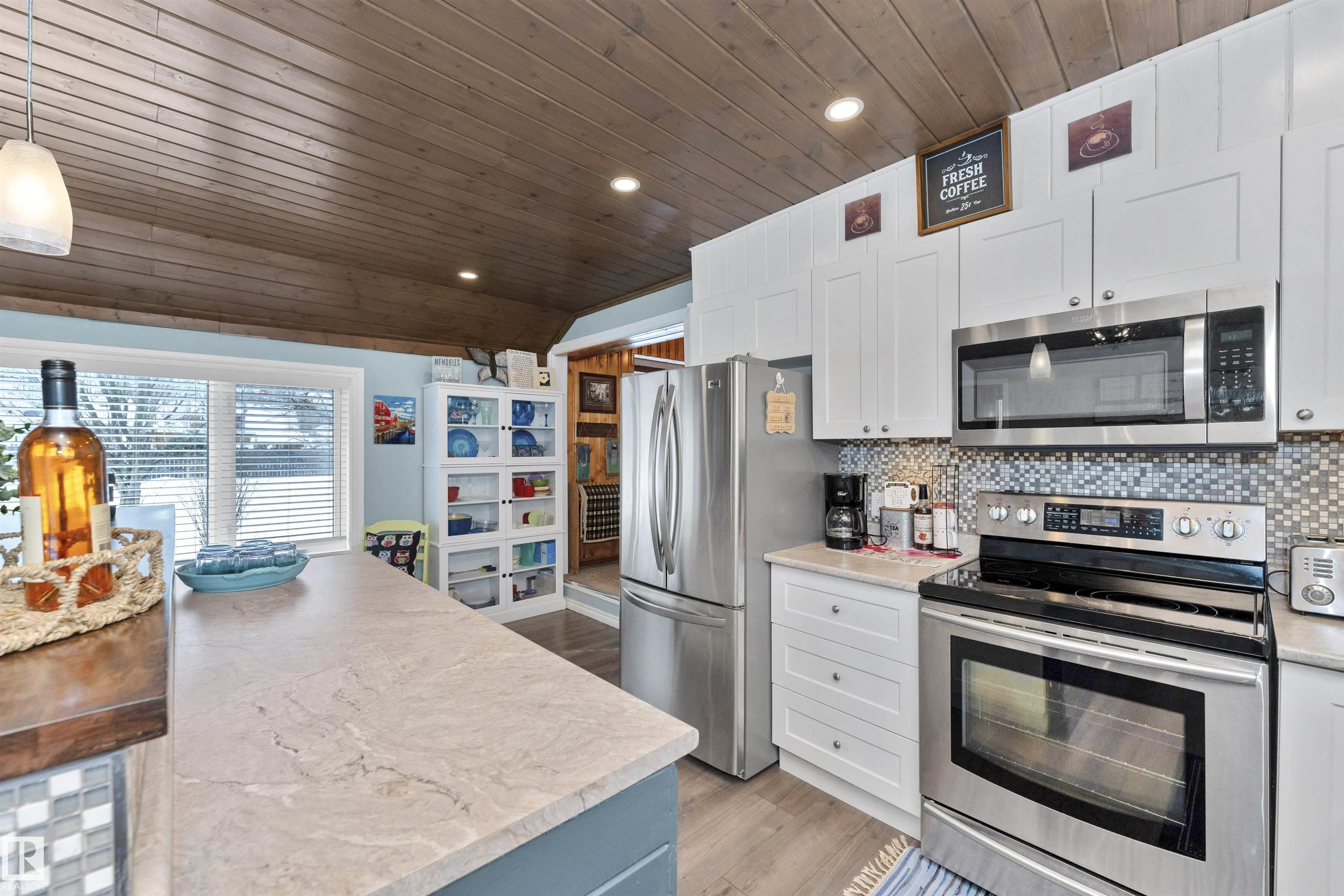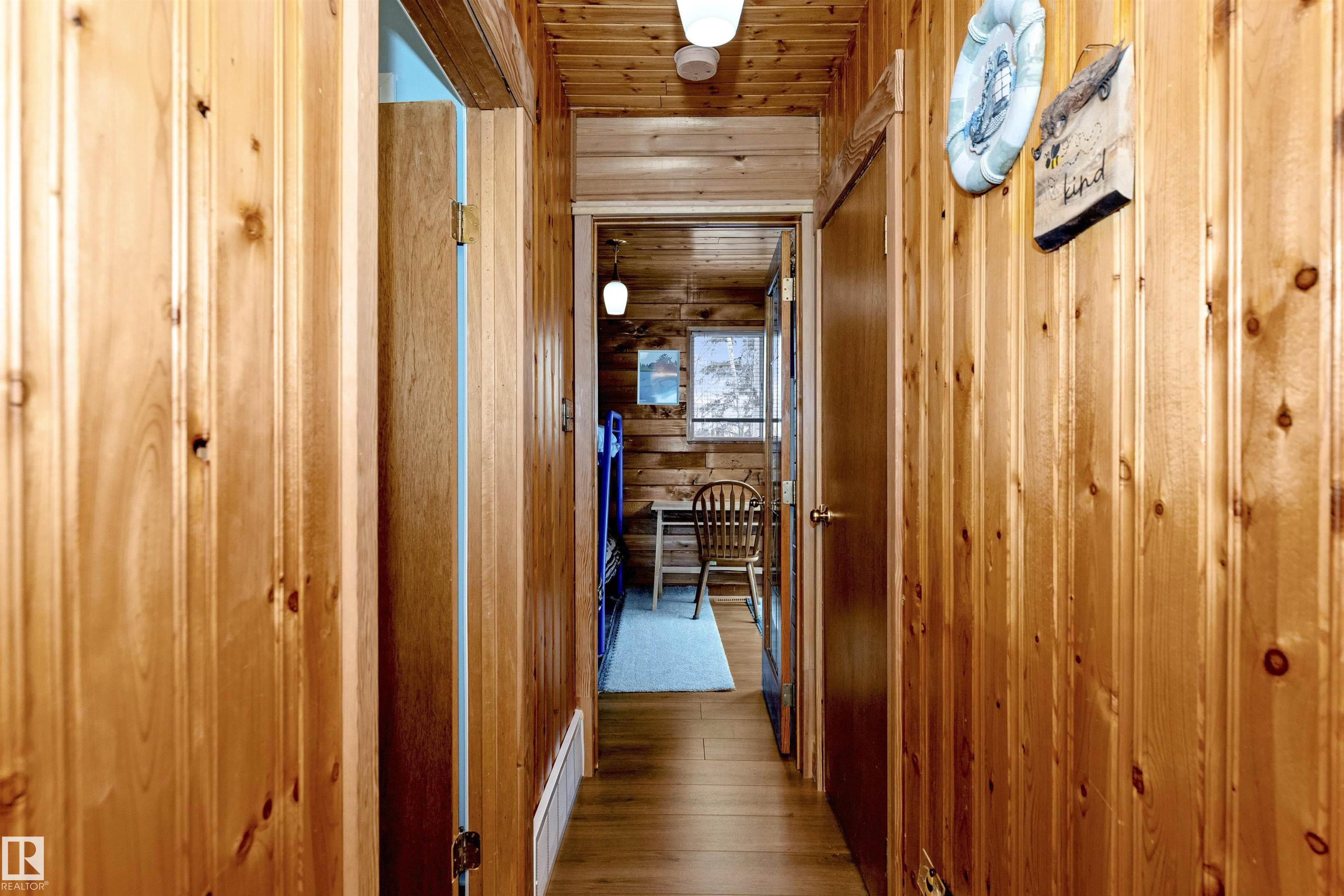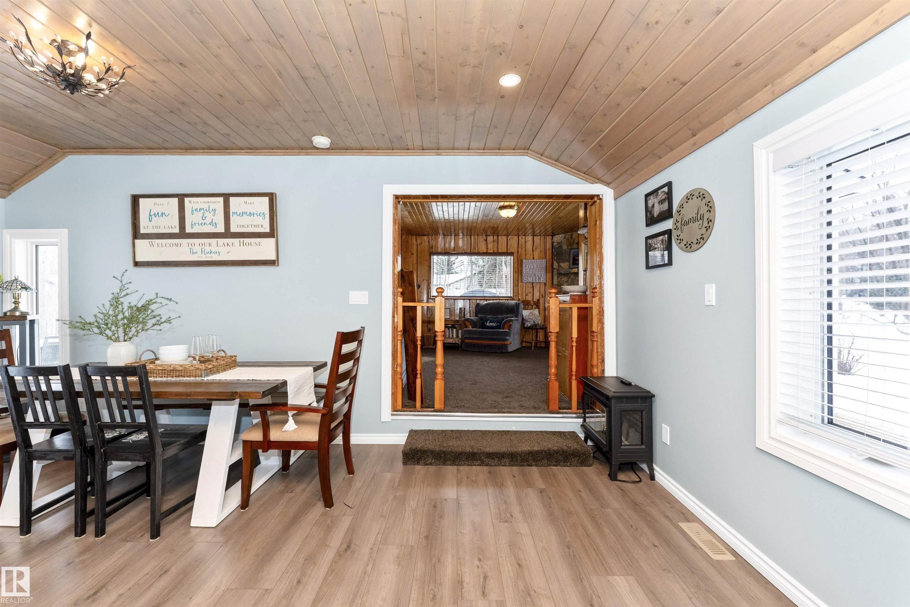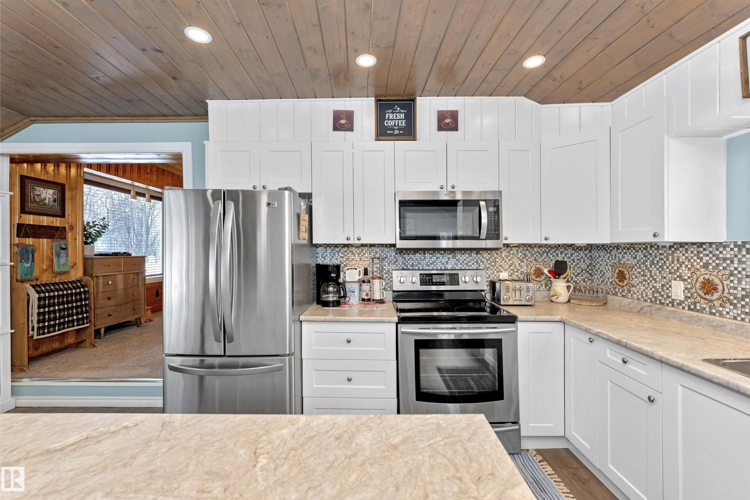 Find your year round home or relaxing get-away in your fully furnished lakeside abode. Warm inviting wood and plenty of sunshine through the numerous windows welcomes as you enter. The Living room is anchored by a stone gas fireplace that blends in with the woodsy feel. The kitchen has been redone with lots of counter space, white cupboards, S/S appliances & generous breakfast bar. Large dining area with plenty of room to entertain. One bedroom on the main level with sliding doors to the large deck. The primary bedroom has its own level with a large ensuite complete with deep tub. There is a separate den area with futon for further guests who come to visit. The home is fully emcompassed by greenery on all four sides. Tons of exterior storage & parking. This home is approx 100 meters to the lake with a dock, and boat launch! The property includes furniture, boat lift & docks. Located in the quiet community of West Cove, just 8 minutes to Darwell or 15 mins to Alberta Beach.