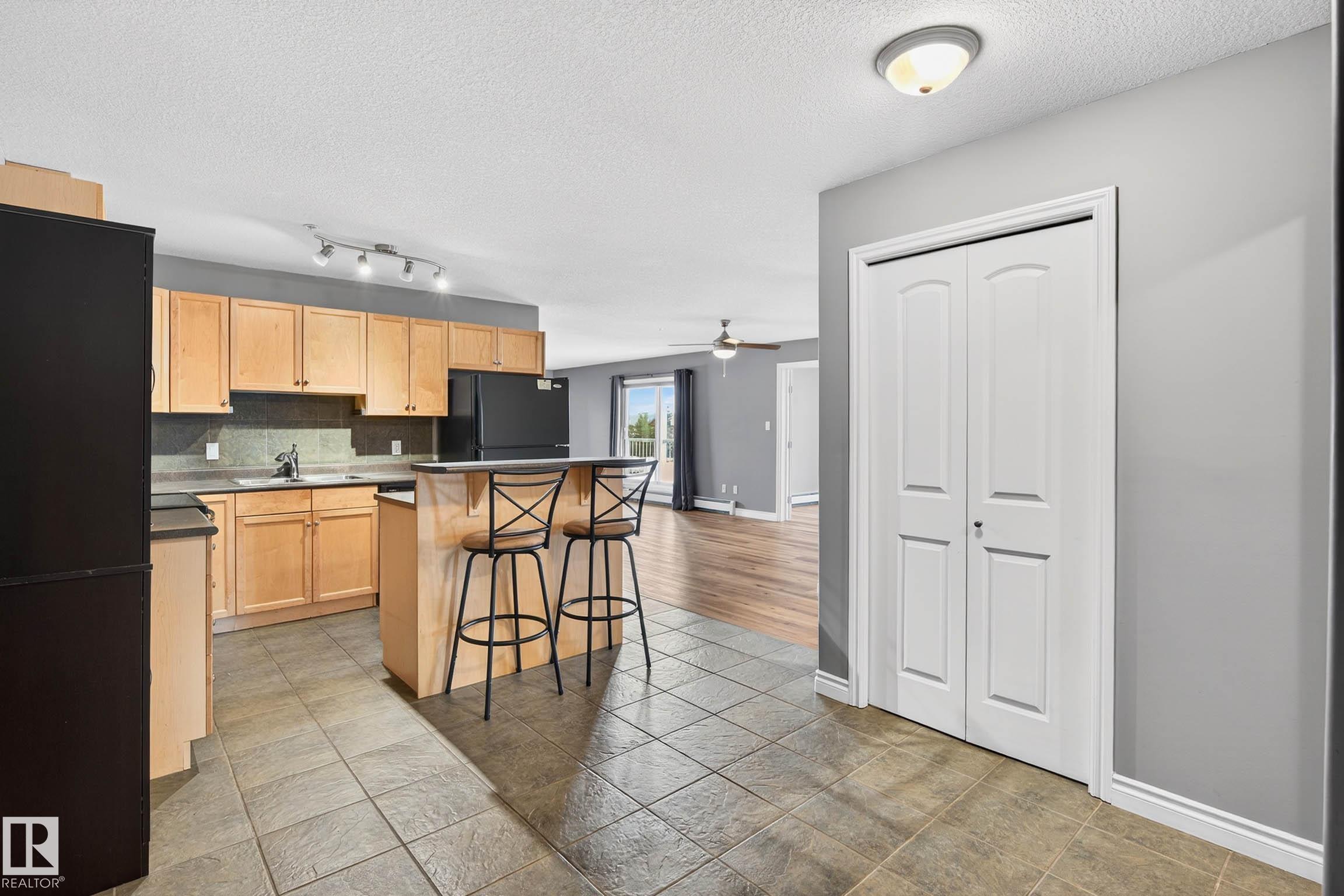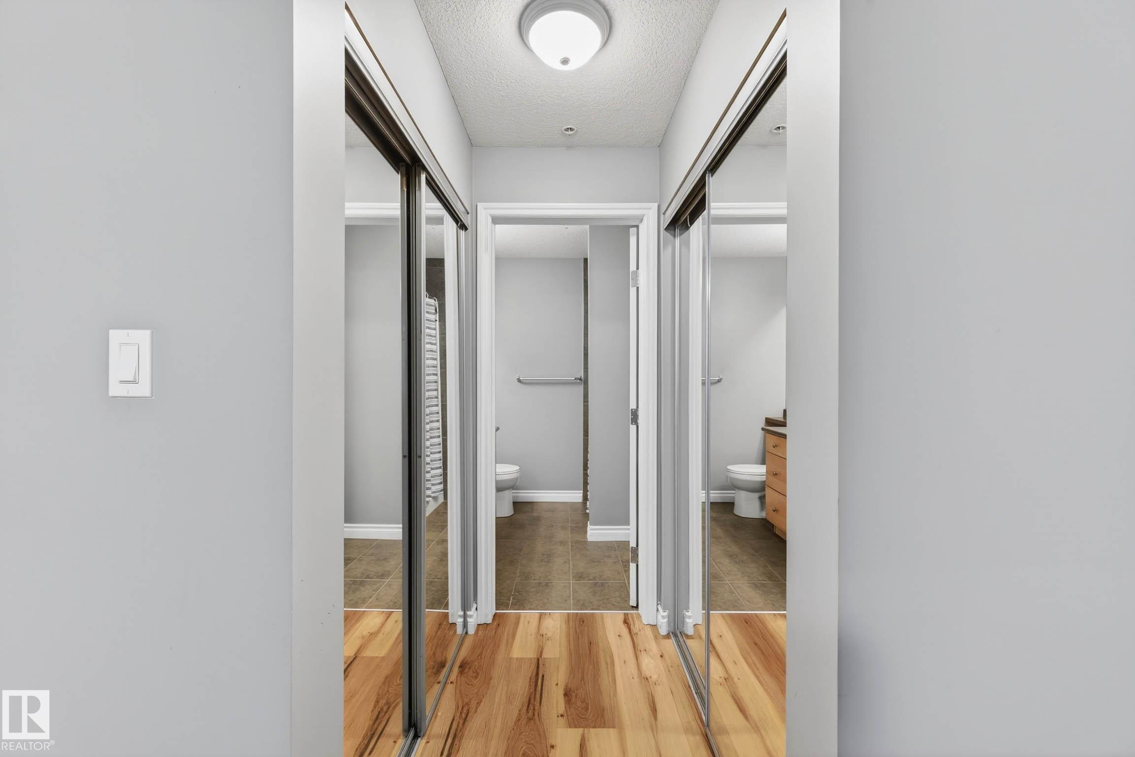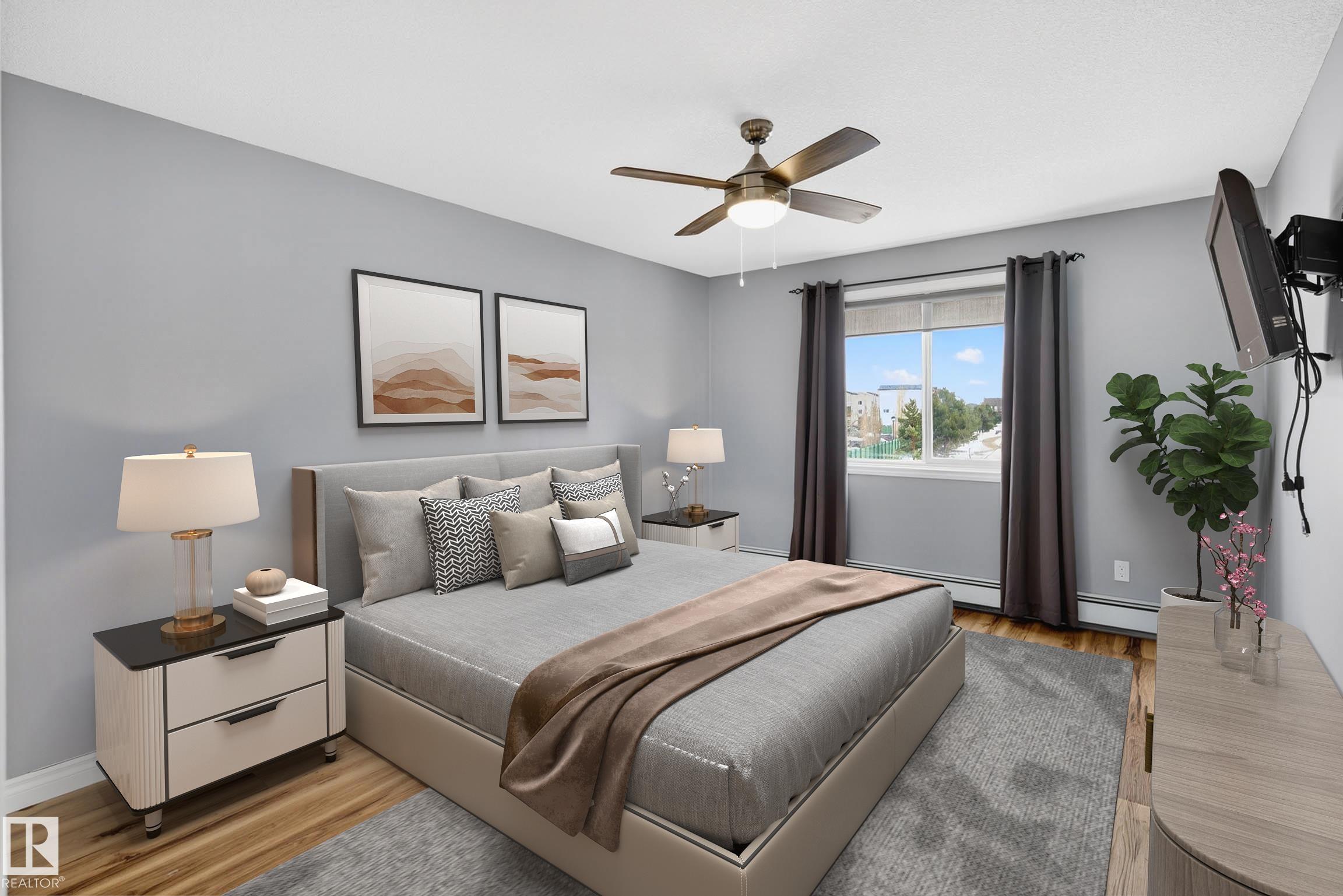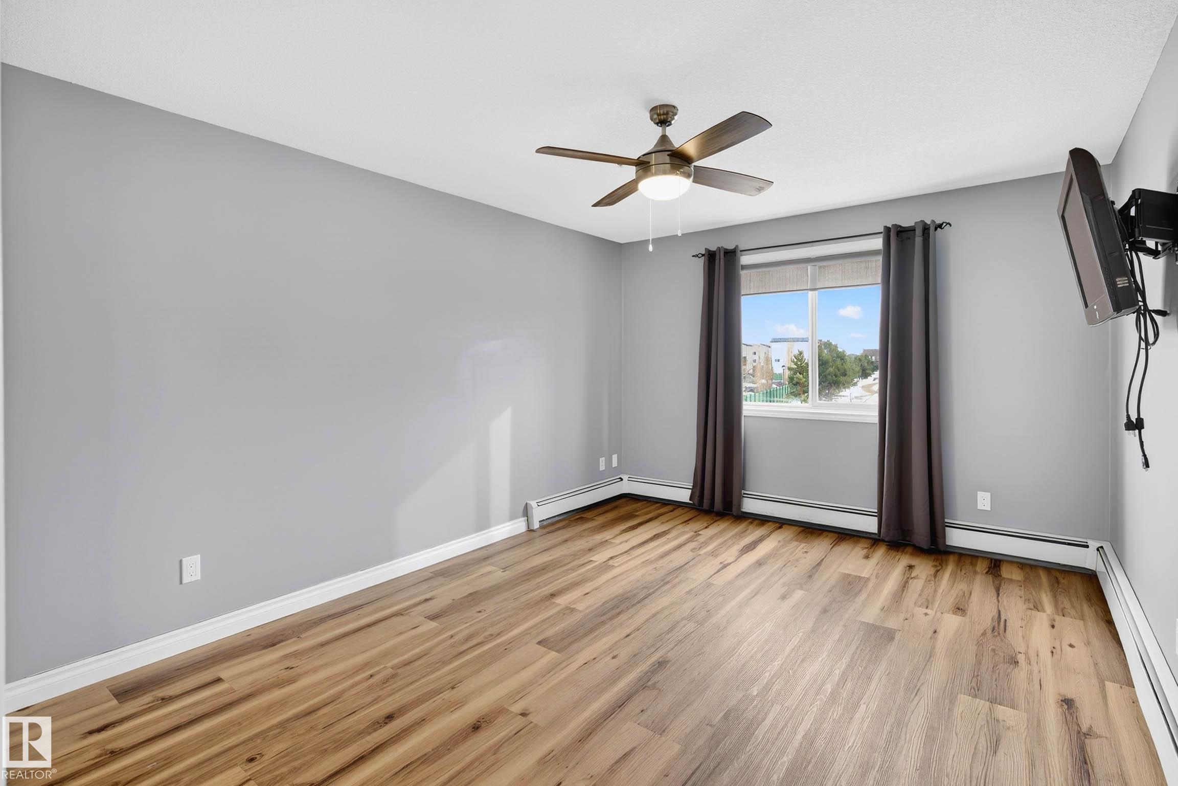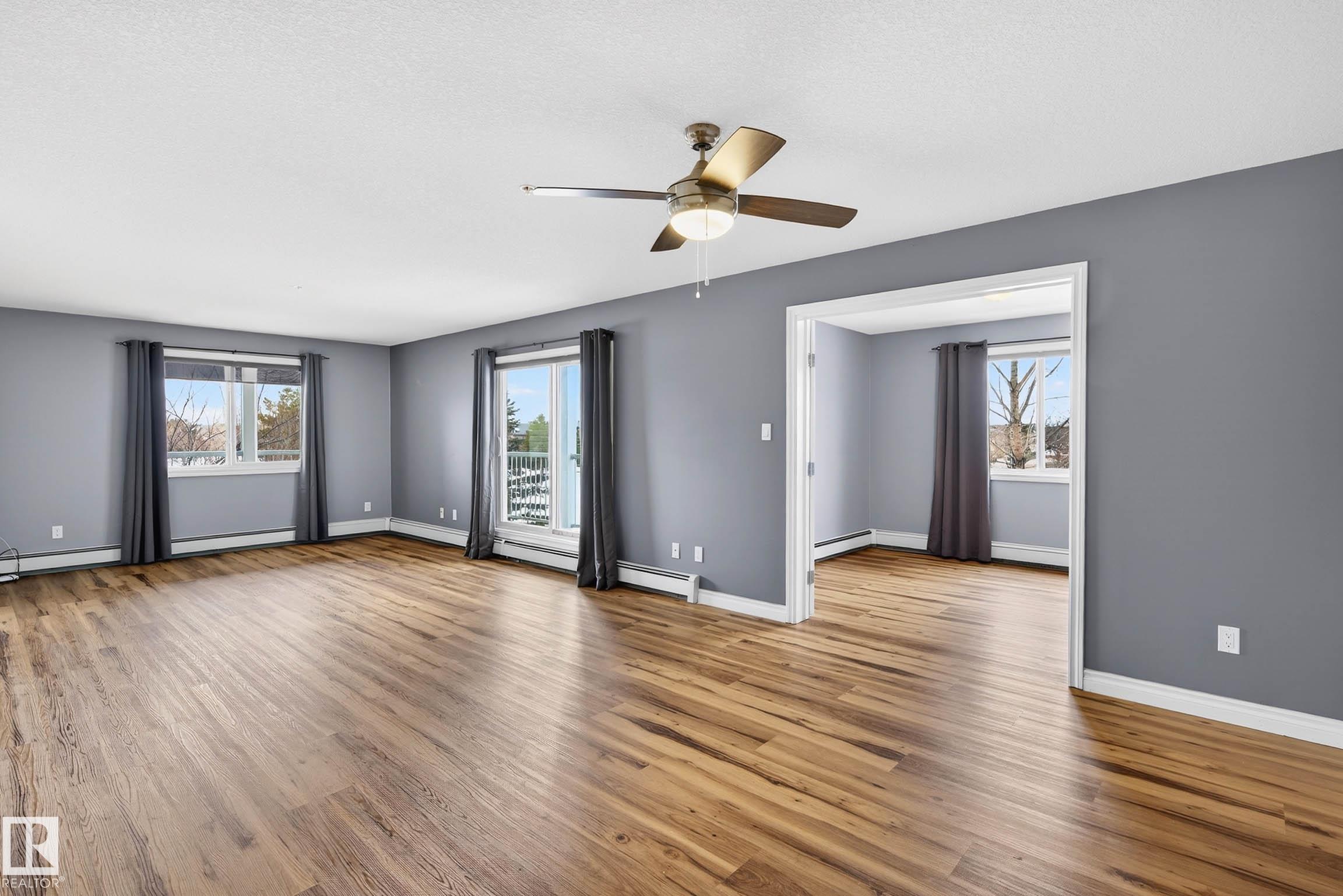 Spacious, bright & beautifully updated! This impressive 1232 sq ft condo offers 2 bedrooms, 2 bathrooms PLUS a den, providing a well designed layout & exceptional value. The den is perfect as an office, dining area or playroom. Enjoy the open concept living area filled with natural light & a sunny wrap around balcony, ideal for relaxing!. The kitchen features a moveable island, ample cabinetry & black appliances. Bedrooms are ideally positioned opposite from each other for maximum privacy. The large primary bedroom features a double closets & a 3pc ensuite. Updates: vinyl plank flooring (23), dishwasher (25), toilets (24), modern décor switches & tamper proof plugs. In suite laundry with HE front loading washer & storage add convenience. Includes underground heated parking, gym access & condo fees that cover heat & water. Walking distance to Freson Bros, restaurants & more. Includes: barstools, pantry, shelving & TV! A rare, generously sized unit you do not want to miss! Some photos virtually staged.