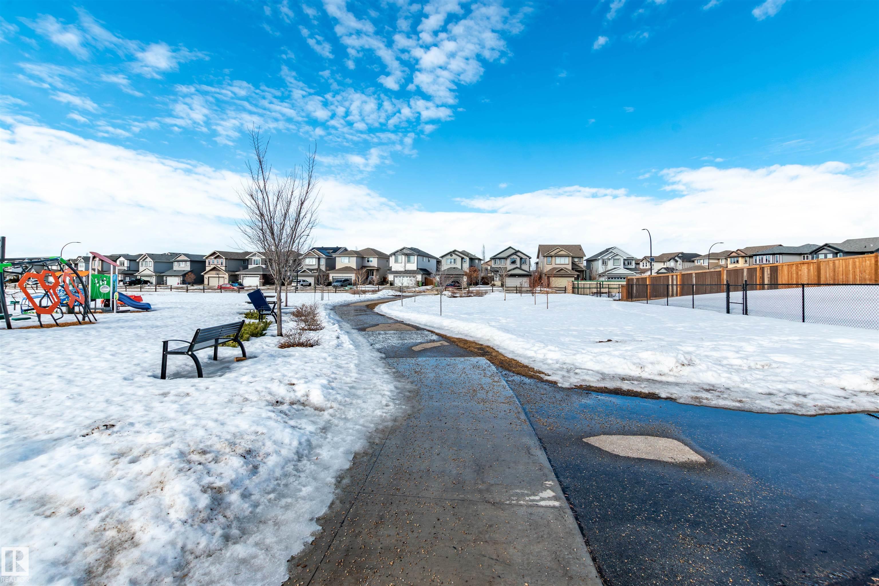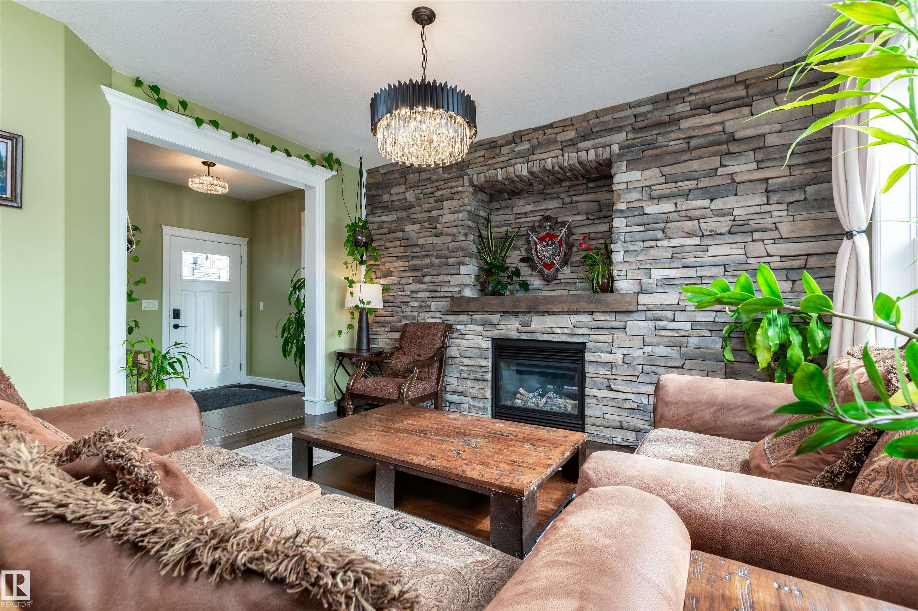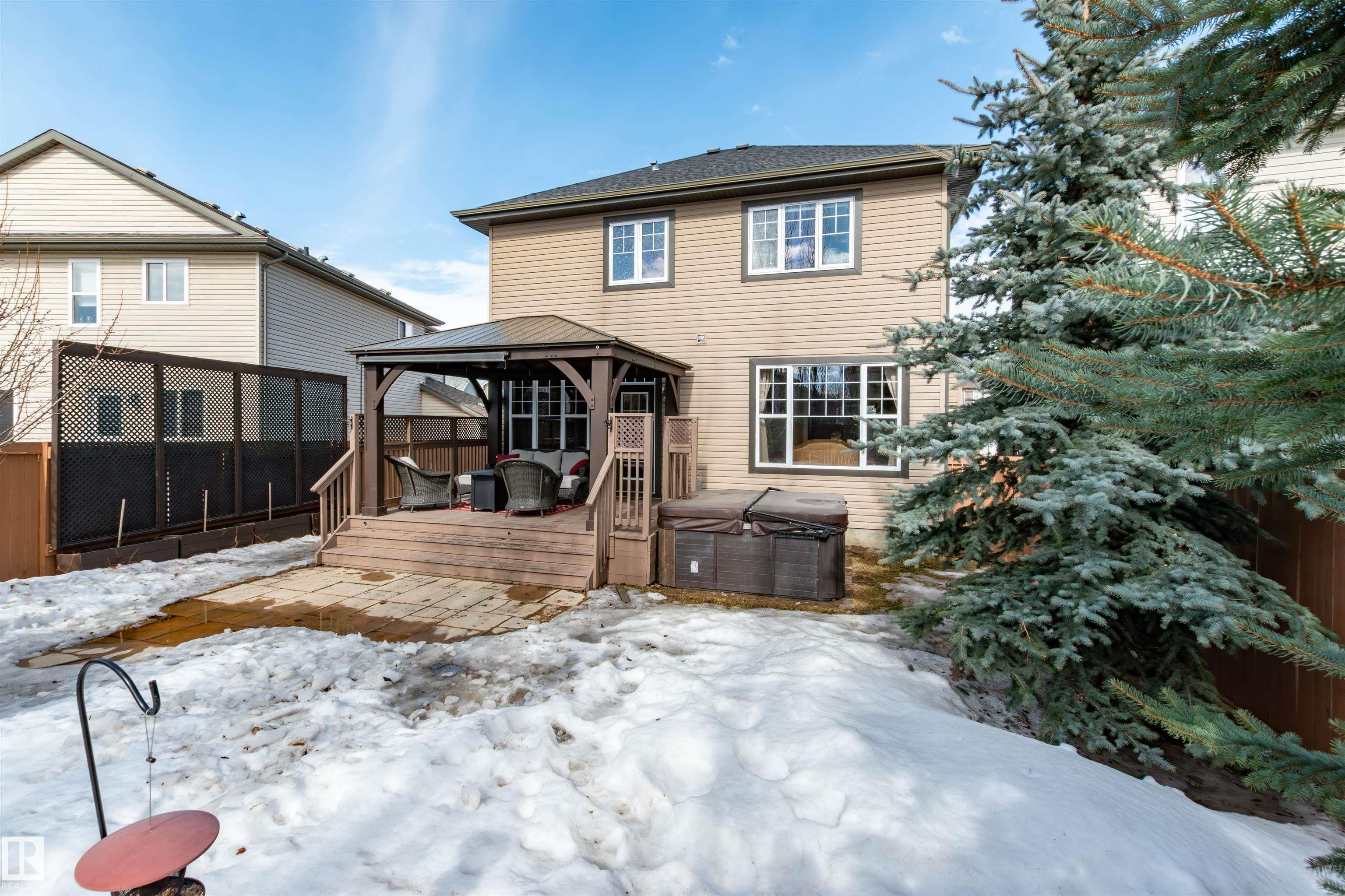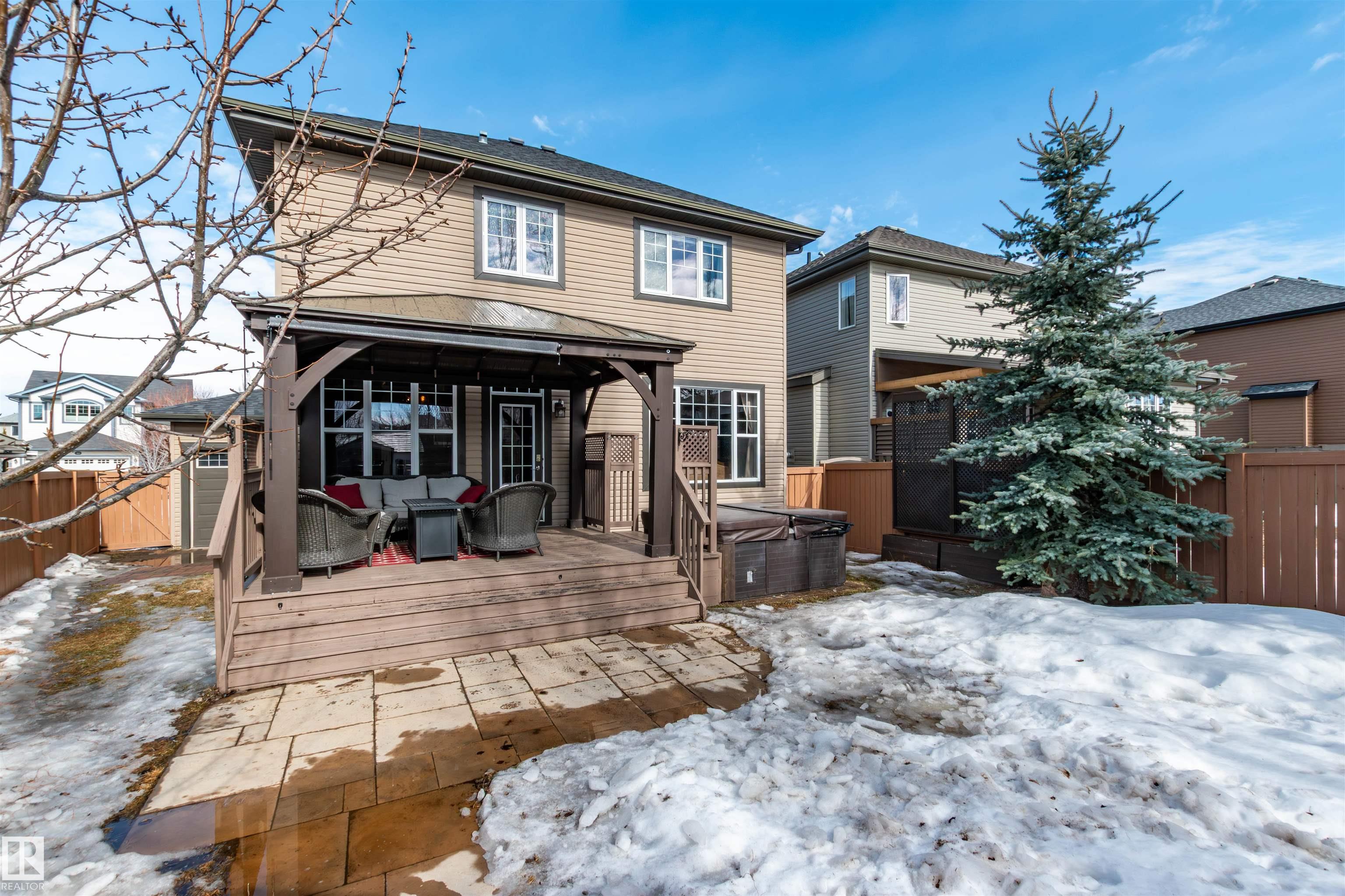 Did you say Oversized Triple Garage?? This immaculately appointed 4 bed, 3 1/2 bath 2 storey beauty, in the family friendly Fort Sask. comm. of Westpark, checks all the boxes. Once you get past the impressive and uber functional triple garage (heated and w/ 2 fl. drains and h/c water bibs), you are presented with a luxurious open concept main floor living, kitch. and eating space. The FULL WALL, floor to ceiling stone fireplace offers a unique living and entertainment area normally reserved for exclusive estate properties. So much natural light!! A well appointed kitchen with gas range, ceiling high cabinets, bar seating, and granite counters, looks directly out to an amazing outdoor gazebo covered deck w/ step in tub. The large primary bed. w/ luxury 4 pce ensuite (sep. tub and shower) sets the romantic mood. Spacious bonus room area for family entertainment. Fully finished basement w/ wet bar, and an additional bedr., full bath, and family room. Close to parks and walking trails!! Raise a family here!!