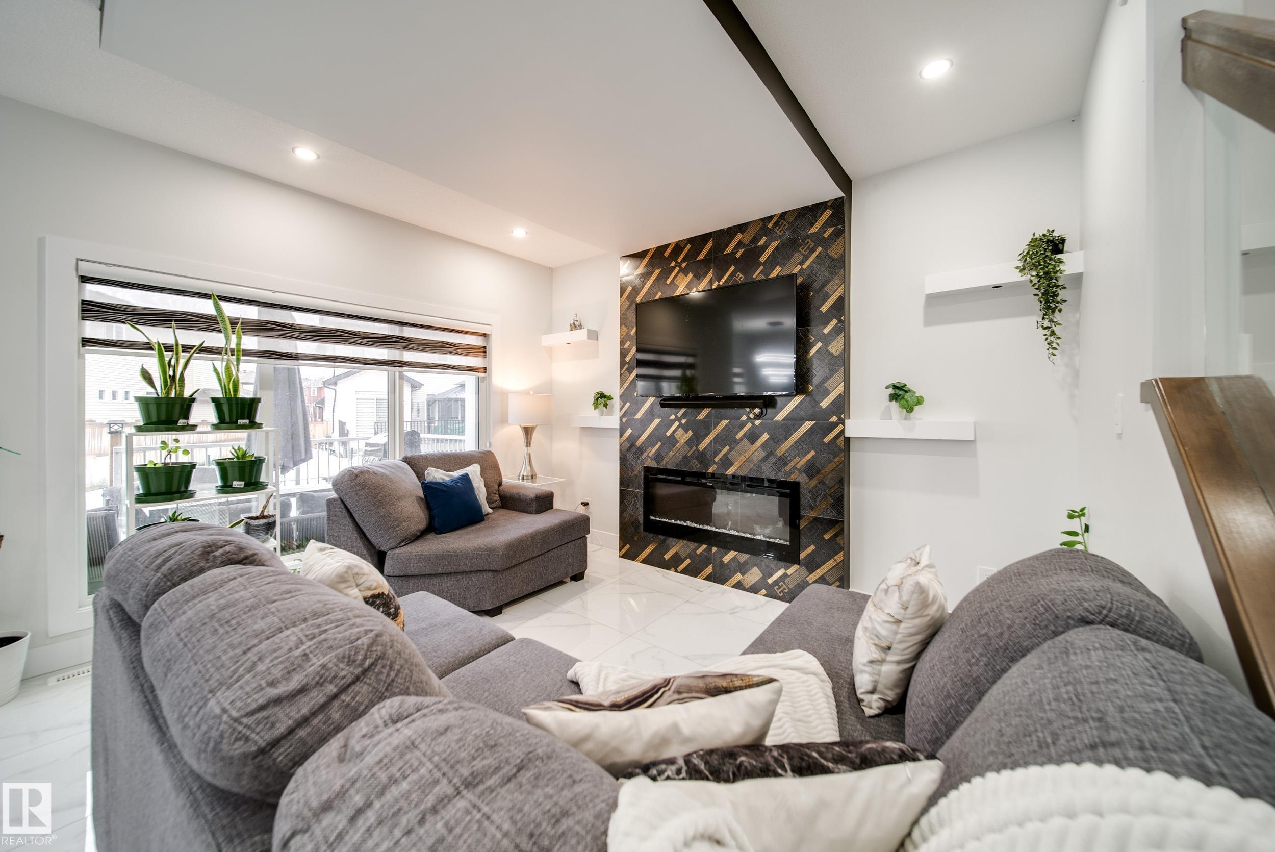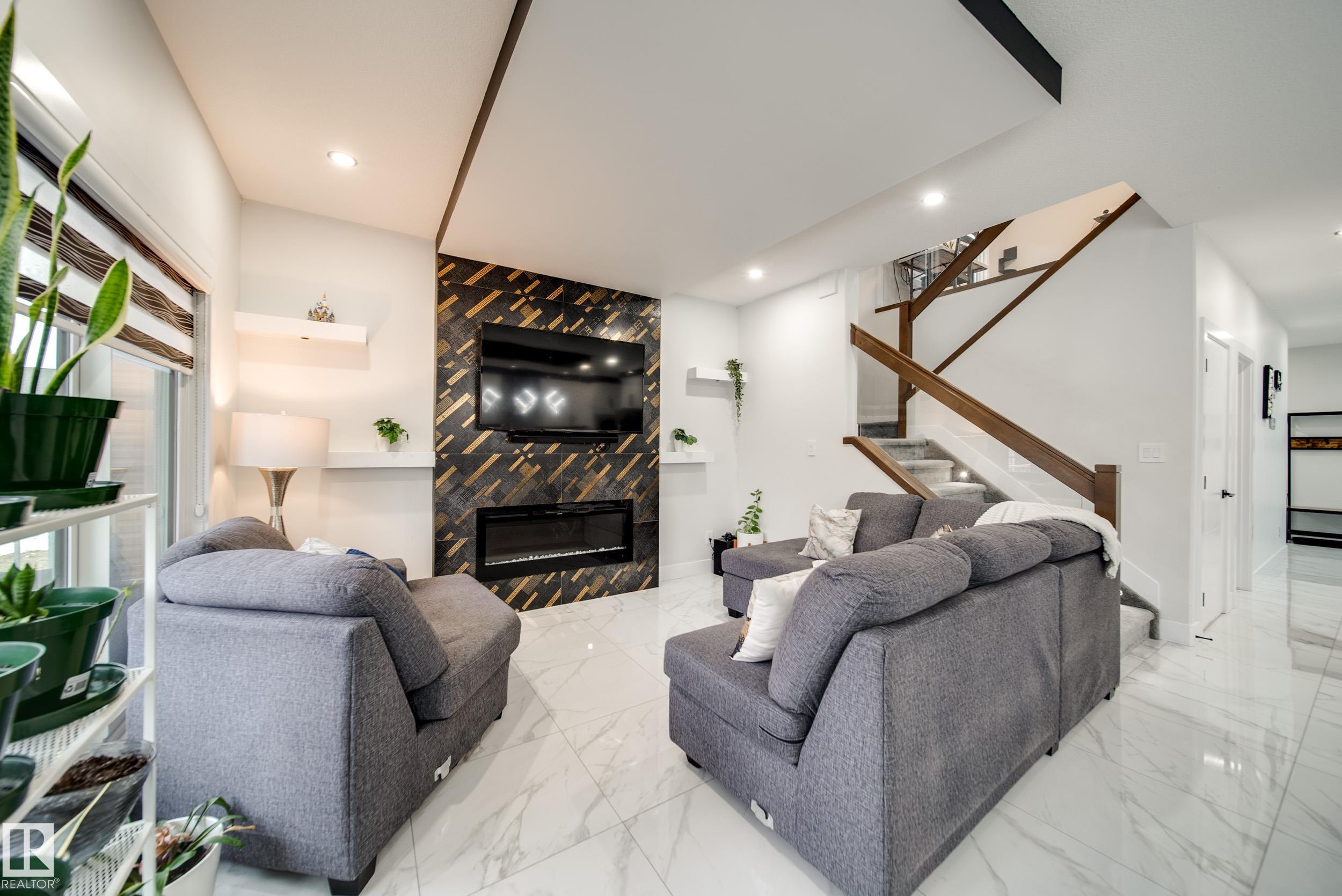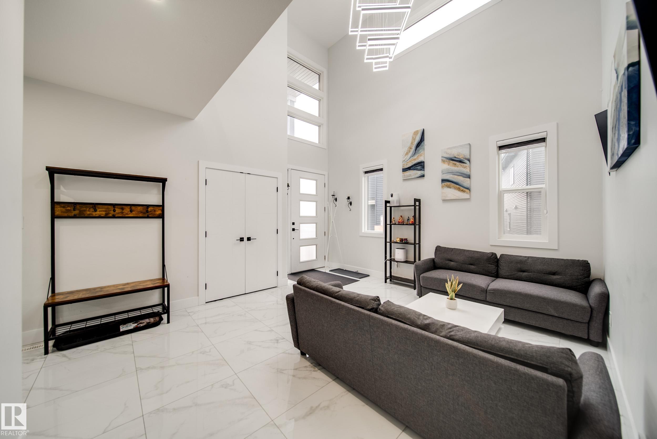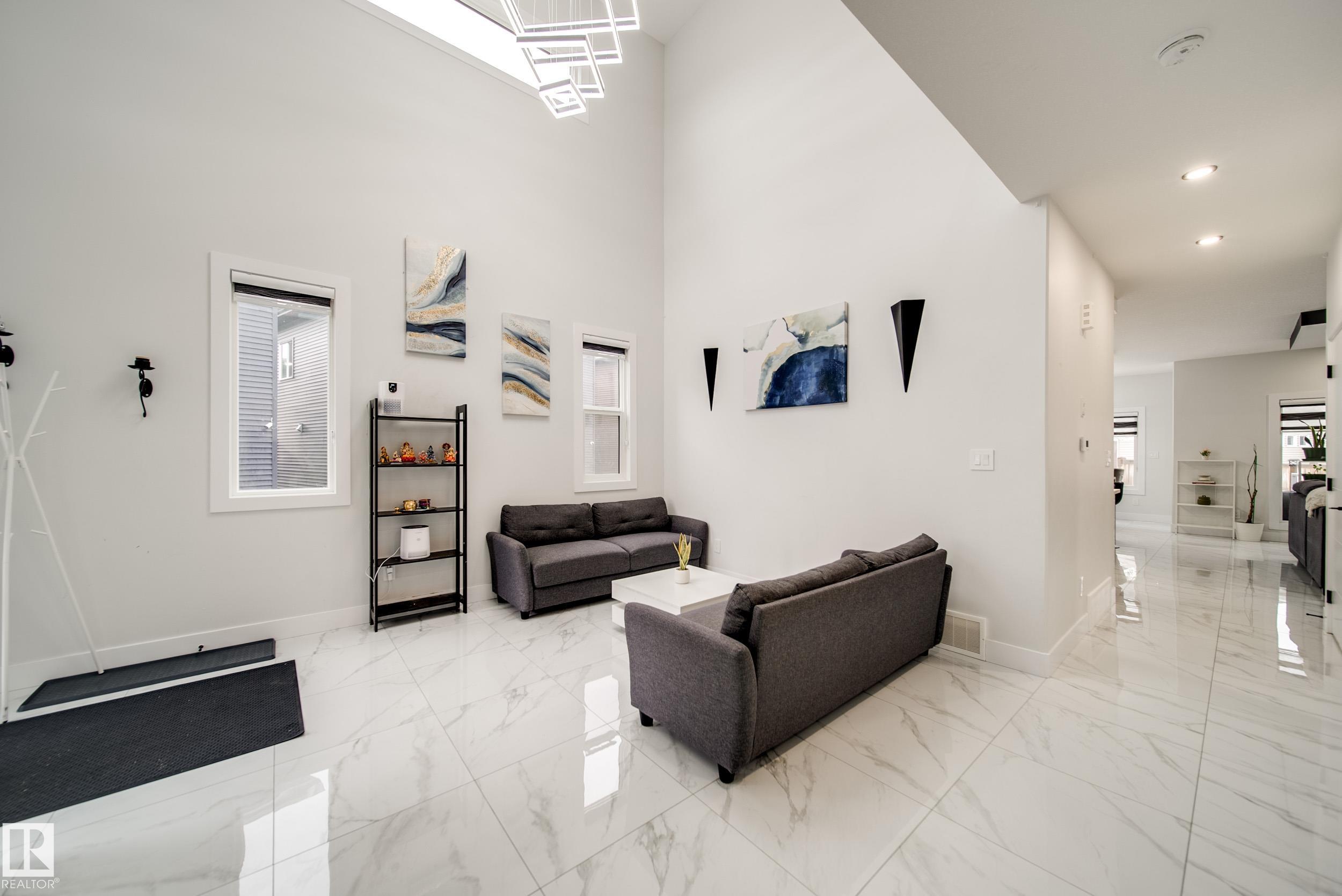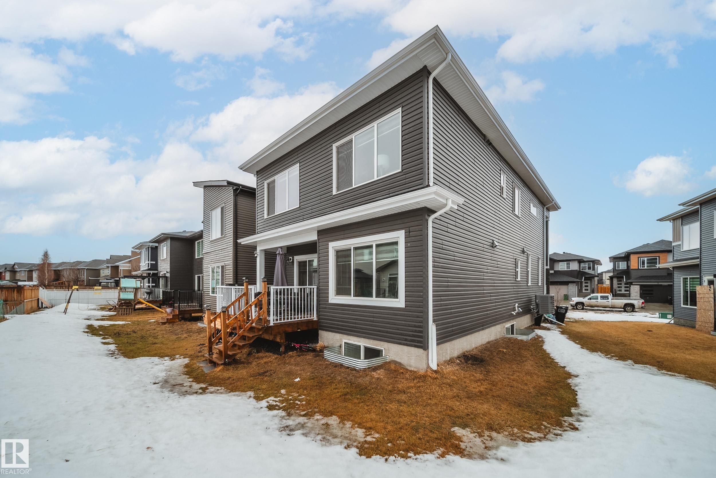 STUNNING custom built home in Schonsee offering 6 BEDS + 5 BATHS, designed for modern living & income potential! Featuring 9? ceilings on ALL levels & a grand open-to-above entry, this home makes an unforgettable first impression. The main floor boasts a bright living rm w/feature ceiling & tiled fireplace, spacious dining rm, main floor bdrm/den w/attached full bath, & a chef's dream kitchen w/QUARTZ counters, DOUBLE WATERFALL island, & SPICE KITCHEN w/a window & gas stove. Upstairs offers 4 generous bdrms incl. a LUXURIOUS primary retreat w/WIC, cove ceiling & spa-like ensuite w/jetted tub + tiled shower. One bdrm has its own private ensuite, while 2 share a Jack & Jill 5 pc bath. Spacious BONUS rm + laundry complete the level. SEPARATE ENTRANCE to a partly finished bsmt w/LEGAL SUITE permit adds incredible future value. Loaded w/upgrades: AC, garage heater, glass railing, tile baths, in-step lighting, SW facing rear deck + more! Prime location close to schools, shopping, parks & Henday. Call this home!