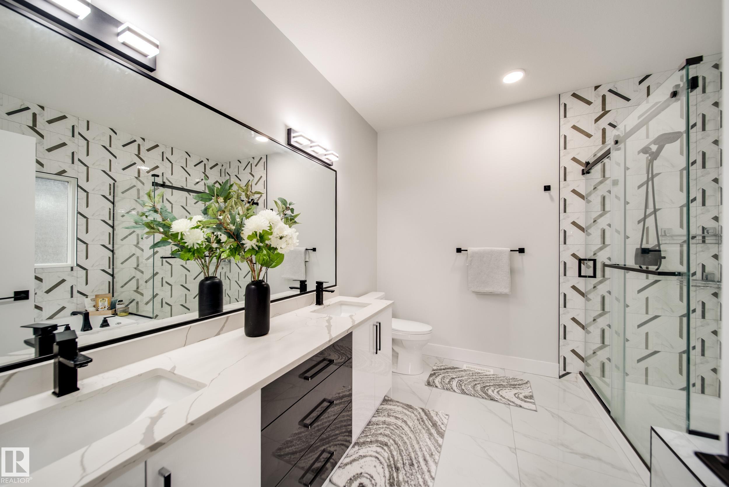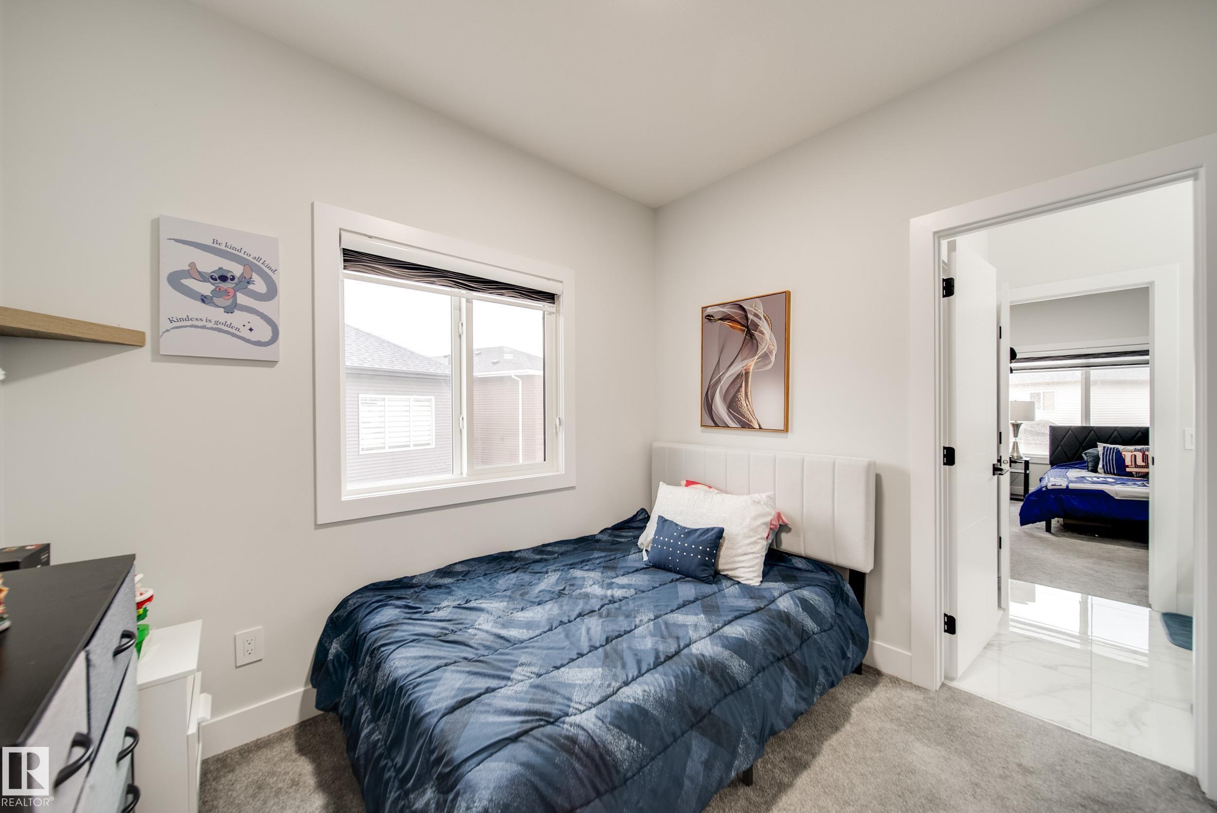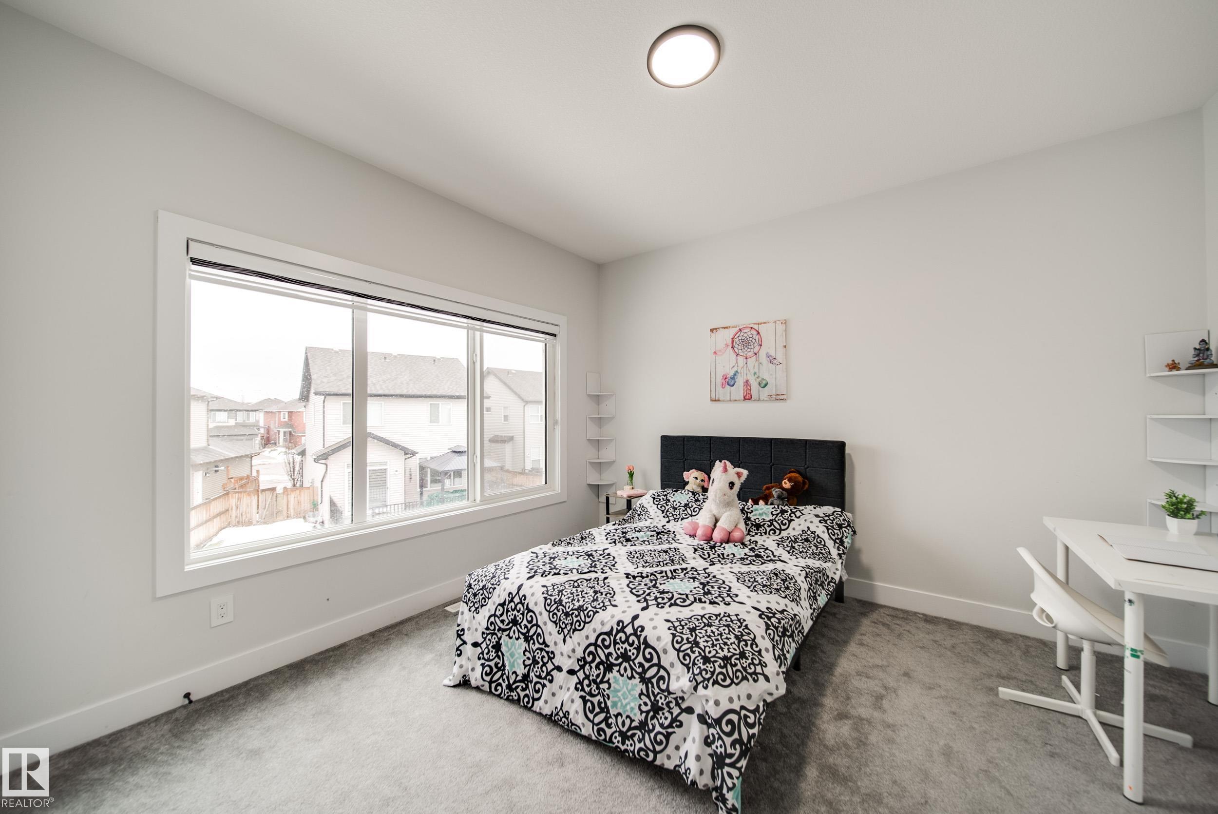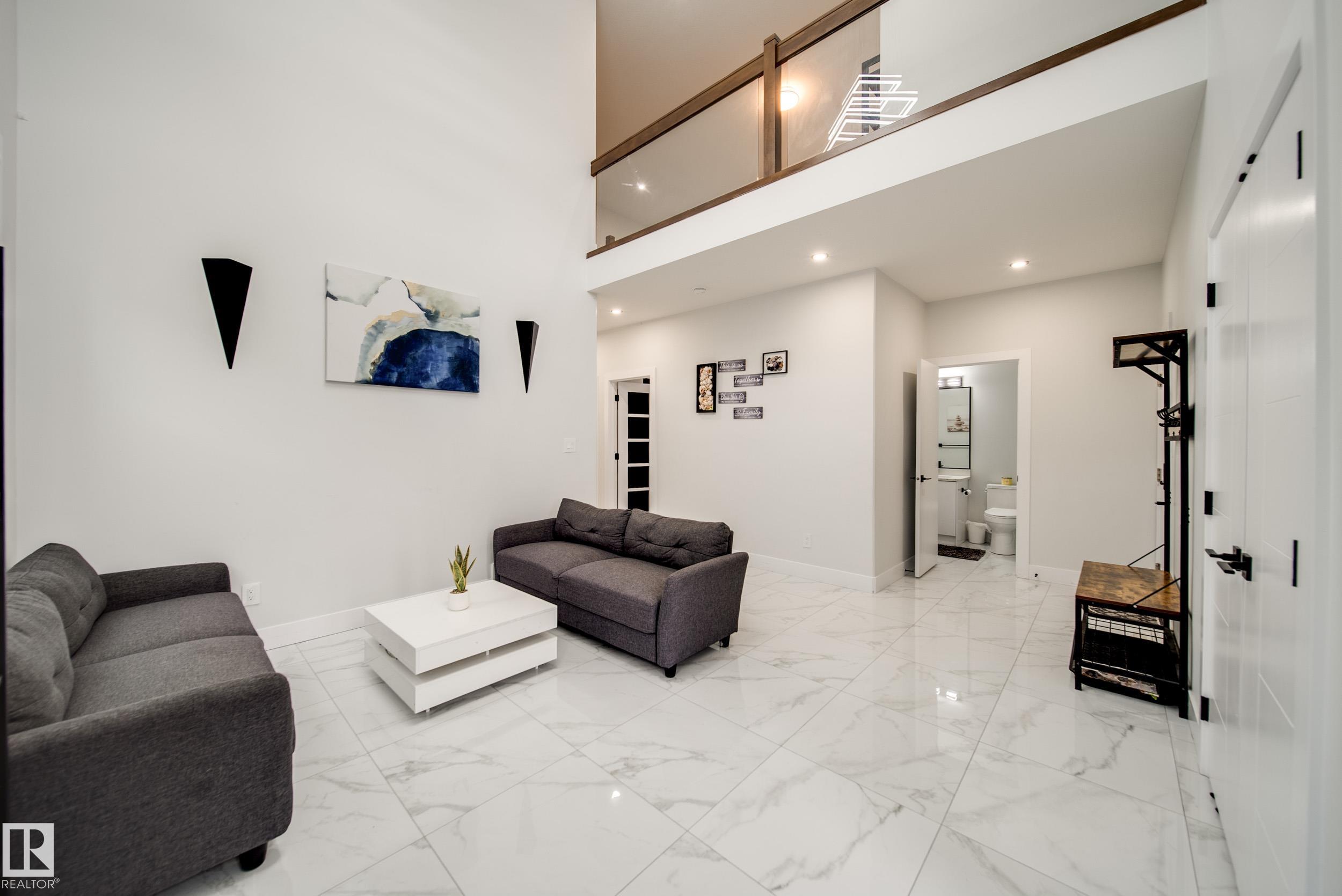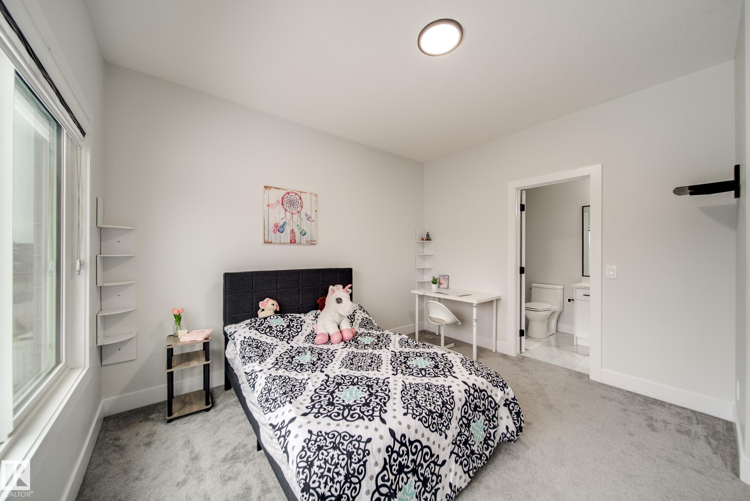 STUNNING custom built home in Schonsee offering 6 BEDS + 5 BATHS, designed for modern living & income potential! Featuring 9? ceilings on ALL levels & a grand open-to-above entry, this home makes an unforgettable first impression. The main floor boasts a bright living rm w/feature ceiling & tiled fireplace, spacious dining rm, main floor bdrm/den w/attached full bath, & a chef's dream kitchen w/QUARTZ counters, DOUBLE WATERFALL island, & SPICE KITCHEN w/a window & gas stove. Upstairs offers 4 generous bdrms incl. a LUXURIOUS primary retreat w/WIC, cove ceiling & spa-like ensuite w/jetted tub + tiled shower. One bdrm has its own private ensuite, while 2 share a Jack & Jill 5 pc bath. Spacious BONUS rm + laundry complete the level. SEPARATE ENTRANCE to a partly finished bsmt w/LEGAL SUITE permit adds incredible future value. Loaded w/upgrades: AC, garage heater, glass railing, tile baths, in-step lighting, SW facing rear deck + more! Prime location close to schools, shopping, parks & Henday. Call this home!