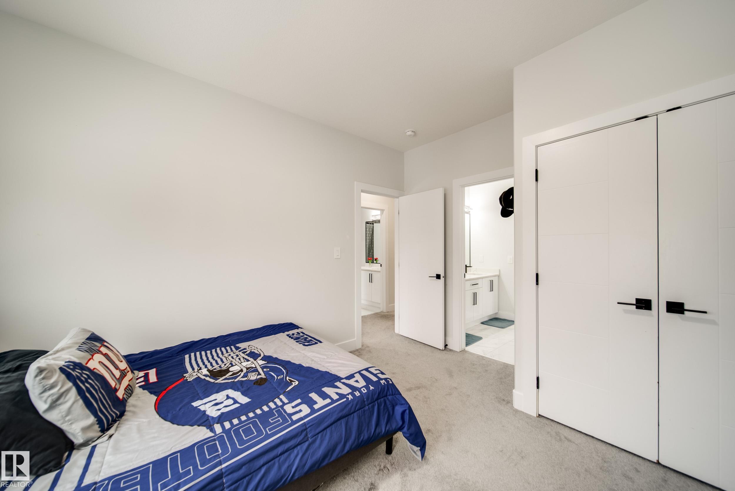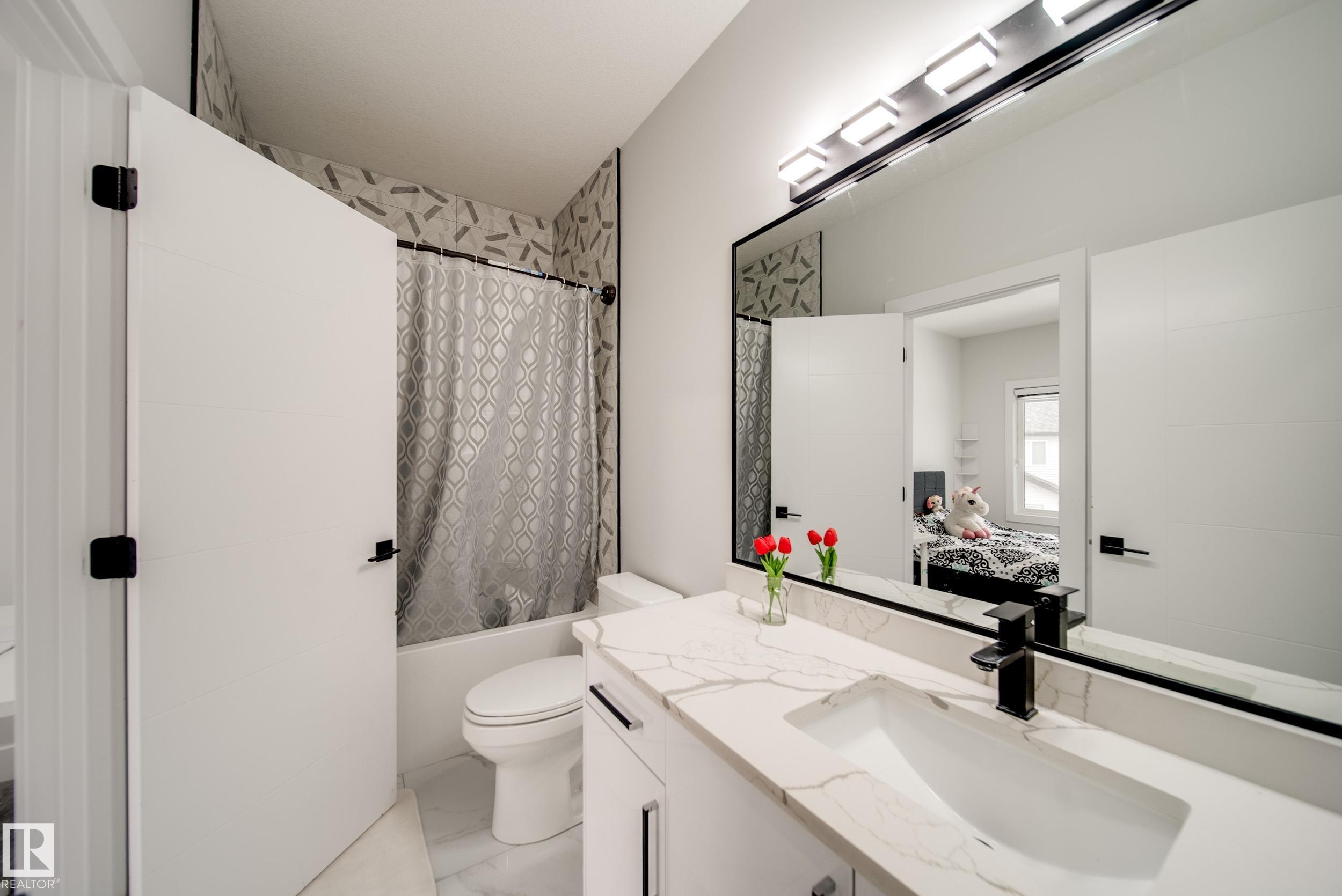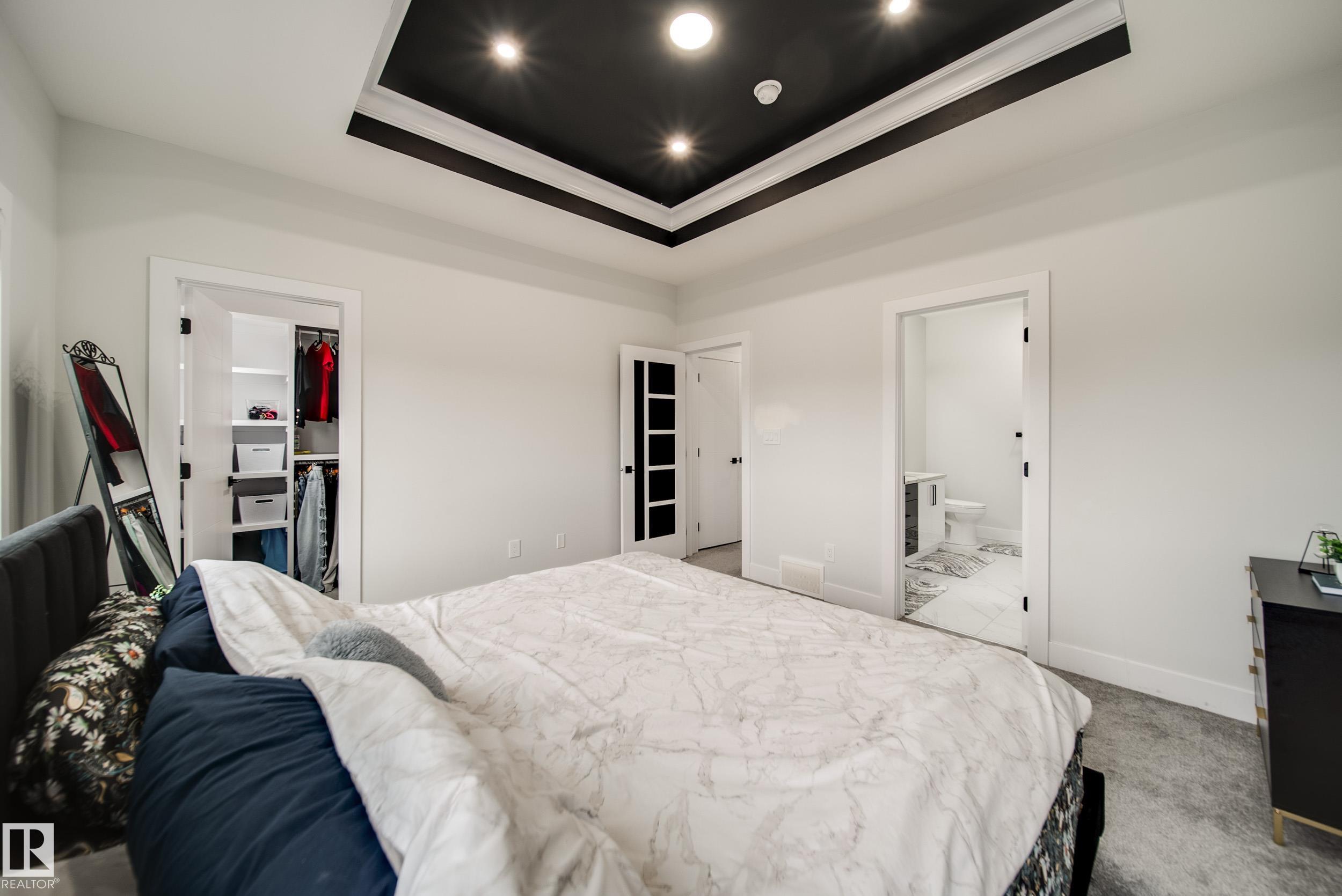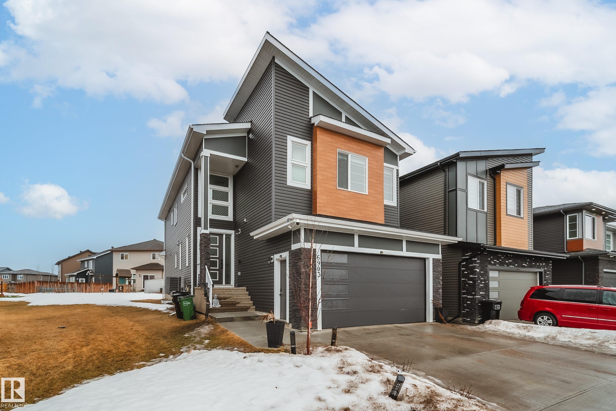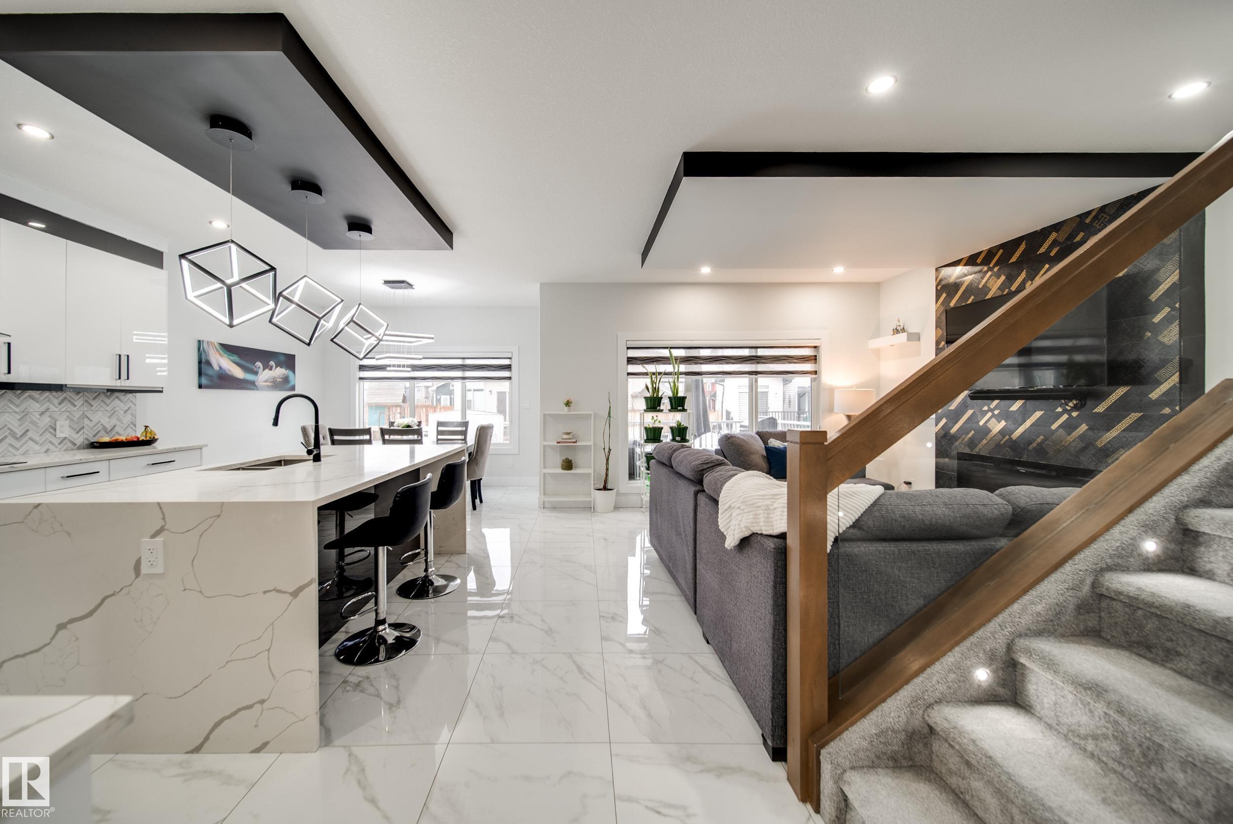 STUNNING custom built home in Schonsee offering 6 BEDS + 5 BATHS, designed for modern living & income potential! Featuring 9? ceilings on ALL levels & a grand open-to-above entry, this home makes an unforgettable first impression. The main floor boasts a bright living rm w/feature ceiling & tiled fireplace, spacious dining rm, main floor bdrm/den w/attached full bath, & a chef's dream kitchen w/QUARTZ counters, DOUBLE WATERFALL island, & SPICE KITCHEN w/a window & gas stove. Upstairs offers 4 generous bdrms incl. a LUXURIOUS primary retreat w/WIC, cove ceiling & spa-like ensuite w/jetted tub + tiled shower. One bdrm has its own private ensuite, while 2 share a Jack & Jill 5 pc bath. Spacious BONUS rm + laundry complete the level. SEPARATE ENTRANCE to a partly finished bsmt w/LEGAL SUITE permit adds incredible future value. Loaded w/upgrades: AC, garage heater, glass railing, tile baths, in-step lighting, SW facing rear deck + more! Prime location close to schools, shopping, parks & Henday. Call this home!
