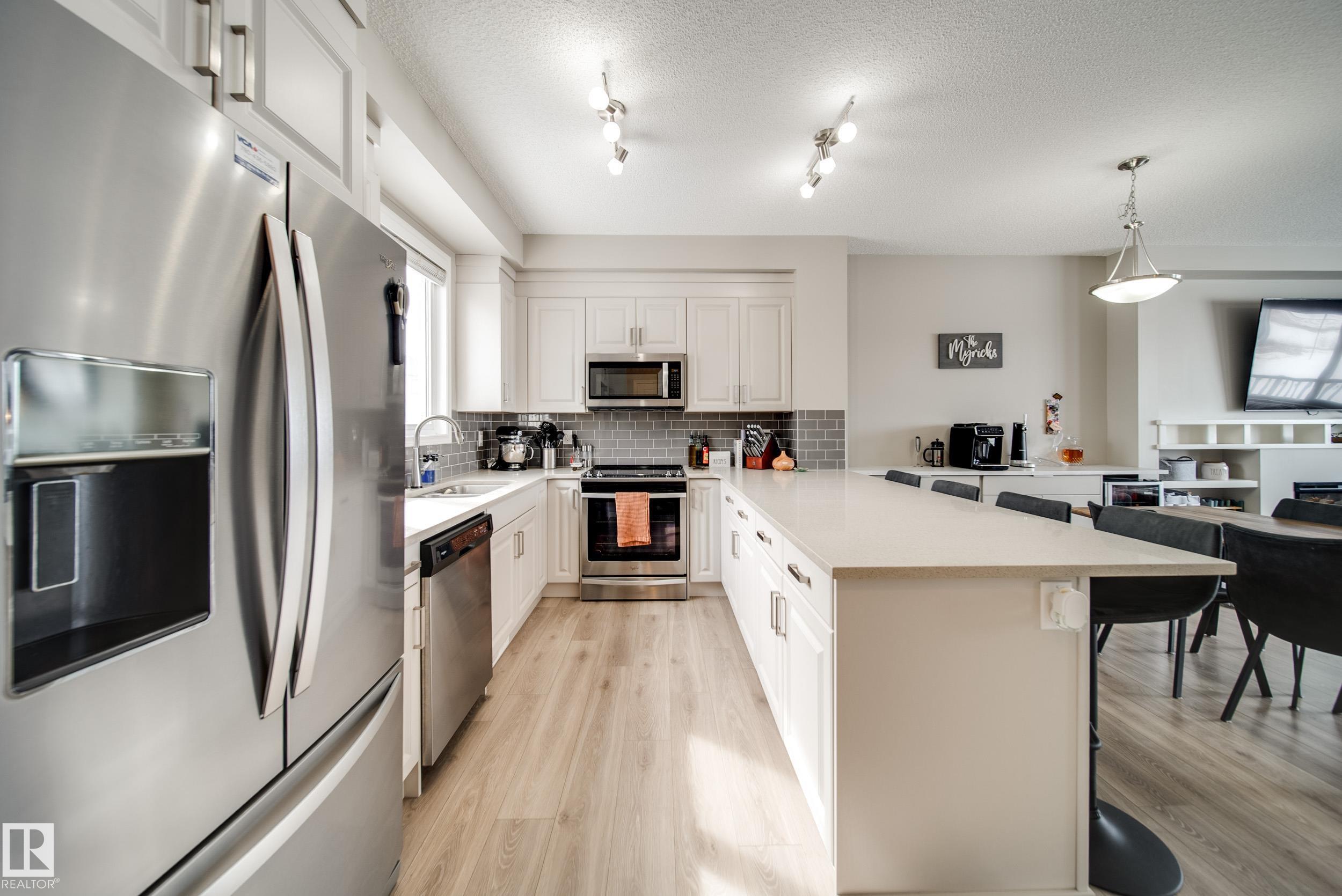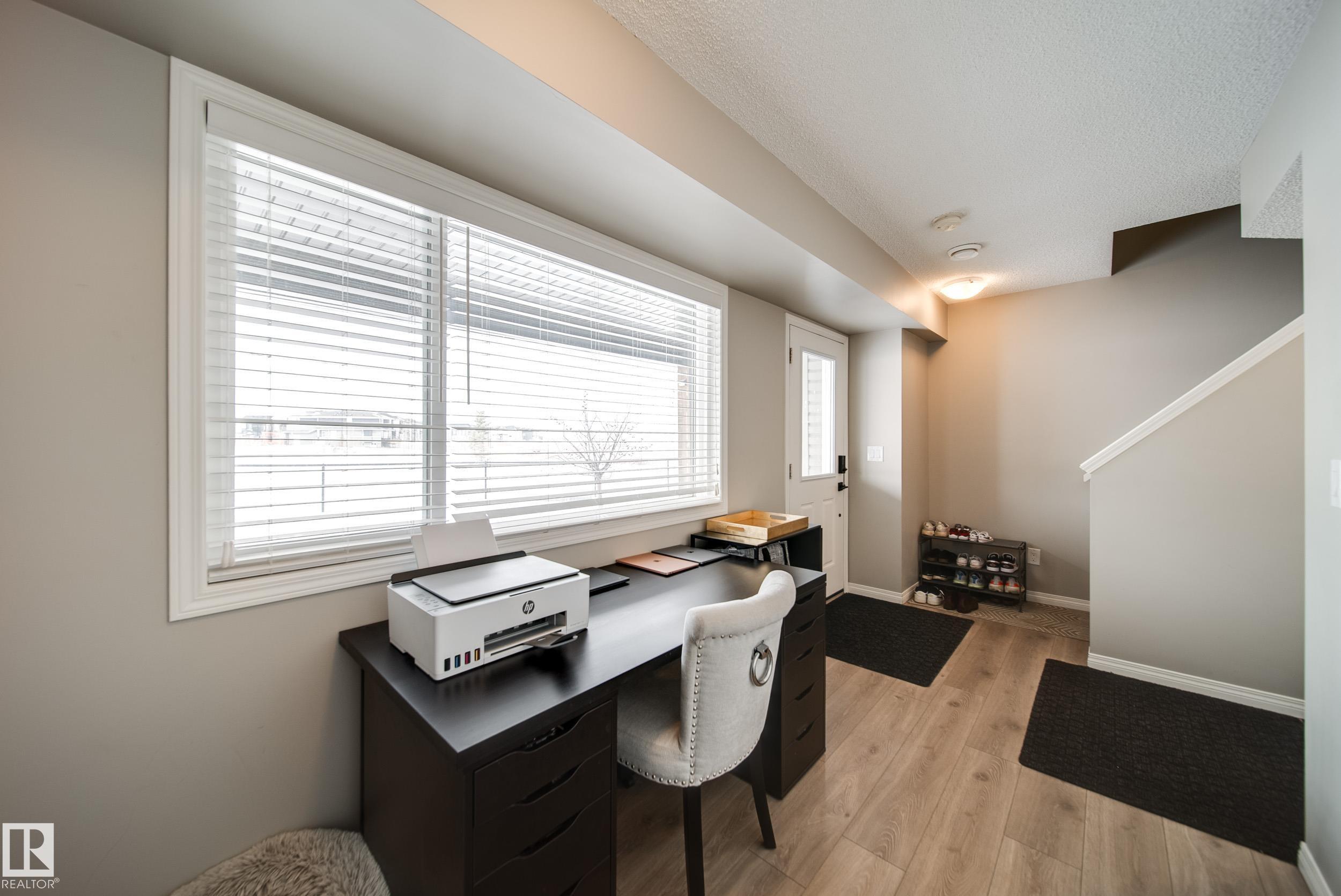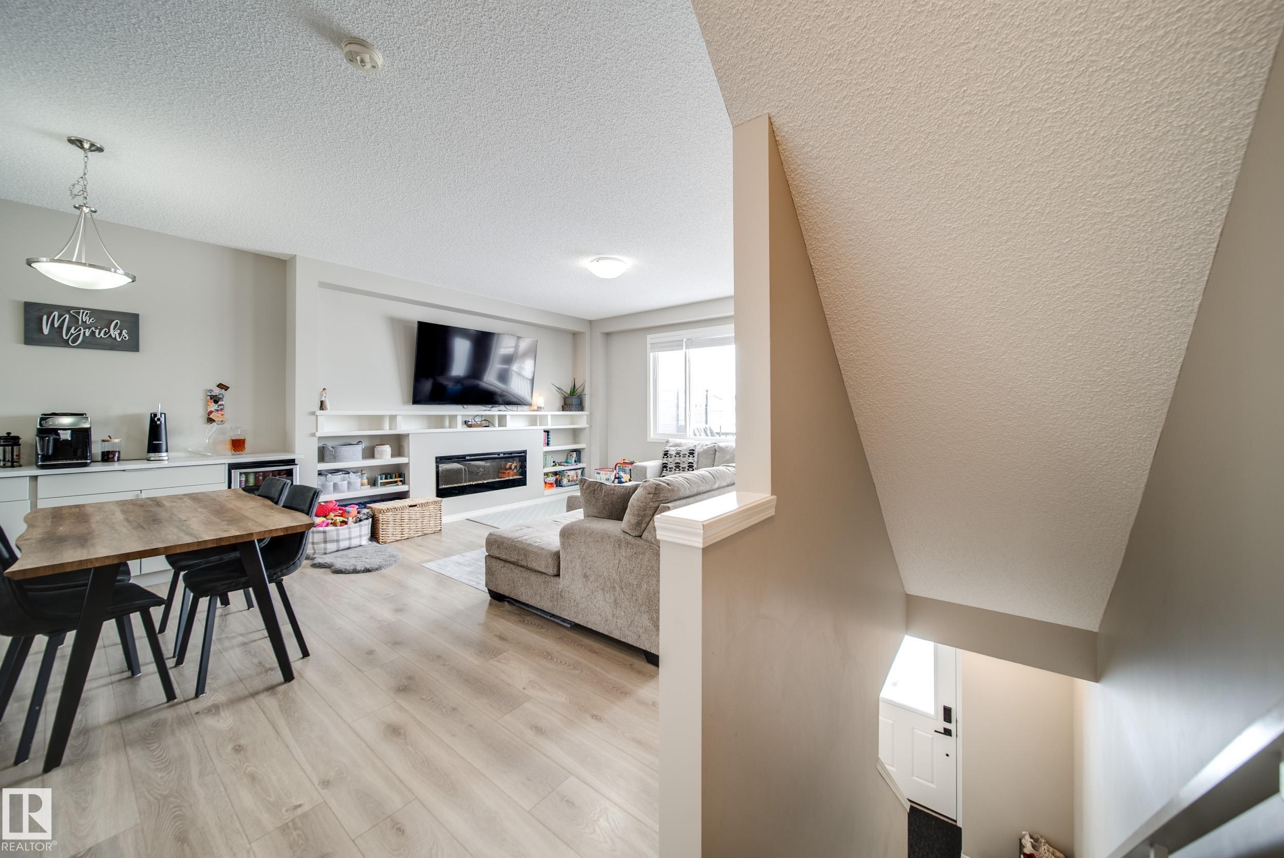 Attention First Time Home Buyers! This home offers peaceful views overlooking the scenic walking path and tranquil pond from the 2nd floor deck. Step inside to discover a bright and functional layout designed for modern living. Upon entry, you're greeted by a flex space; perfect for an office or home gym, and access to your double garage! Upstairs, the spacious 2nd floor features an inviting living area centered around an electric fireplace surrounded by built in shelving, creating a warm and cozy atmosphere. The open concept design flows into the dining space and kitchen, making it perfect for both everyday living and entertaining. The dining area also contains upgraded extended cabinetry, allowing for even more storage than this home already offers! Upstairs, you'll find 3 spacious bedrooms and 2 bathrooms, with the primary suite featuring a walk-in closet, ensuite bathroom, and peaceful views of the green space and nearby pond.