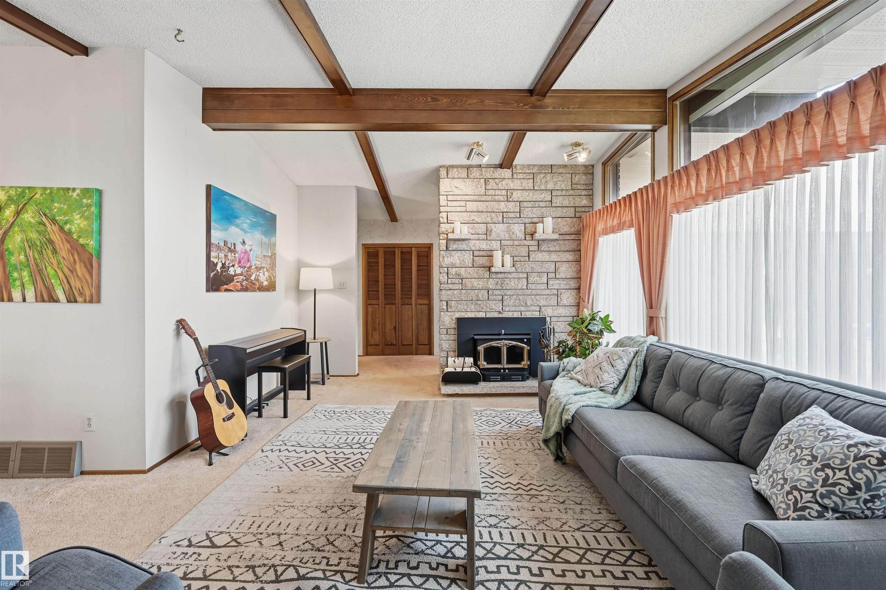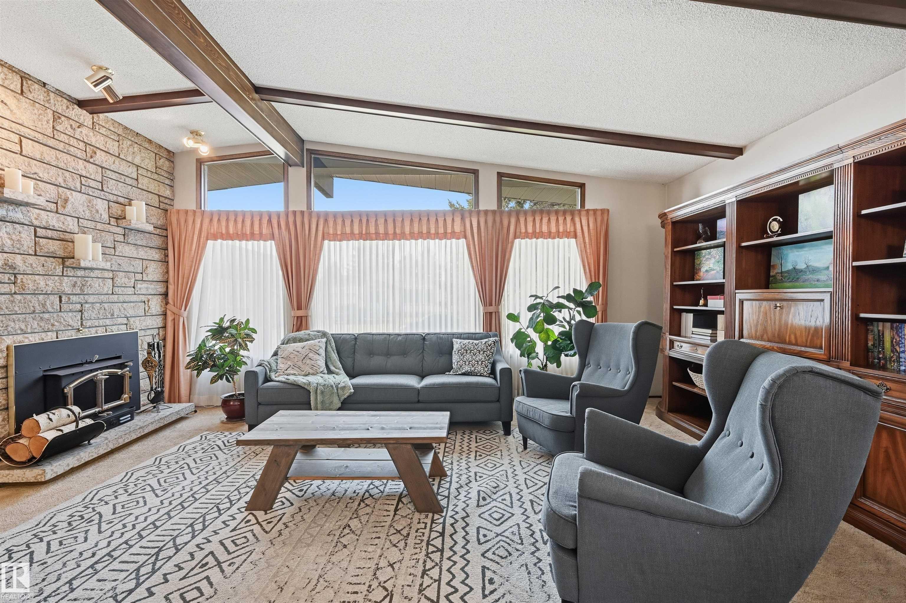 FANTASTIC LOCATION & great value for a well-maintained A-FRAME BUNGALOW boasting nearly 1,550sf ABOVE GRADE plus a finished basement. This home is bursting w/ mid-century charm! Upon entry find honey comb tiles in mint condition & Tyndall stone feature wall. The cozy living room & dining room have a beautiful vault w/ feature fluting. Meticulous kitchen w/ Corian counters, ample cabinetry/built-ins, underlighting & stainless steel appliances. 3 bedrooms w/ the primary looking into the private yard. Full 4pc bthrm next to bdrms & addtl 3-pc bthrm at back. Downstairs find large rec space w/ fireplace, 2 addtl bdrms, full 3pc bthrm & lrg storage rm w/ addtl appliances. Situated on a large lot with sizeable patio, mature trees, gardening area & shed. Plus double ATTACHED garage with man door to yard. Nestled onto a quiet cul-de-sac with easy access to walking trails & walking distance to Malcolm Tweddle School & Park. Plus Michaels Park close by & quick access to 91st & Whitemud. A must see!
