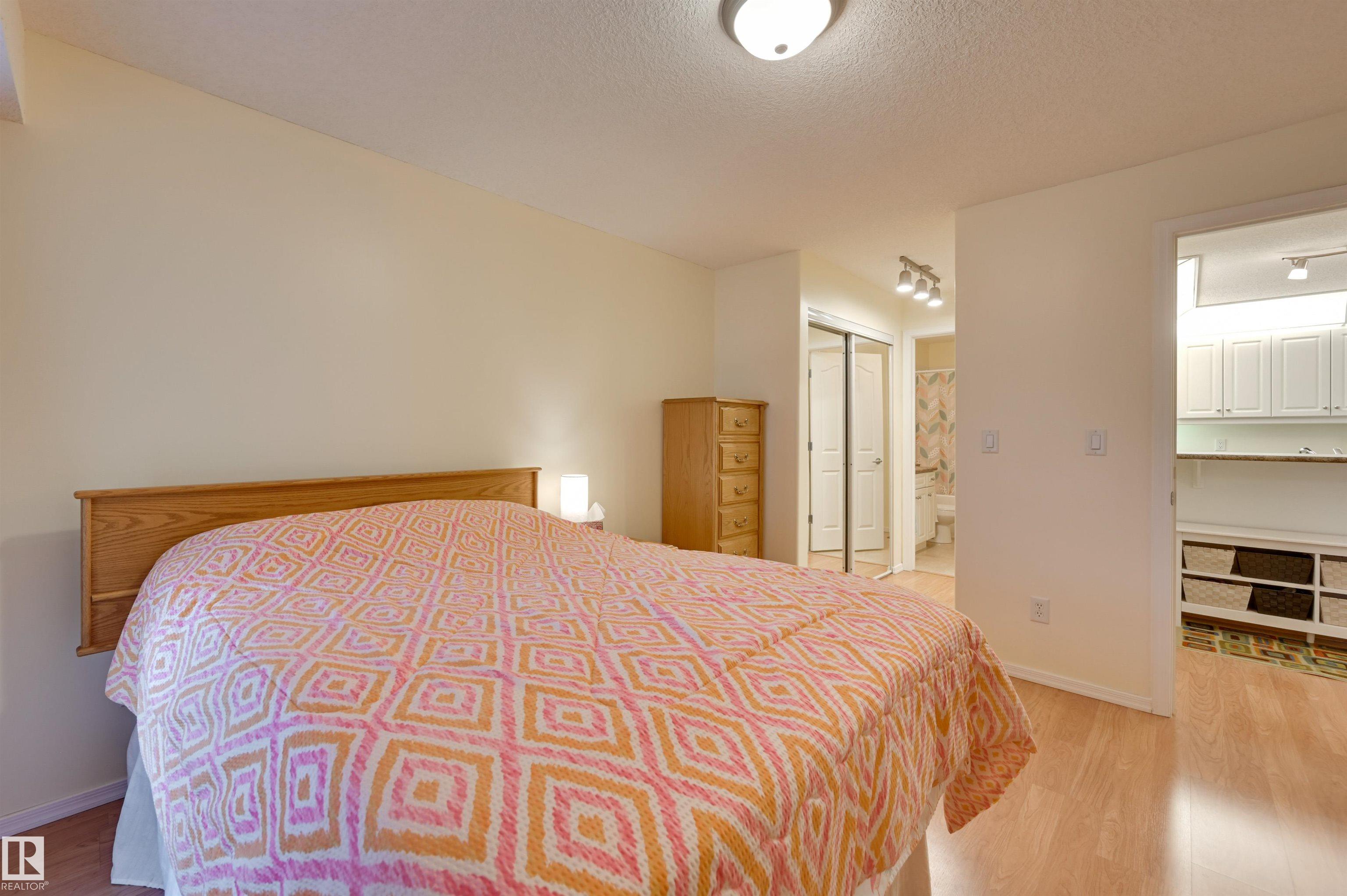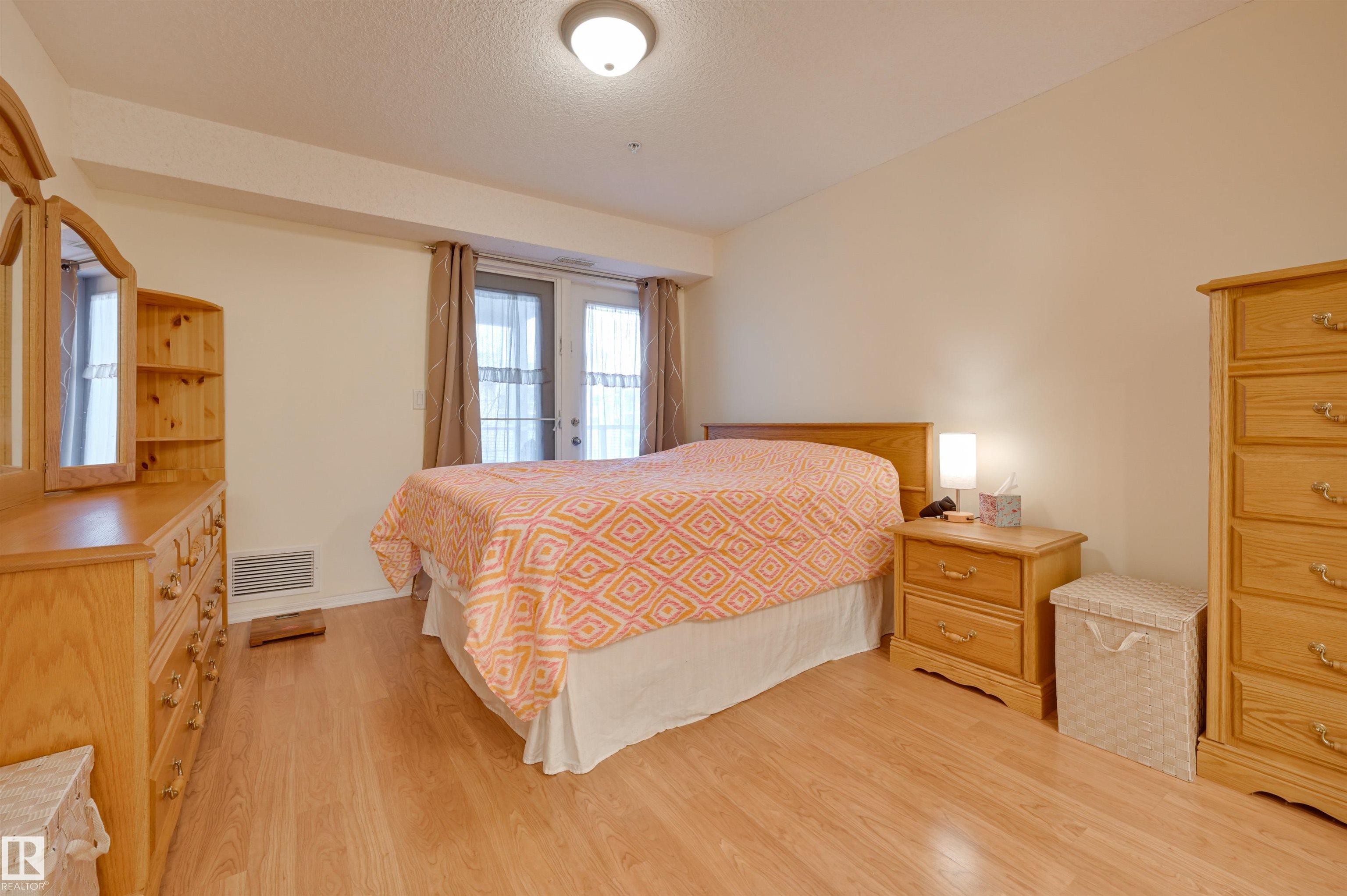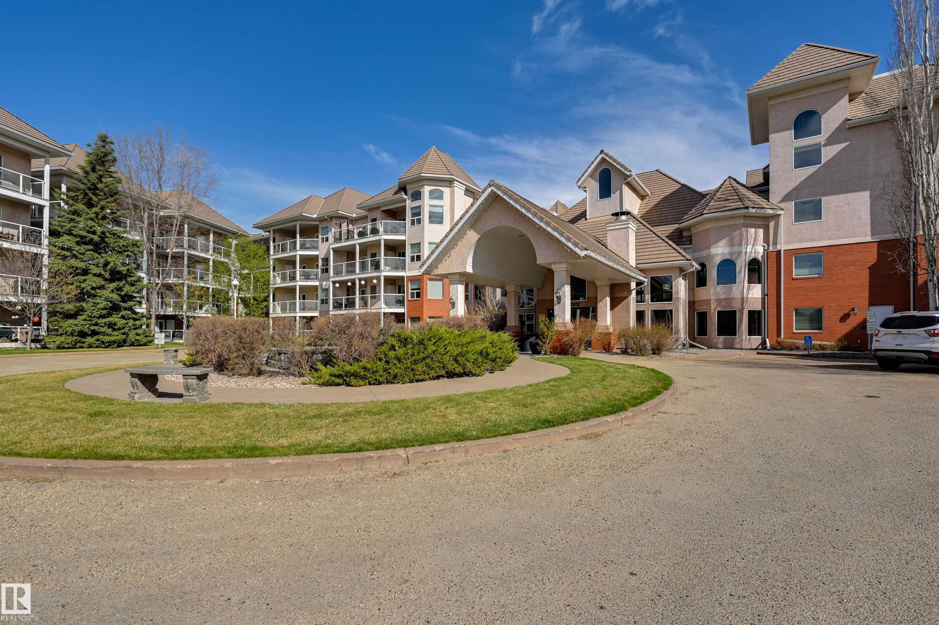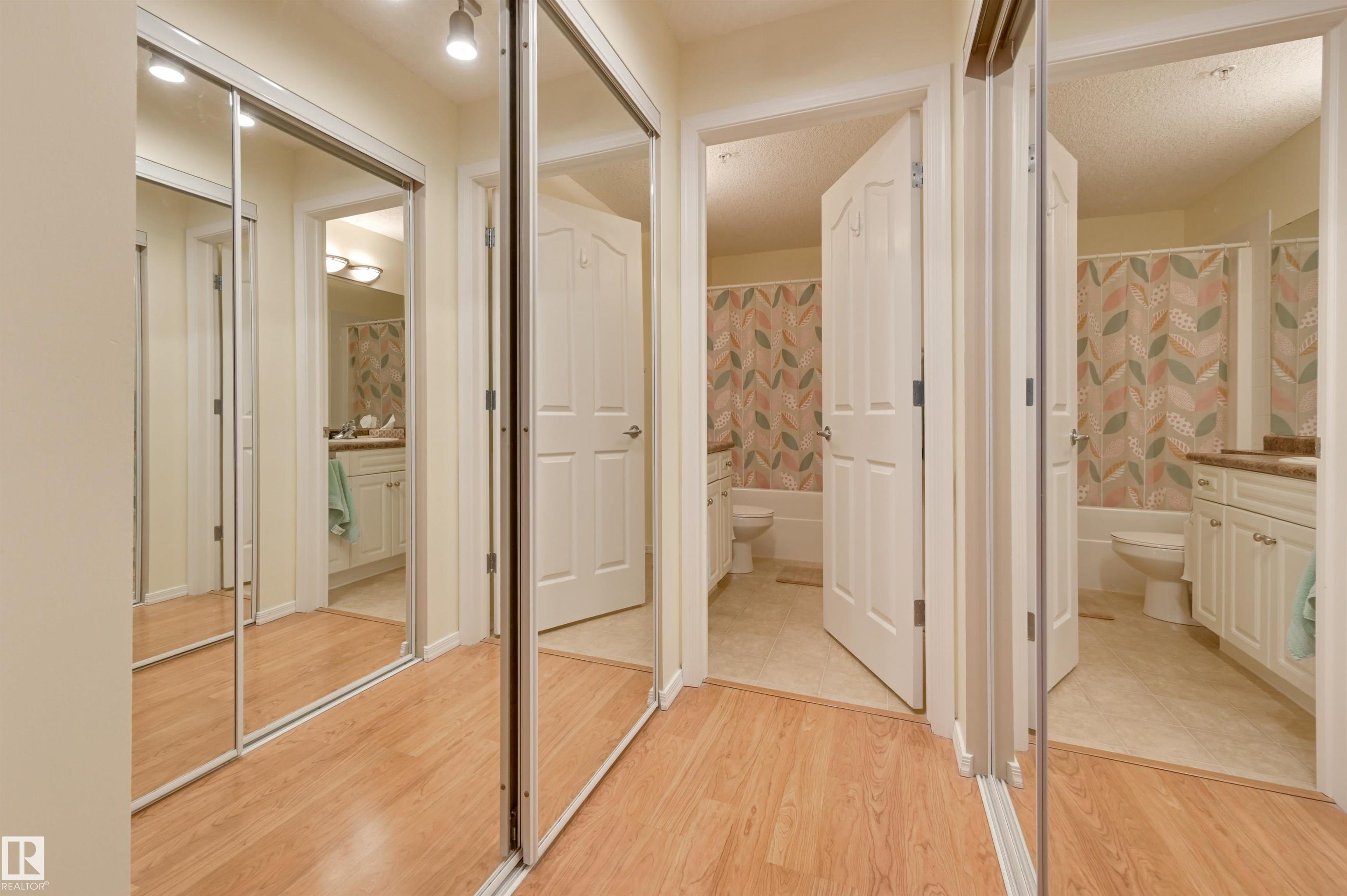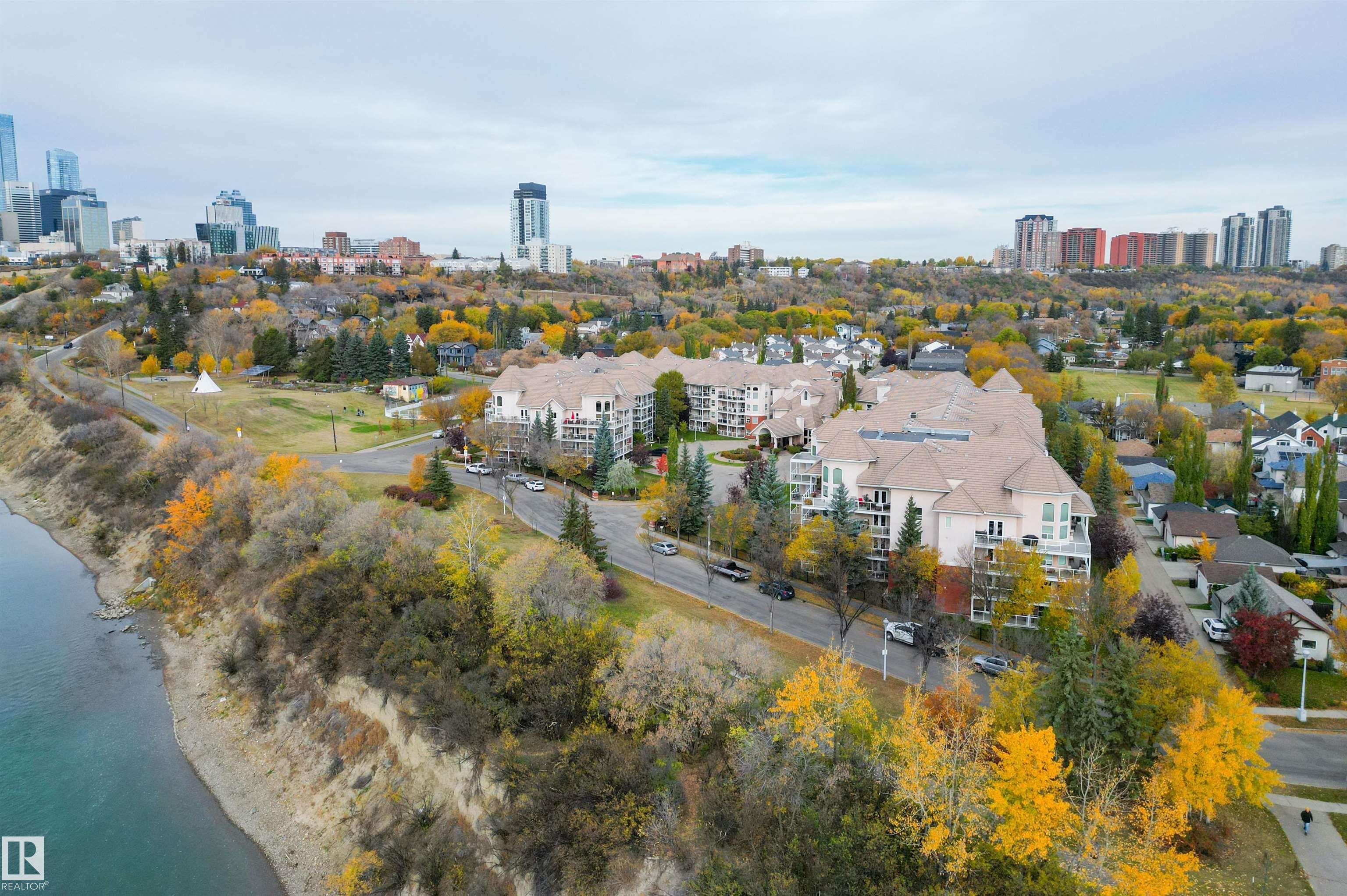 COURTYARD VIEWS from this IMMACULATE 2 bedroom 2 bathroom condo in the desirable RIVER GRANDE conveniently located with the river valley trails & transportation at your doorstep, minutes to Downtown & quick access to the U of A. This unit has an open concept layout with the bedrooms at opposite ends of the living area. The kitchen features white cabinetry, a raised eating bar & a pantry. Cozy gas f/p in the living room. Enjoy access to the southeast balcony with a gas BBQ outlet from the living room & primary bedroom. The primary bedroom has a walk through closet to the 4 piece ensuite & the 2nd bedroom is across from the 3 piece bathroom. The laundry room has storage. Included: stove, built-in microwave, fridge, dishwasher, INSUITE WASHER & DRYER, A/C, U/G PARKING & storage locker. Well managed, pet friendly building offering a fitness room, games room, social room, guest suite, car wash & visitor parking. Adjacent well maintained park with community amenities. Beautifully maintained home!