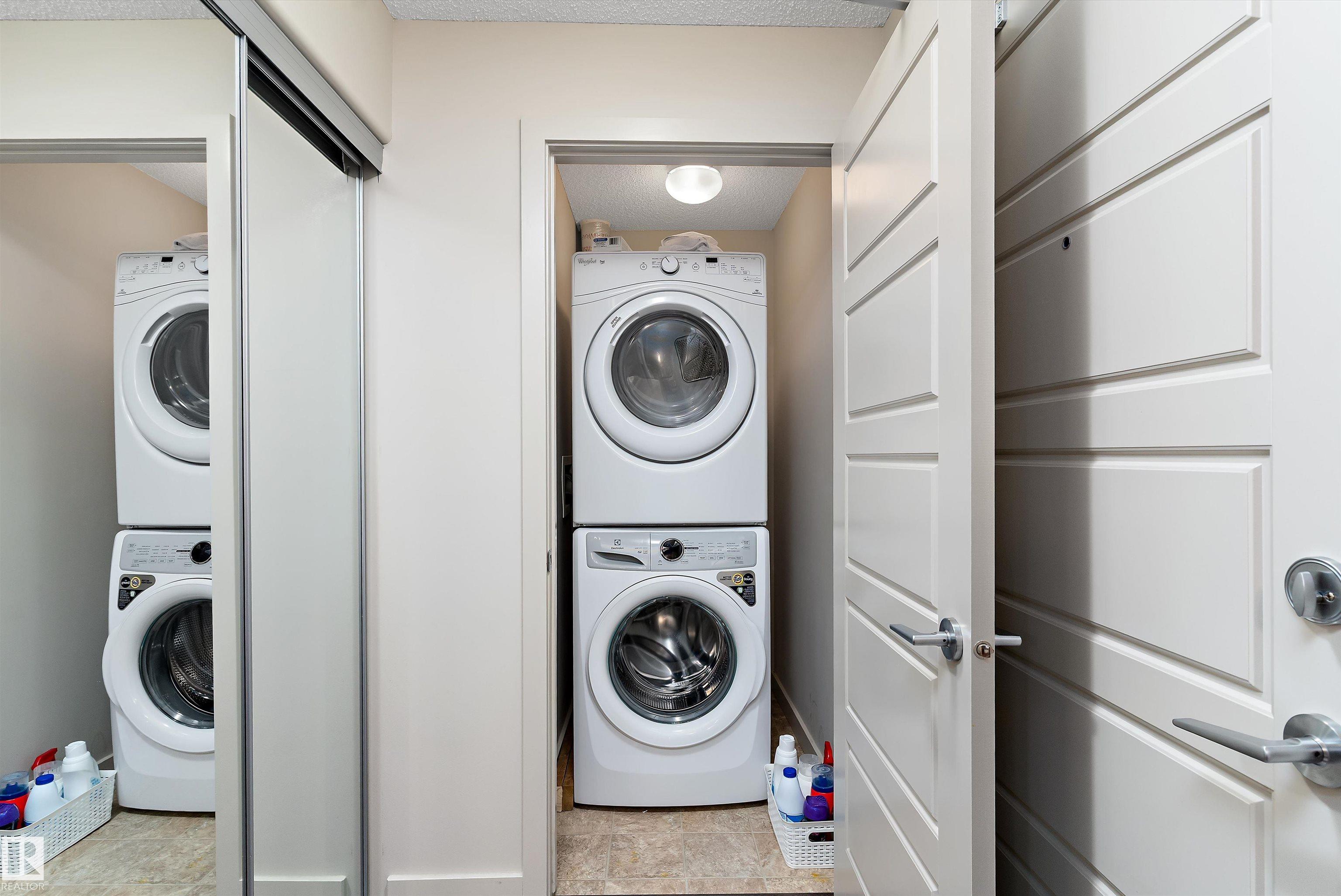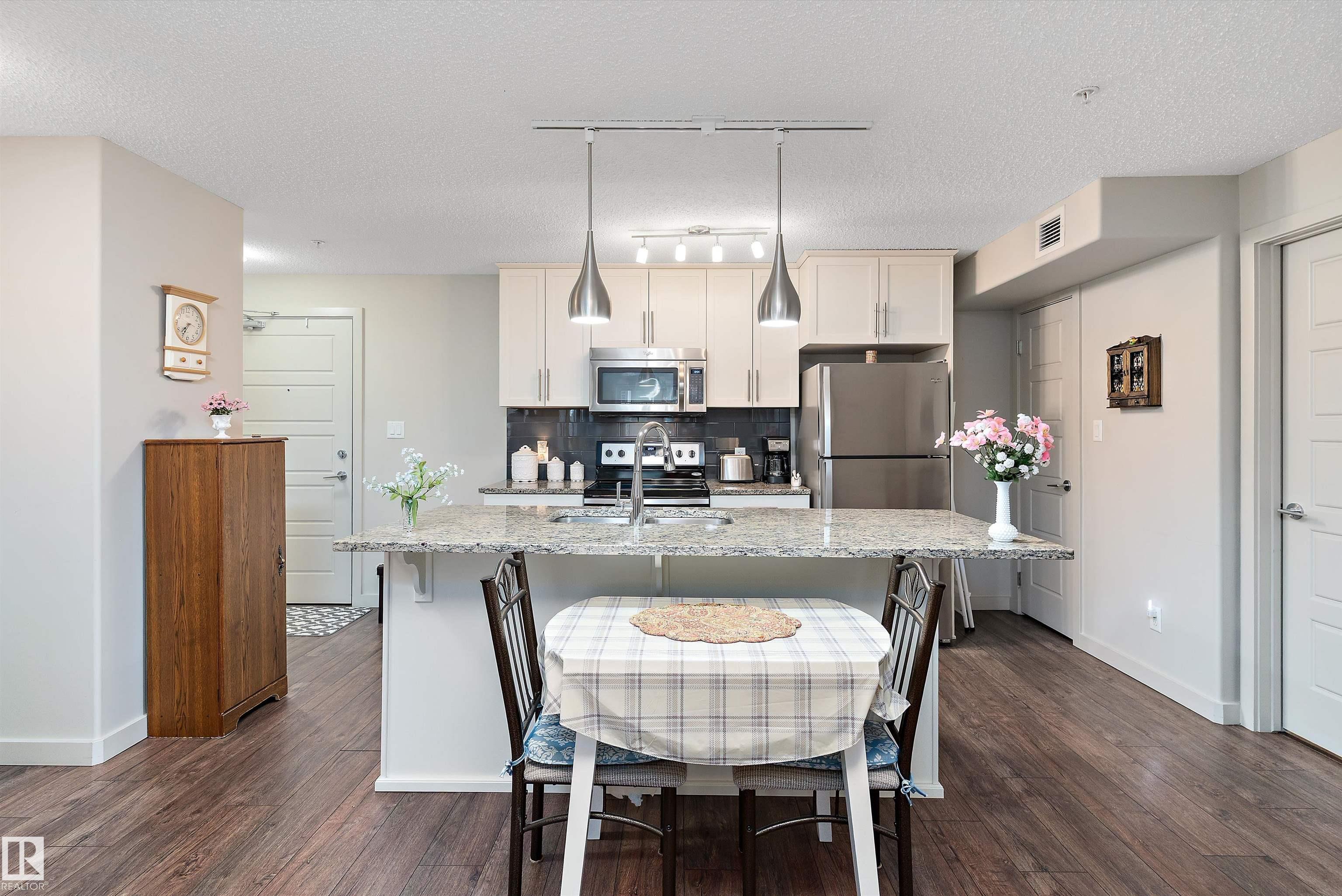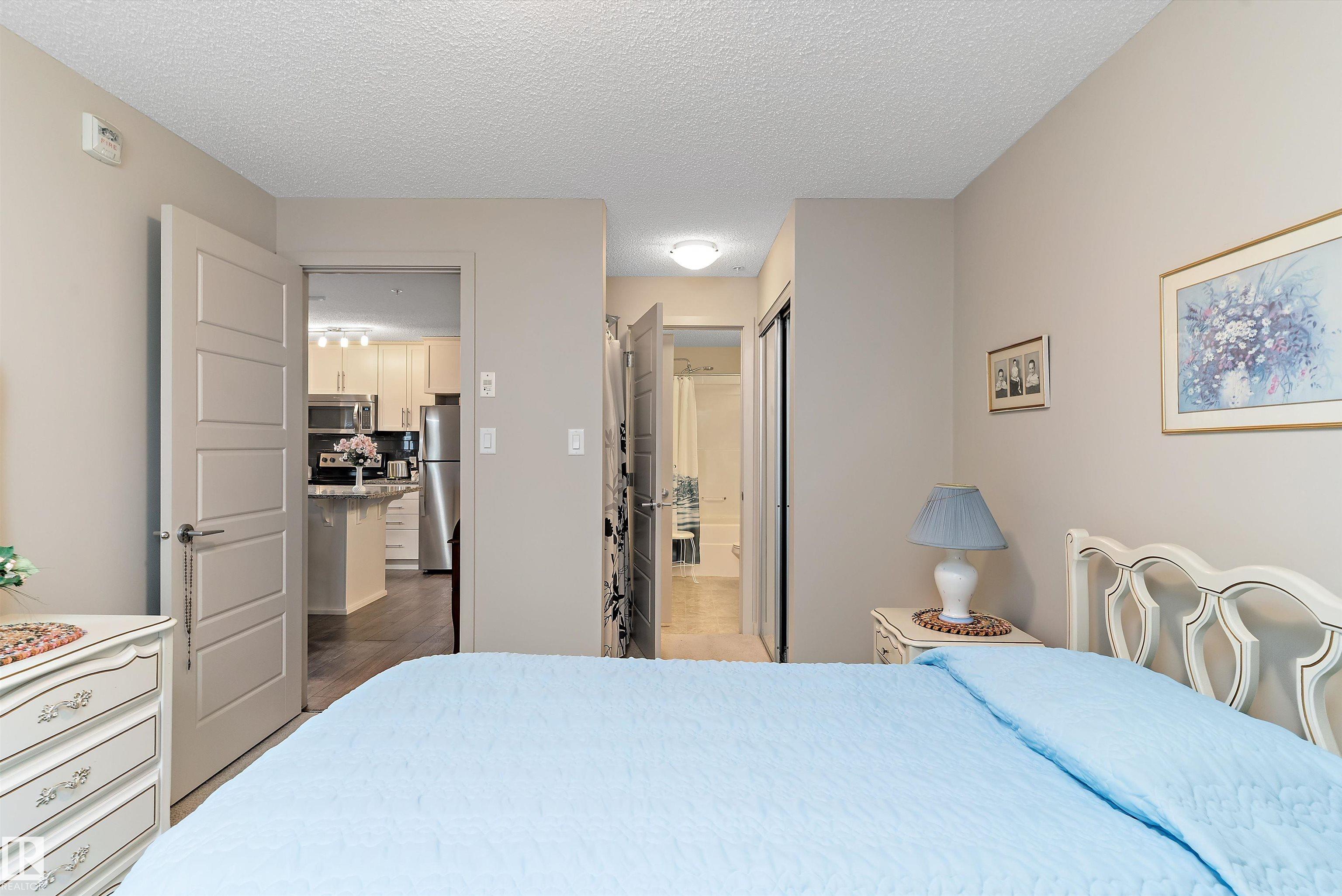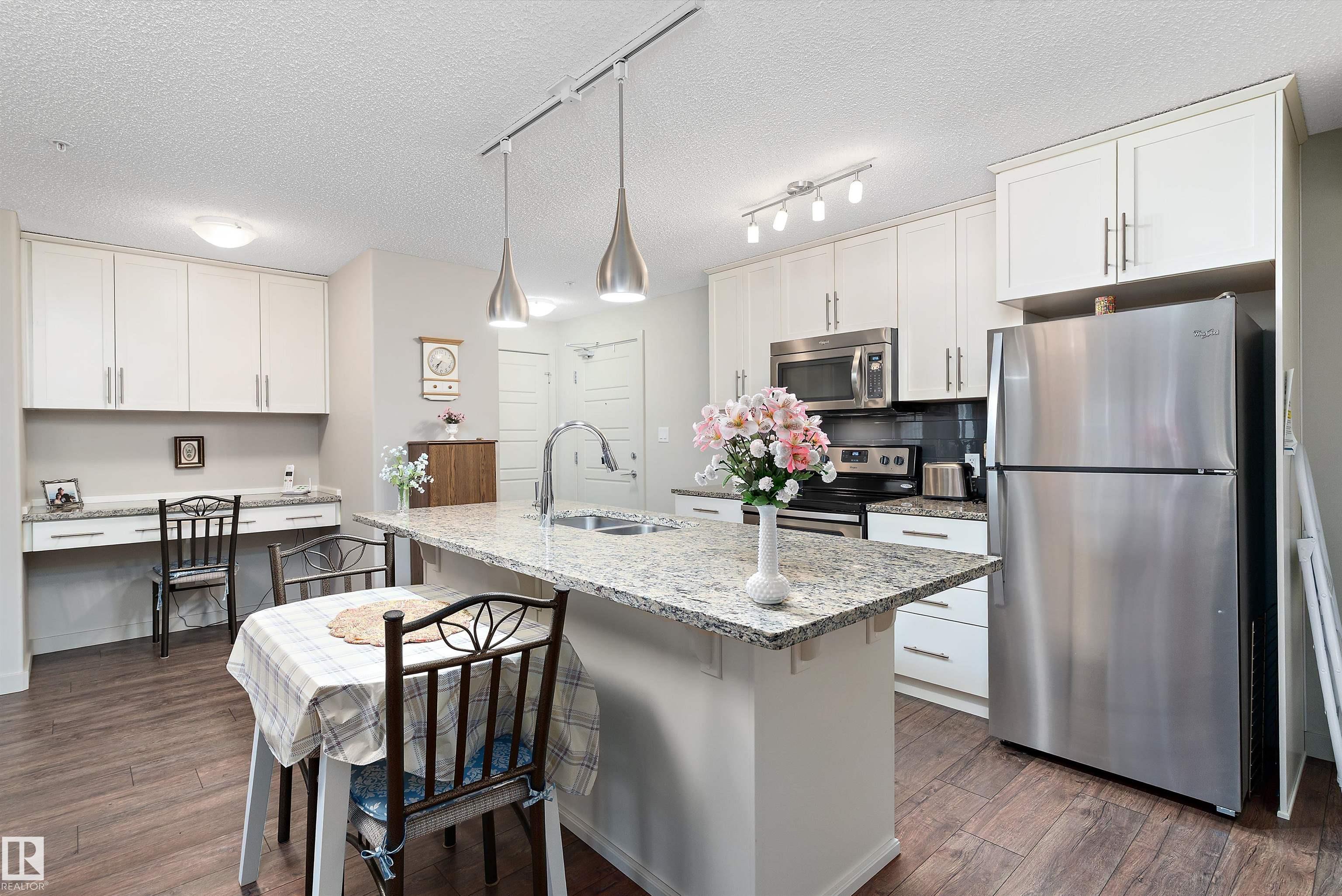 Modern and move-in ready! This stylish 2-bedroom, 2-bath condo offers the perfect blend of comfort and convenience in Edmonton?s Lake District. Featuring quartz countertops, tile backsplash, and stainless steel appliances, this open-concept home is designed for contemporary living. The kitchen includes a full-size pantry and eating bar that overlooks the bright living area. A built-in desk makes working from home easy, while in-suite laundry adds everyday convenience. The primary bedroom features a walk-through closet and private ensuite, with a second bedroom and full bath on the opposite side for added privacy. Enjoy the spacious balcony with gas BBQ hook-up, plus both underground heated and surface parking stalls. Heat and water are included. Ideally located near Lake Schonsee, parks, schools, shopping, and major routes. This home combines urban convenience with a peaceful community feel. PLUS 2 TITLED PARKING STALLS!!