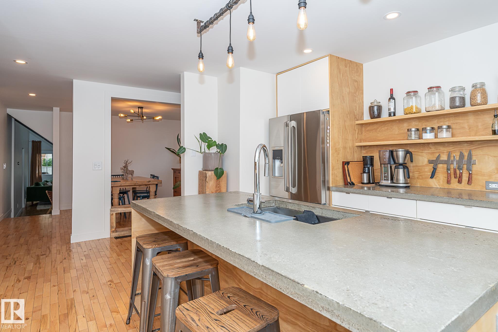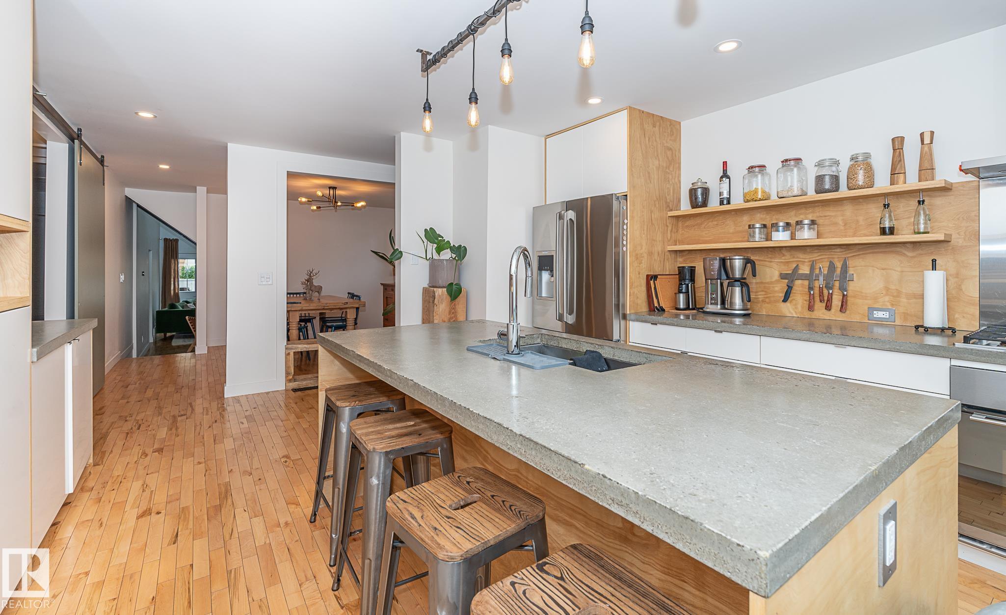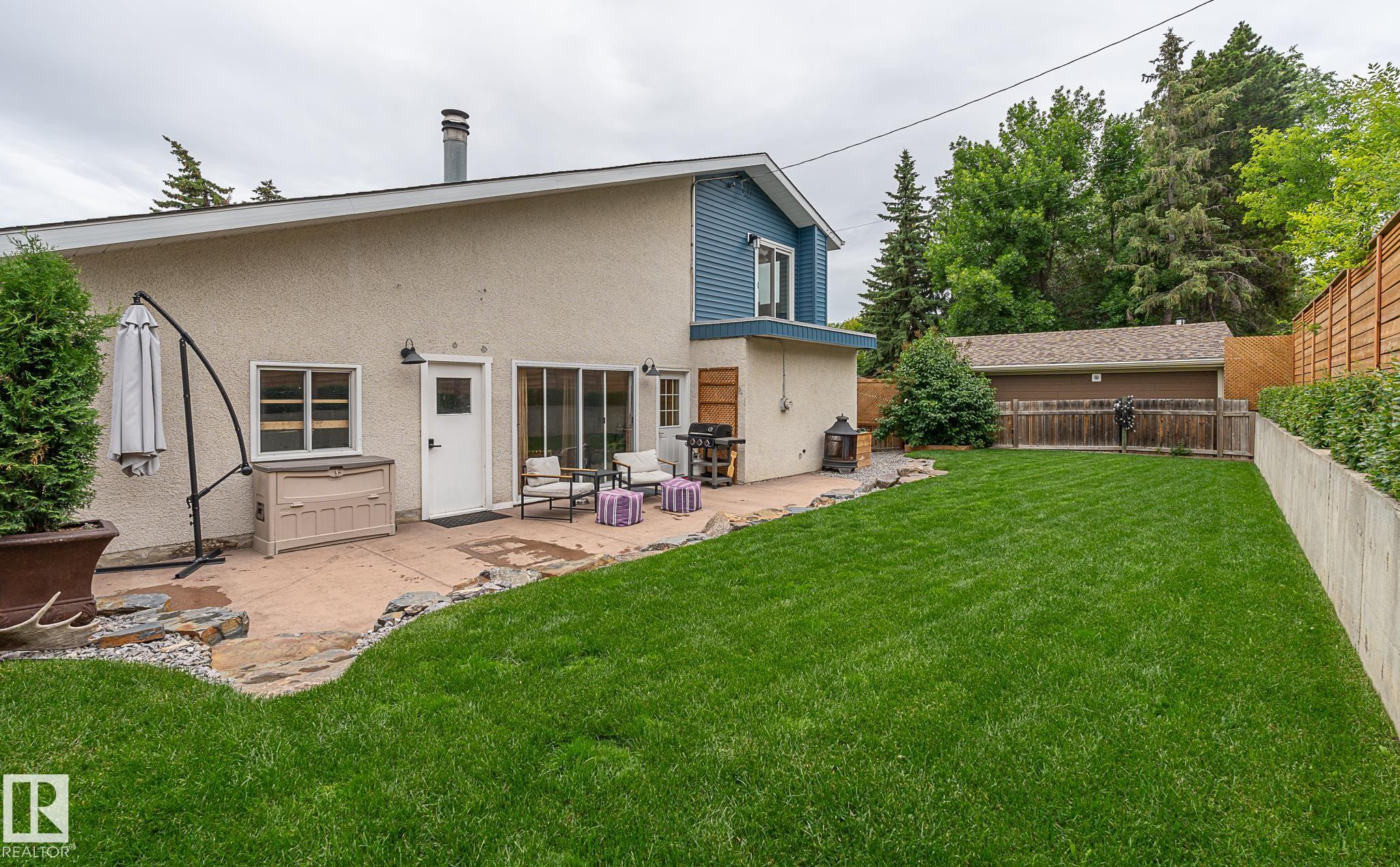 Nestled on a quiet crescent in Aspen Gardens, this renovated residence offers a blend of modern design & function. Main features a sleek contemporary kitchen with stainless steel appliances, concrete countertops, a gas cooktop, custom cabinetry, built-in shelving, & a spacious island ideal for entertaining. Adjacent is a dining area, 4 bedrooms & a stylish 4-piece bath. A few steps down, the expansive family room showcases soaring ceilings and a wood-burning fireplace, creating a warm atmosphere. The primary suite is designed with a walk-in closet & ensuite, dual sinks, a walk-in tiled shower, & soaking tub. Upper level offers a versatile loft-style bonus room with private patio?perfect for a home office. Includes Maple hardwood flooring & premium light fixtures. Stunning professional backyard development!! Major Upgrades include new plumbing, electrical, HVAC systems, ductwork, & energy-eff. triple-pane windows partly finished basement. Steps to ravine & Close to some of Edmonton's, Top-Rated schools!!