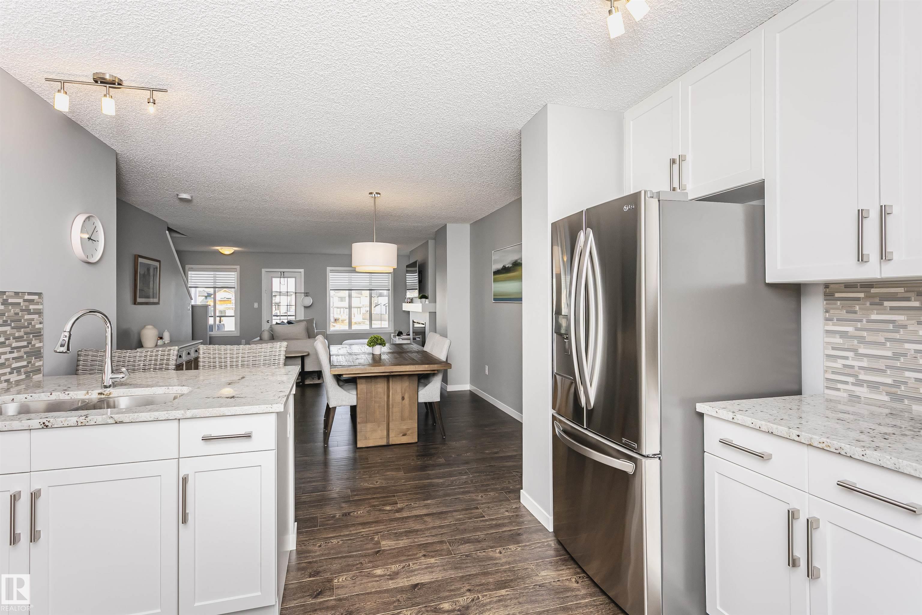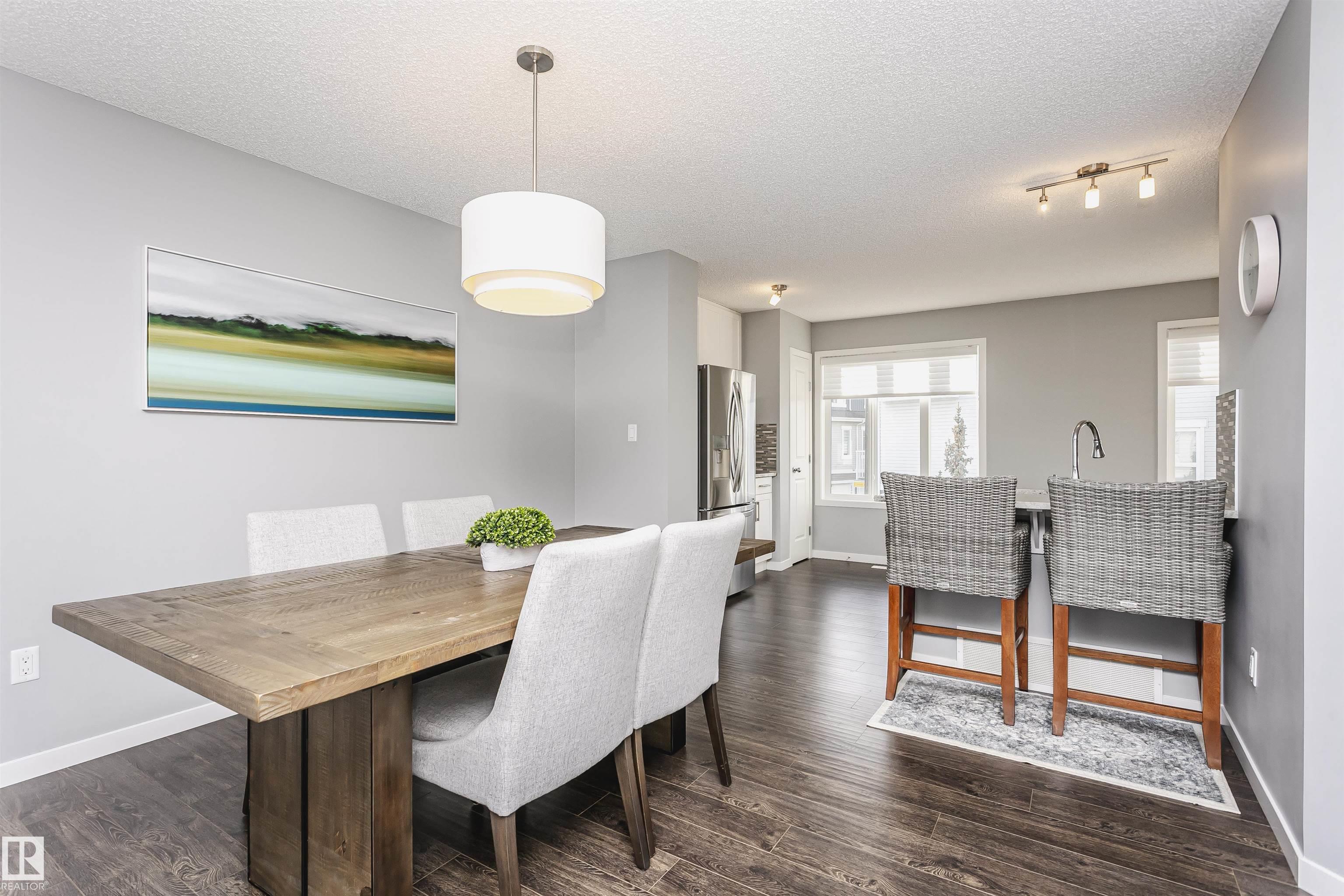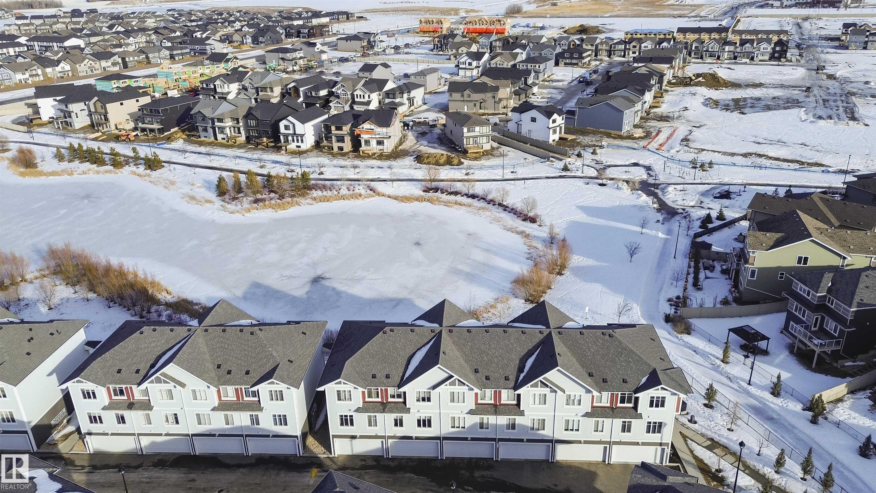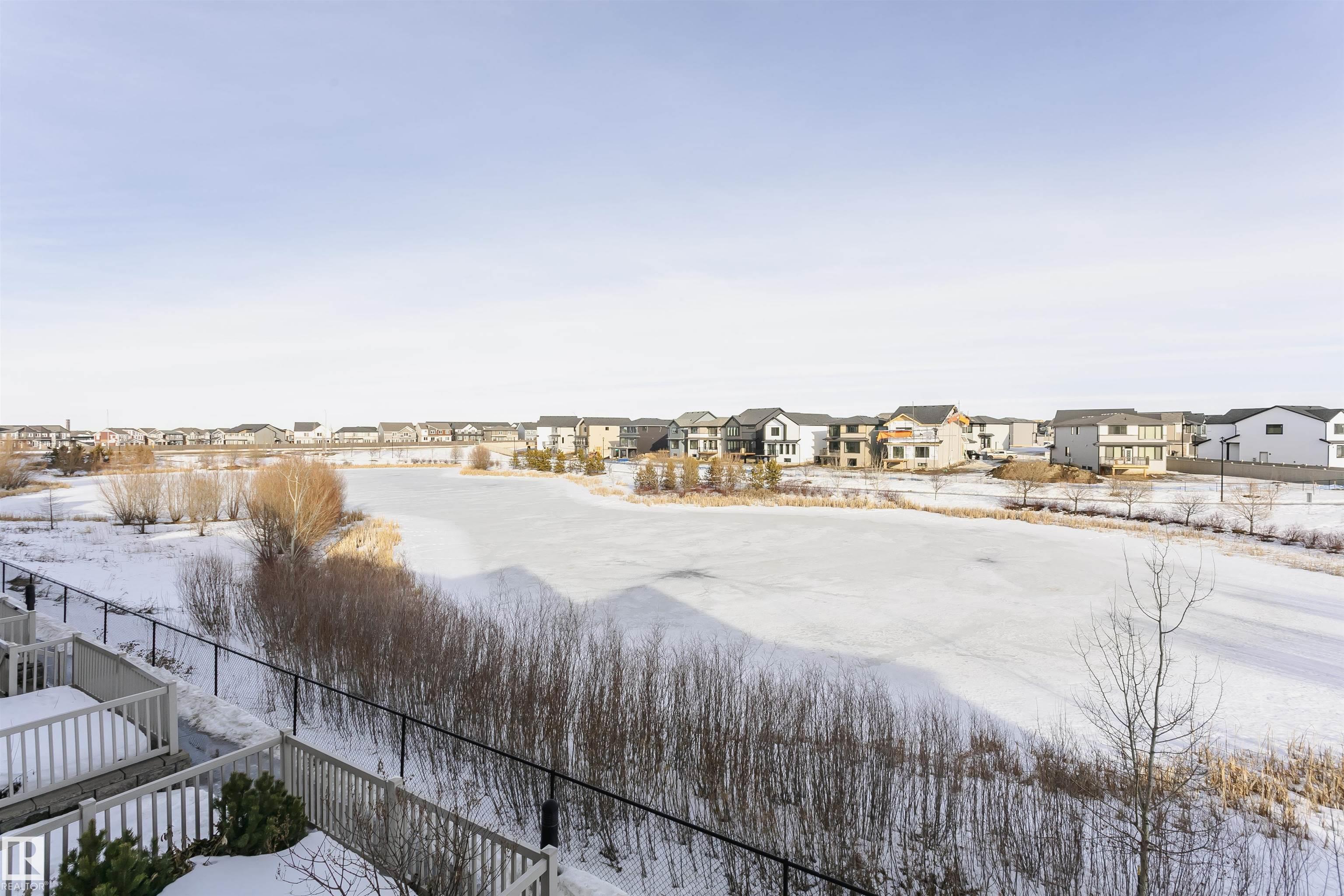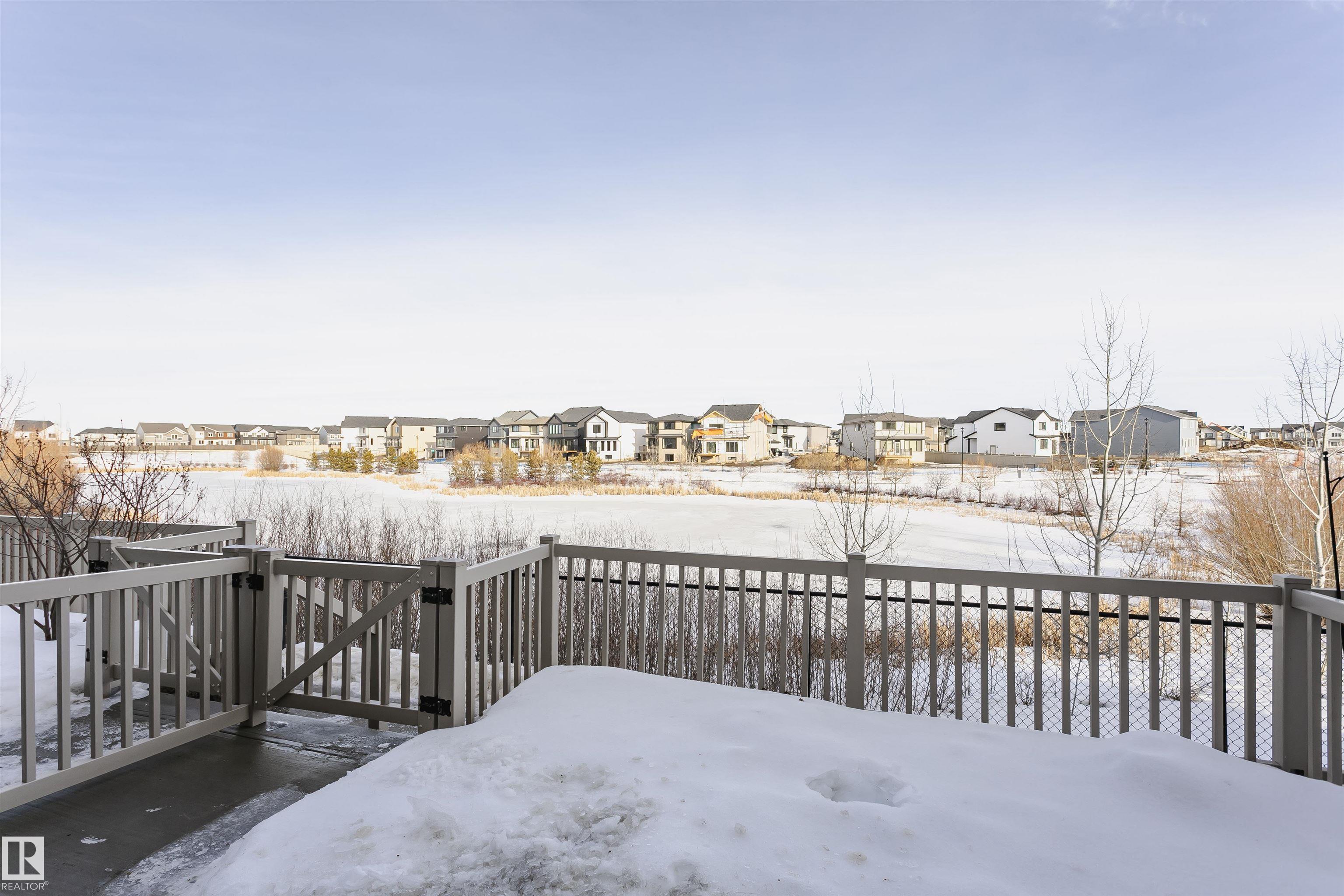 Better than new with breathtaking pond views!! Welcome to this beautiful, immaculately maintained townhouse with 1678 sq/ft of living space. This home offers modern living with 3 bedrooms plus a private den, and a 2-car attached garage. Bright open-concept main floor with living room and access to the balcony, the perfect spot to savor your morning coffee while enjoying the serenity of a pond. Designer dream kitchen with oversized countertops with an eating bar, elegant tile backsplash, upgraded stainless steel appliances and loads of cabinetry. A generous dining area, a convenient powder room completes this level. The primary suite on the upper level has a walk-in closet and a full ensuite, while 2 additional bedrooms, a full bathroom and a laundry room provide plenty of space for the whole family. Ground level offers a welcoming foyer and a flexible den/flex room with incredible views of the pond and direct access to the garage. Front fenced yard is perfect for BBQs with family & friends. Welcome Home!