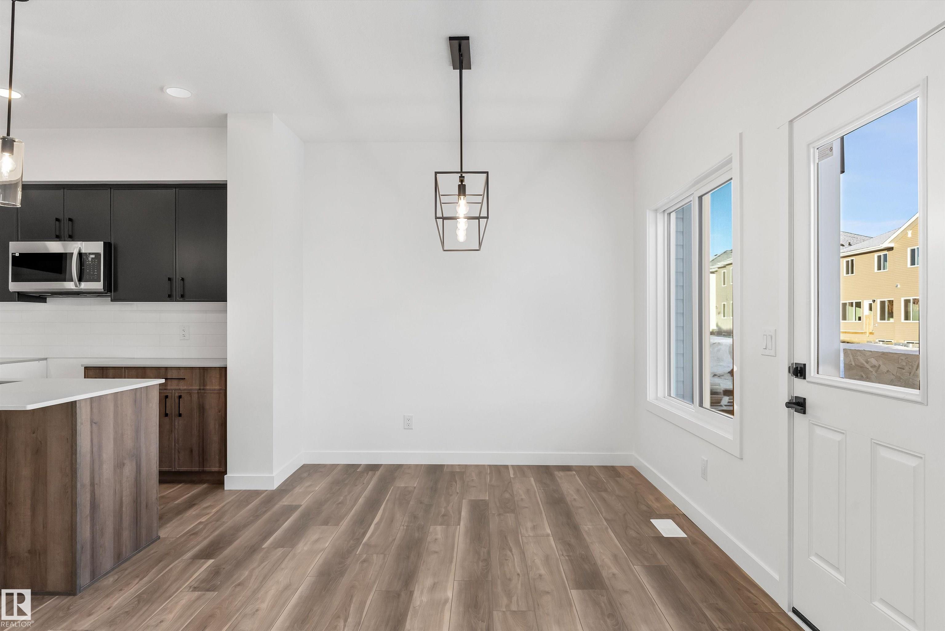 Built by Sterling Homes, this beautifully designed duplex in Aster offers bright, modern living in a Southeast Edmonton community known for its parks, schools, and convenient amenities. Triple pane windows and 9? ceilings fill the open-concept main floor with natural light, while luxury vinyl plank flooring adds warmth and durability. The kitchen features quartz countertops, a central island with seating, upgraded cabinetry, a corner pantry, chimney hood fan, and microwave?perfect for family meals or entertaining. Large windows and a patio door connect dining and living areas to the backyard for seamless indoor-outdoor living. Upstairs, a spacious bonus room provides flexible space for movie nights, play, or a home office. The primary suite includes a walk-in closet and private 3-piece ensuite. Two more bedrooms, a full bath, and laundry complete the level. With a double attached garage, side entrance, upgraded railings, and basement rough-ins, this home blends comfort, function, and style.