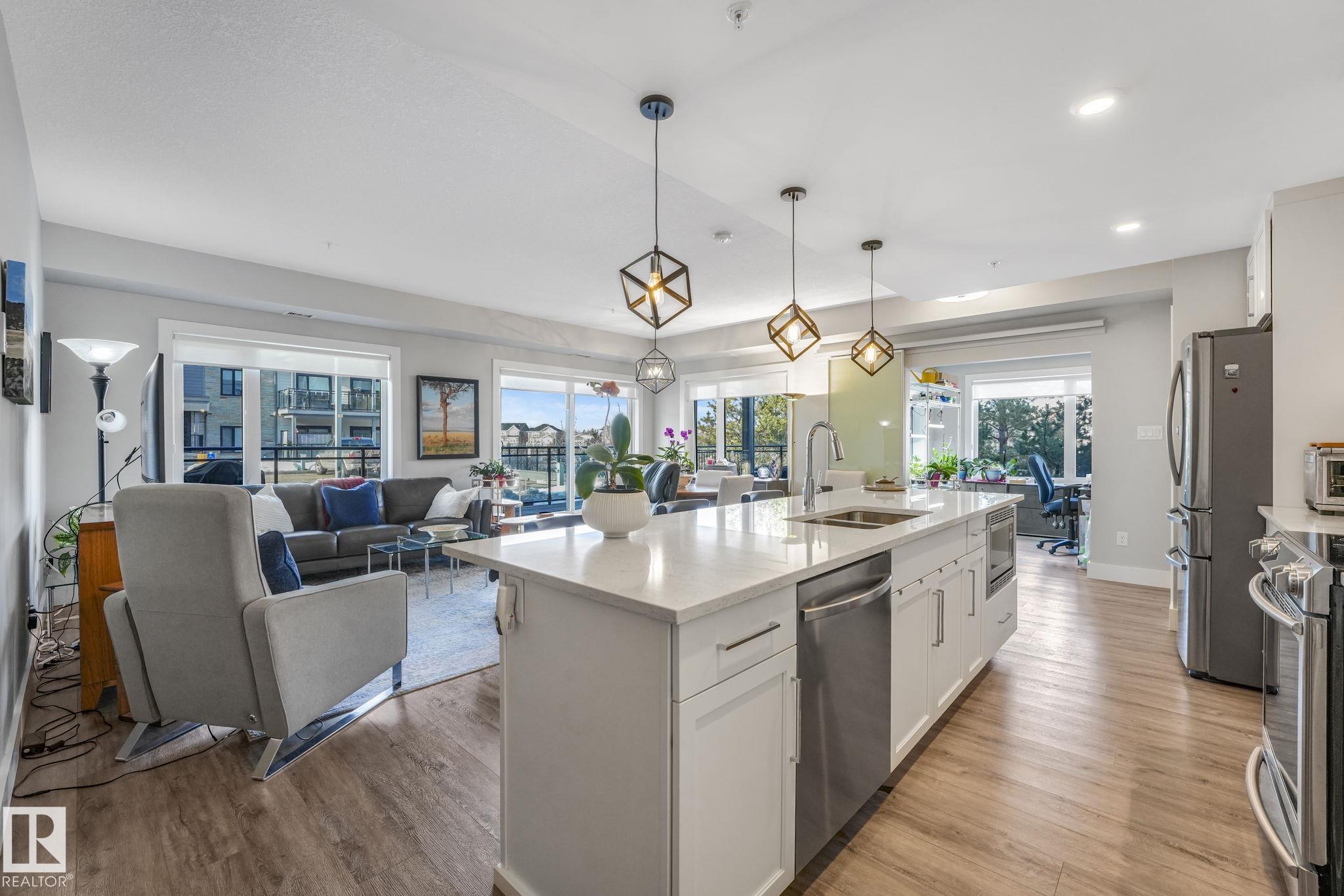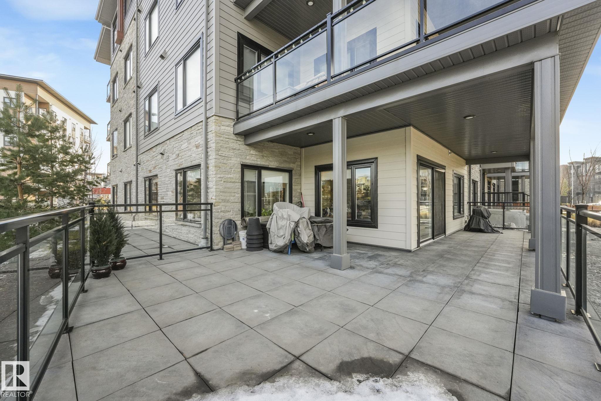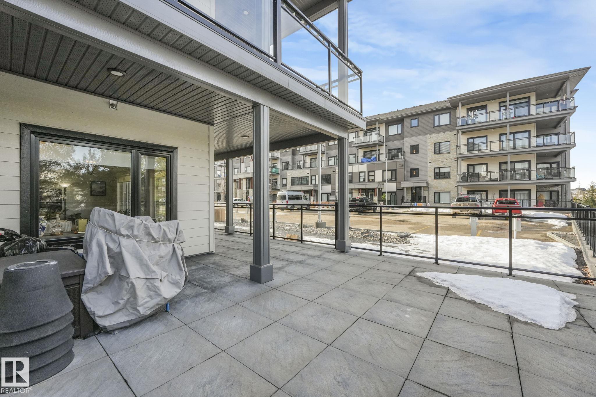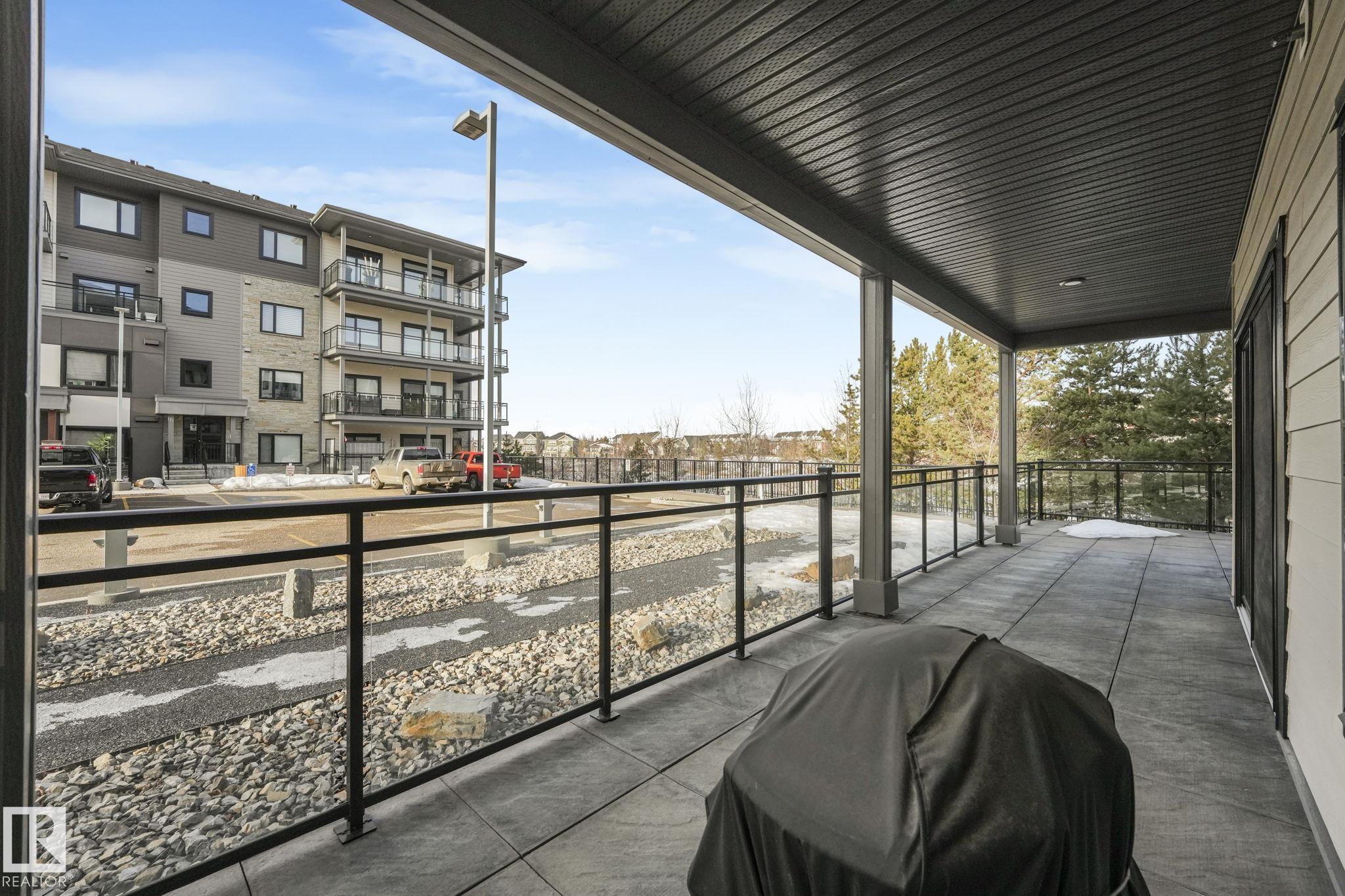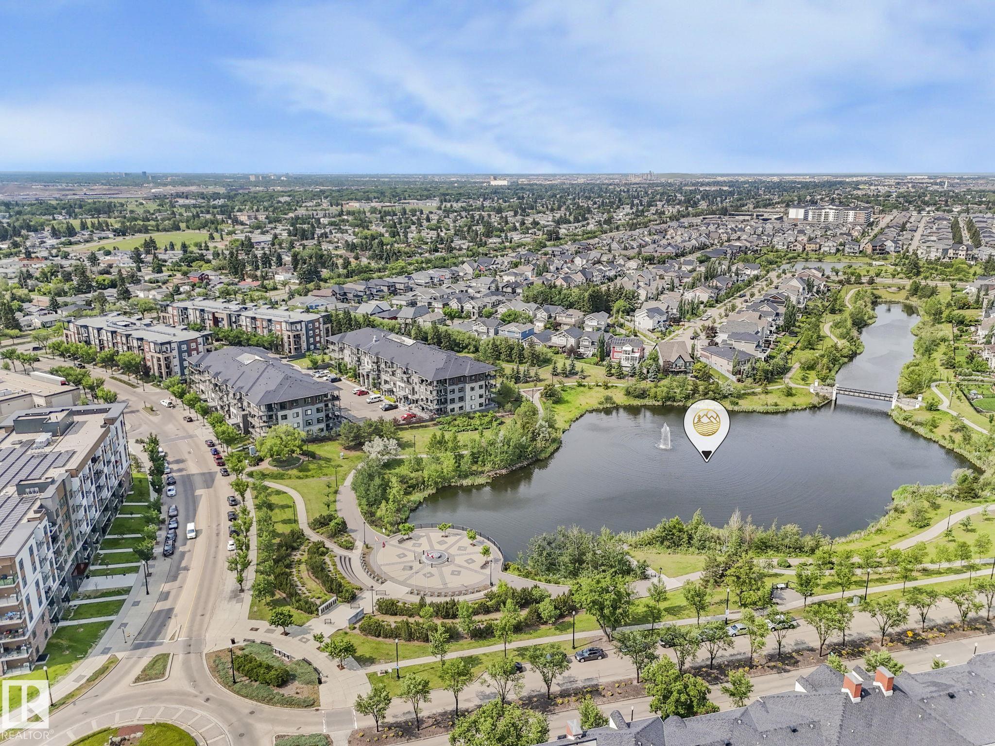 Pristine Original Owner 2 Bed, 2 Bath + Den Condo. Step into Style & Taste! Featuring 1316 sf, 9' Ceilings, Expansive Windows w/Custom Blinds, Kitchen w/Quartz Counter Top, 10' Island, SS Appliances & Crisp White Shaker Cabinets w/ Extended Uppers. The Open Layout is Perfect for Entertaining w/ Seating at the Island, Large Dining Space, Welcoming Living Rm & Huge 545 sf Wrap Around Patio w/West & North Exposures & Gas BBQ line for Year Round Grilling. Thoughtfully Designed w/Spacious Primary Featuring a Gorgeous 4pc. Ensuite & Lg. Walk-In Closet, Functional & Bright Den w/ Lake View & Sliding Privacy Doors, Guest Bed w/its Own Walk-In Closet, Full Size Laundry Rm w/ Quartz Counter-Top & Upper Cabinets. Add'l Upgrades & Features; Closet Organizers, Central A/C & 2 Titled Parking Stalls incl. 1 Underground w/Storage Cage & 1 Surface Right Outside your Patio. One of Edmonton's Premiere Communities Surrounded by Over 5km of Walking Trails, Lakes, Amenities, Shops & Dining. Shows 10/10!