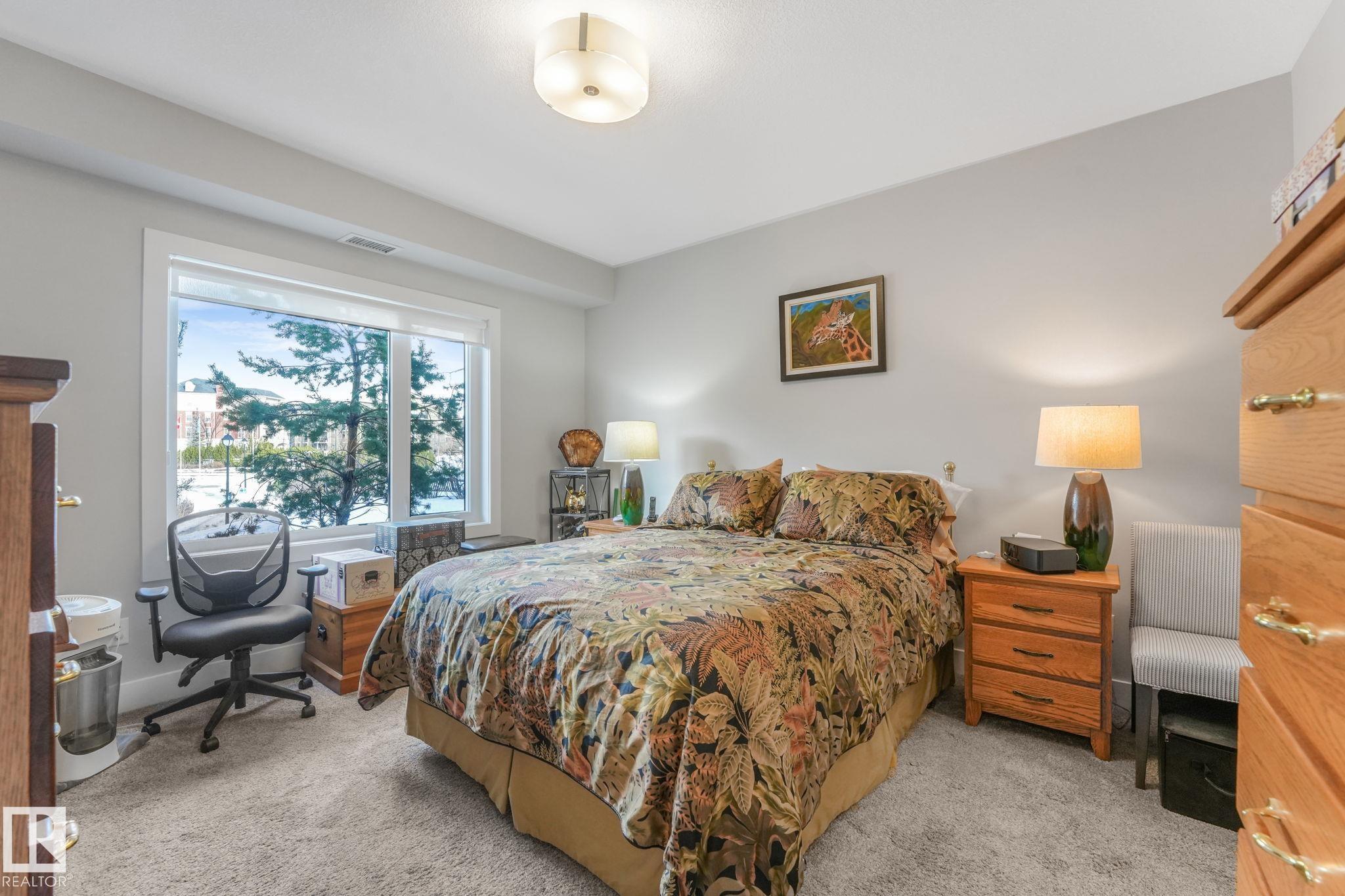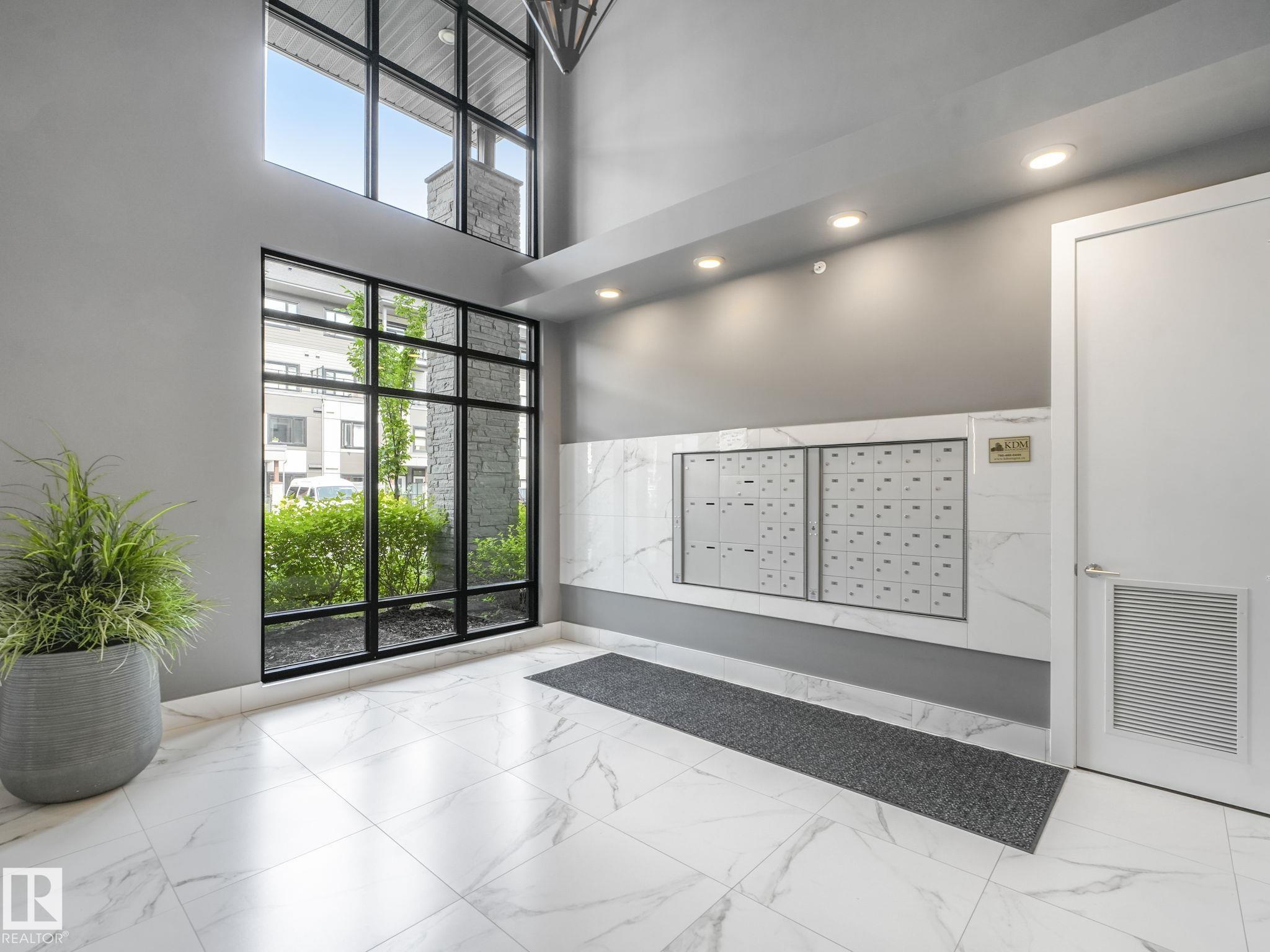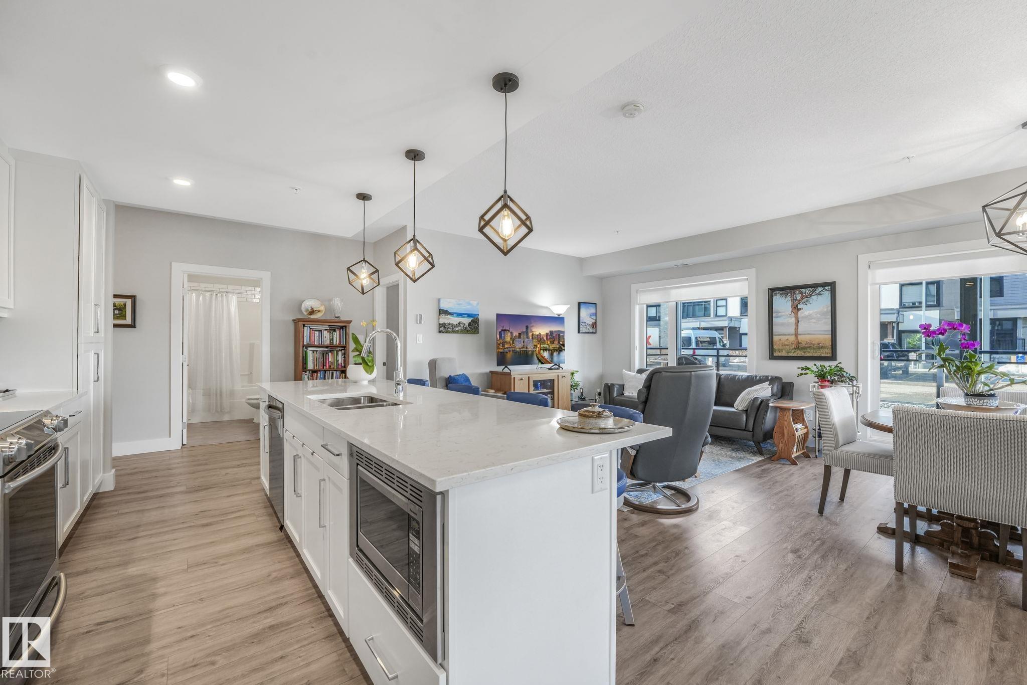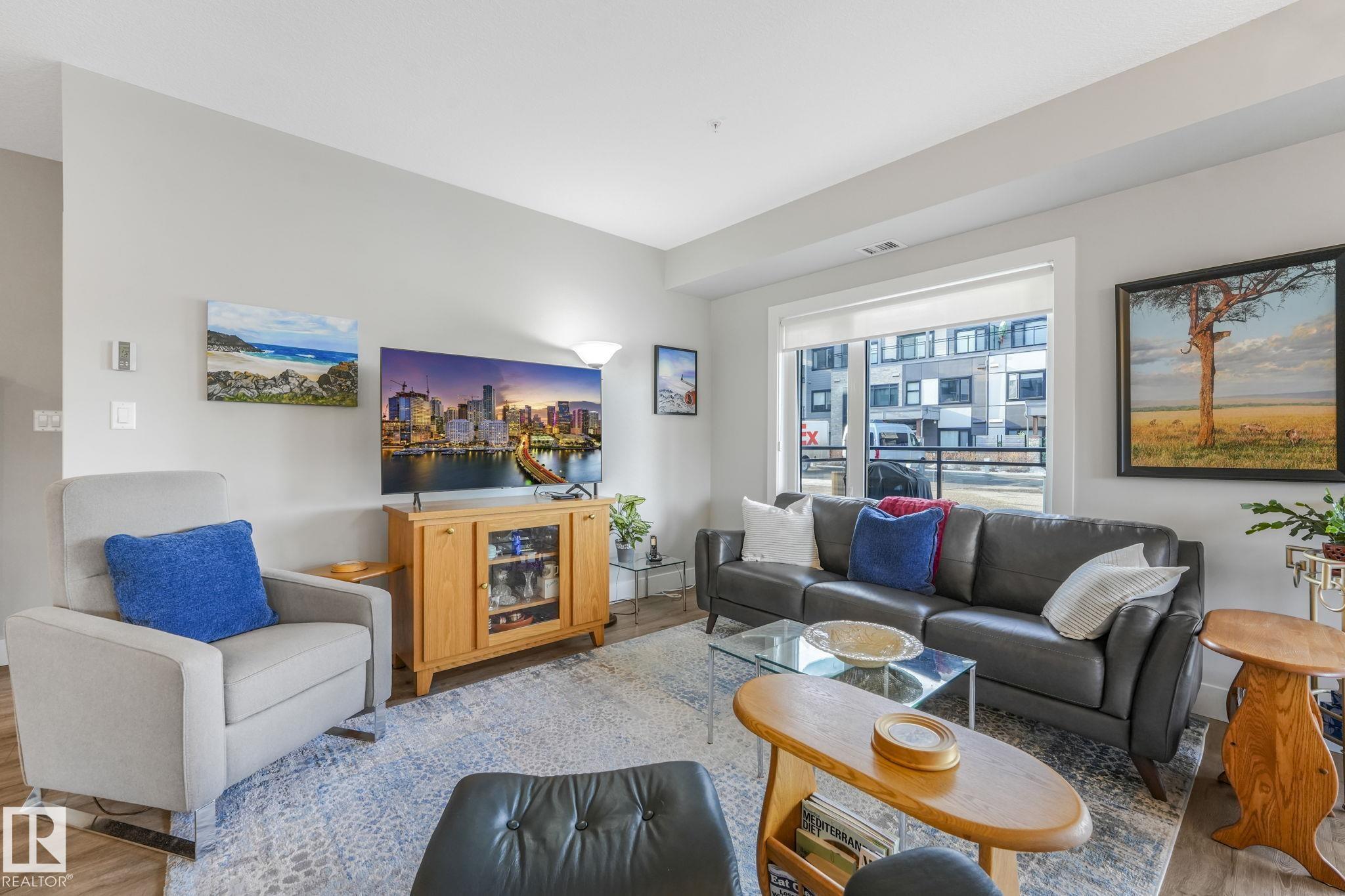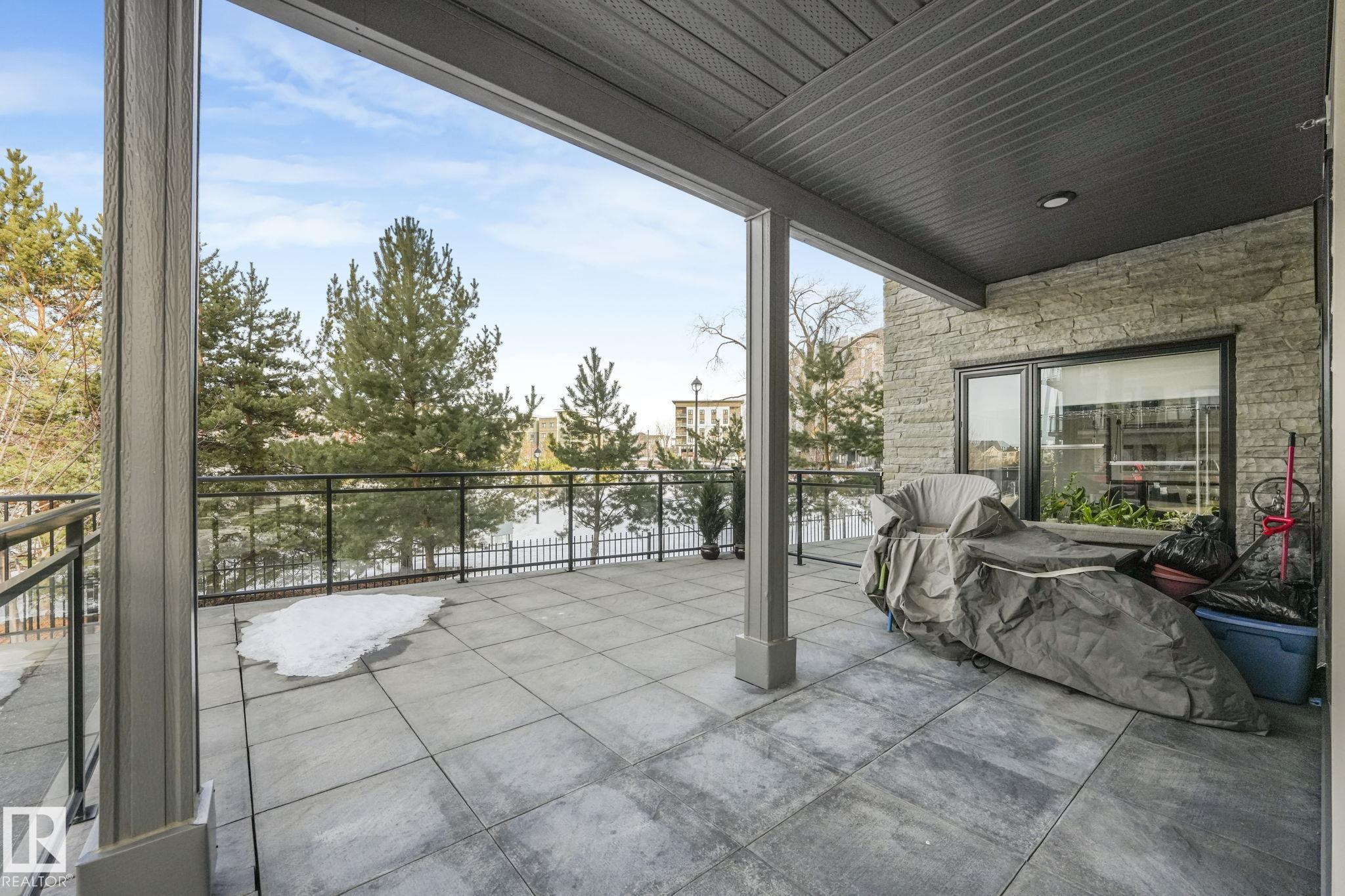Pristine Original Owner 2 Bed, 2 Bath + Den Condo. Step into Style & Taste! Featuring 1316 sf, 9' Ceilings, Expansive Windows w/Custom Blinds, Kitchen w/Quartz Counter Top, 10' Island, SS Appliances & Crisp White Shaker Cabinets w/ Extended Uppers. The Open Layout is Perfect for Entertaining w/ Seating at the Island, Large Dining Space, Welcoming Living Rm & Huge 545 sf Wrap Around Patio w/West & North Exposures & Gas BBQ line for Year Round Grilling. Thoughtfully Designed w/Spacious Primary Featuring a Gorgeous 4pc. Ensuite & Lg. Walk-In Closet, Functional & Bright Den w/ Lake View & Sliding Privacy Doors, Guest Bed w/its Own Walk-In Closet, Full Size Laundry Rm w/ Quartz Counter-Top & Upper Cabinets. Add'l Upgrades & Features; Closet Organizers, Central A/C & 2 Titled Parking Stalls incl. 1 Underground w/Storage Cage & 1 Surface Right Outside your Patio. One of Edmonton's Premiere Communities Surrounded by Over 5km of Walking Trails, Lakes, Amenities, Shops & Dining. Shows 10/10!