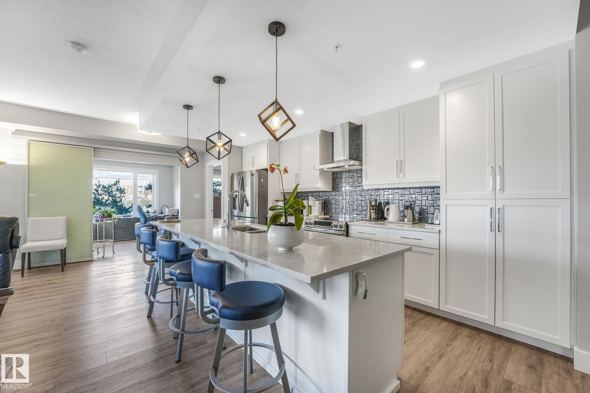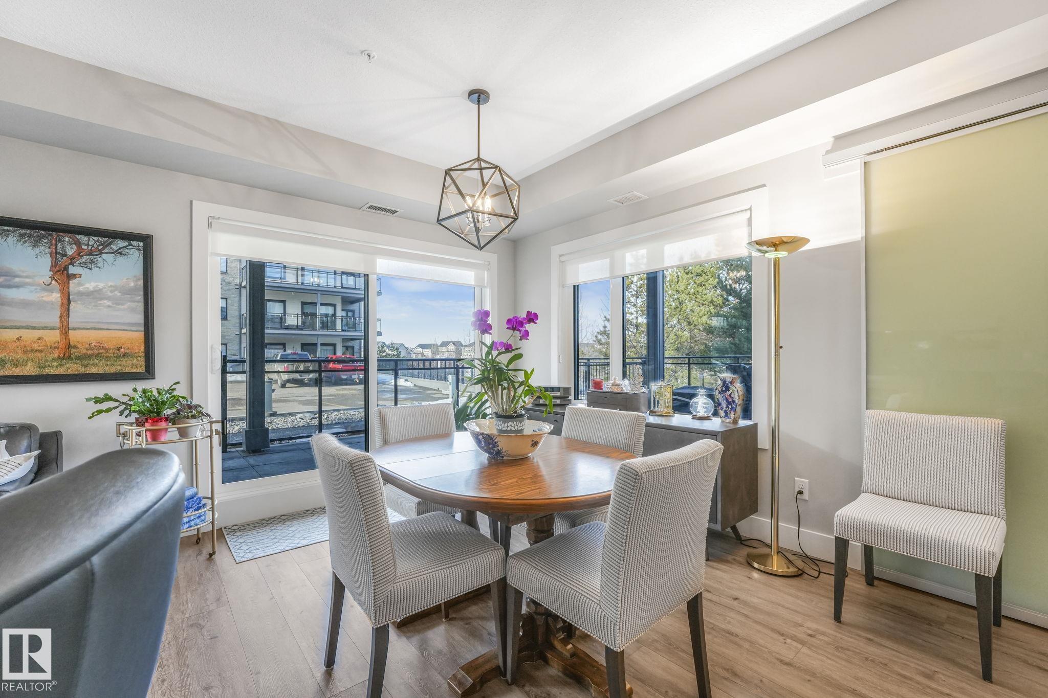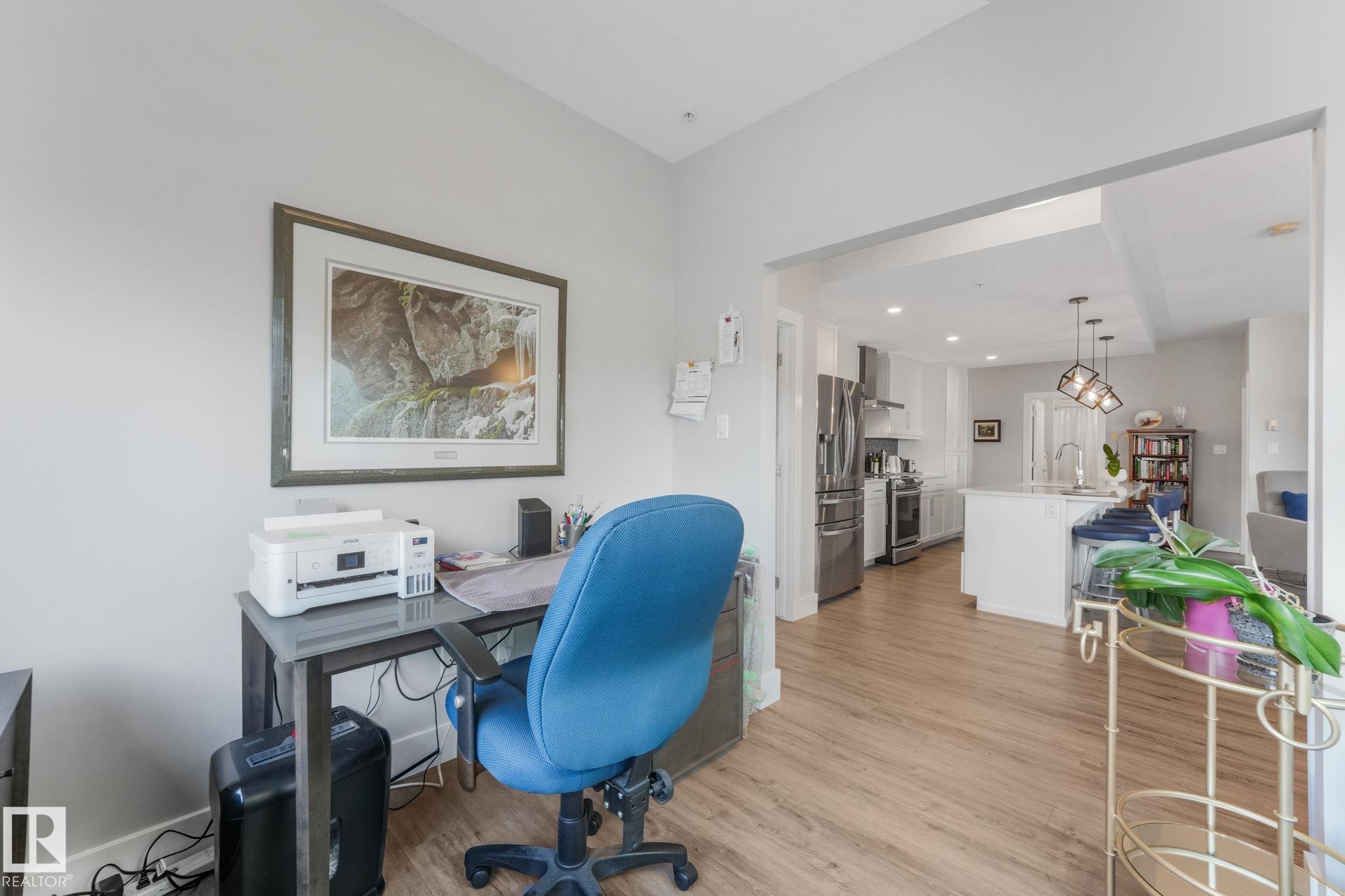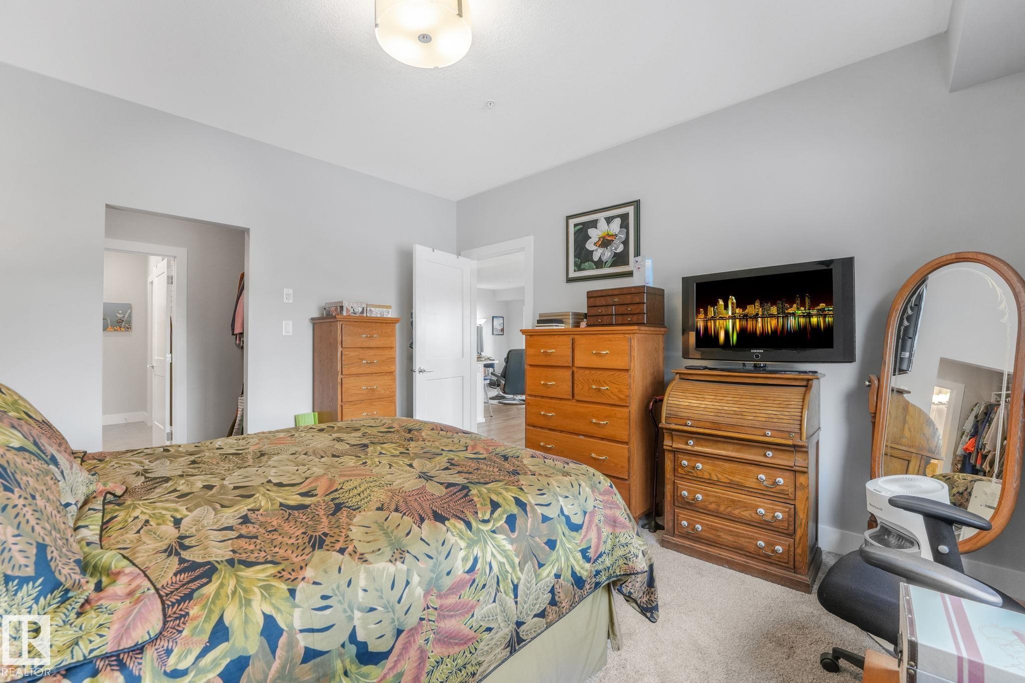 Pristine Original Owner 2 Bed, 2 Bath + Den Condo. Step into Style & Taste! Featuring 1316 sf, 9' Ceilings, Expansive Windows w/Custom Blinds, Kitchen w/Quartz Counter Top, 10' Island, SS Appliances & Crisp White Shaker Cabinets w/ Extended Uppers. The Open Layout is Perfect for Entertaining w/ Seating at the Island, Large Dining Space, Welcoming Living Rm & Huge 545 sf Wrap Around Patio w/West & North Exposures & Gas BBQ line for Year Round Grilling. Thoughtfully Designed w/Spacious Primary Featuring a Gorgeous 4pc. Ensuite & Lg. Walk-In Closet, Functional & Bright Den w/ Lake View & Sliding Privacy Doors, Guest Bed w/its Own Walk-In Closet, Full Size Laundry Rm w/ Quartz Counter-Top & Upper Cabinets. Add'l Upgrades & Features; Closet Organizers, Central A/C & 2 Titled Parking Stalls incl. 1 Underground w/Storage Cage & 1 Surface Right Outside your Patio. One of Edmonton's Premiere Communities Surrounded by Over 5km of Walking Trails, Lakes, Amenities, Shops & Dining. Shows 10/10!