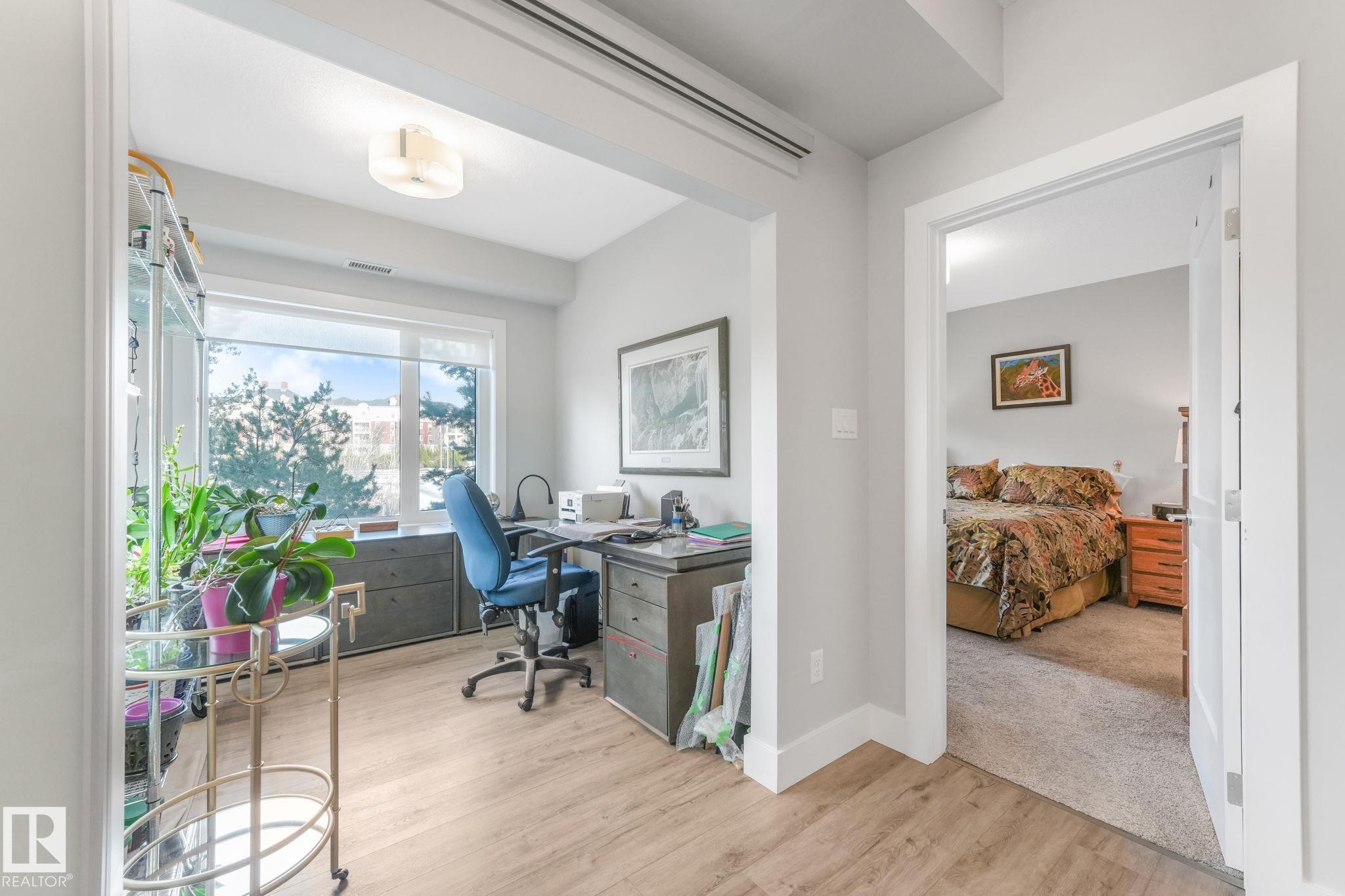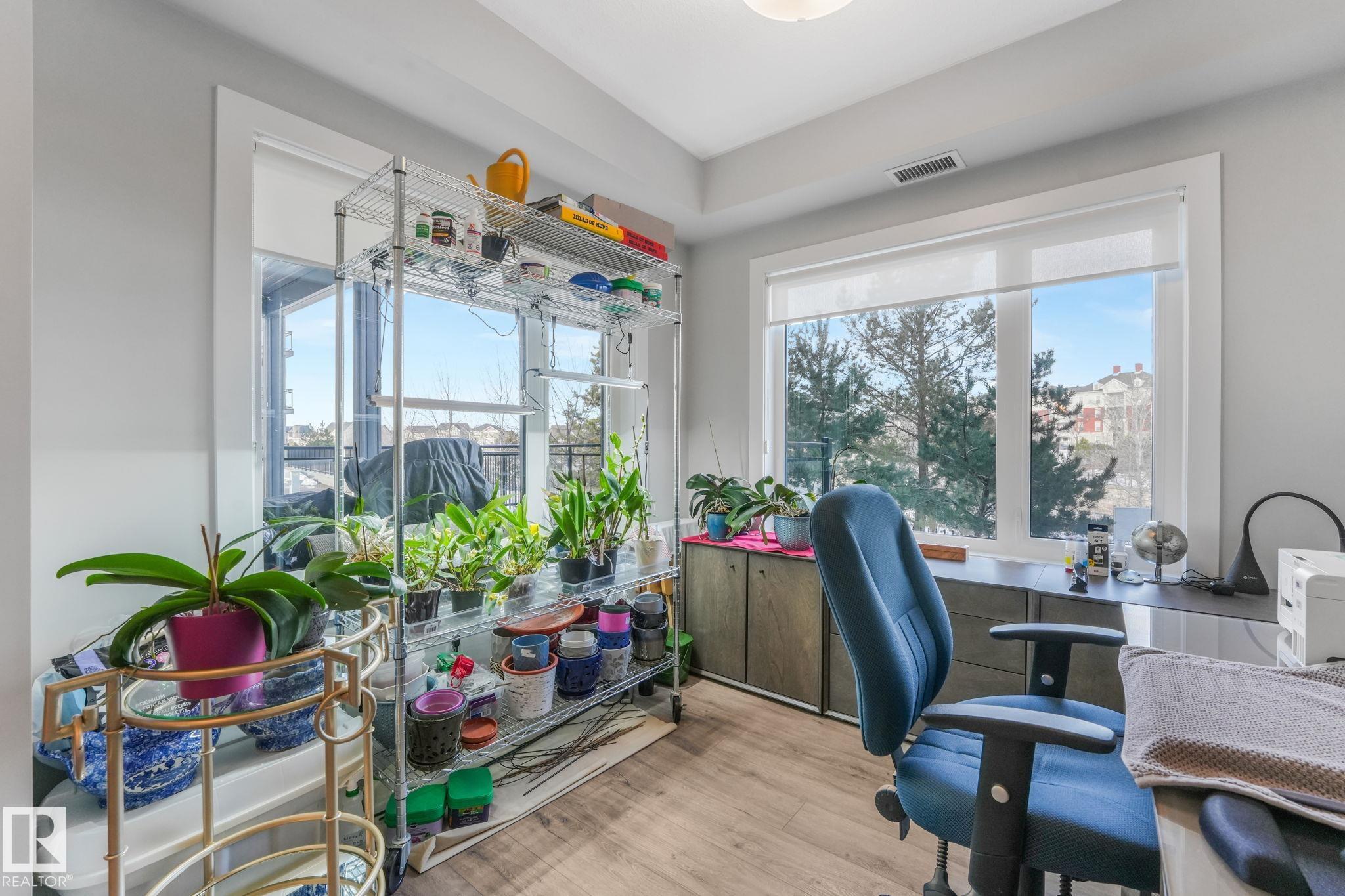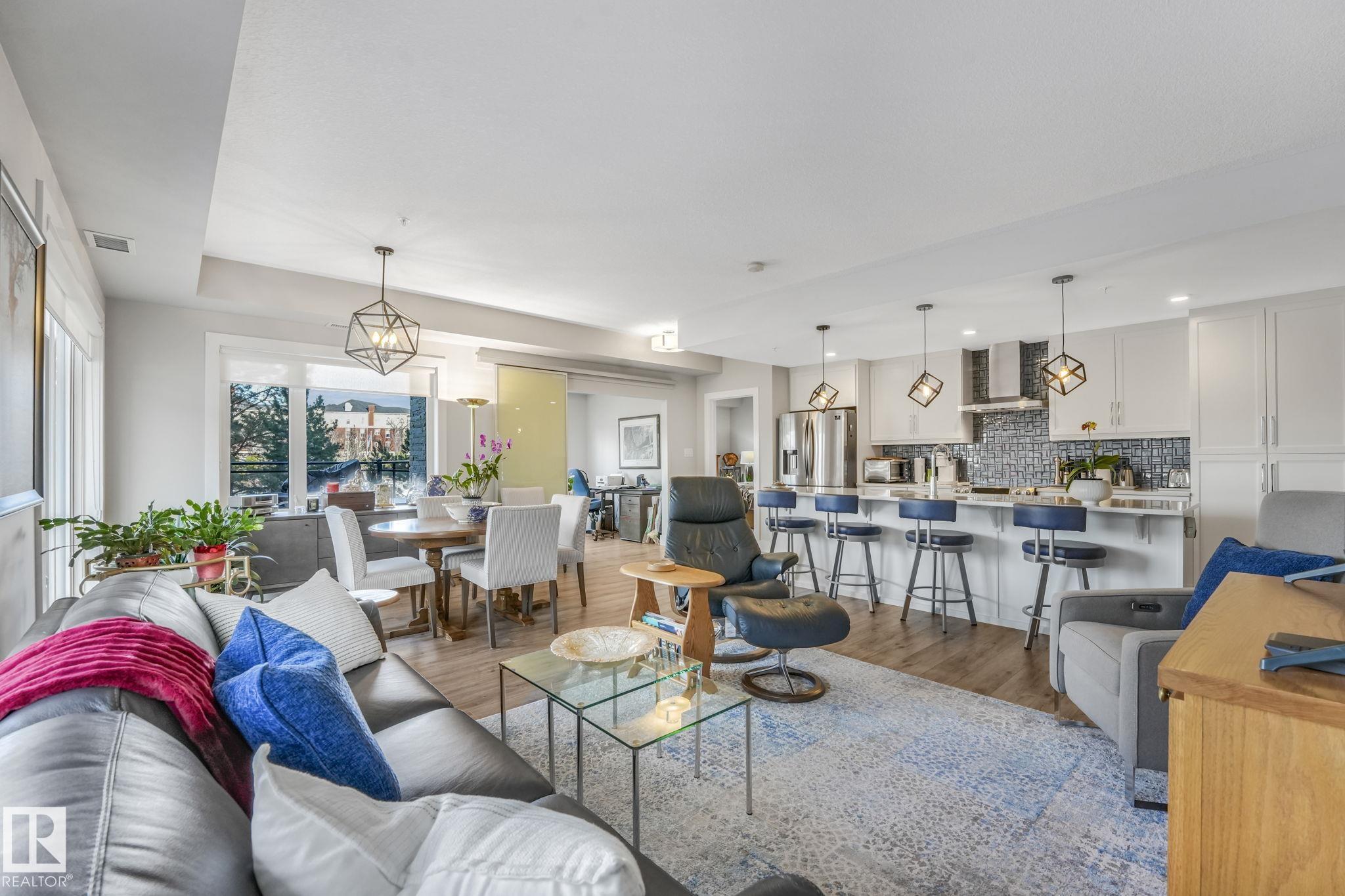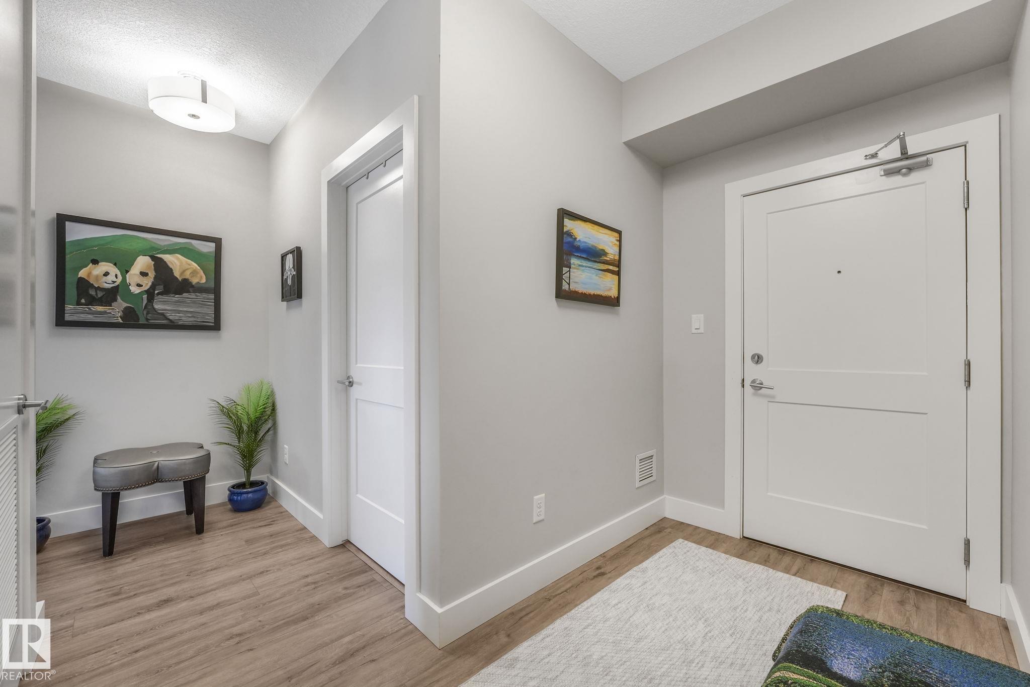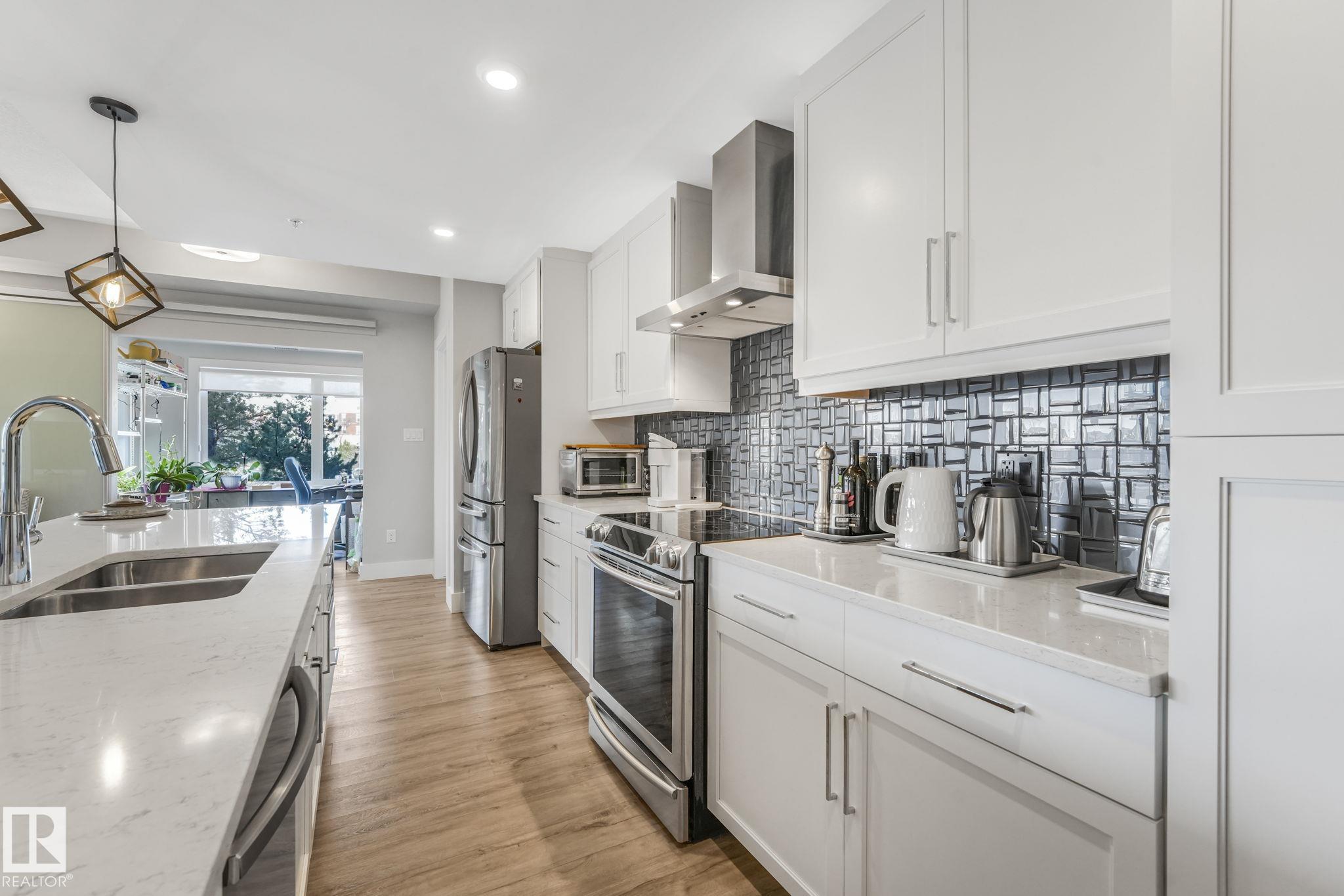 Pristine Original Owner 2 Bed, 2 Bath + Den Condo. Step into Style & Taste! Featuring 1316 sf, 9' Ceilings, Expansive Windows w/Custom Blinds, Kitchen w/Quartz Counter Top, 10' Island, SS Appliances & Crisp White Shaker Cabinets w/ Extended Uppers. The Open Layout is Perfect for Entertaining w/ Seating at the Island, Large Dining Space, Welcoming Living Rm & Huge 545 sf Wrap Around Patio w/West & North Exposures & Gas BBQ line for Year Round Grilling. Thoughtfully Designed w/Spacious Primary Featuring a Gorgeous 4pc. Ensuite & Lg. Walk-In Closet, Functional & Bright Den w/ Lake View & Sliding Privacy Doors, Guest Bed w/its Own Walk-In Closet, Full Size Laundry Rm w/ Quartz Counter-Top & Upper Cabinets. Add'l Upgrades & Features; Closet Organizers, Central A/C & 2 Titled Parking Stalls incl. 1 Underground w/Storage Cage & 1 Surface Right Outside your Patio. One of Edmonton's Premiere Communities Surrounded by Over 5km of Walking Trails, Lakes, Amenities, Shops & Dining. Shows 10/10!