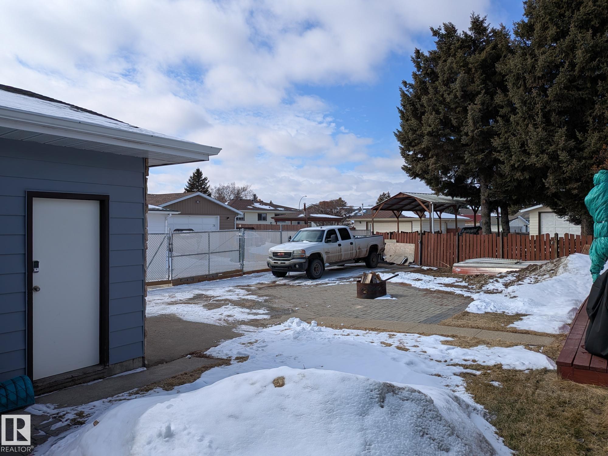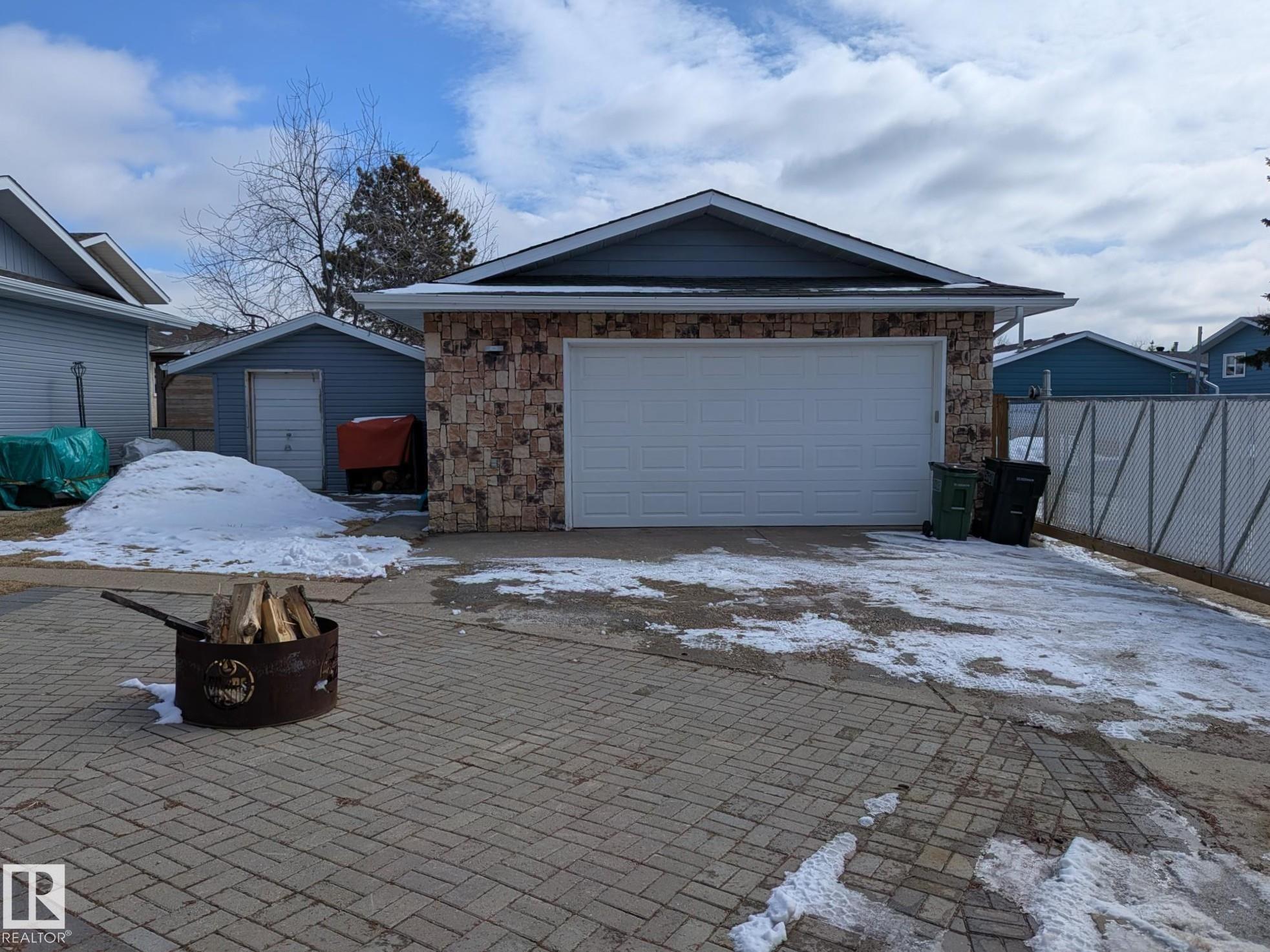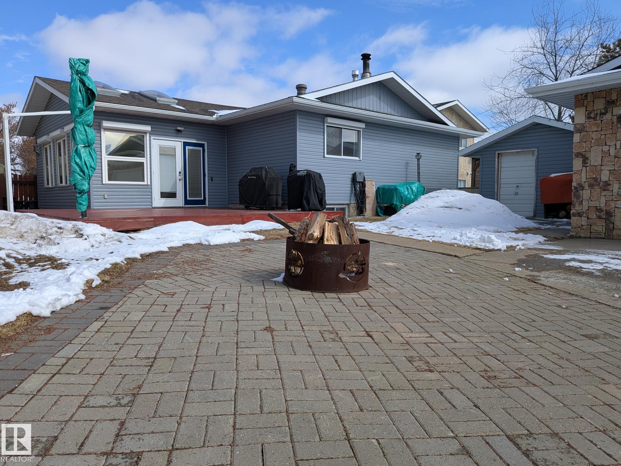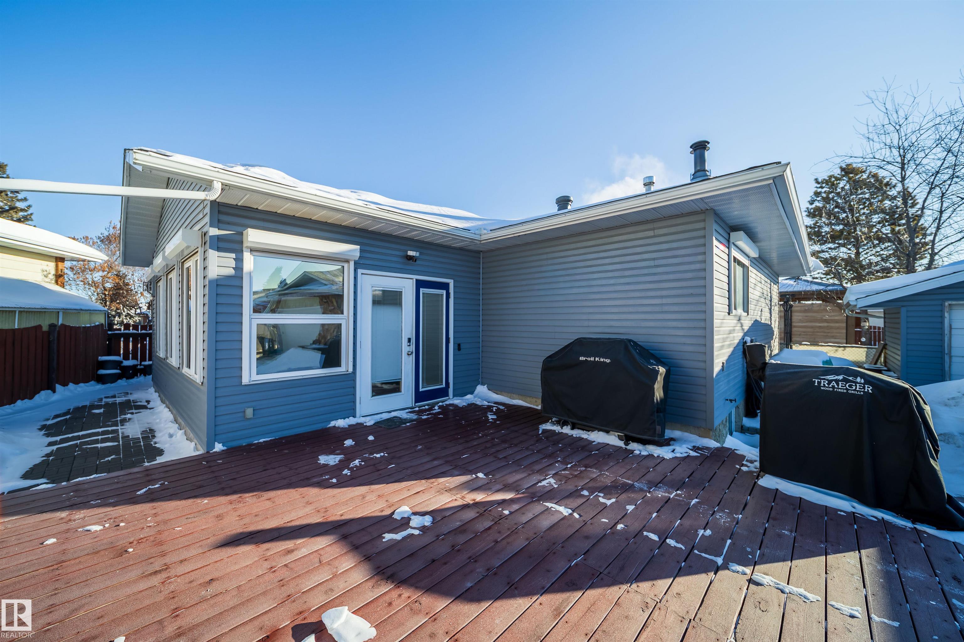 This 4 BED, 3 BATH BUNGALOW is on a quiet street, has OVER 2500 SqFt of living space and a LARGE BACK YARD! Walking distance to MENISA Elementary and Park. The spacious living room is cozy with a gas fireplace and large bay window. Tons of oak cabinets, counter space and quality GE + BOSCH appliances in the kitchen, plus a breakfast nook and formal dining room. The ALL-SEASON SUNROOM is bright with tons of windows and skylights, and warmed by another gas fireplace. 3 generous bedrooms upstairs, with built-in closets, and the primary with 2pc ensuite bath. A huge recreation room downstairs with wood fireplace, 4th bedroom, bath with large shower, laundry room, tons of storage and potential for 5TH BEDROOM. The SOUTH FACING BACKYARD is perfect for entertaining with a large deck, patio stone and firepit. RV parking and a O/S DBL DETACHED HEATED GARAGE, plus storage shed. Upgrades include a newer roof, deck, A/C, privacy windows and roll shutters. Close to parks and schools and easy access to Anthony Henday.