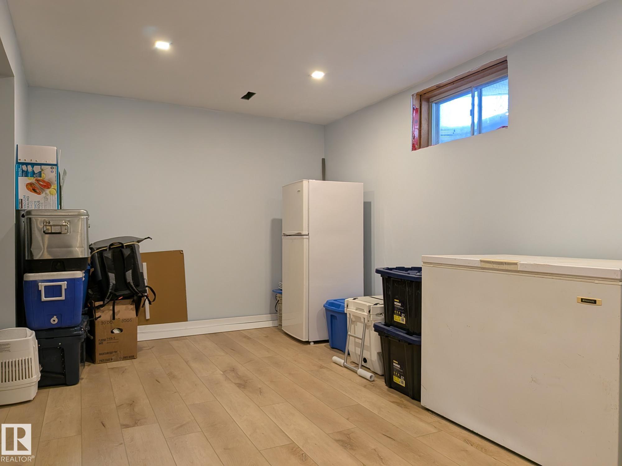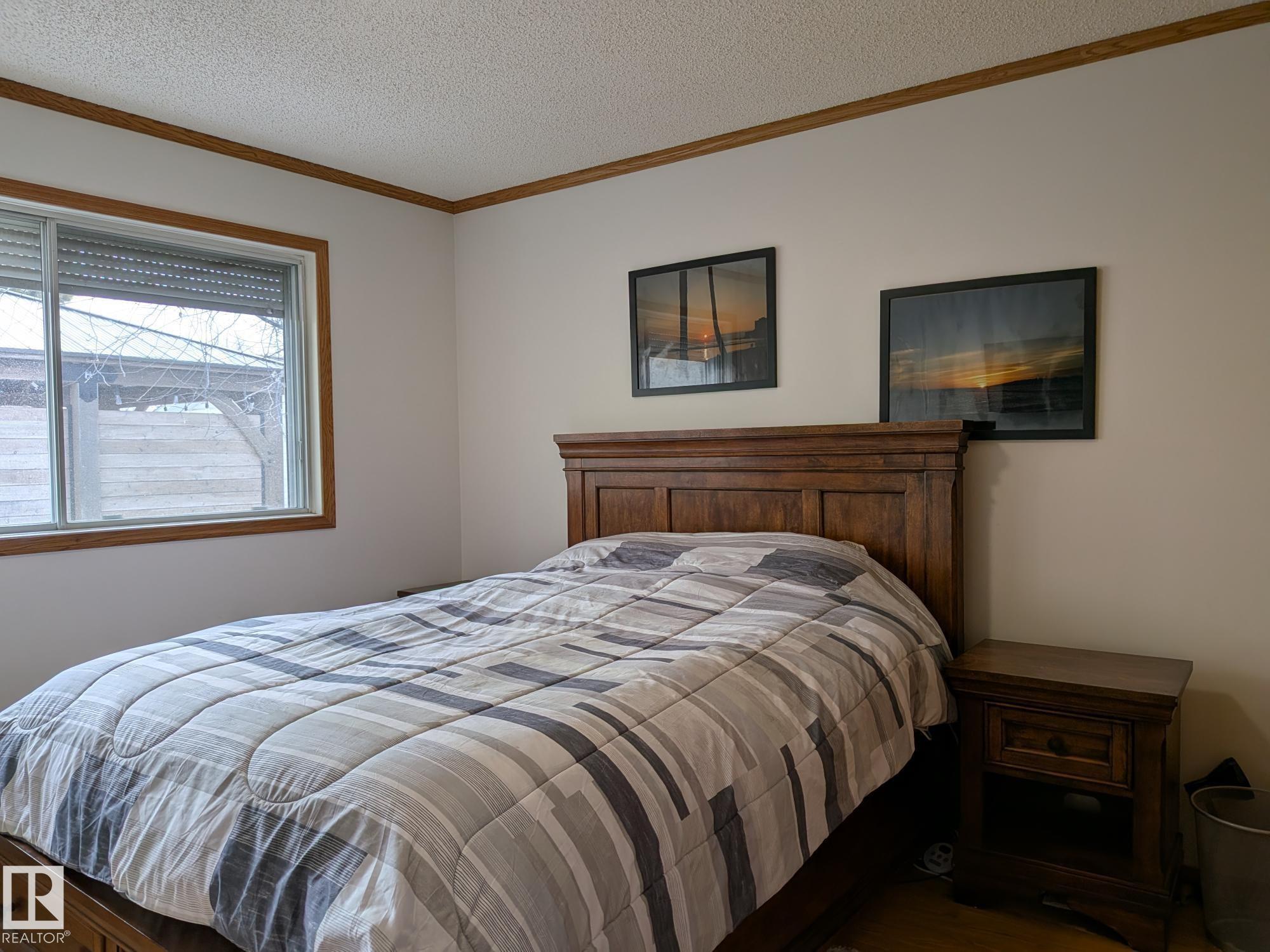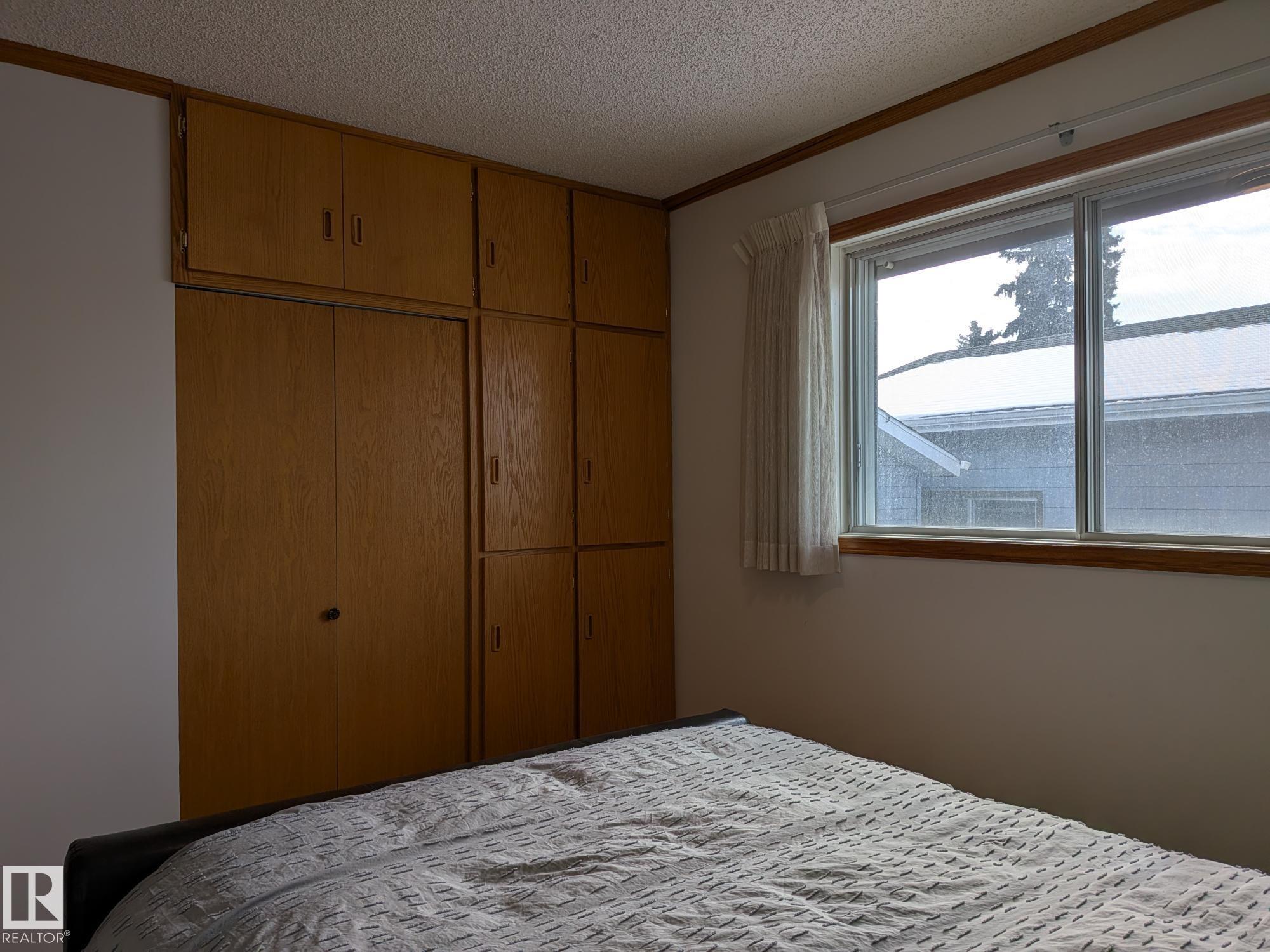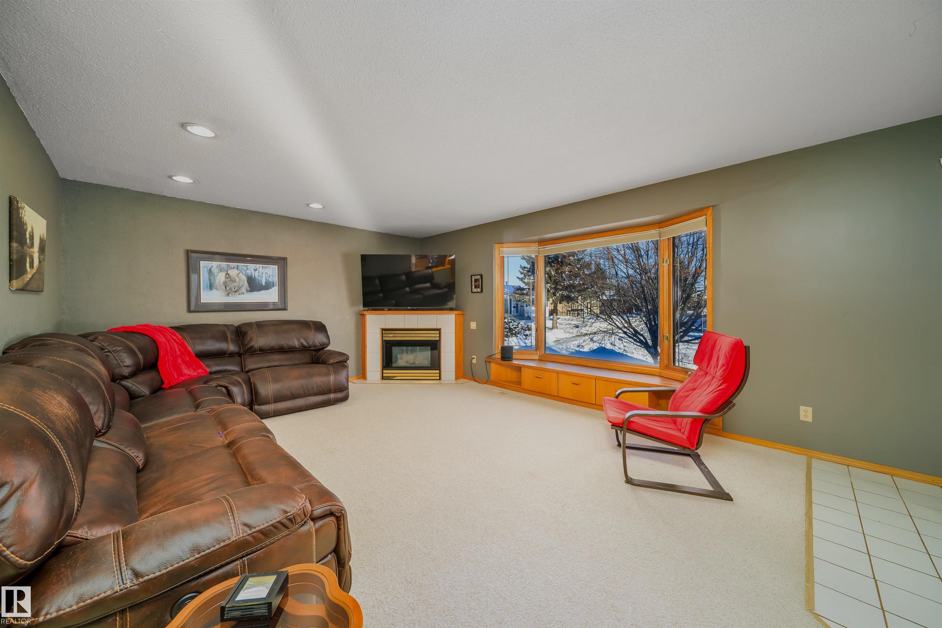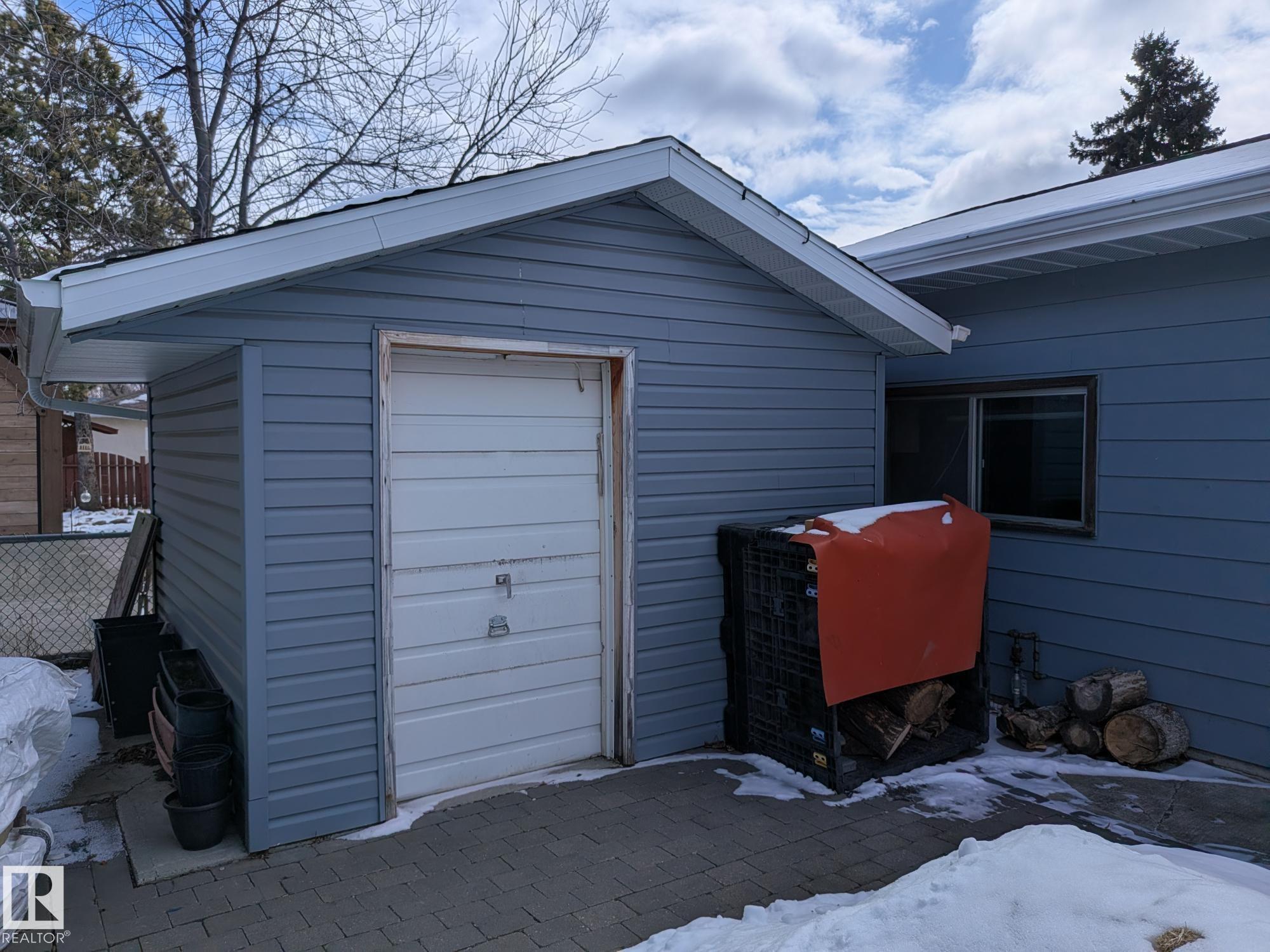 This 4 BED, 3 BATH BUNGALOW is on a quiet street, has OVER 2500 SqFt of living space and a LARGE BACK YARD! Walking distance to MENISA Elementary and Park. The spacious living room is cozy with a gas fireplace and large bay window. Tons of oak cabinets, counter space and quality GE + BOSCH appliances in the kitchen, plus a breakfast nook and formal dining room. The ALL-SEASON SUNROOM is bright with tons of windows and skylights, and warmed by another gas fireplace. 3 generous bedrooms upstairs, with built-in closets, and the primary with 2pc ensuite bath. A huge recreation room downstairs with wood fireplace, 4th bedroom, bath with large shower, laundry room, tons of storage and potential for 5TH BEDROOM. The SOUTH FACING BACKYARD is perfect for entertaining with a large deck, patio stone and firepit. RV parking and a O/S DBL DETACHED HEATED GARAGE, plus storage shed. Upgrades include a newer roof, deck, A/C, privacy windows and roll shutters. Close to parks and schools and easy access to Anthony Henday.