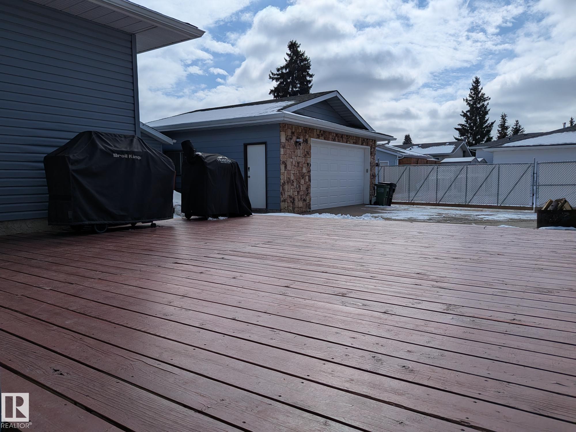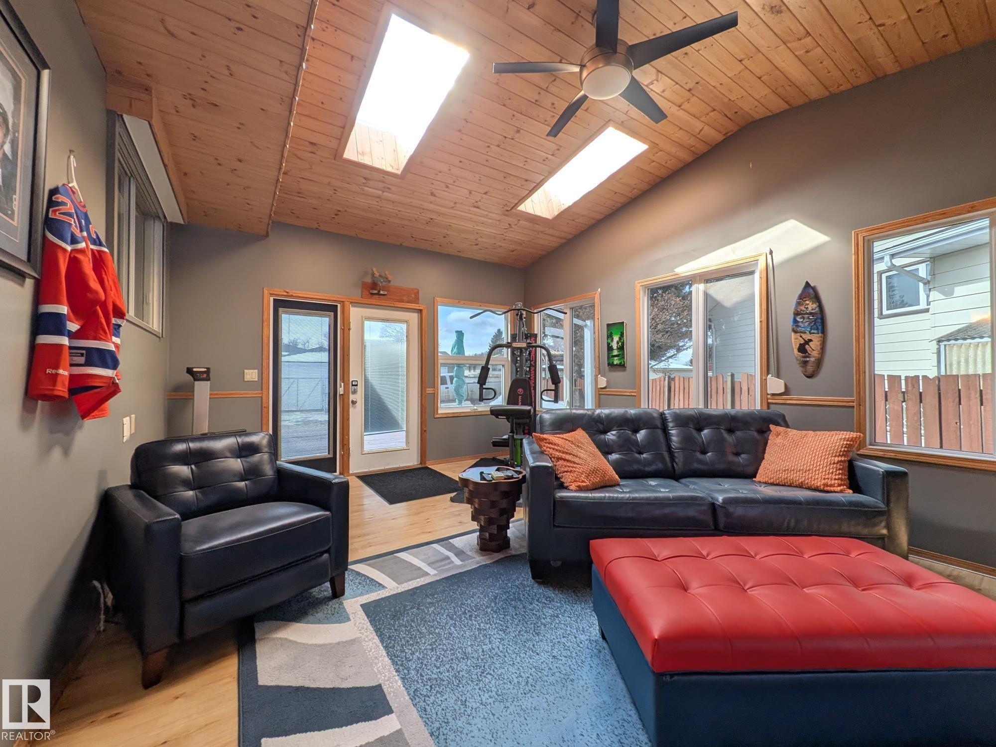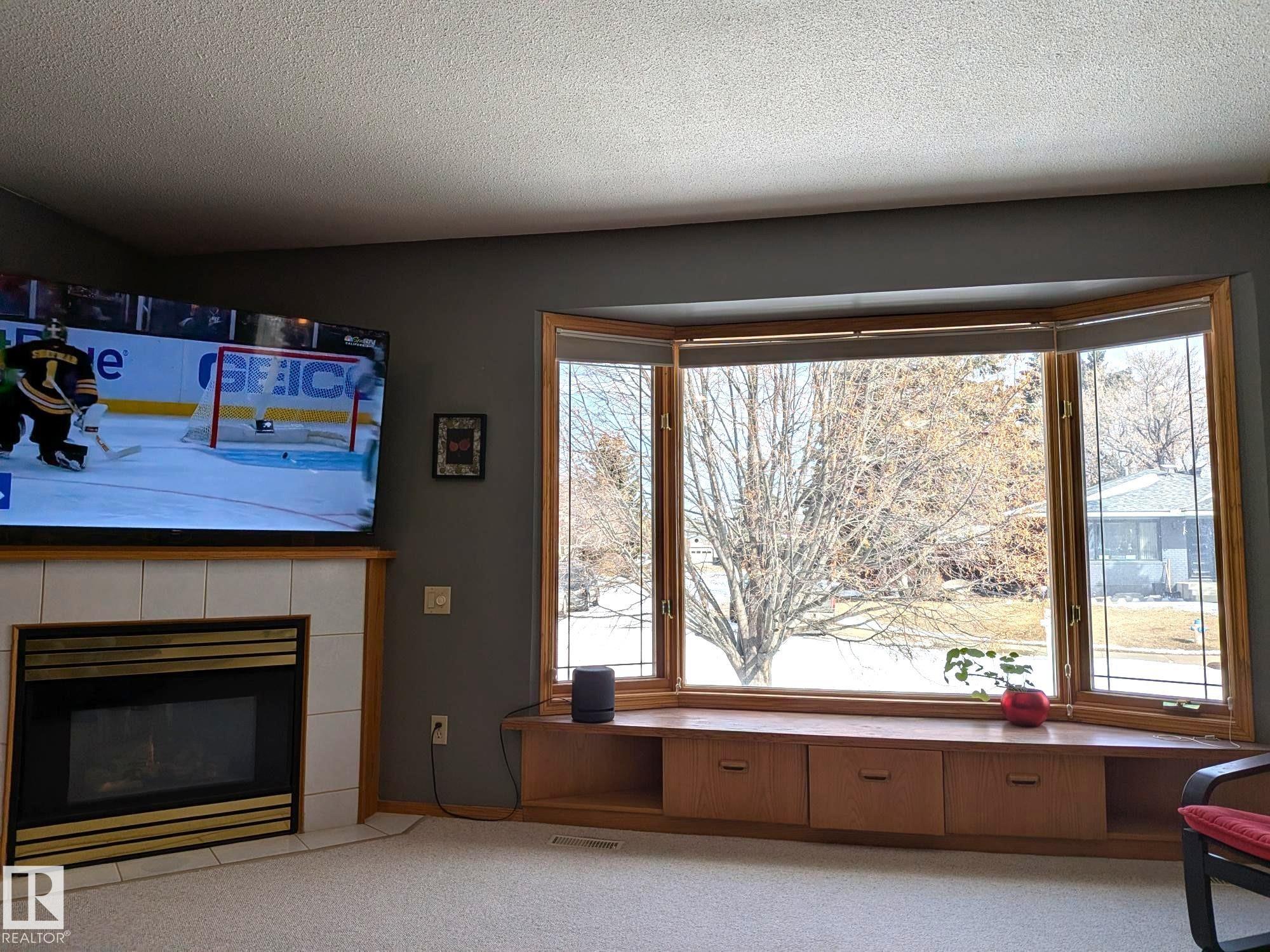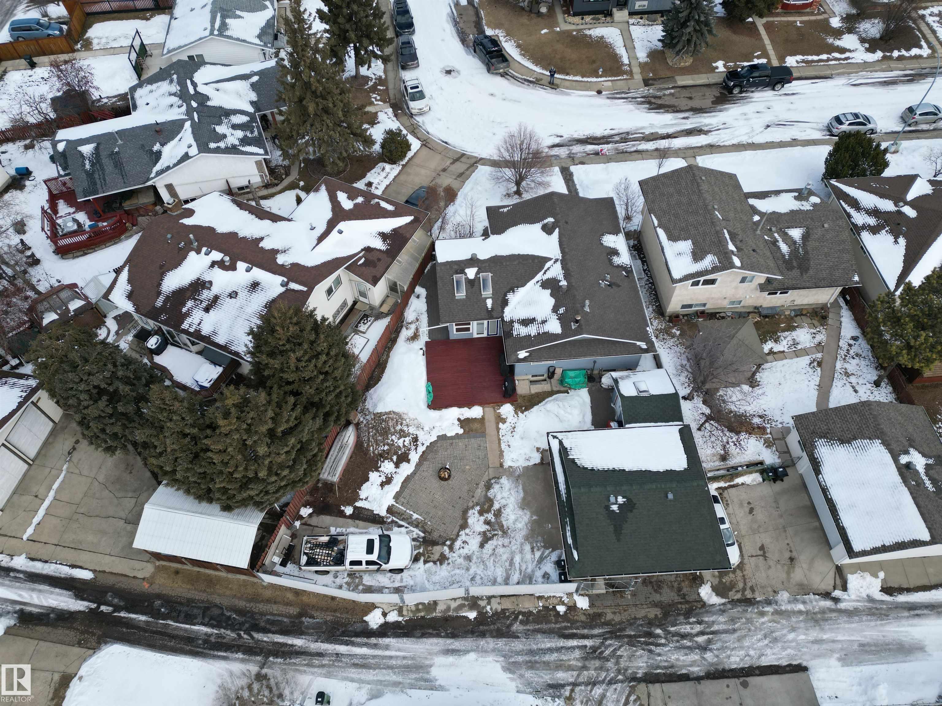 This 4 BED, 3 BATH BUNGALOW is on a quiet street, has OVER 2500 SqFt of living space and a LARGE BACK YARD! Walking distance to MENISA Elementary and Park. The spacious living room is cozy with a gas fireplace and large bay window. Tons of oak cabinets, counter space and quality GE + BOSCH appliances in the kitchen, plus a breakfast nook and formal dining room. The ALL-SEASON SUNROOM is bright with tons of windows and skylights, and warmed by another gas fireplace. 3 generous bedrooms upstairs, with built-in closets, and the primary with 2pc ensuite bath. A huge recreation room downstairs with wood fireplace, 4th bedroom, bath with large shower, laundry room, tons of storage and potential for 5TH BEDROOM. The SOUTH FACING BACKYARD is perfect for entertaining with a large deck, patio stone and firepit. RV parking and a O/S DBL DETACHED HEATED GARAGE, plus storage shed. Upgrades include a newer roof, deck, A/C, privacy windows and roll shutters. Close to parks and schools and easy access to Anthony Henday.