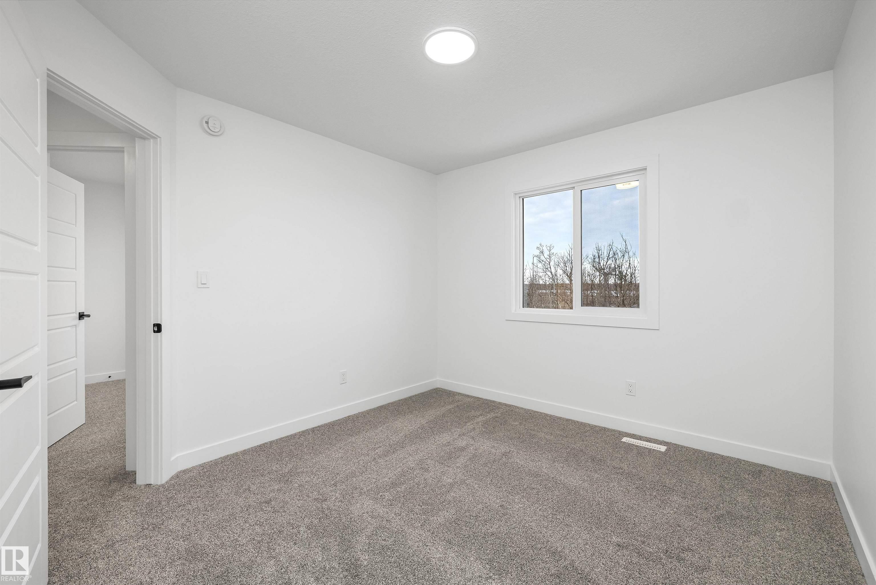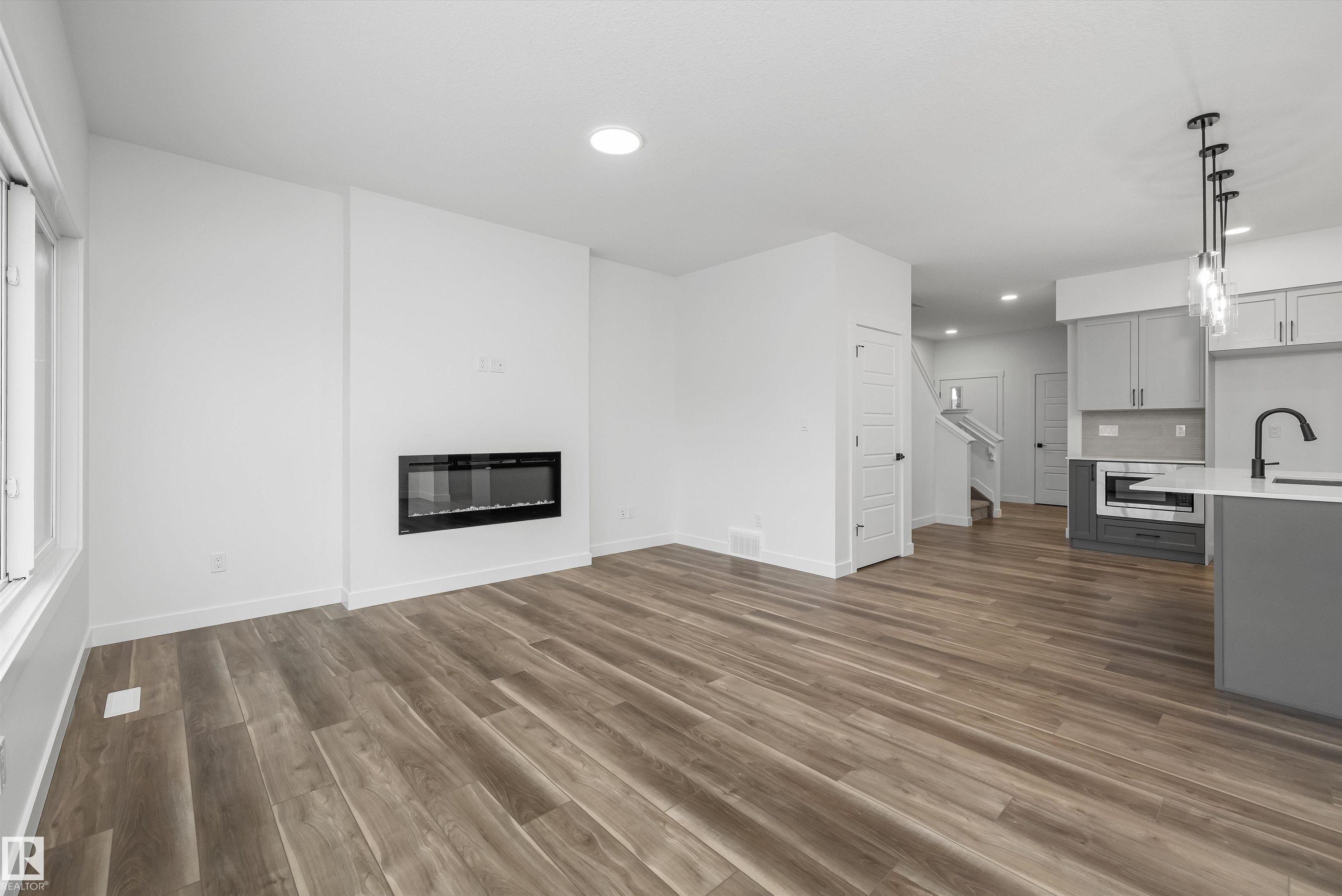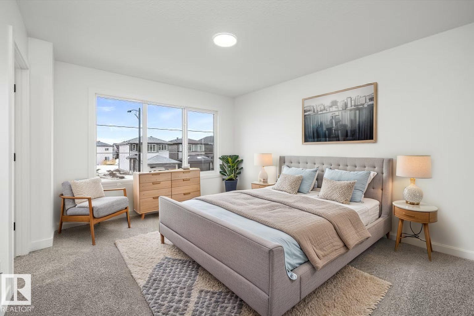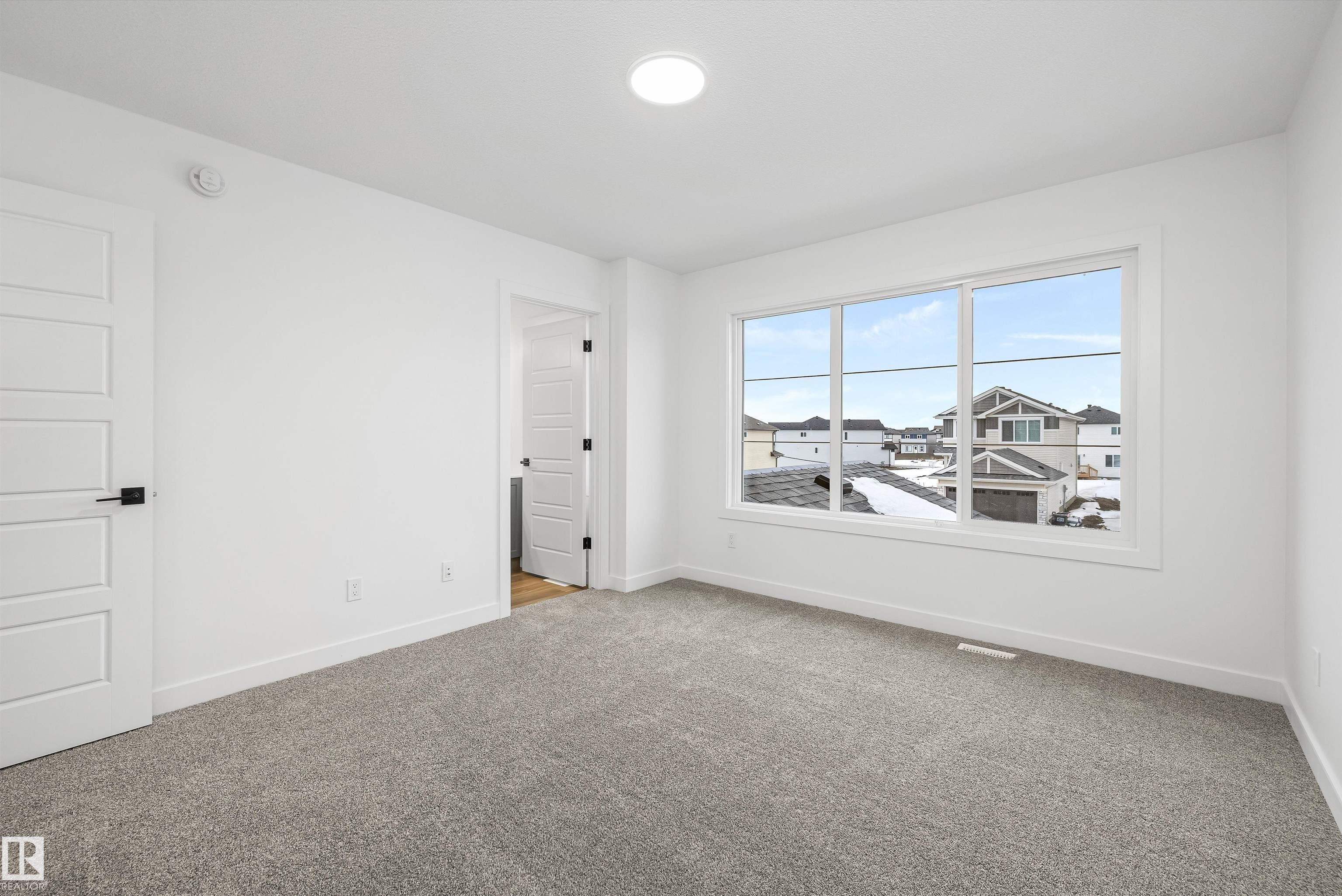 Built by Sterling Homes, this beautifully finished front-attached home in College Woods at Lakeview offers bright, refined living surrounded by trees, trails, and peaceful green space. Triple pane windows and 9? ceilings create an airy main floor where a welcoming foyer leads past a half bath into a stylish kitchen featuring quartz countertops, a large island with seating, ceiling-height cabinetry, chimney hood fan, built-in microwave, and full-height tile backsplash. A walk-through pantry connects to the mudroom and garage for everyday ease. The great room centers on an electric fireplace, while patio doors open the dining nook to the backyard. Upstairs, the spacious primary suite includes a walk-in closet and a 4-piece ensuite with double sinks and glass shower. A bonus room, two additional bedrooms, full bath, and laundry with sink complete the layout. Luxury vinyl plank flooring, side entrance, upgraded railings, double attached garage with drain, and basement rough-ins add lasting value.