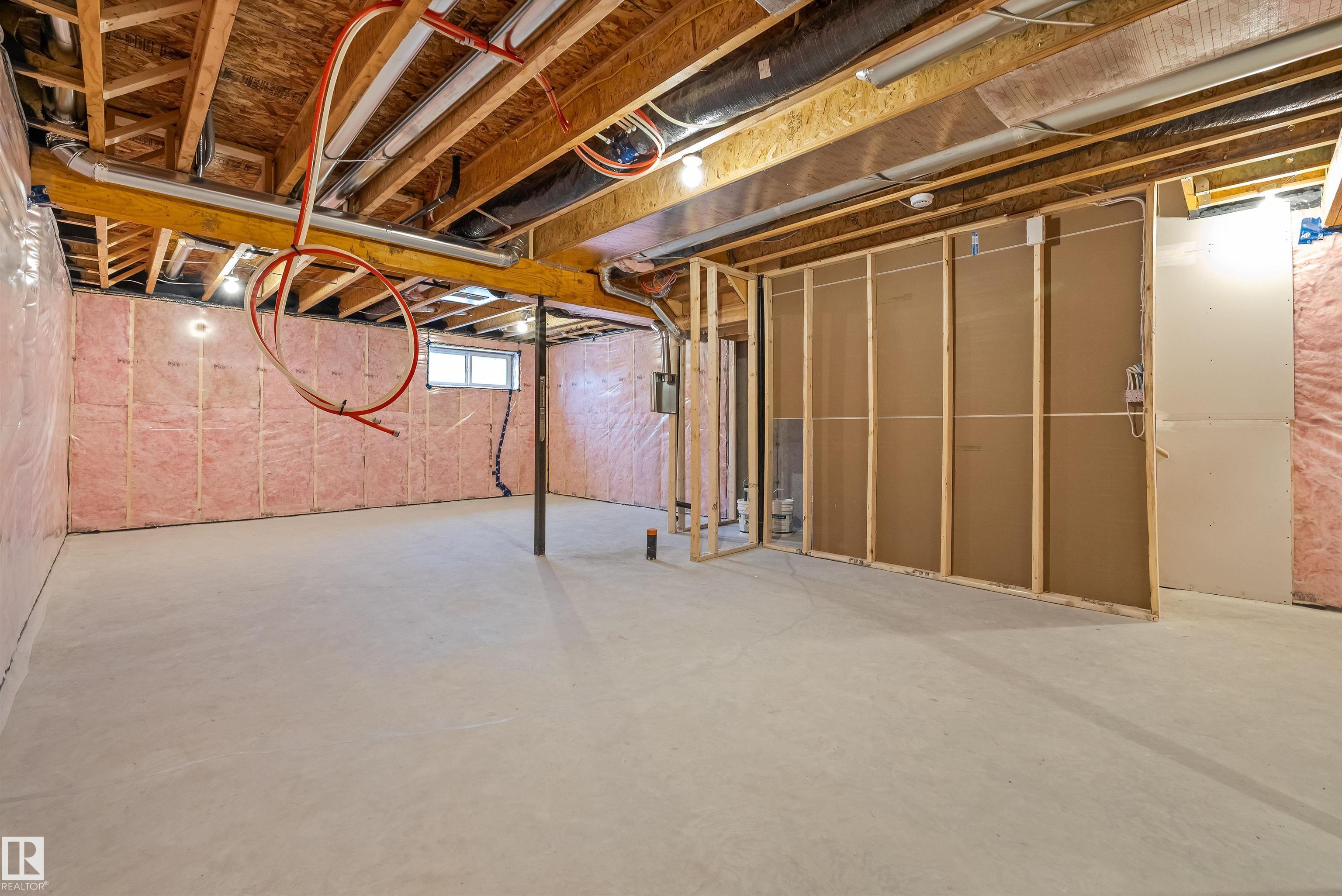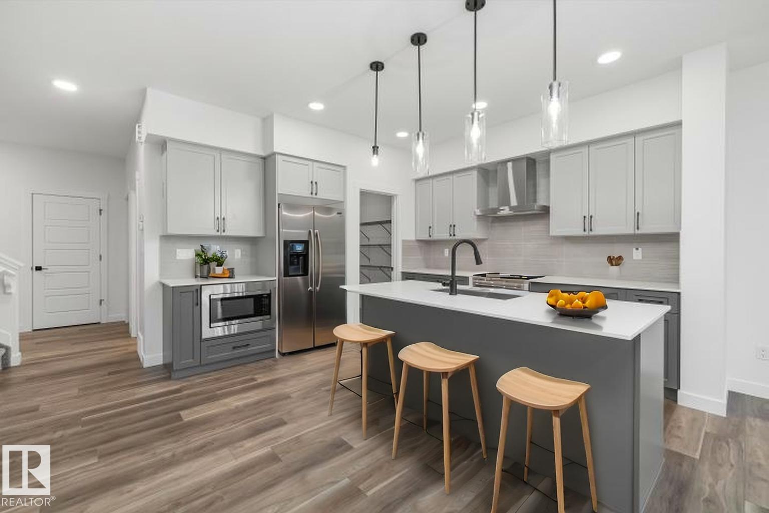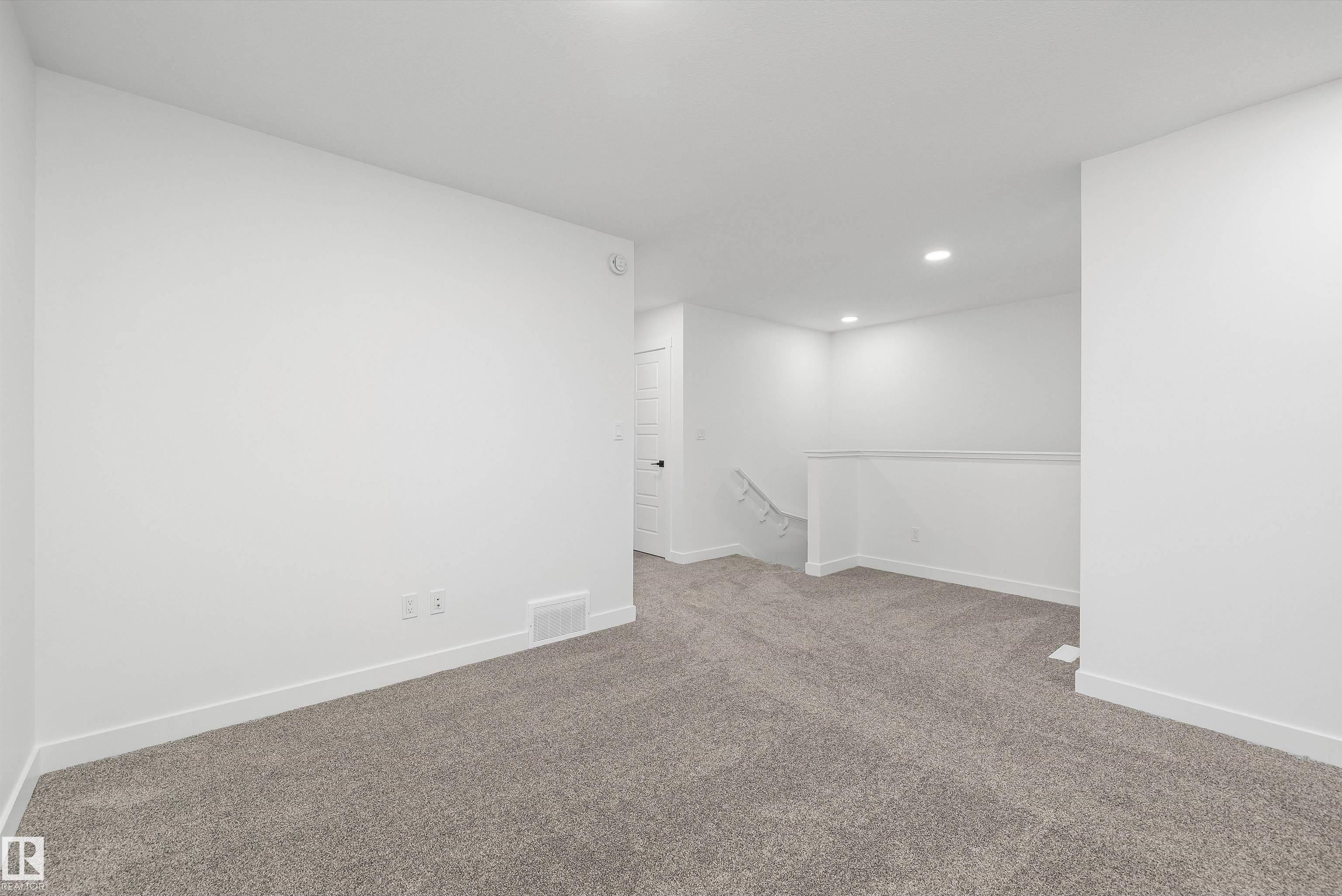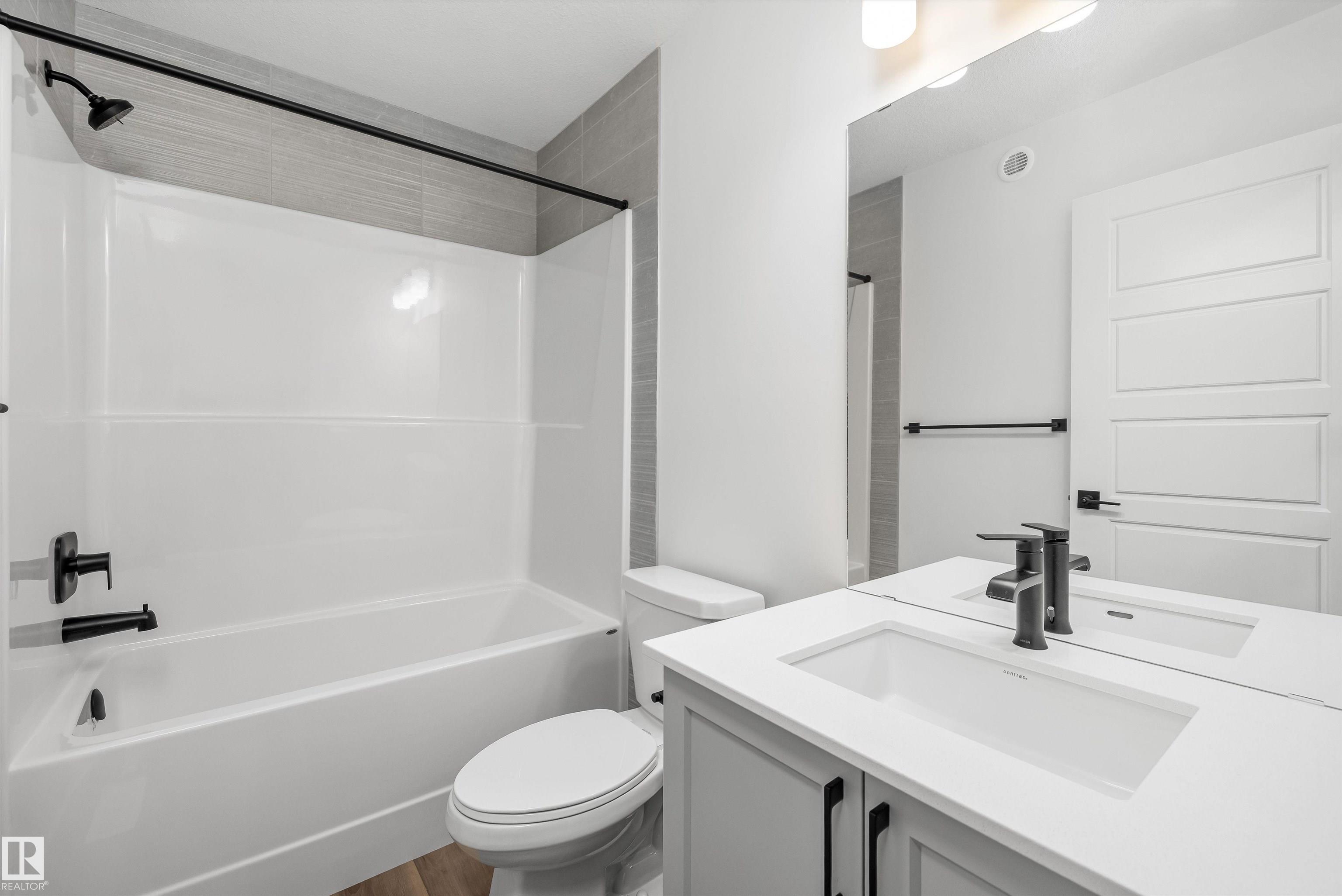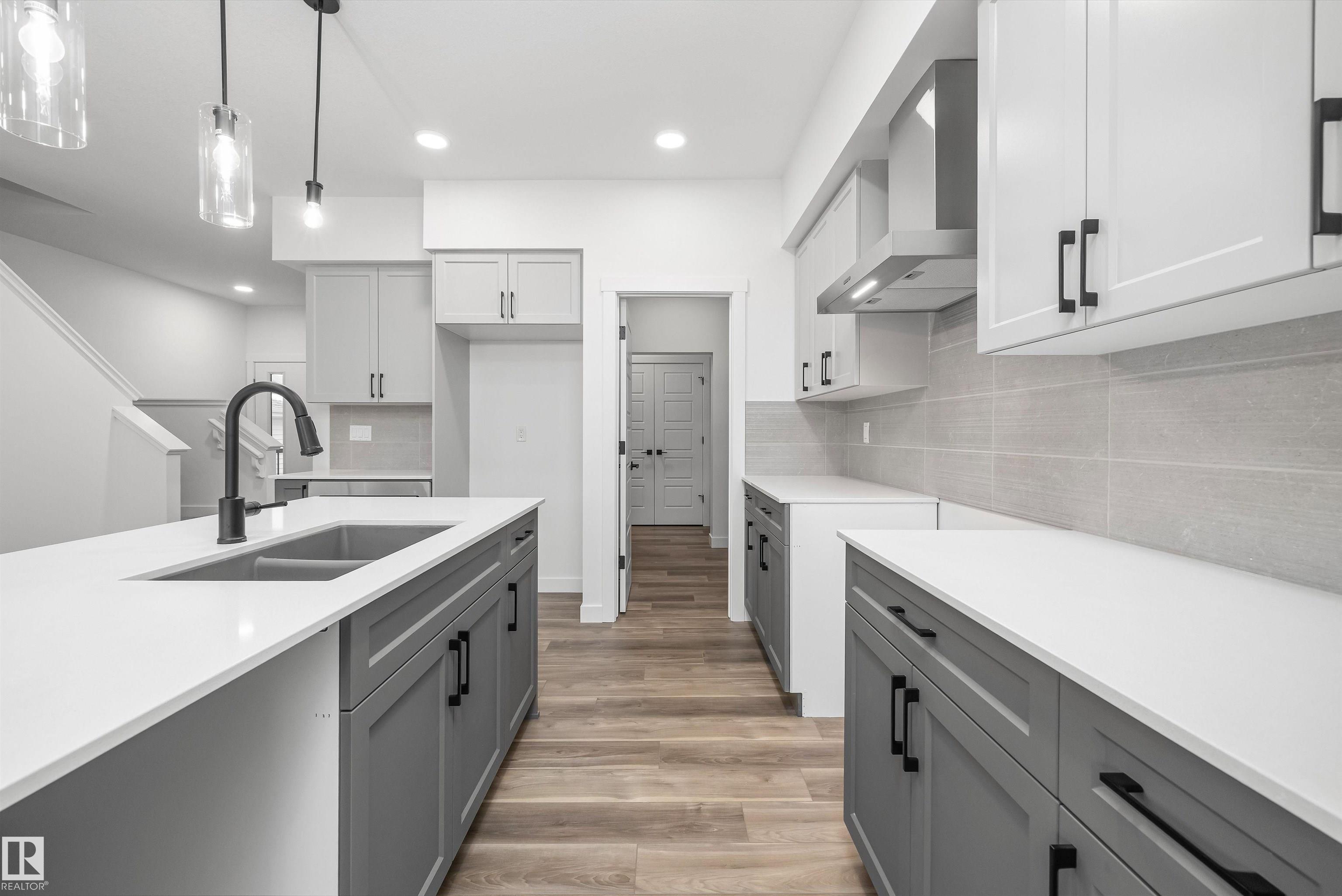 Built by Sterling Homes, this beautifully finished front-attached home in College Woods at Lakeview offers bright, refined living surrounded by trees, trails, and peaceful green space. Triple pane windows and 9? ceilings create an airy main floor where a welcoming foyer leads past a half bath into a stylish kitchen featuring quartz countertops, a large island with seating, ceiling-height cabinetry, chimney hood fan, built-in microwave, and full-height tile backsplash. A walk-through pantry connects to the mudroom and garage for everyday ease. The great room centers on an electric fireplace, while patio doors open the dining nook to the backyard. Upstairs, the spacious primary suite includes a walk-in closet and a 4-piece ensuite with double sinks and glass shower. A bonus room, two additional bedrooms, full bath, and laundry with sink complete the layout. Luxury vinyl plank flooring, side entrance, upgraded railings, double attached garage with drain, and basement rough-ins add lasting value.