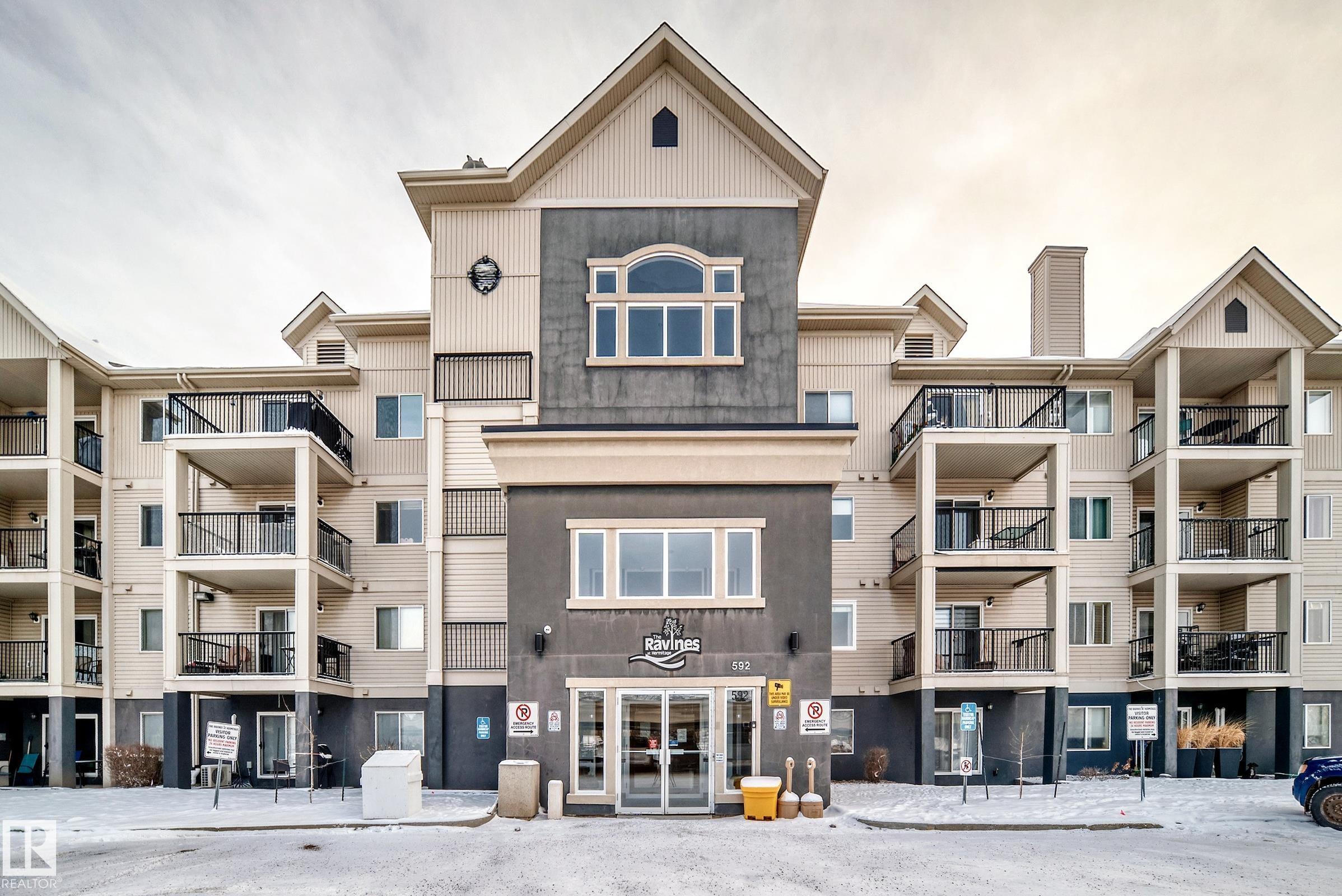 Welcome to this STUNNING, FULLY RENOVATED 2 bed, 2 full bath condo in the Ravines at Hermitage. This condo is COMPLETELY UPDTAED top to bottom with high-end finishes, and a bright open-concept floor plan that offers both style and function. Features include high end lighting fixtures, modern fresh paint colour, and luxury vinyl plank flooring in a striking herringbone pattern. The designer kitchen showcases charcoal appliances, dark modern cabinets, and quartz countertops w/lots of counter space, it's perfect for entertaining. Enjoy the Gorgeous views of the RIVER VALLEY, and quick the access to Hermitage Park?s trails system and green space. Also included is your TITLED UNDERGROUND PARKING and STORAGE CAGE which is ideally located near the elevator. The complex is extremely well managed and feature a social room with a full kitchen, pool table, shuffle board and lounging area with access to a patio that backs onto the ravine . Modern and stylish condo in an excellent location. this is the one!